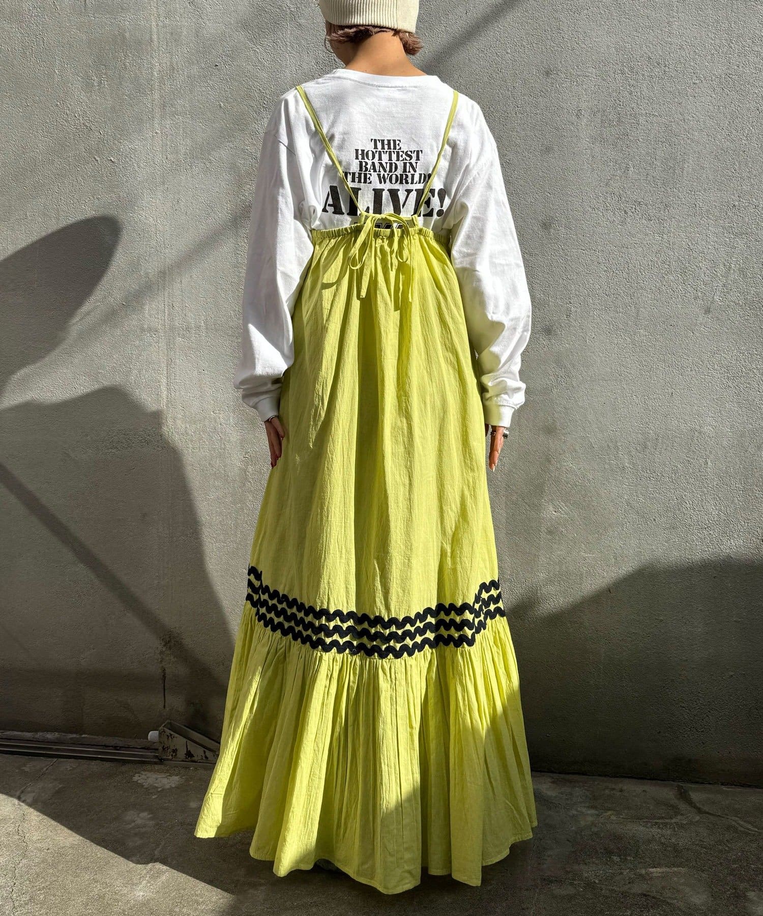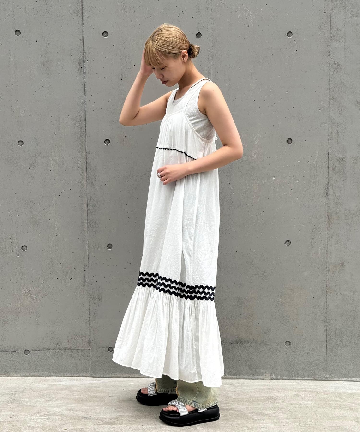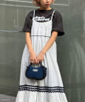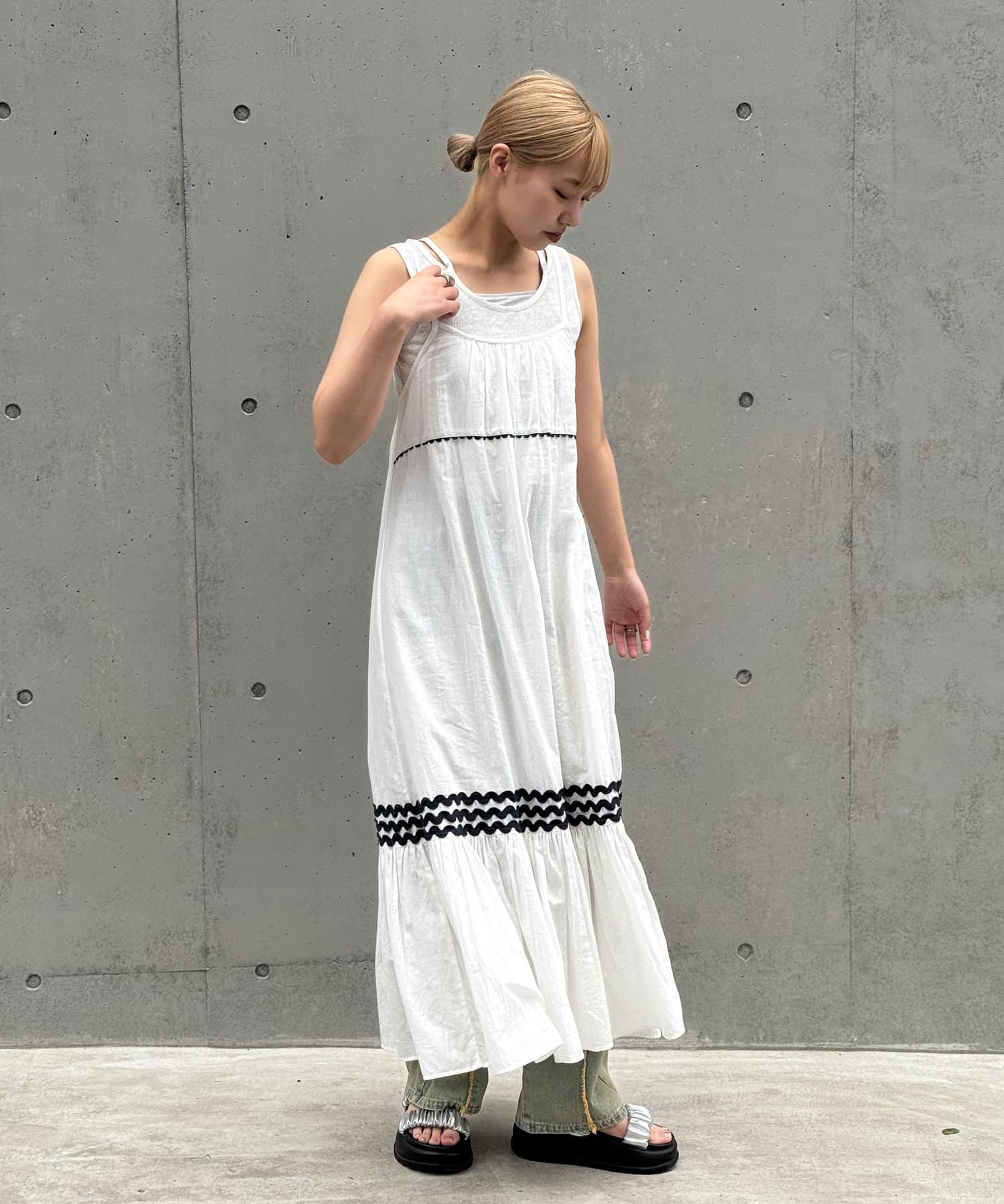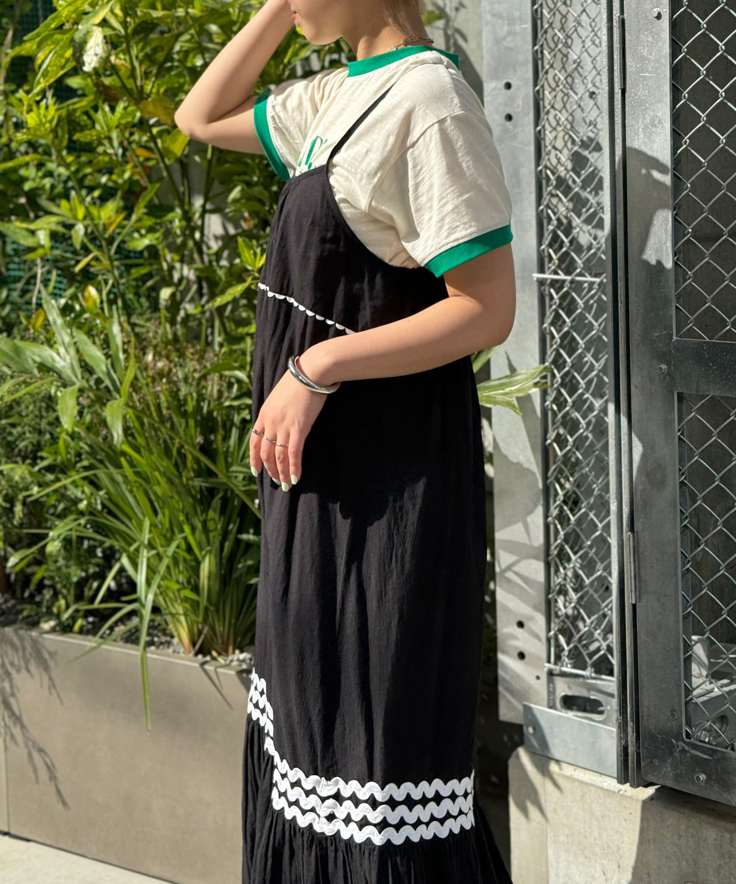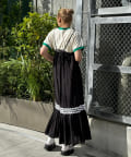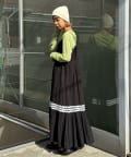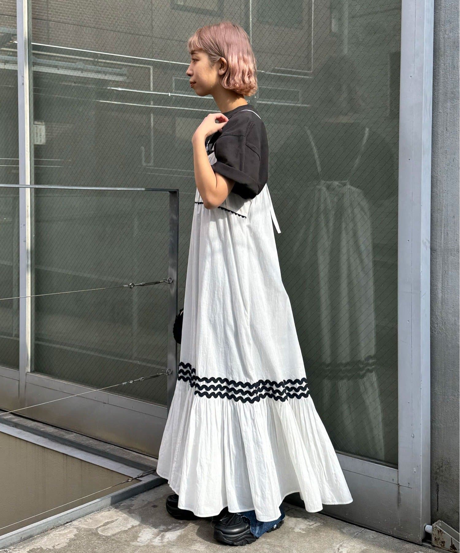 ウエストと裾部分に施された配色カラーのうねうねコードが目を惹くティアードワンピース。