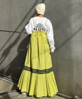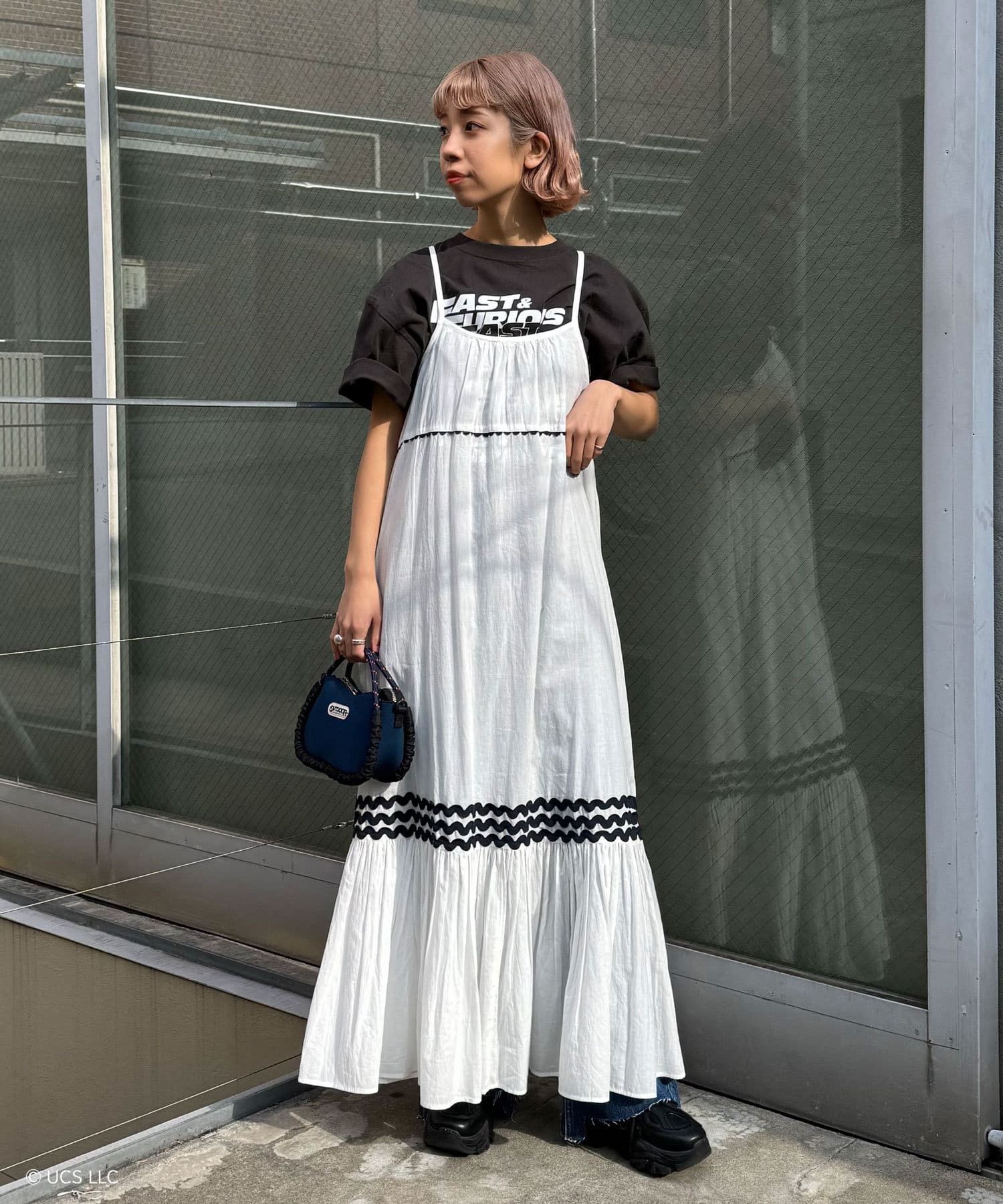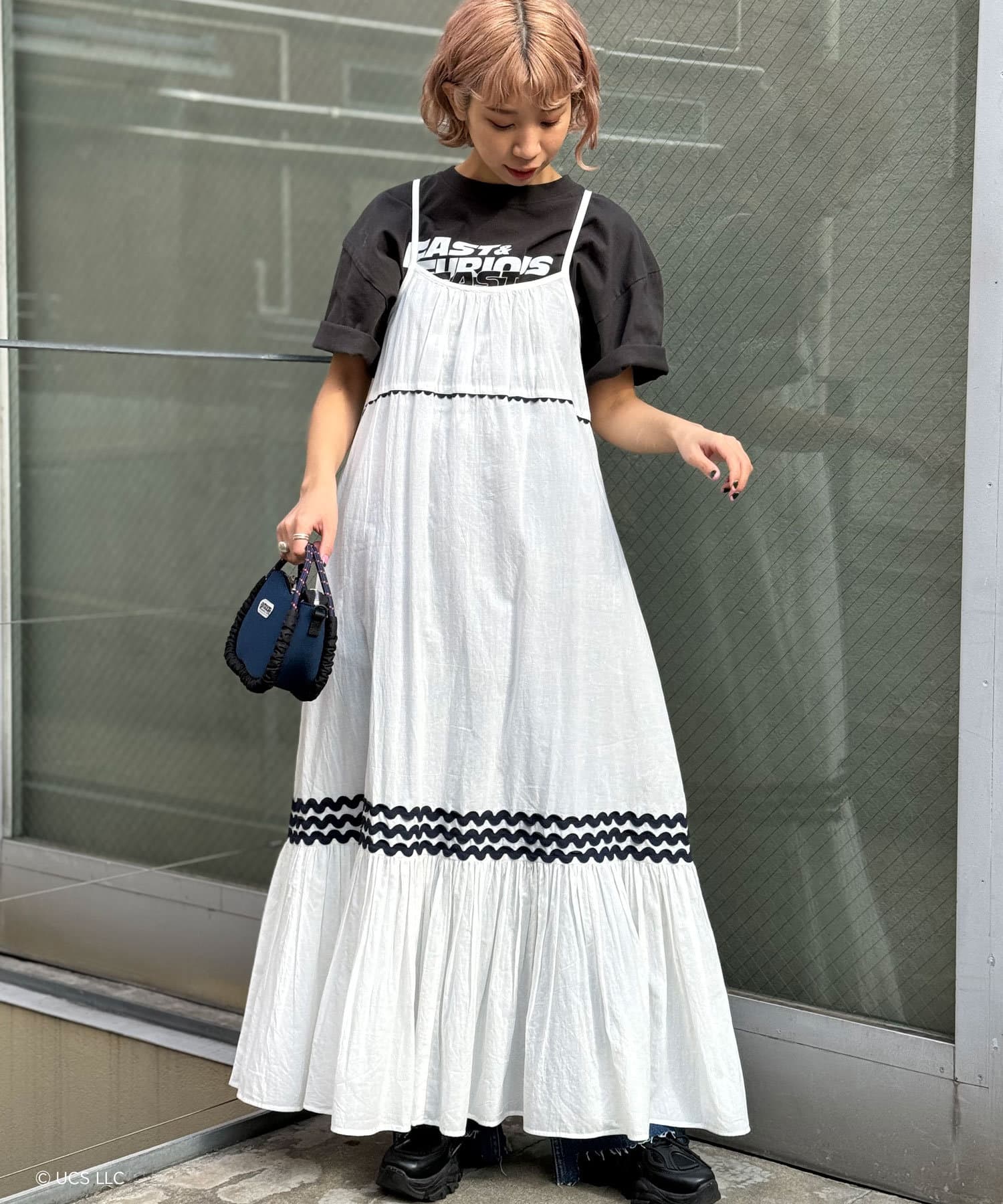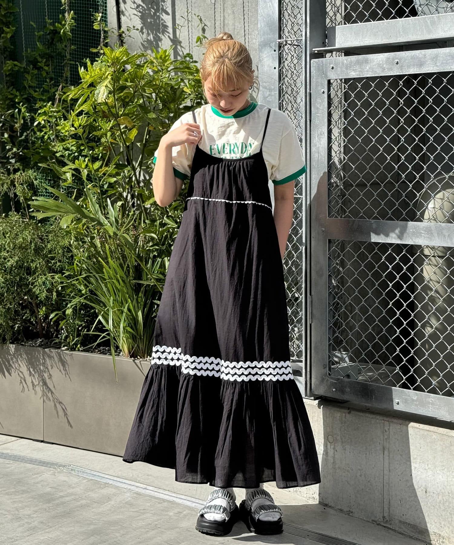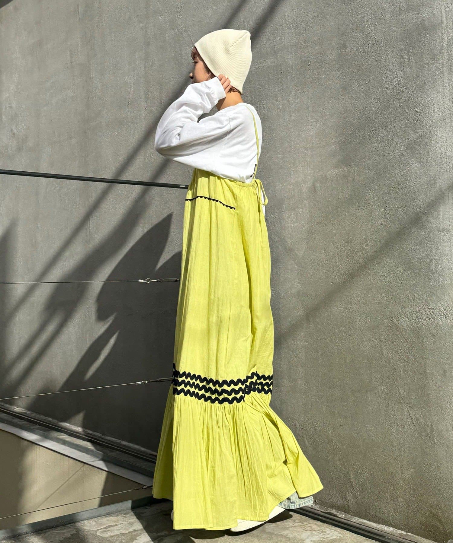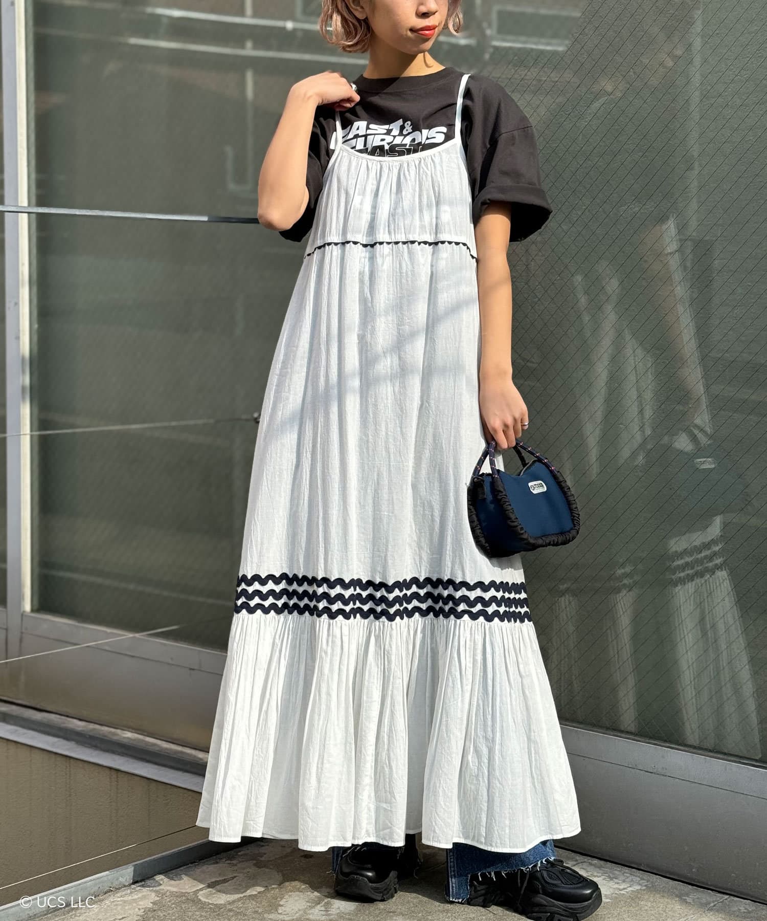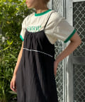ウエストと裾部分に施された配色カラーのうねうねコードが目を惹くティアードワンピース。