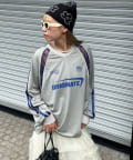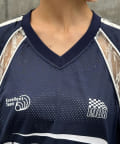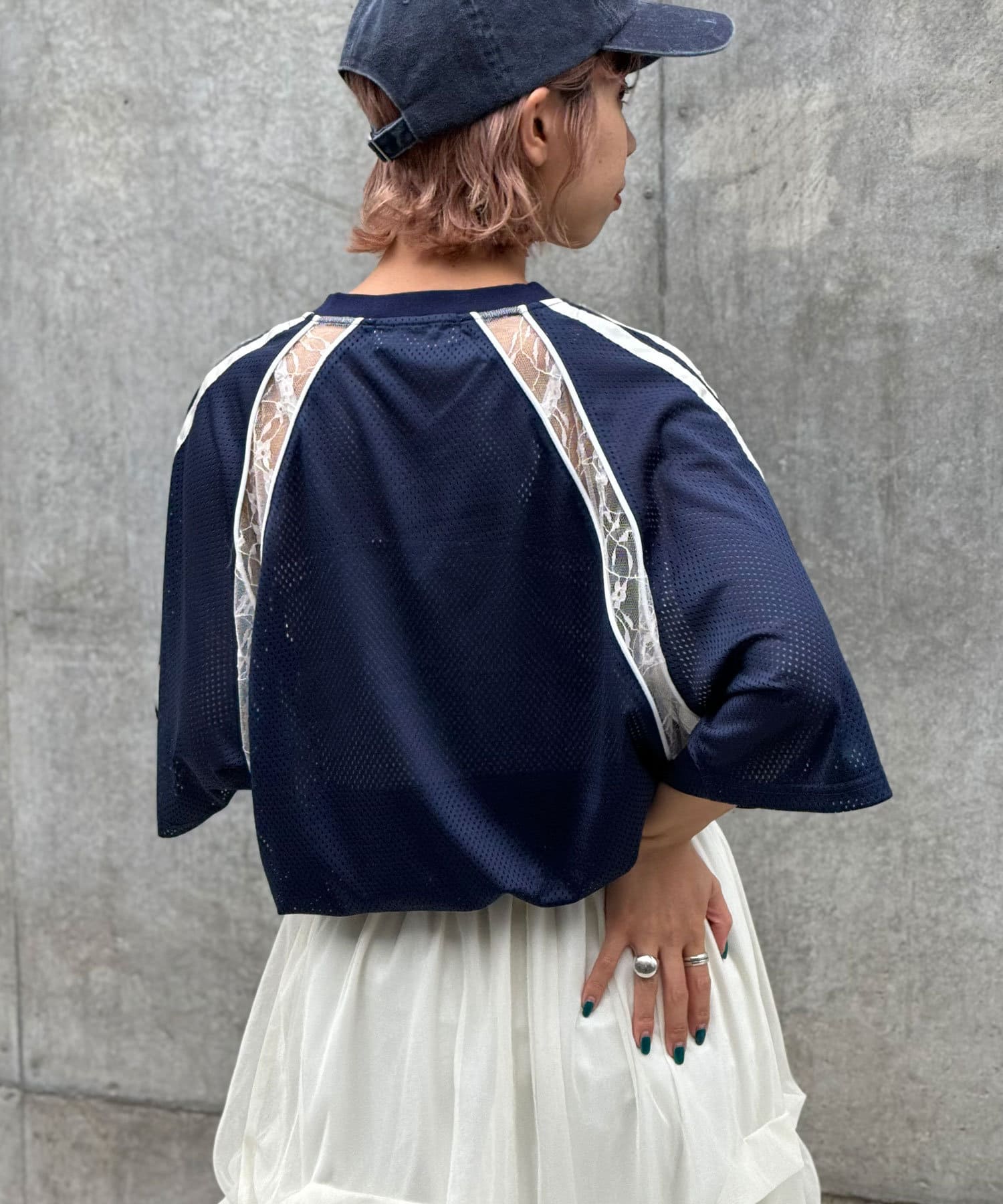 フットボールのユニフォームやゲームシャツをモチーフにレースを加えレディライクに仕上げたトップス。