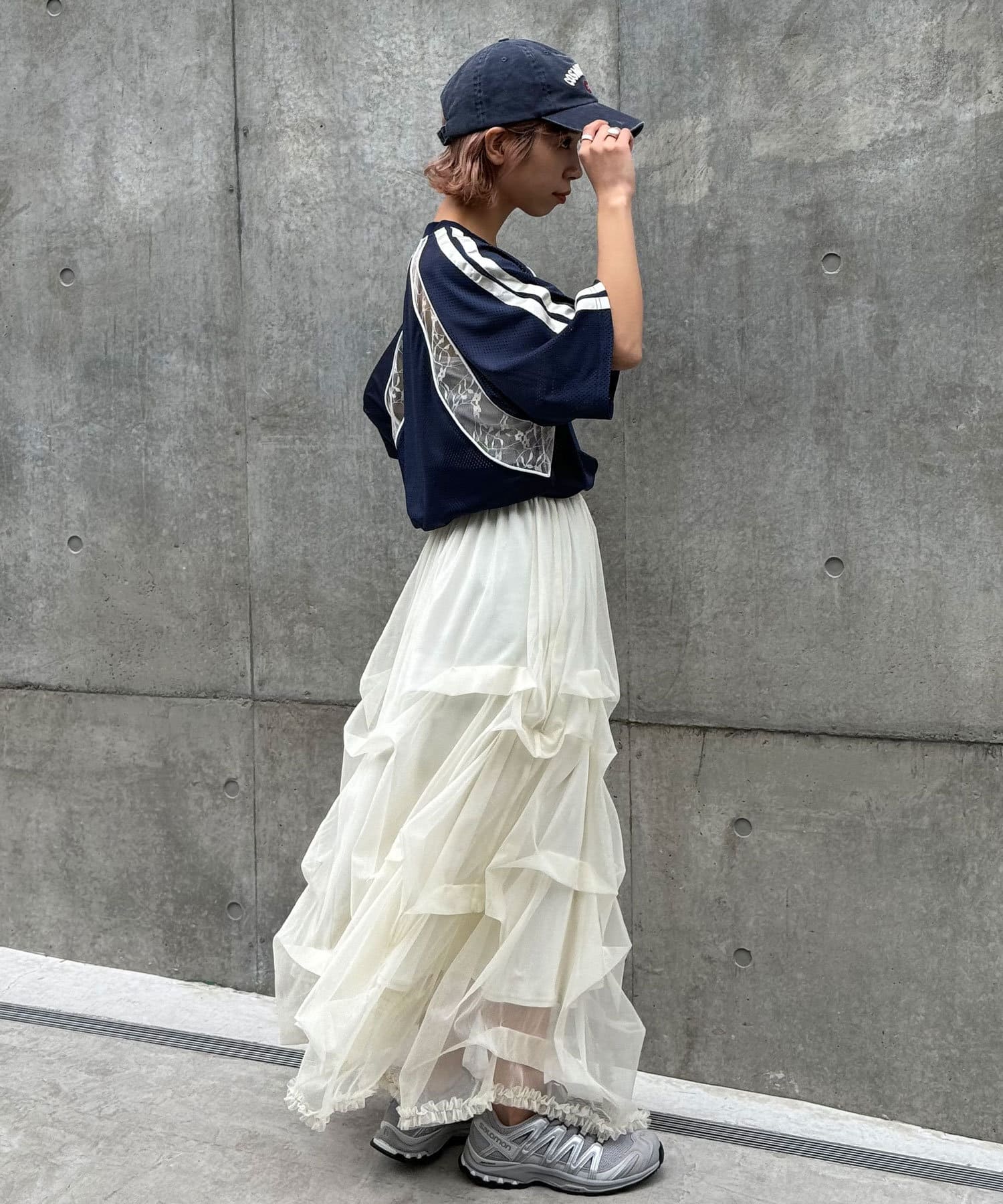 チュールスカートやIラインスカートなど甘めなボトムス合わせがおすすめです。