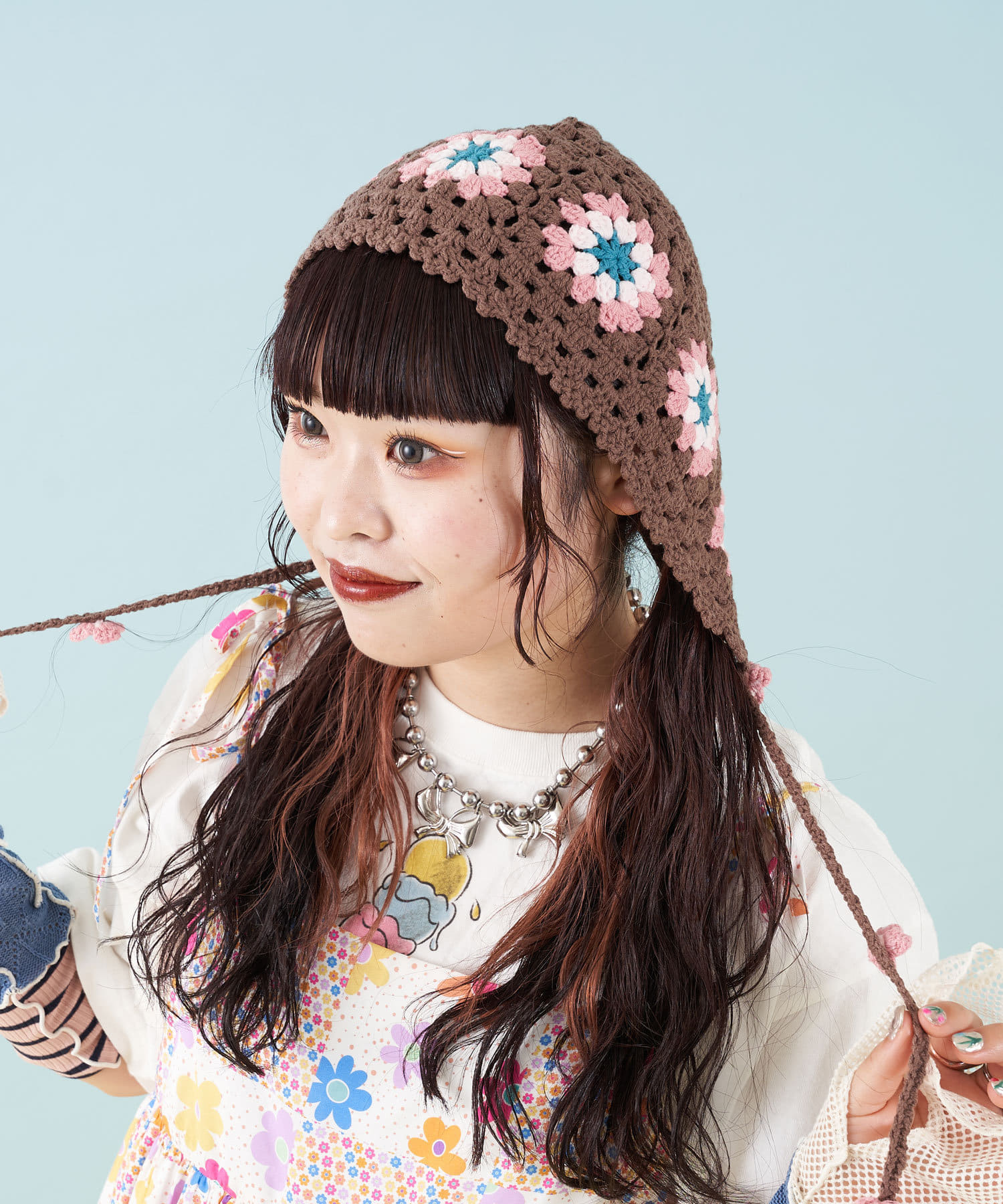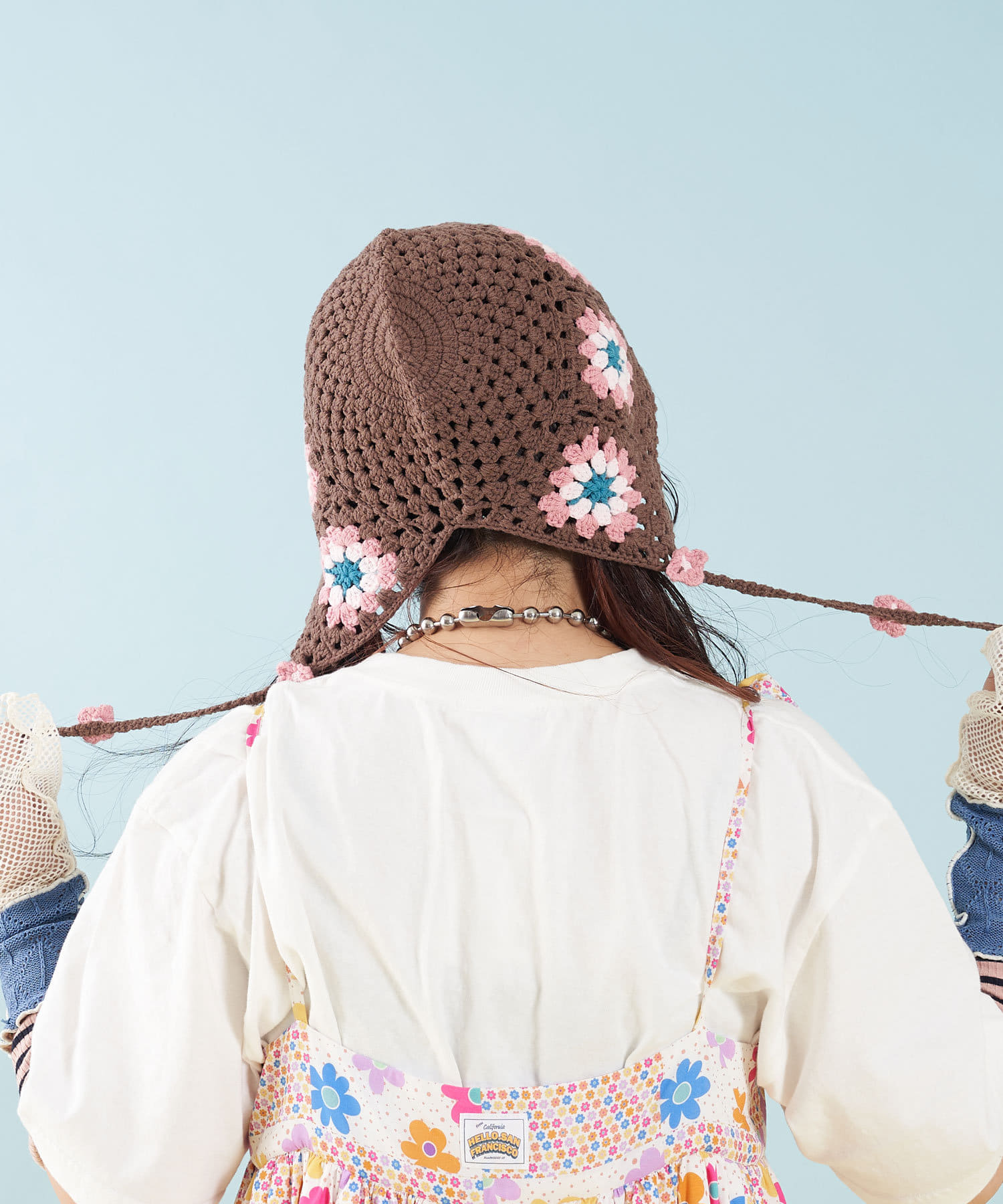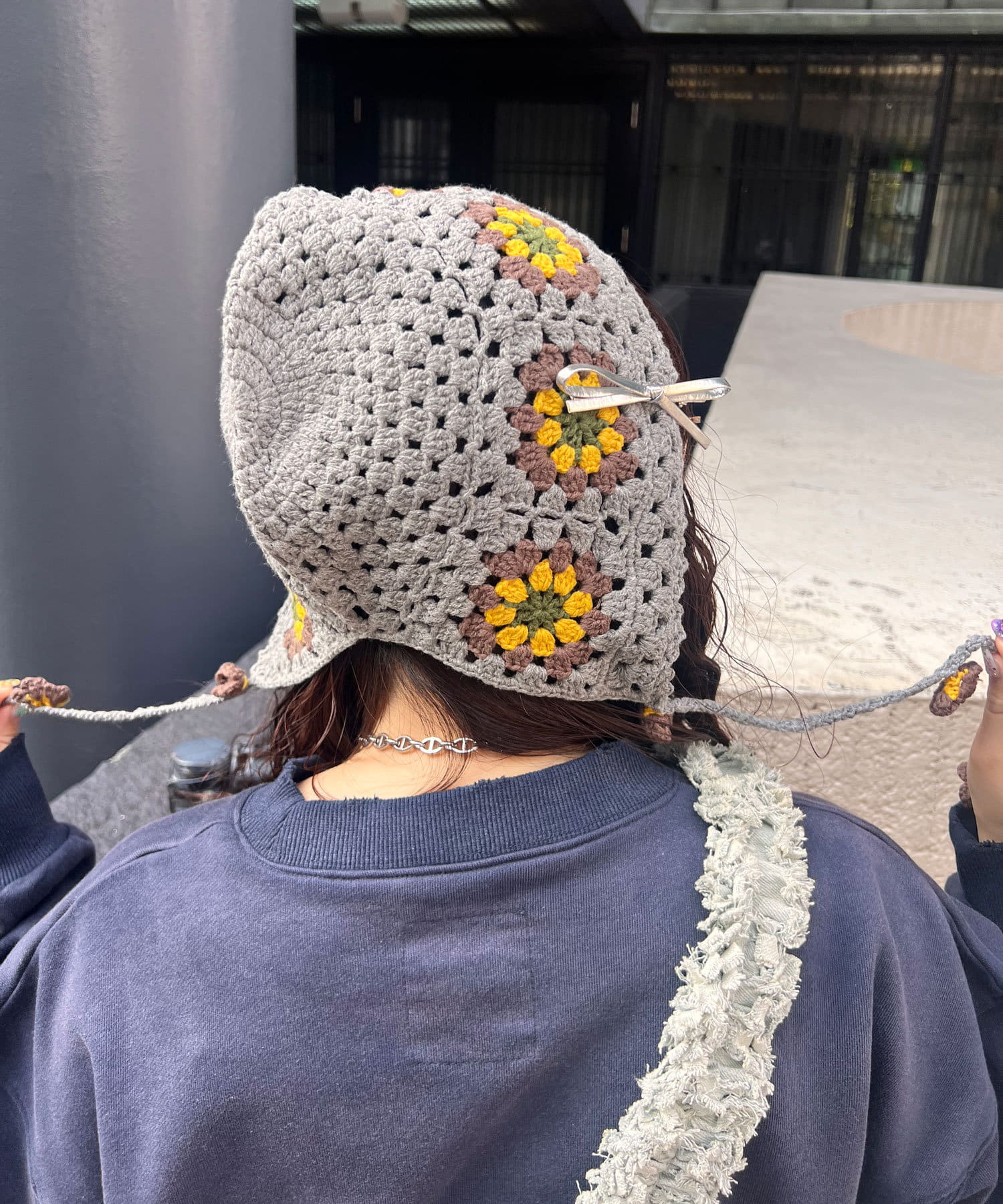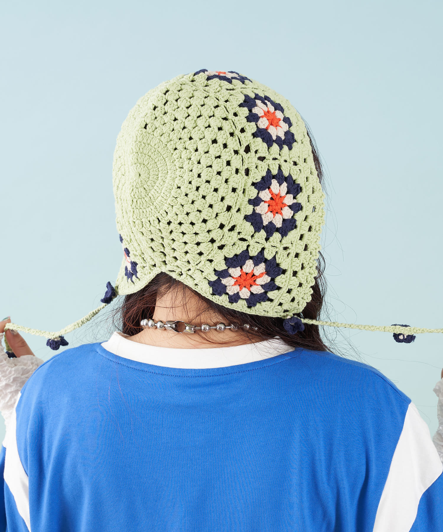 クロシェ編みのフラワーモチーフが目を惹くボンネット帽