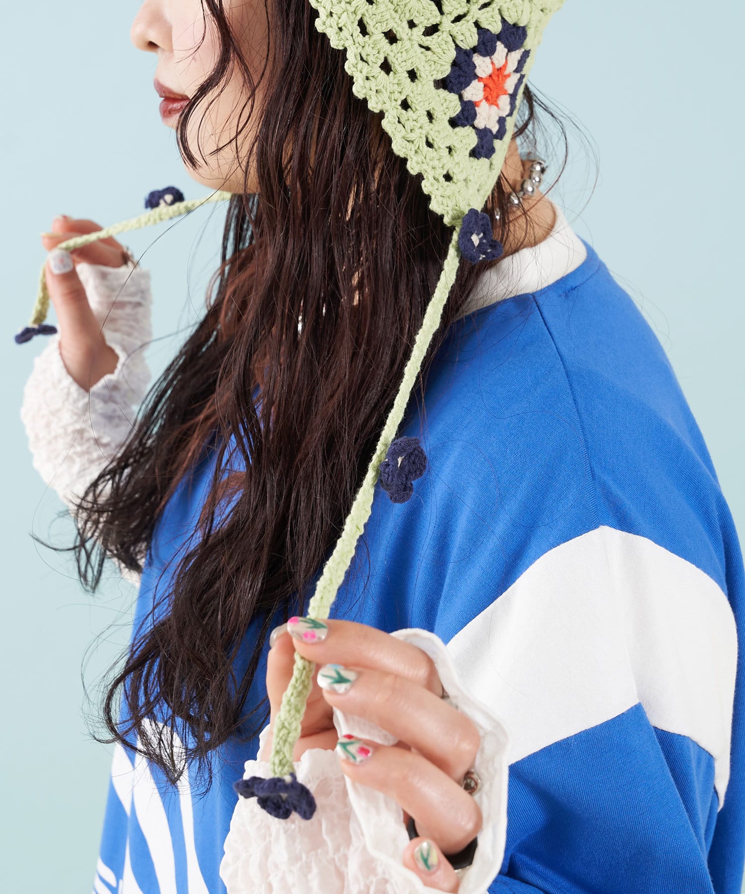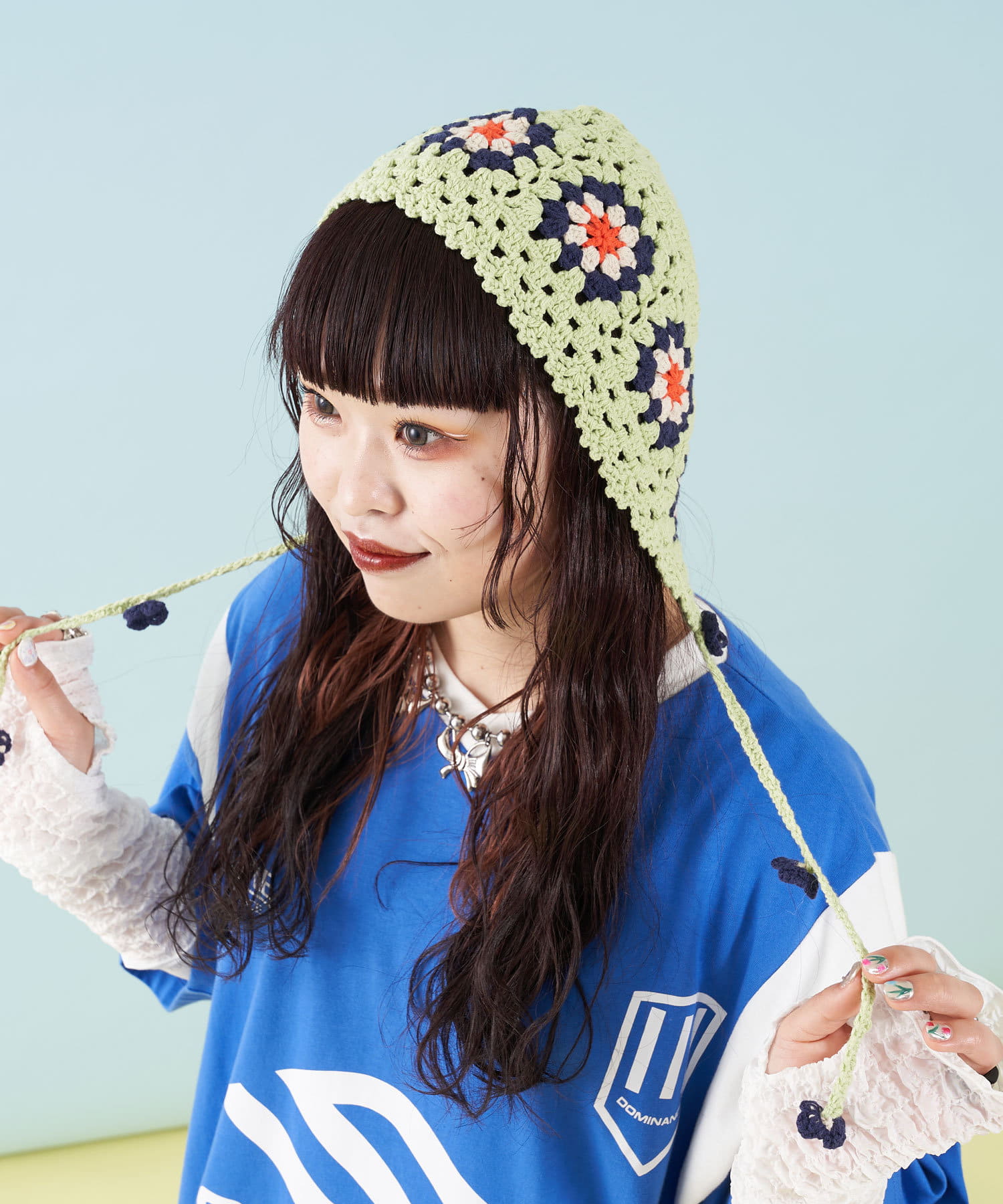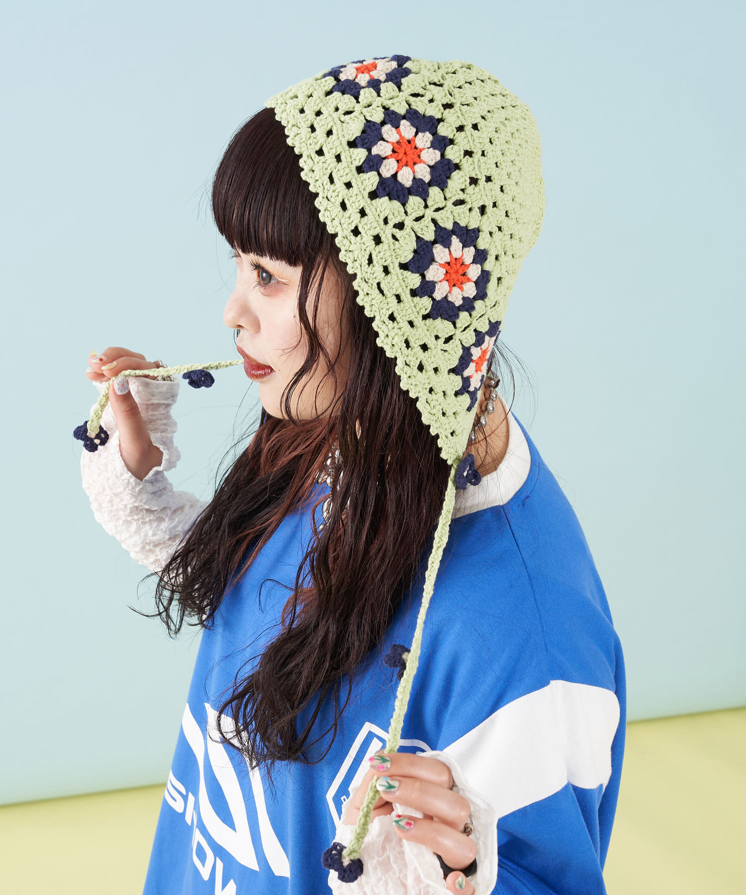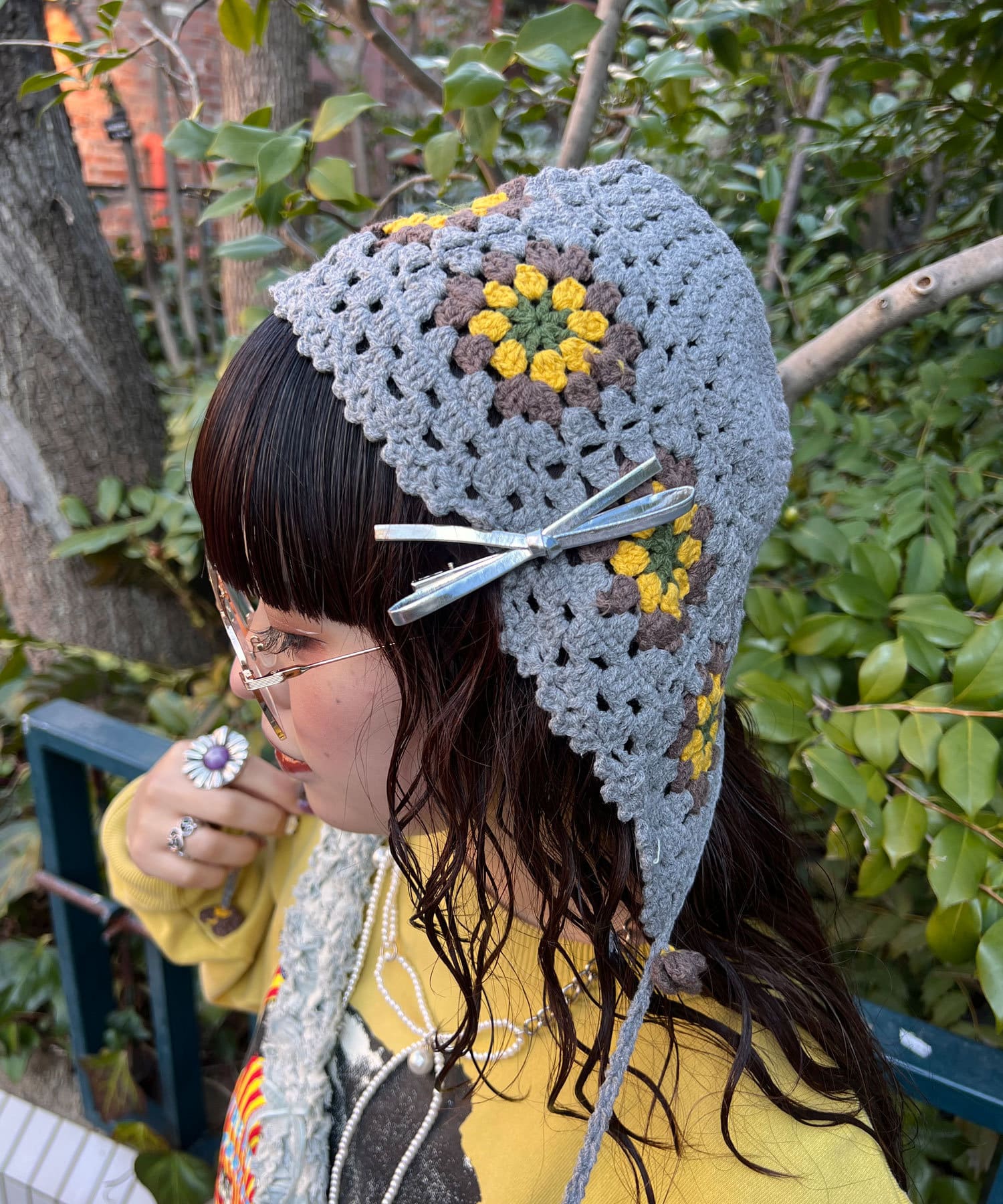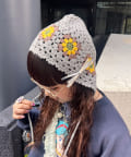 クロシェ編みのフラワーモチーフが目を惹くボンネット帽