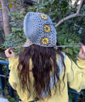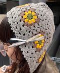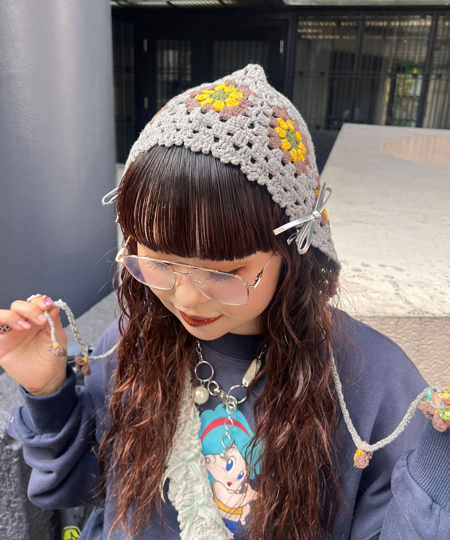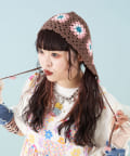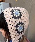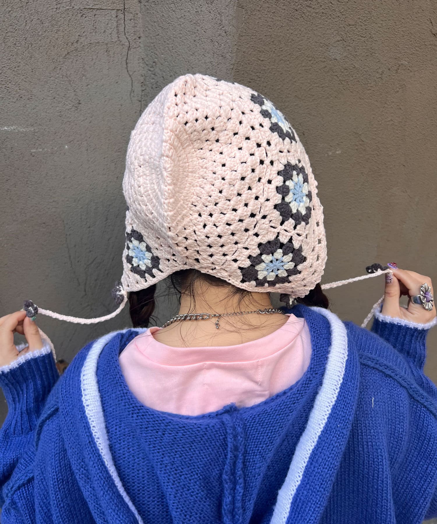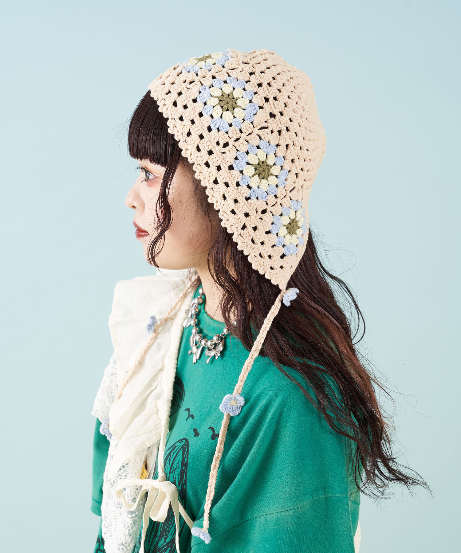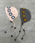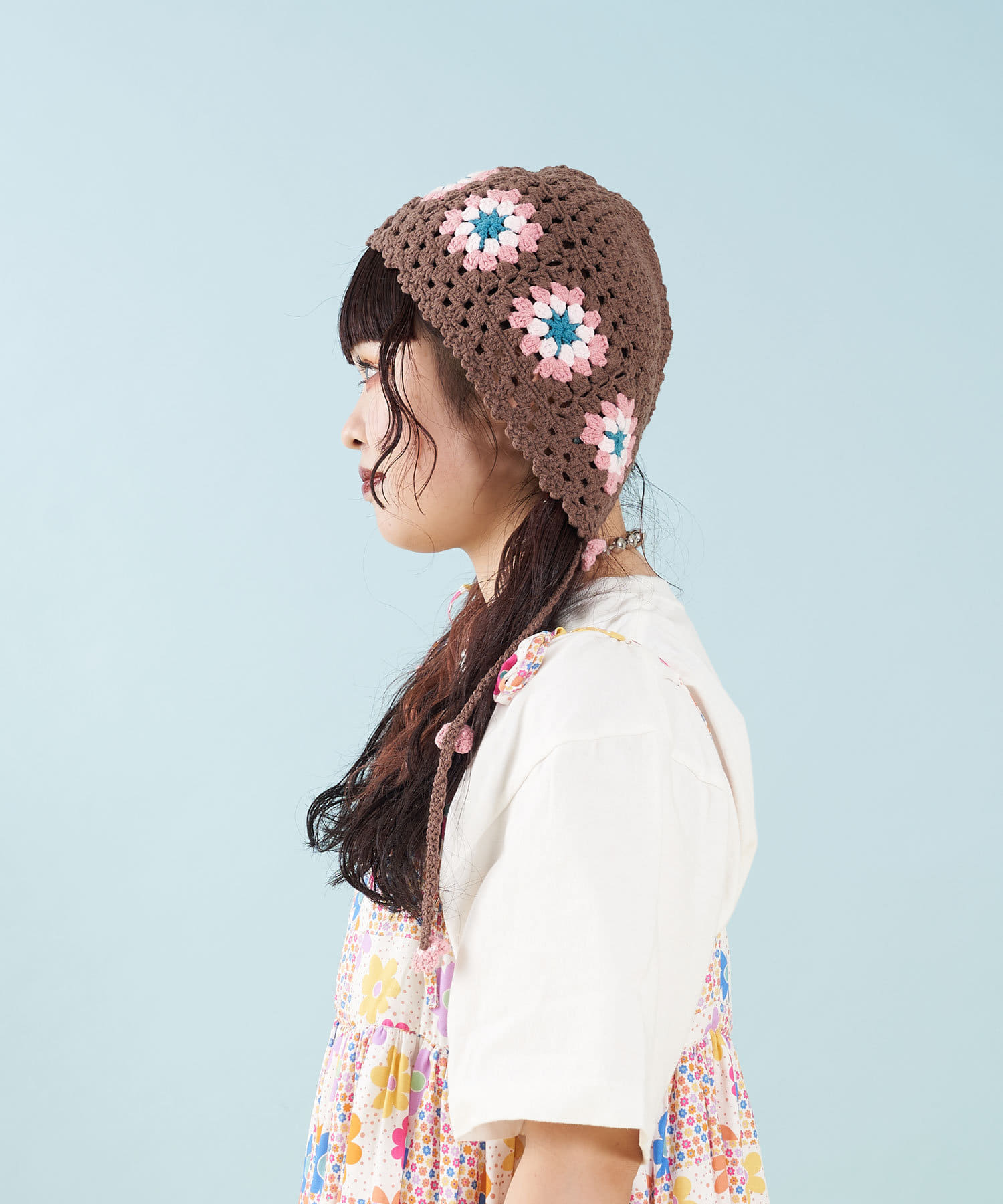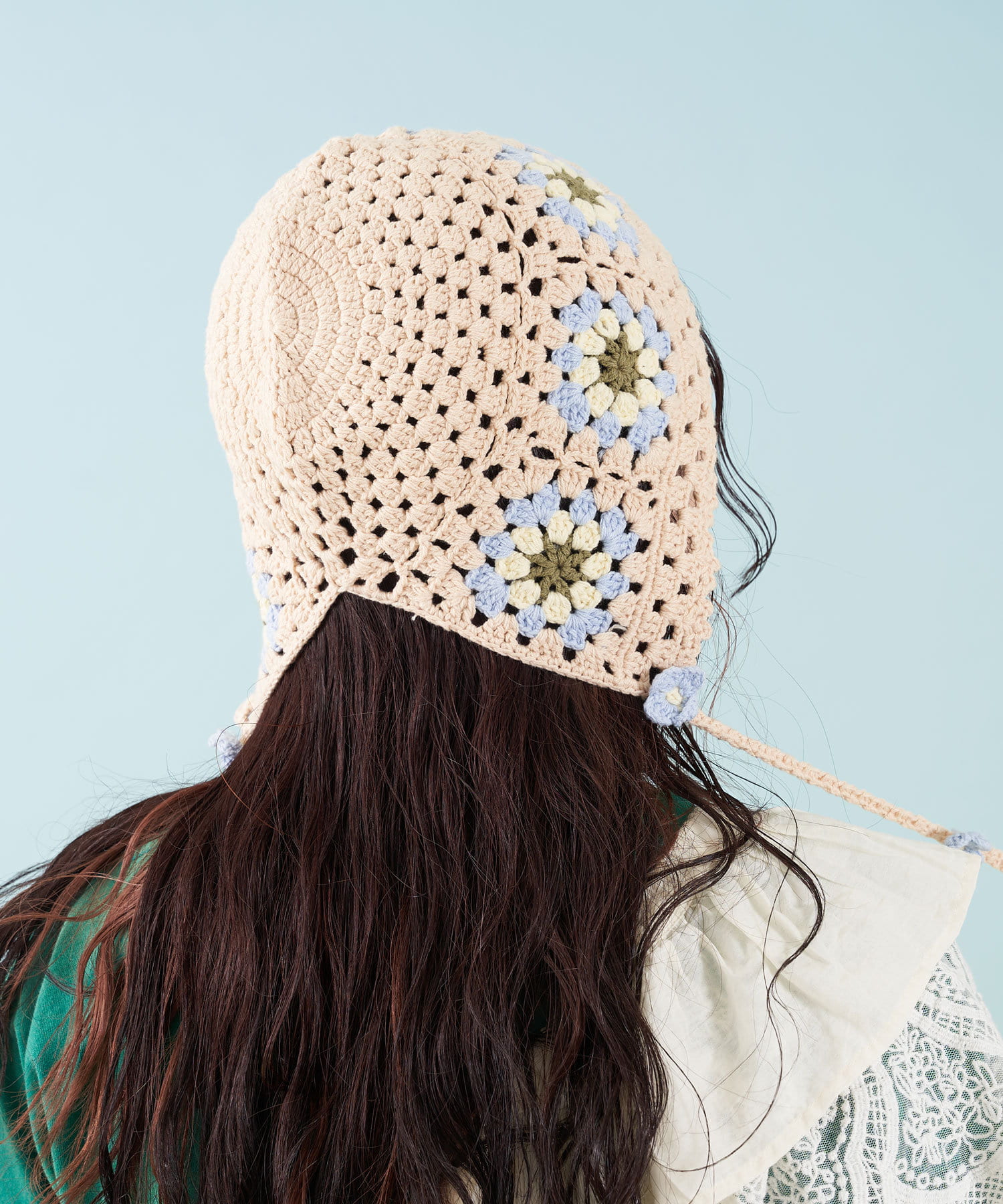 クロシェ編みのフラワーモチーフが目を惹くボンネット帽