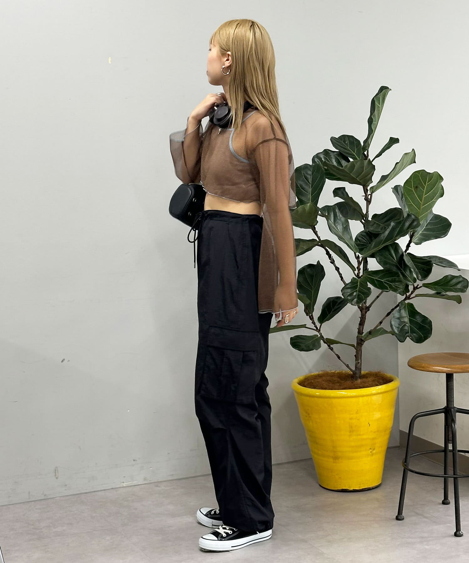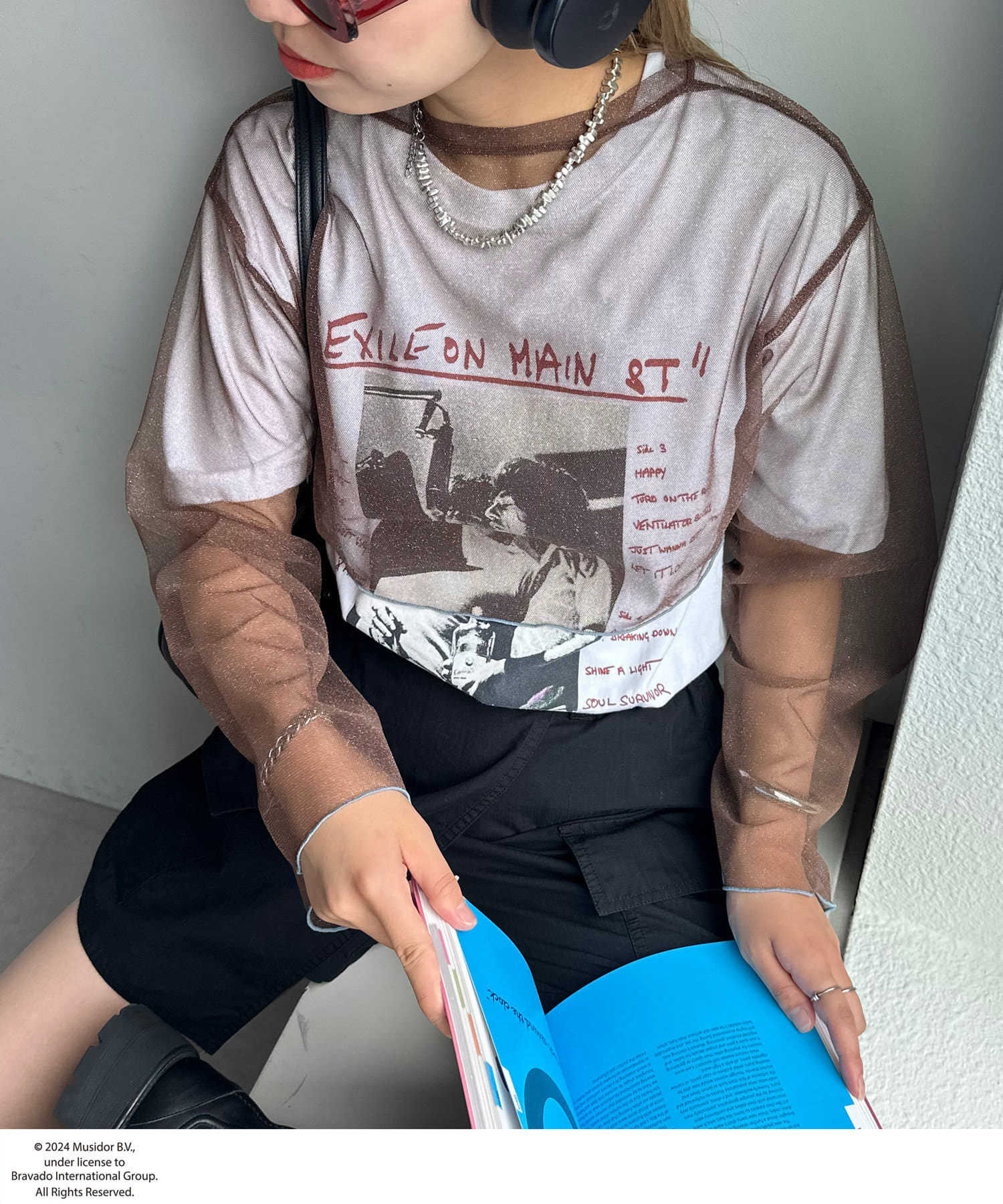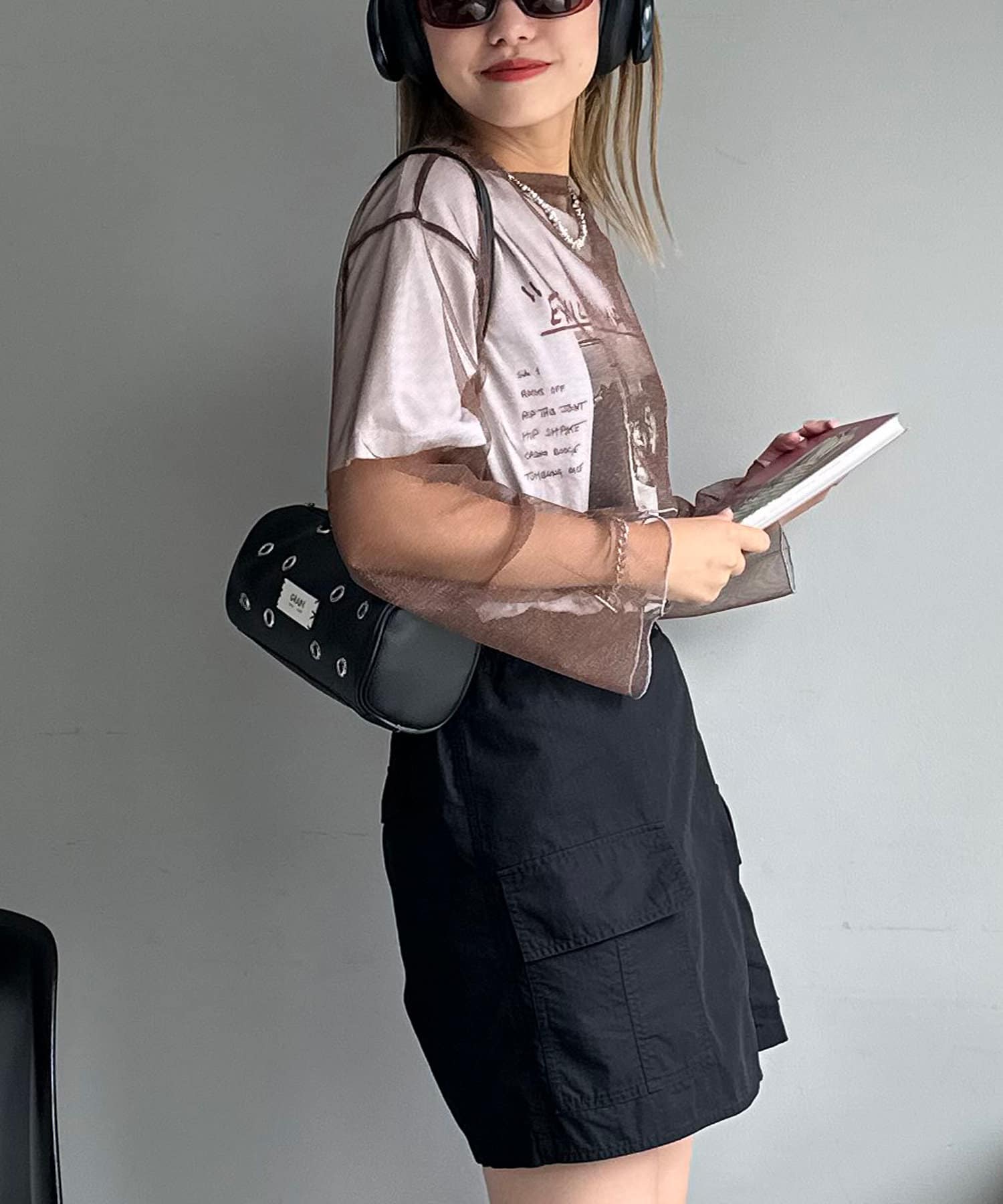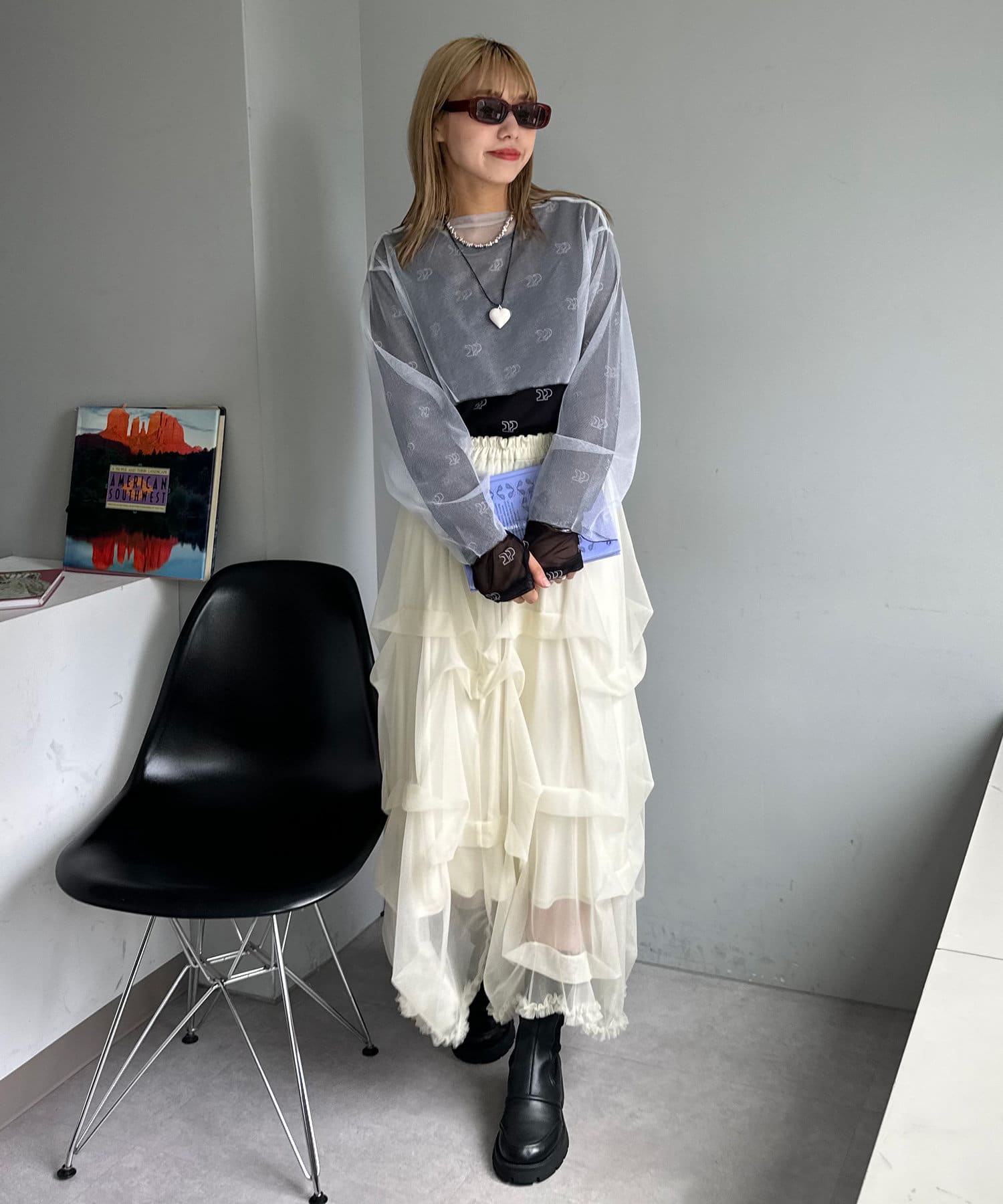 完全に下に着ているものが透ける素材なので、Tシャツなどのトップスの柄を活かしたコーディネートに。