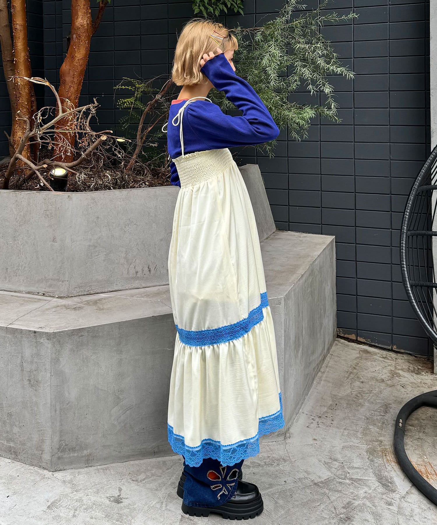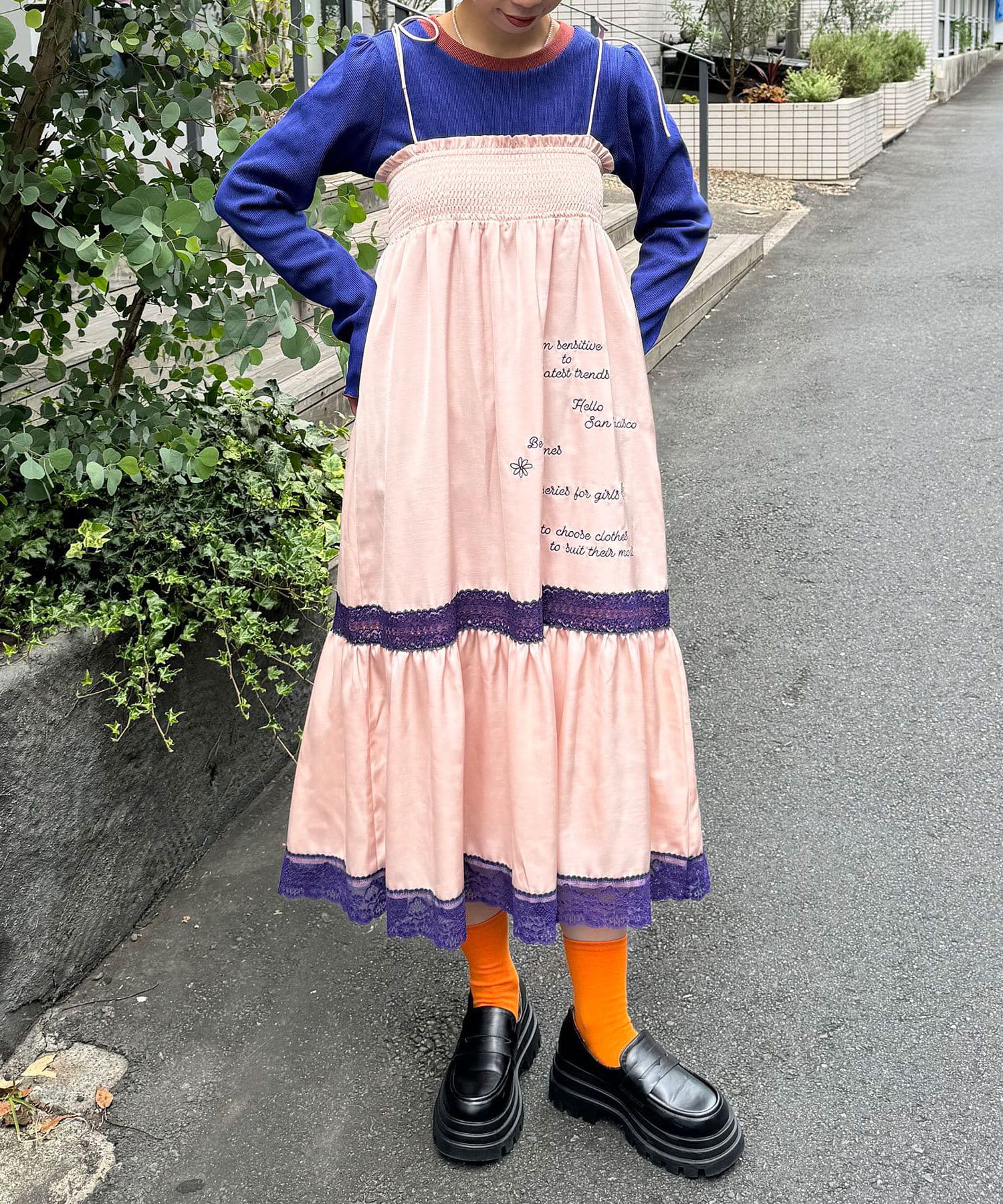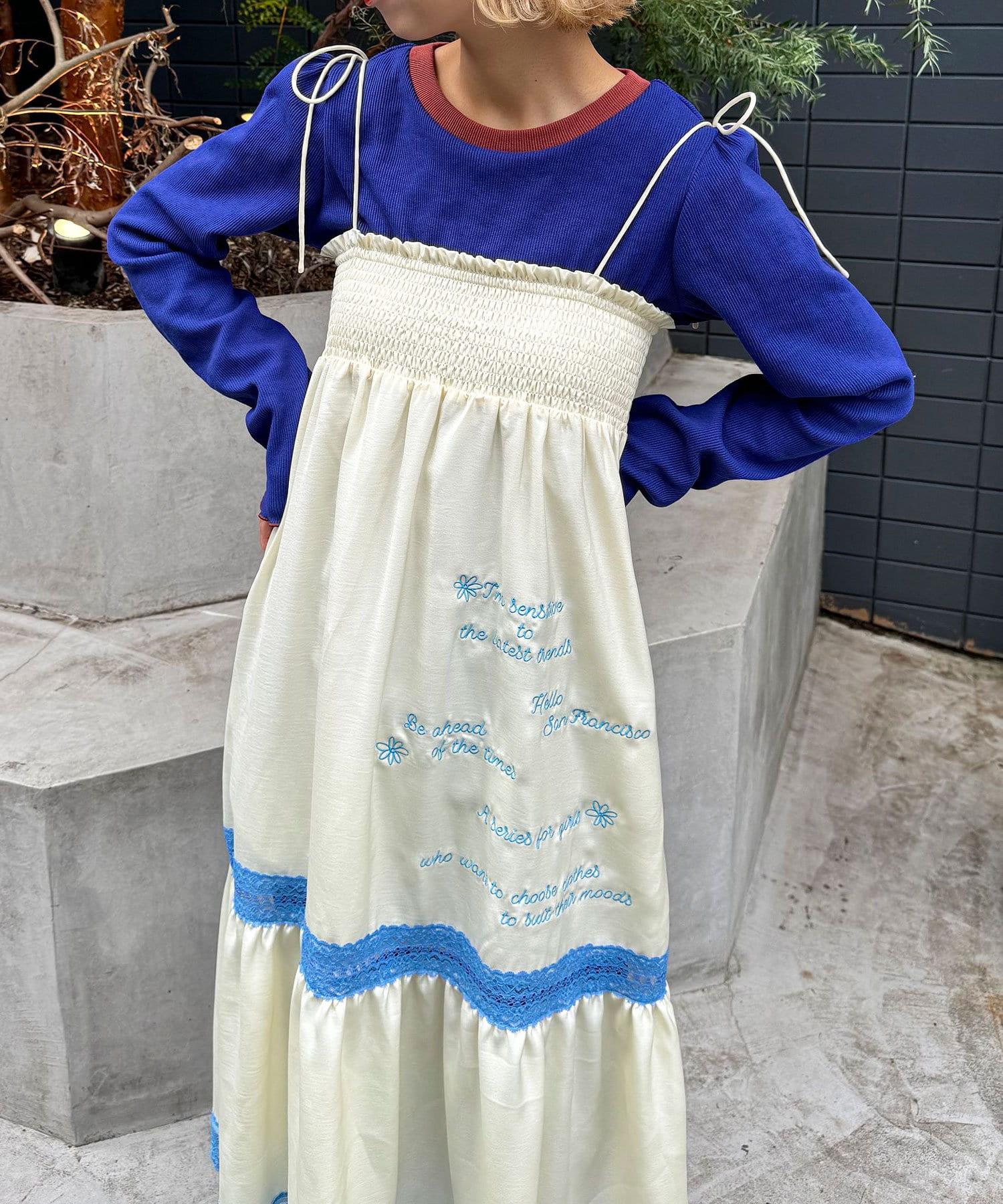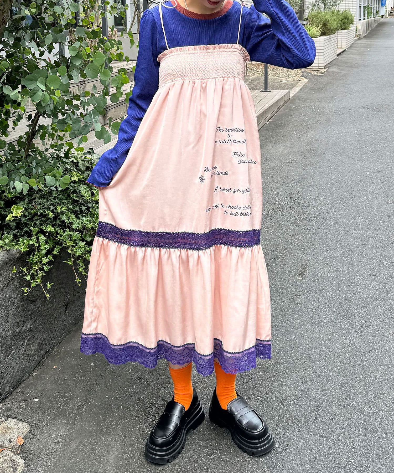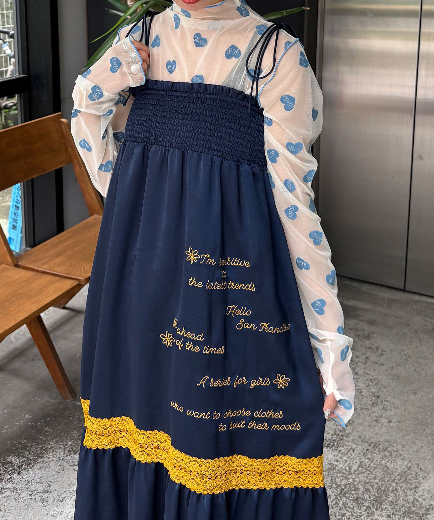 ウエストはシャーリングデザインで、スカートとしてもワンピースとしても着用できる2WAYデザインが魅力です。