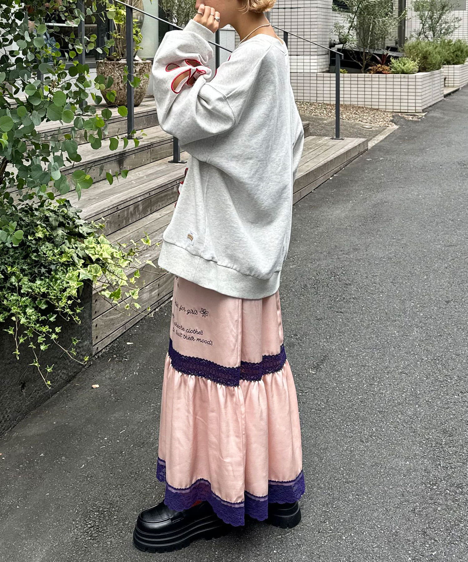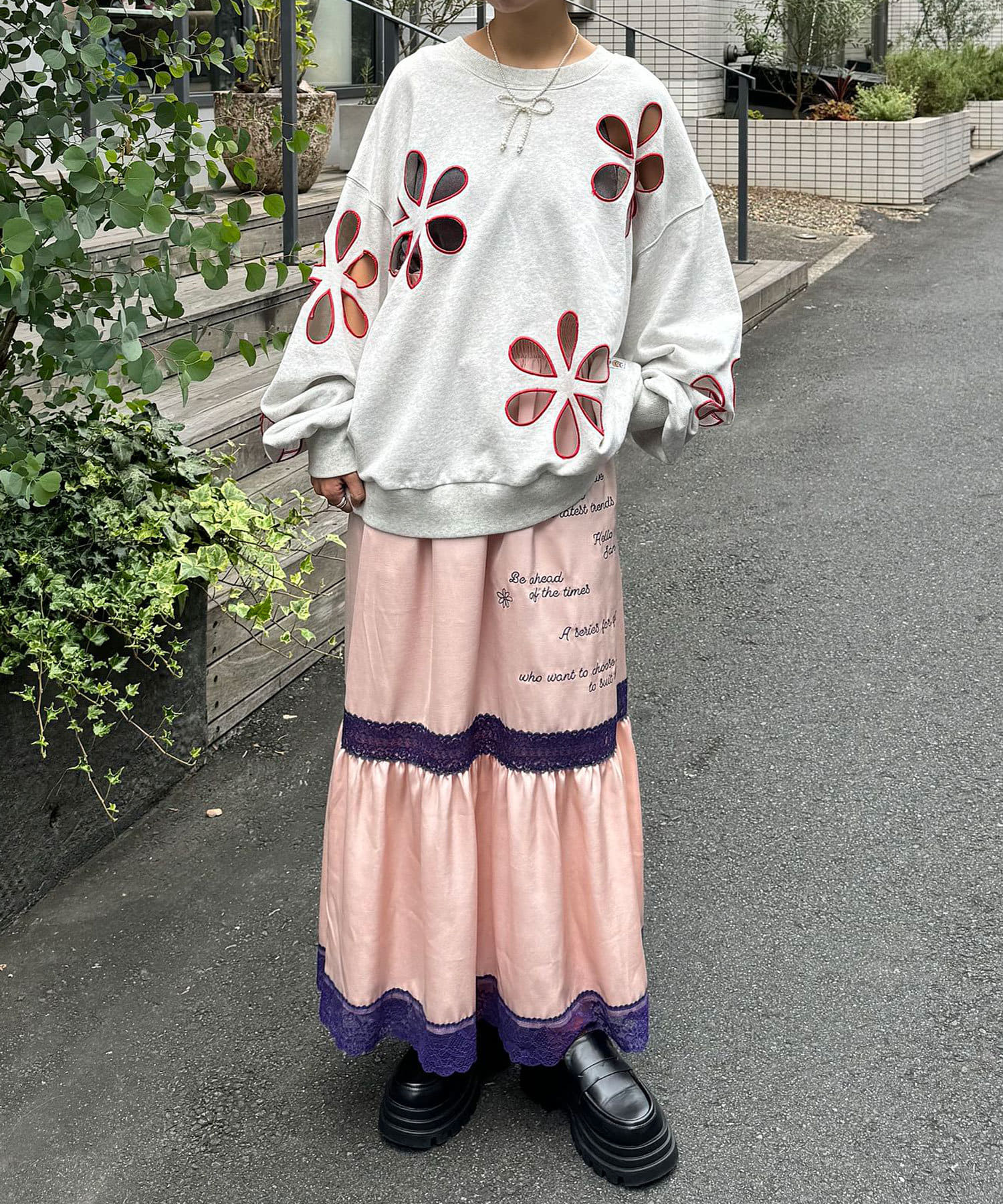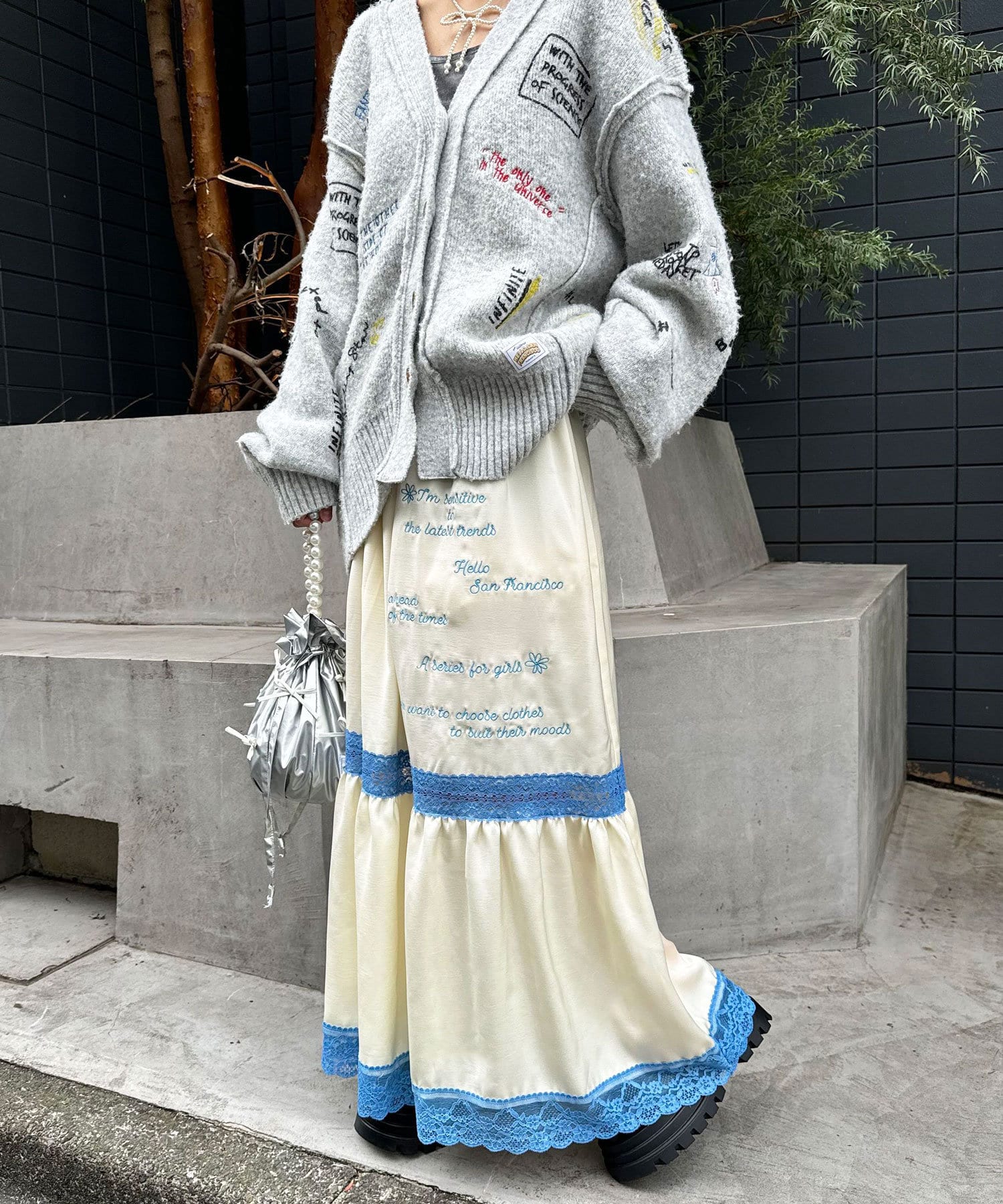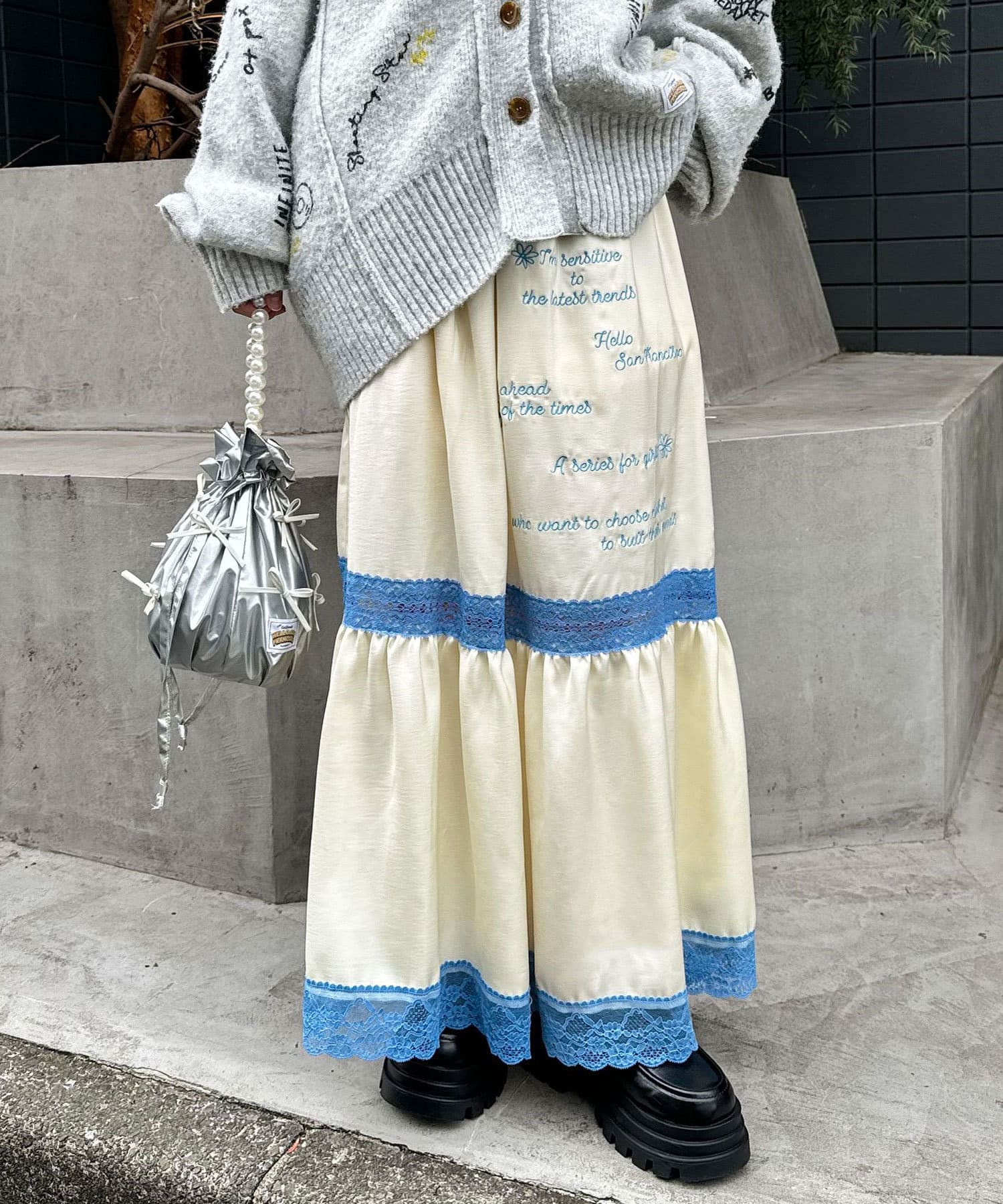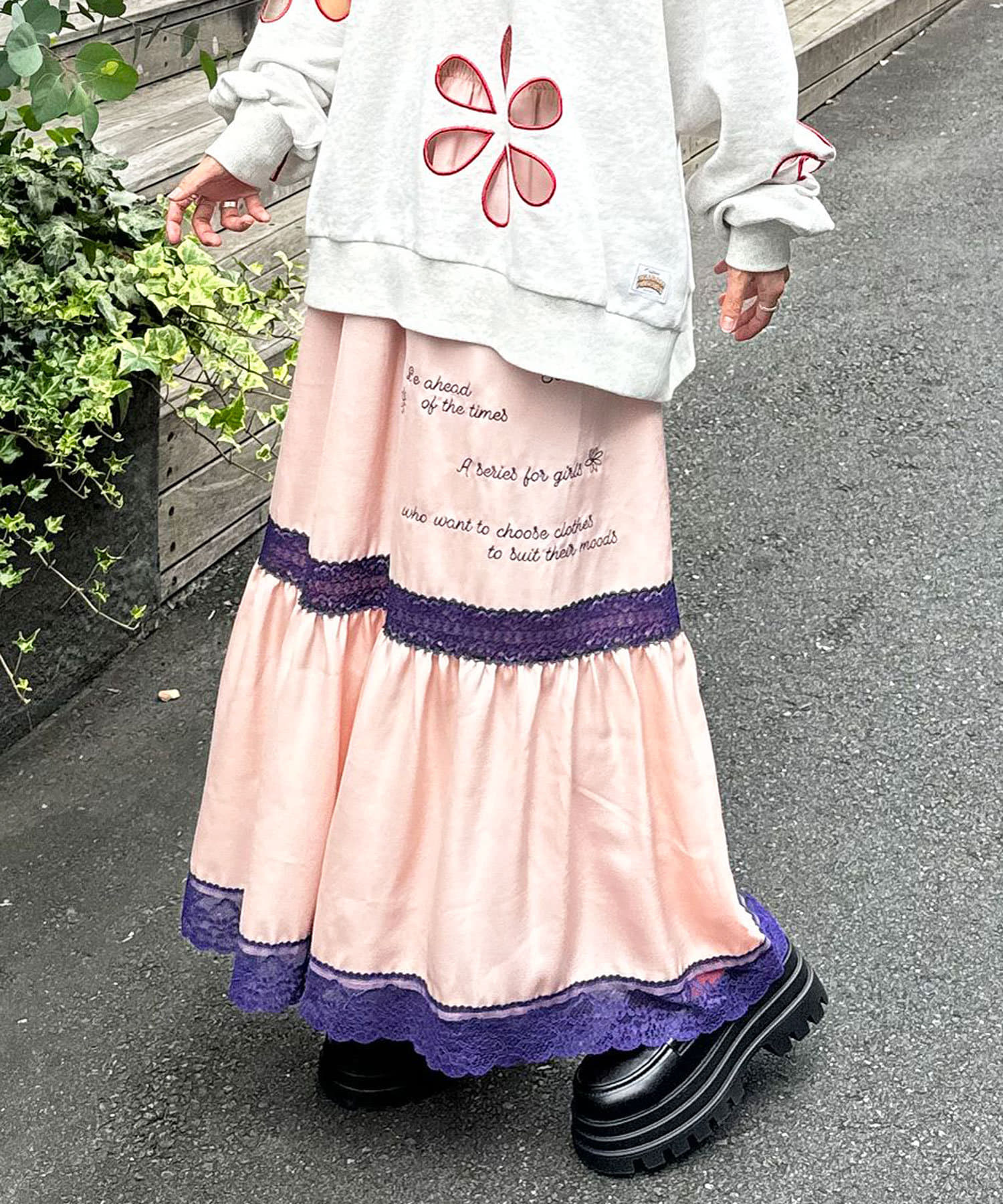 刺繍とレースで大人フェミニンを叶えるサテン刺繍レーススカート。