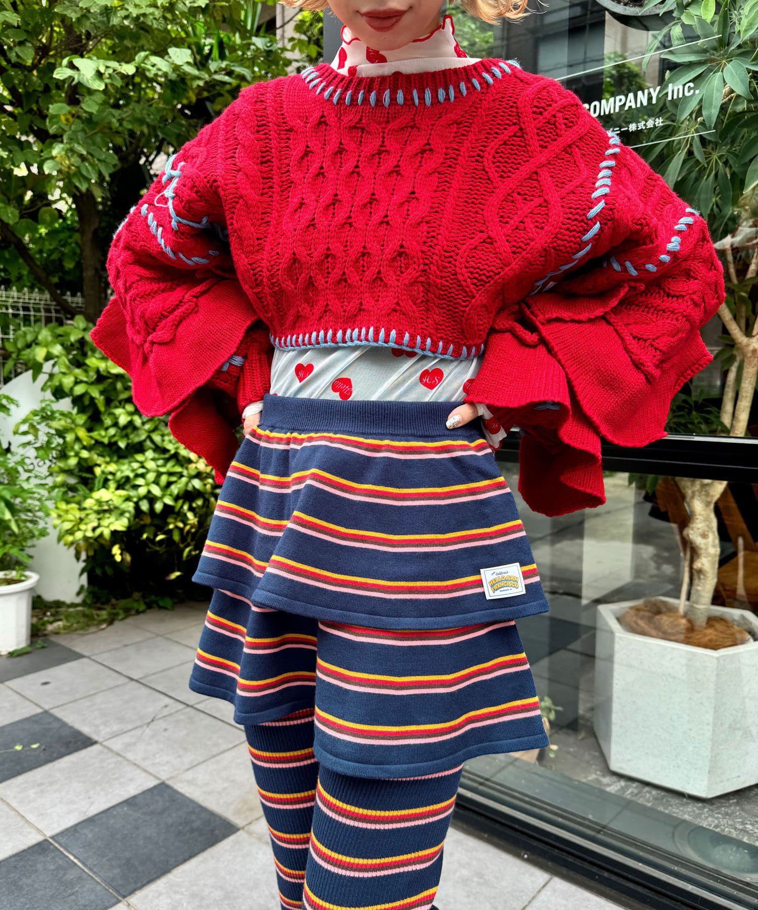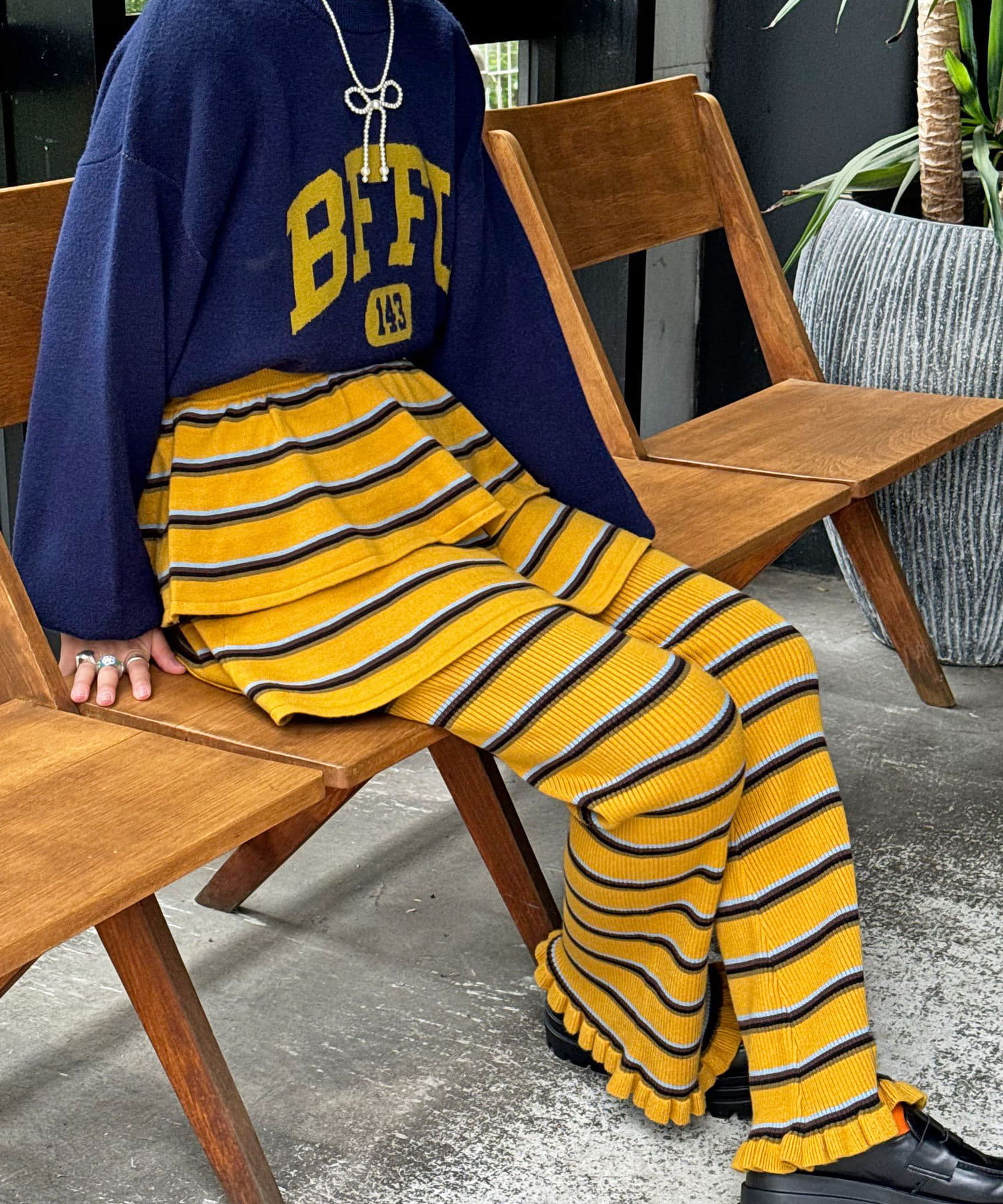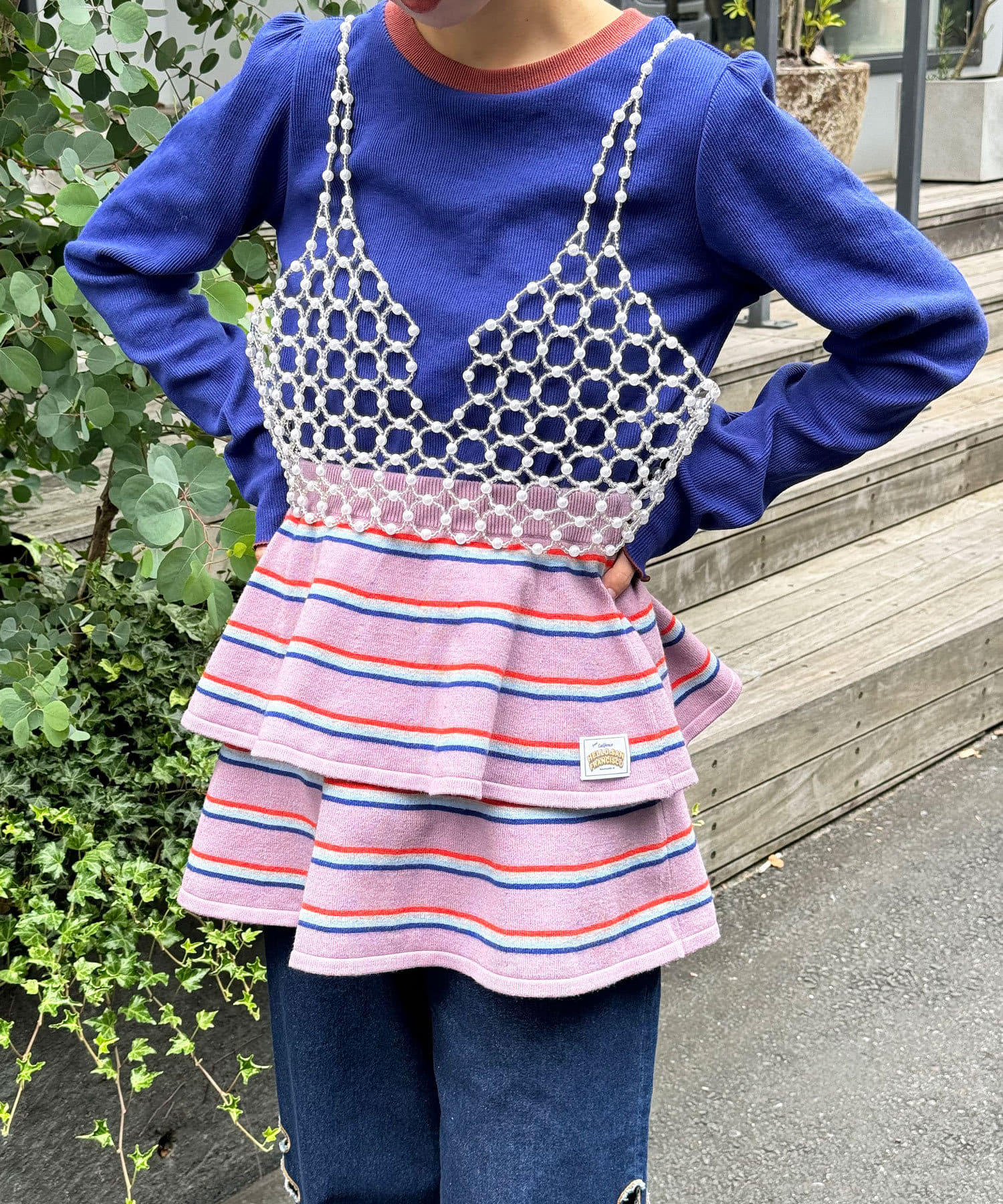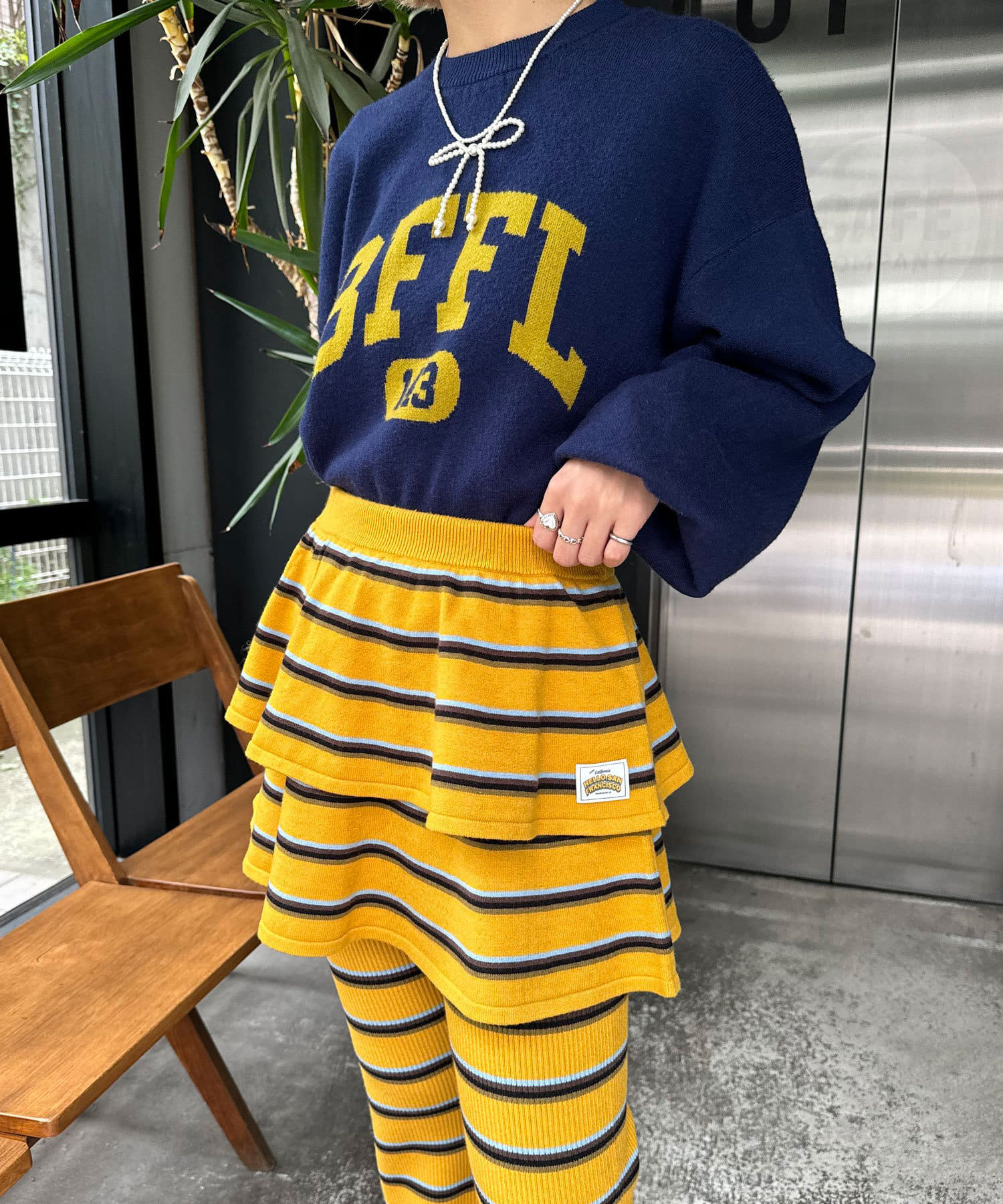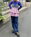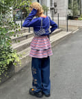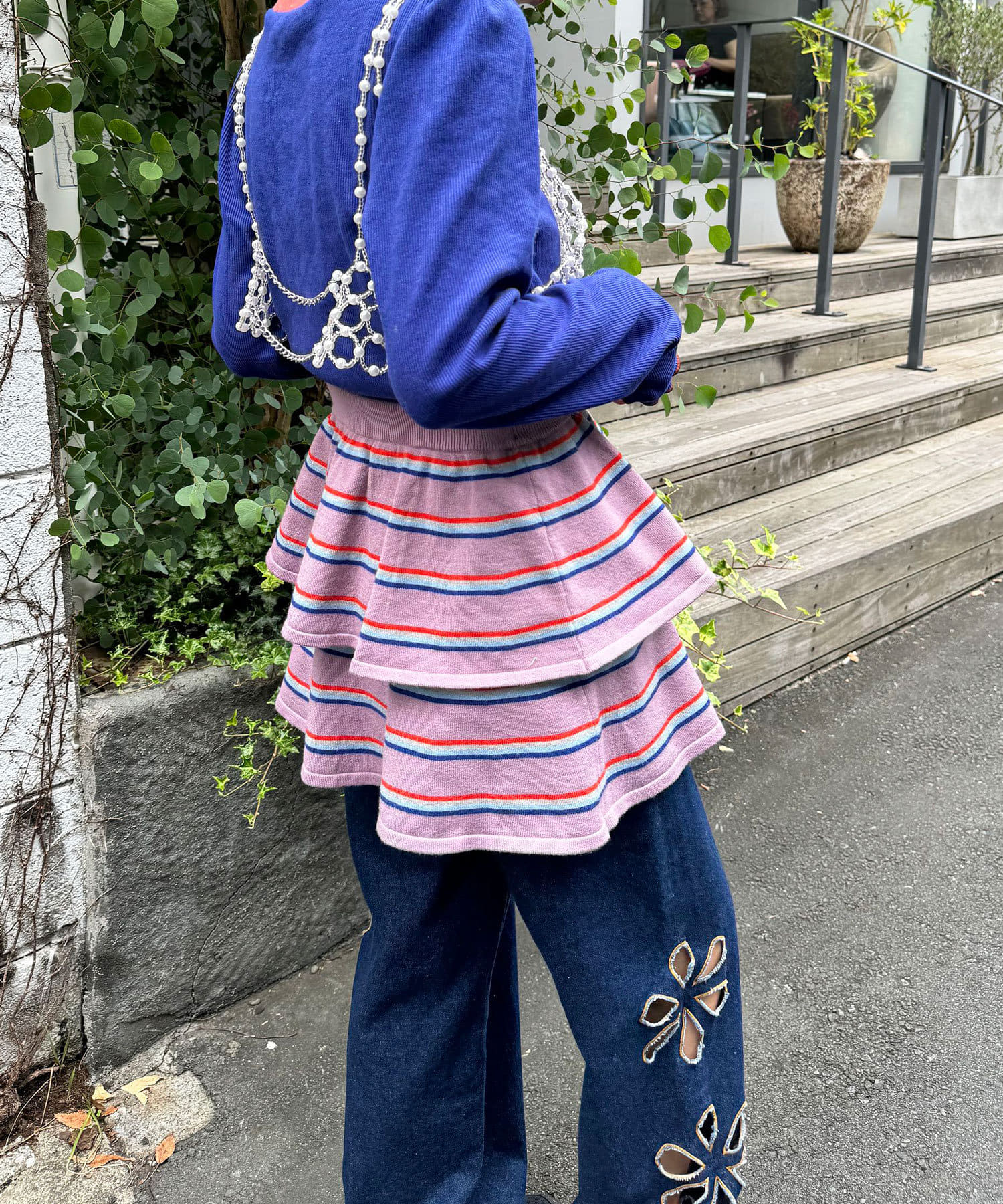 マルチボーダーの柄を主役に、スカートの軽やかさとデニムの落ち着いた雰囲気が絶妙にマッチします。
