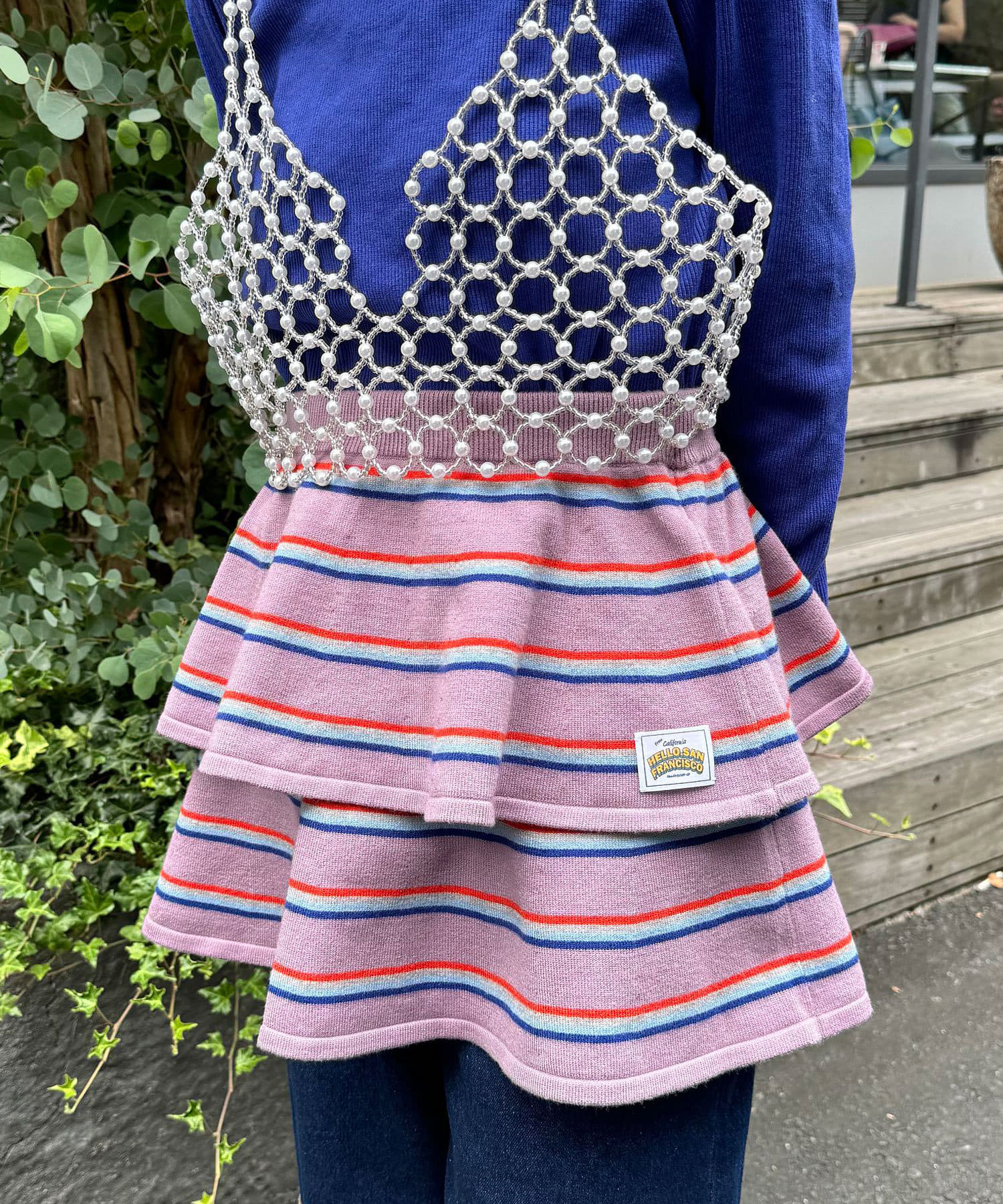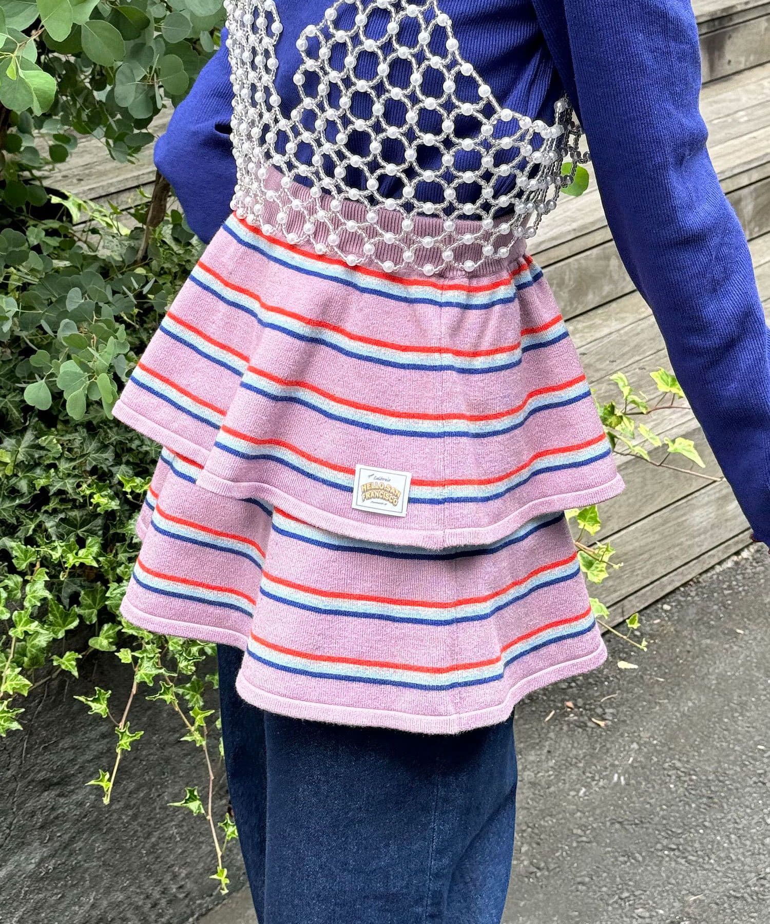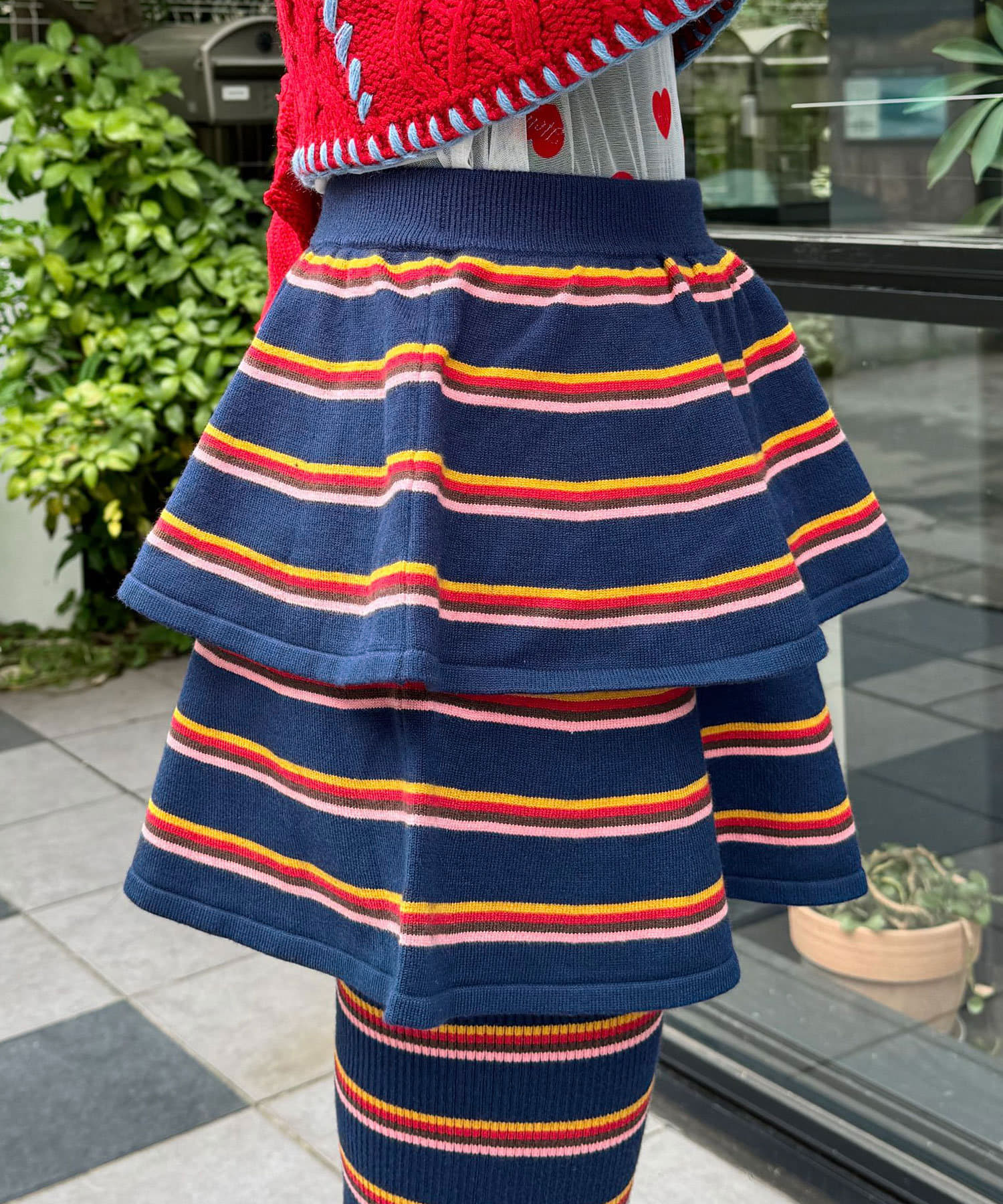 マルチボーダー柄が特徴的なティアードミニスカート。