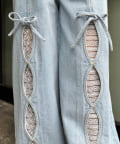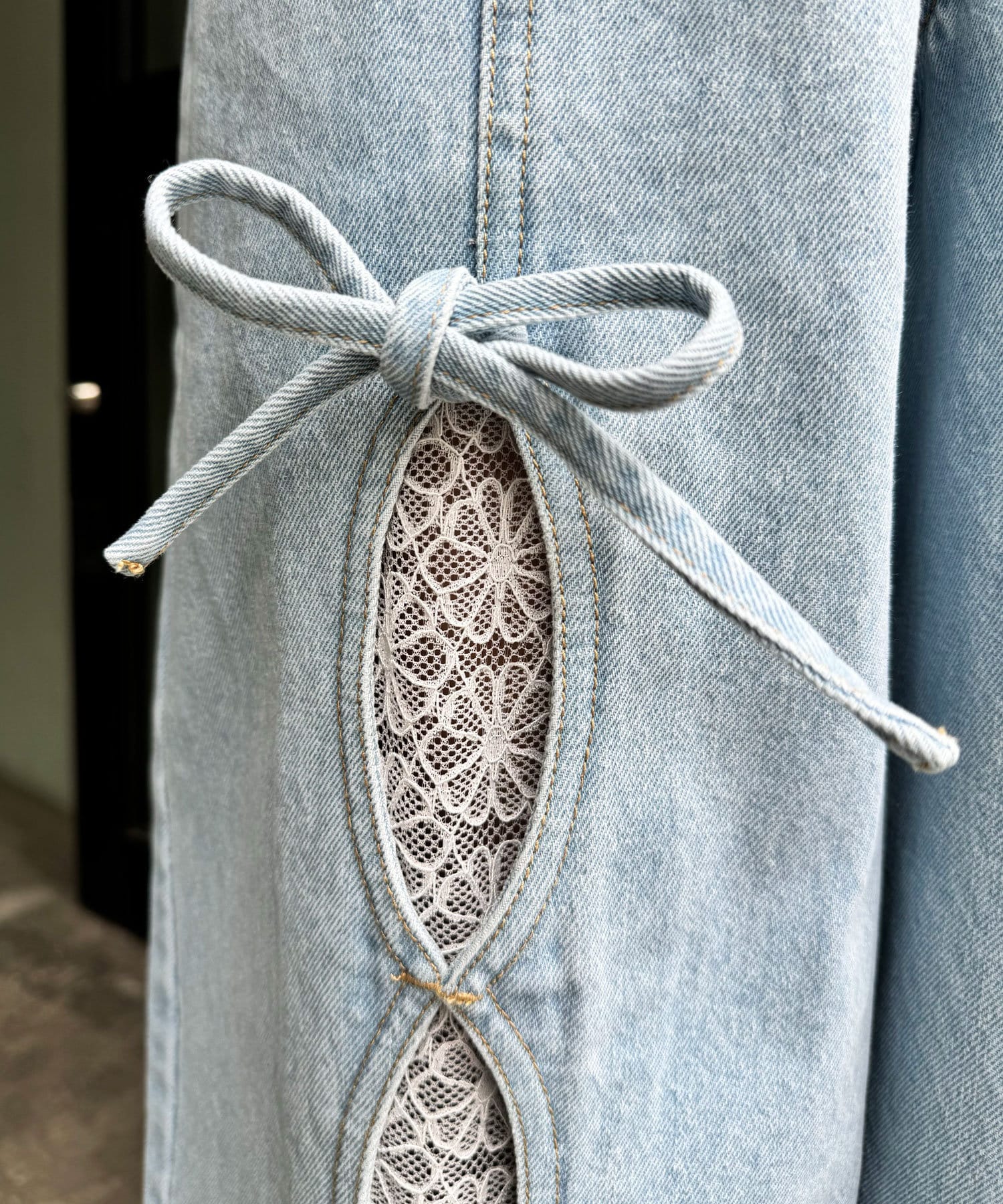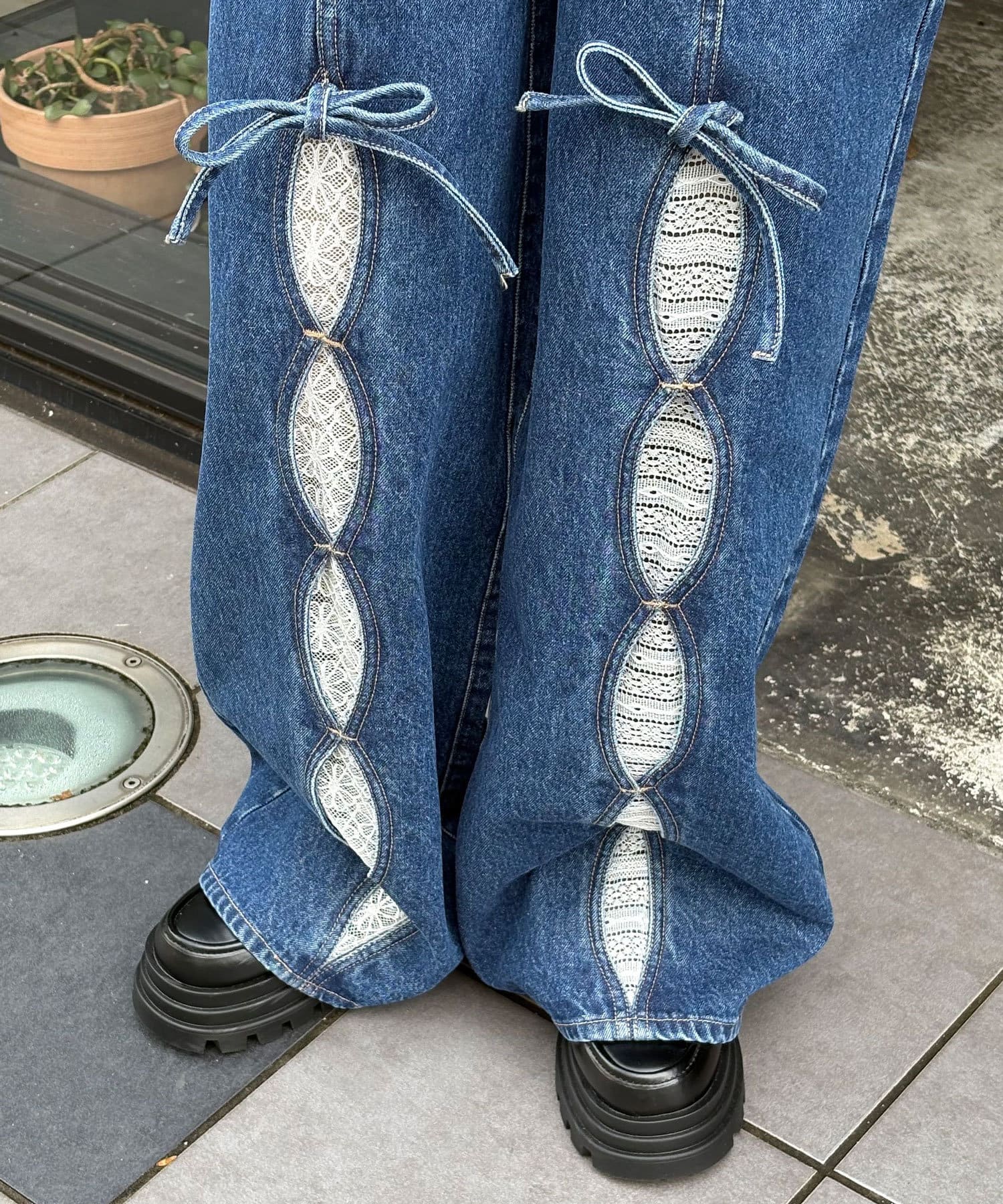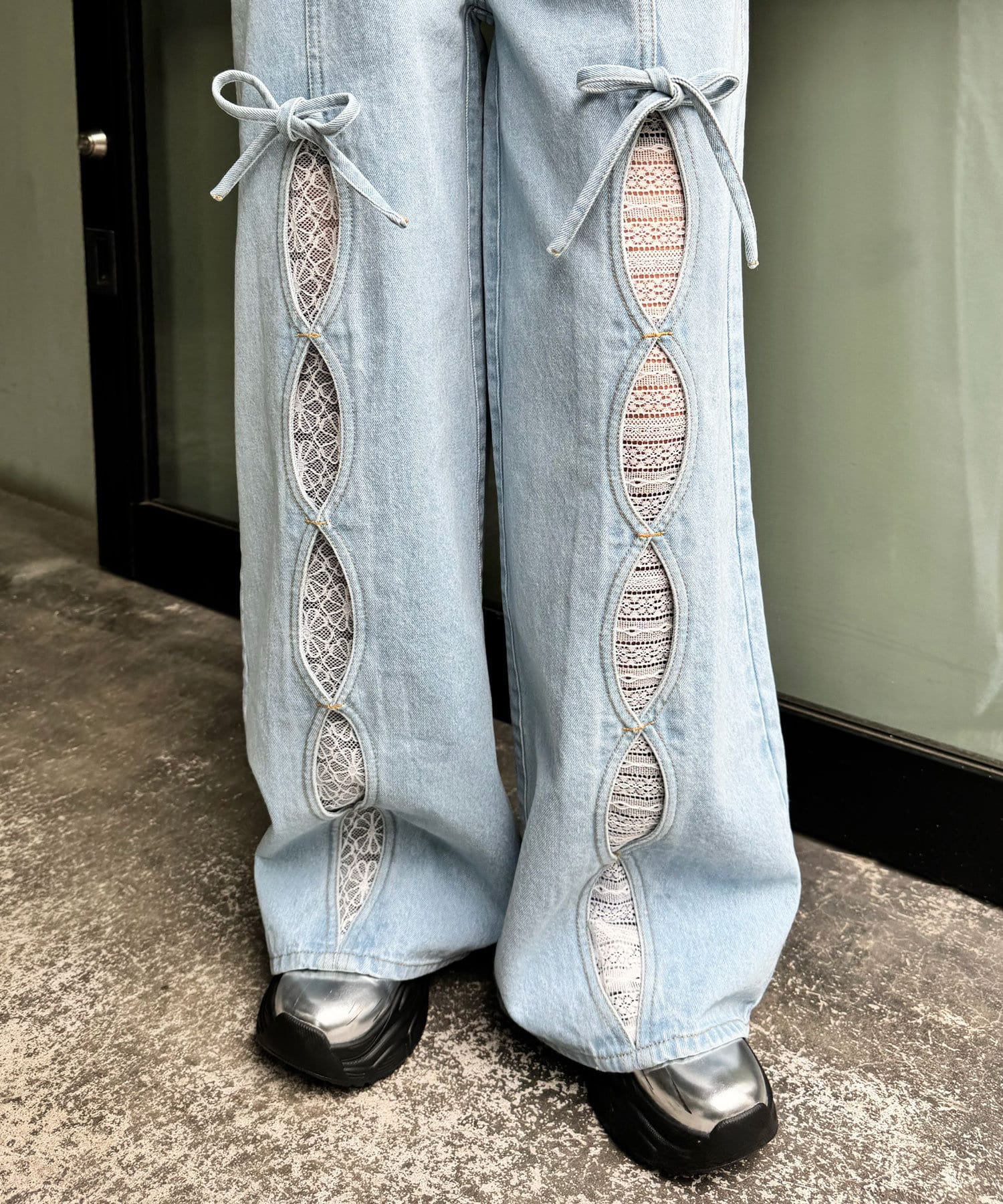 履くだけでトレンド感がアップするレースカットアウトワイドデニムパンツ。