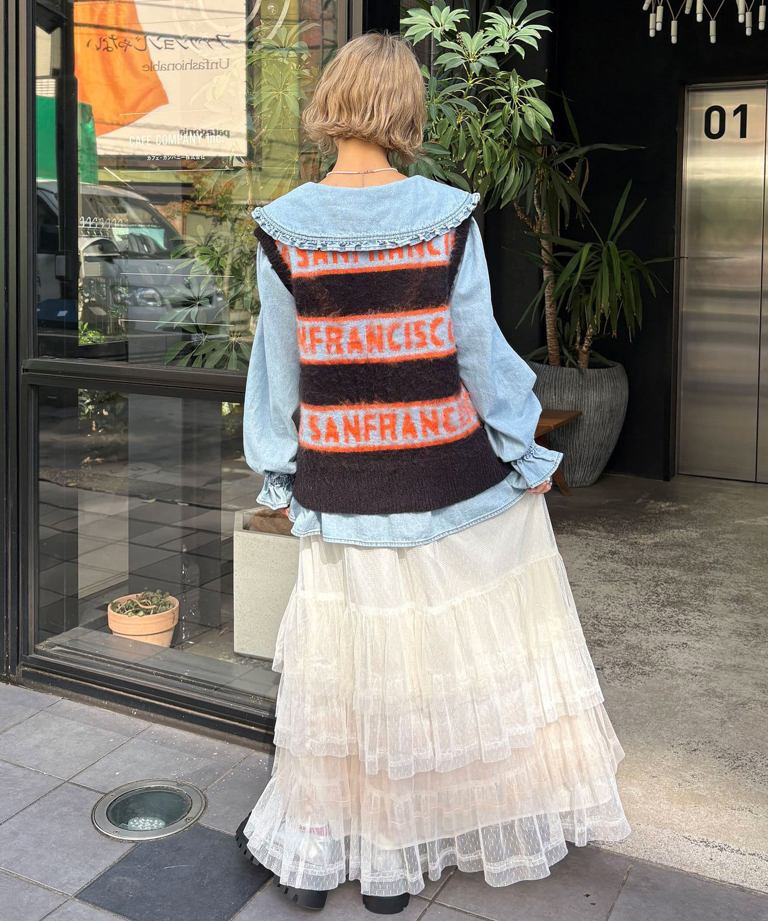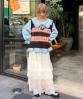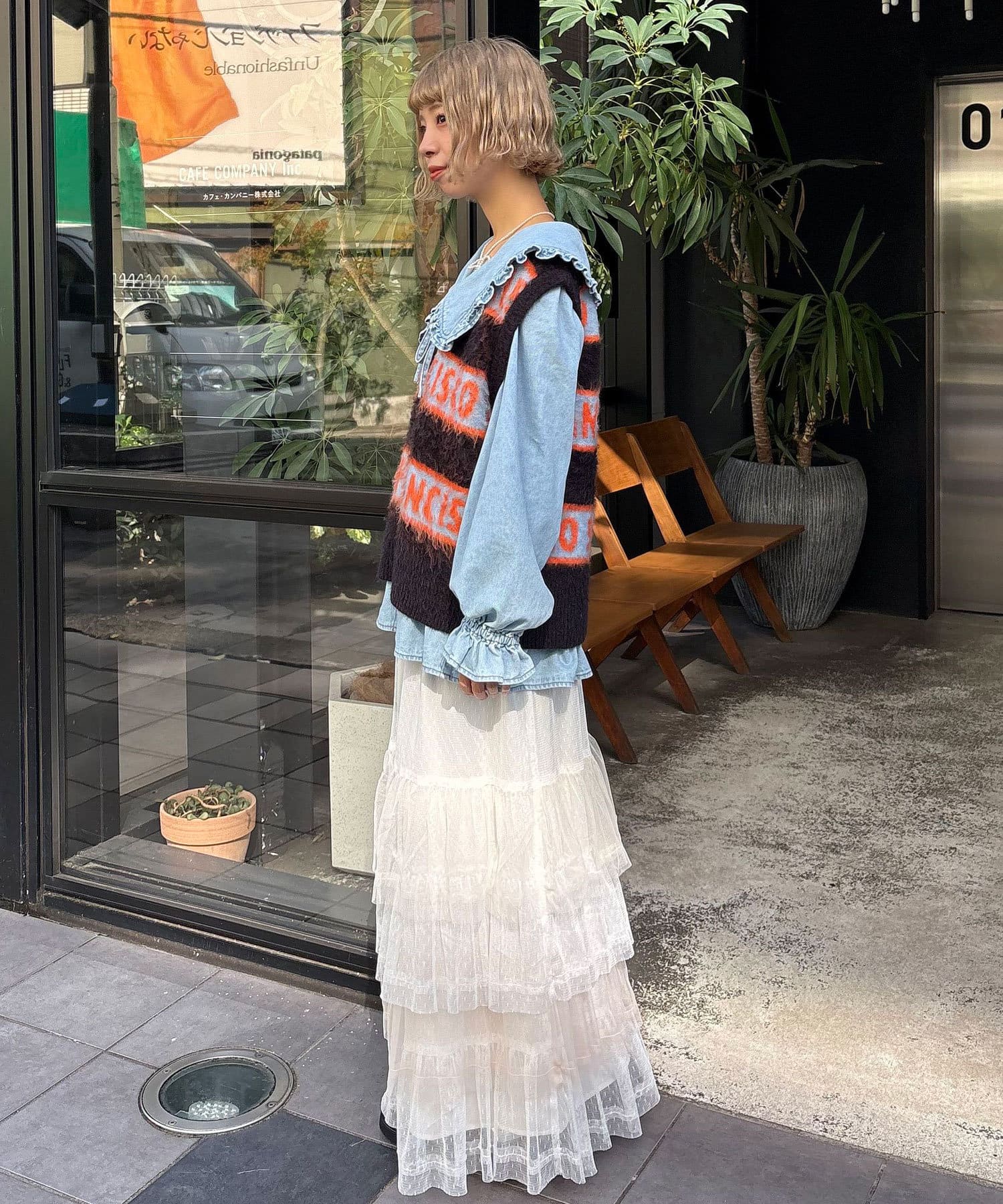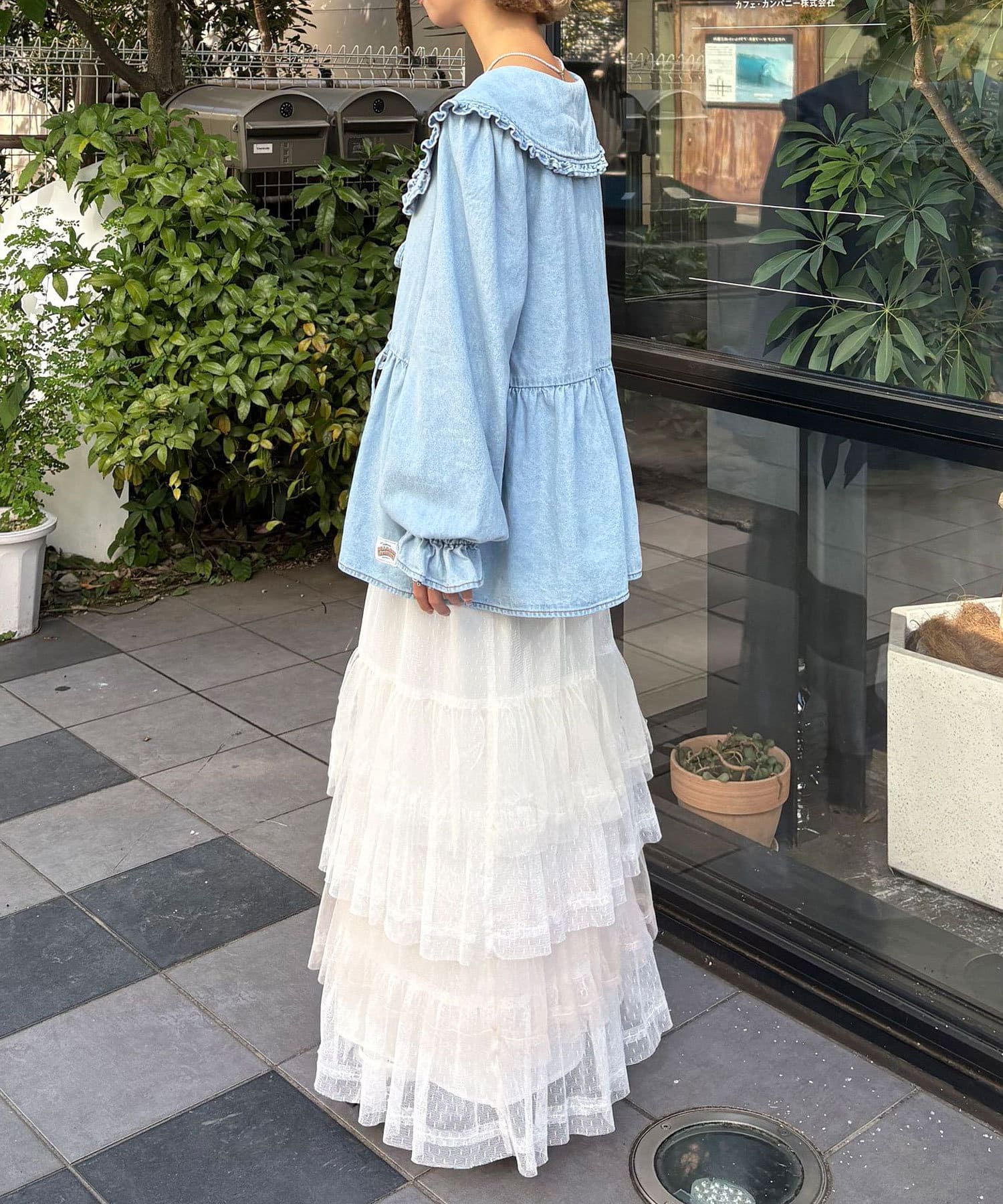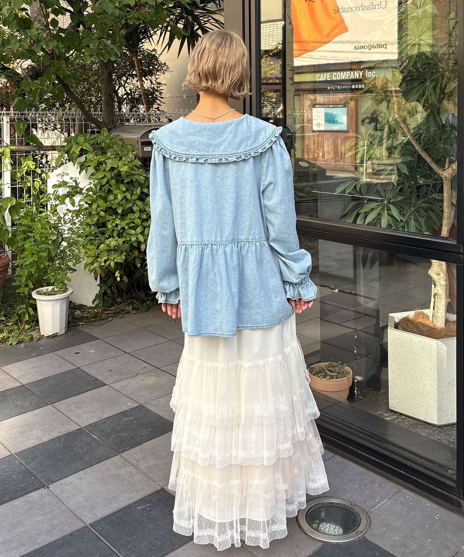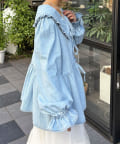 襟部分の細かめフリルが、コーディネートにアクセントと華やかさをプラス。