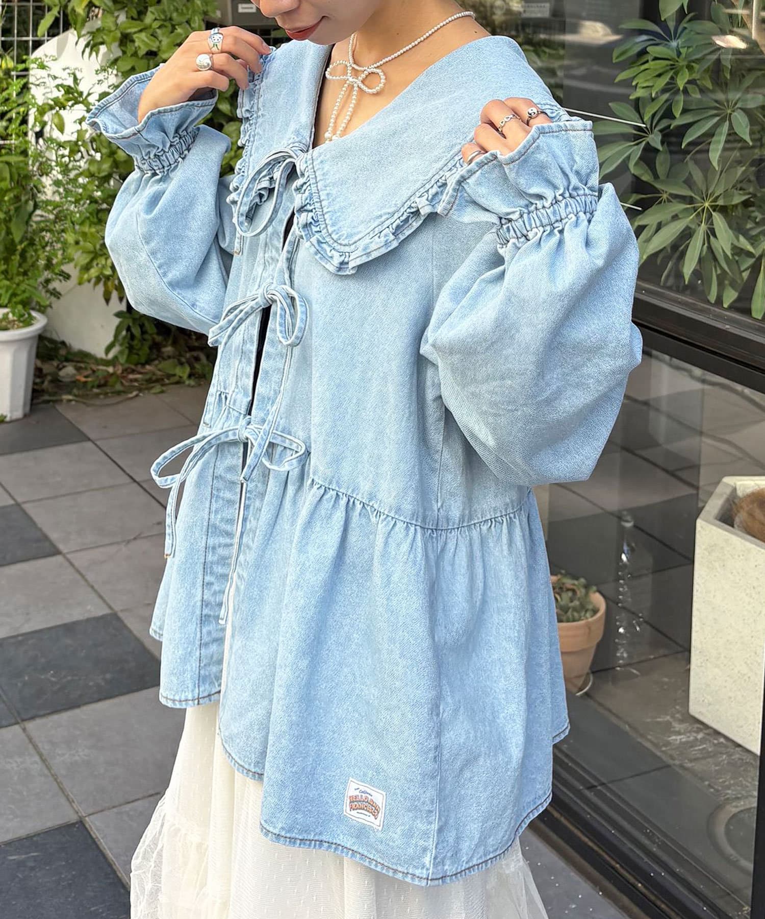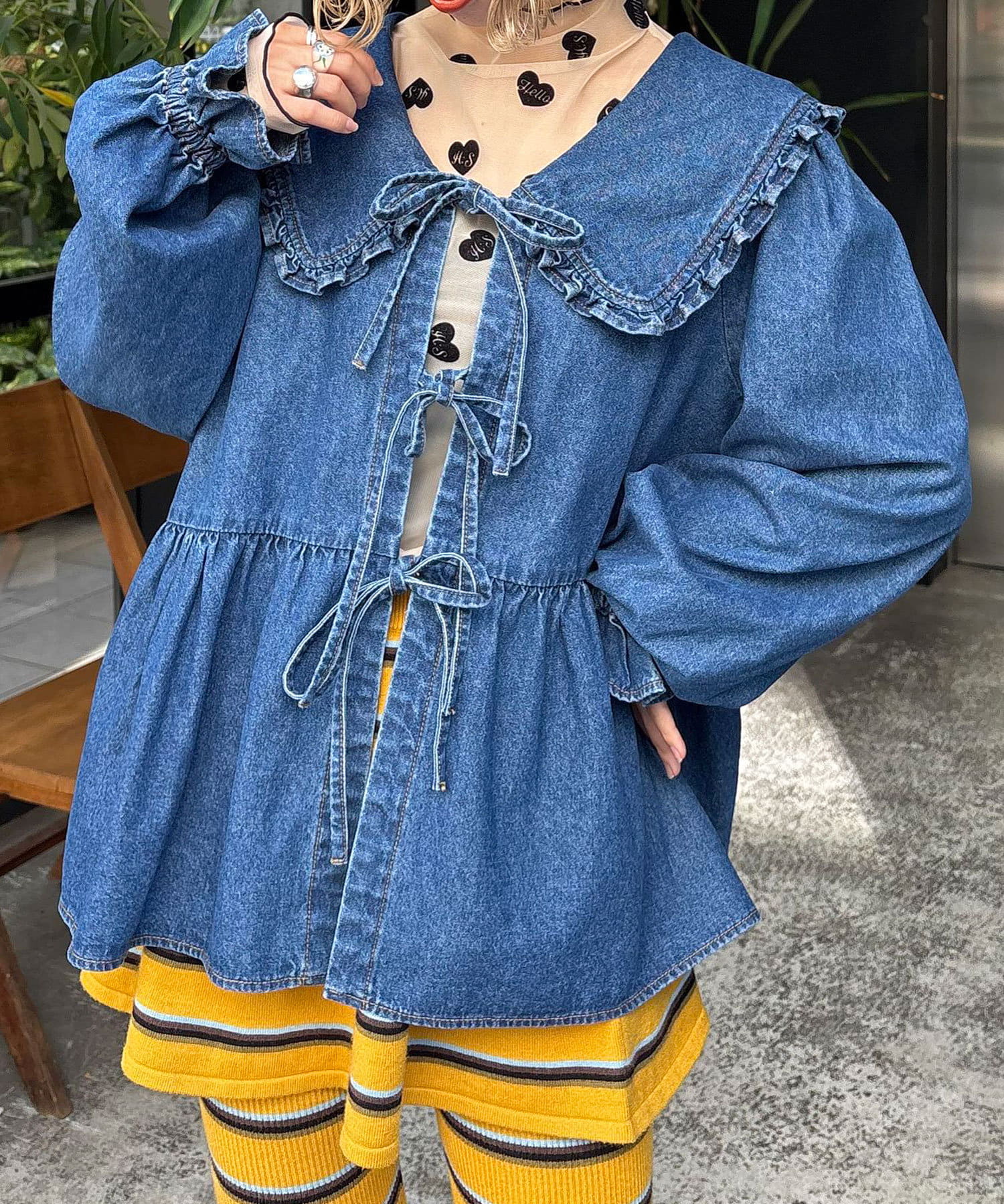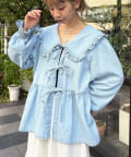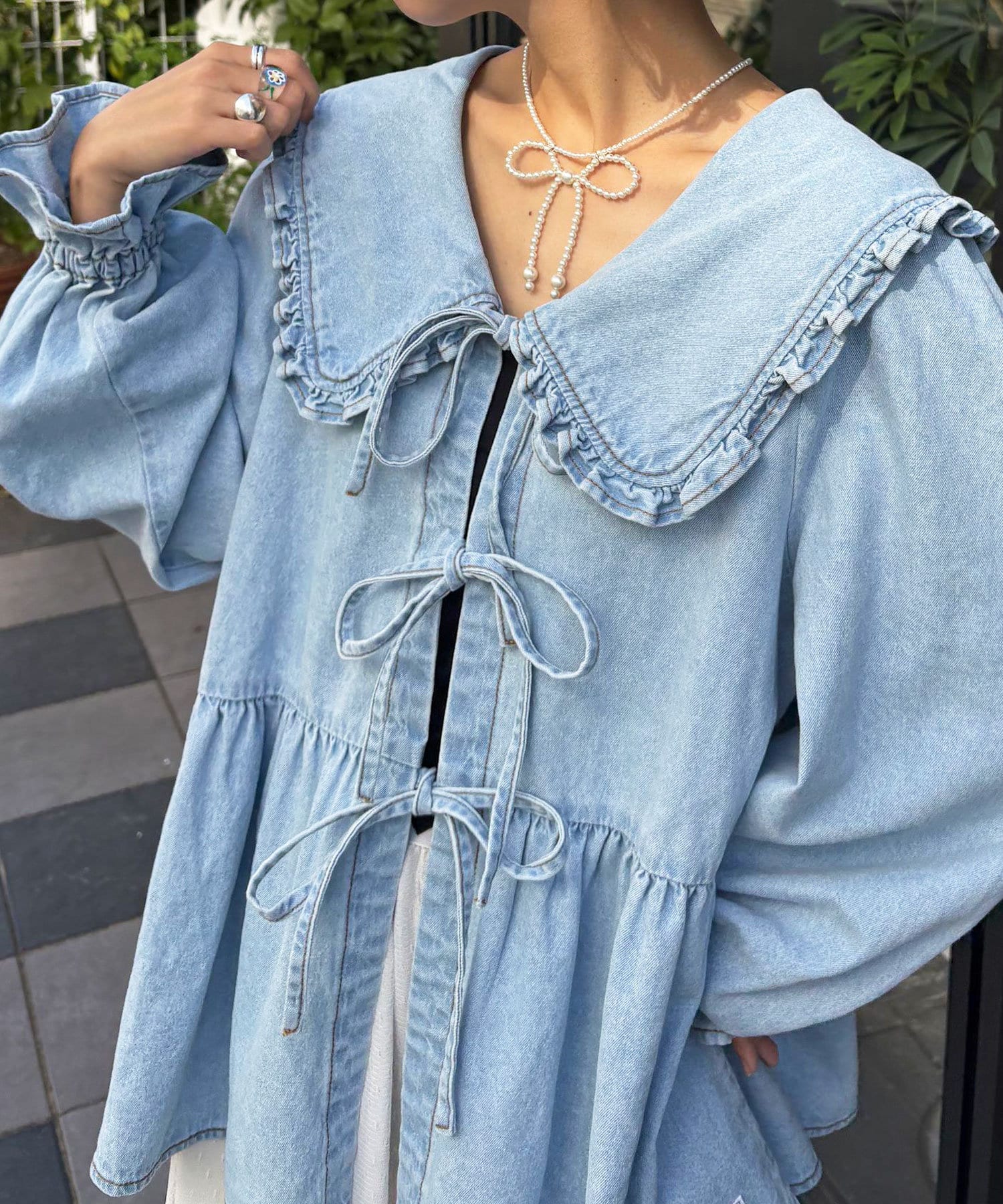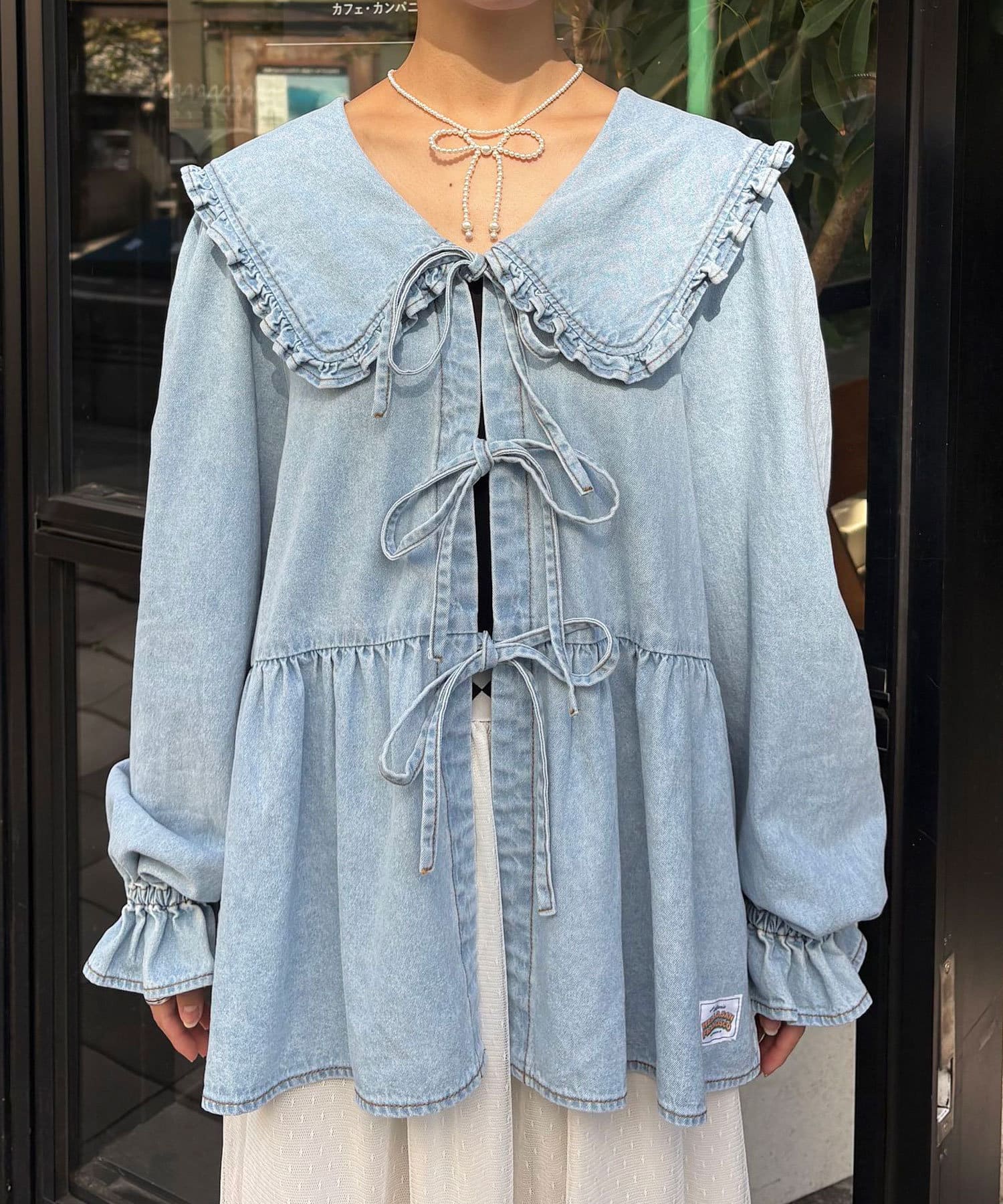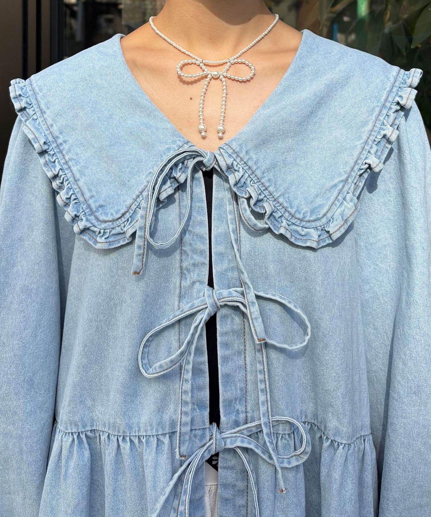 つけ襟風デザインが可愛いリボンデニムシャツ