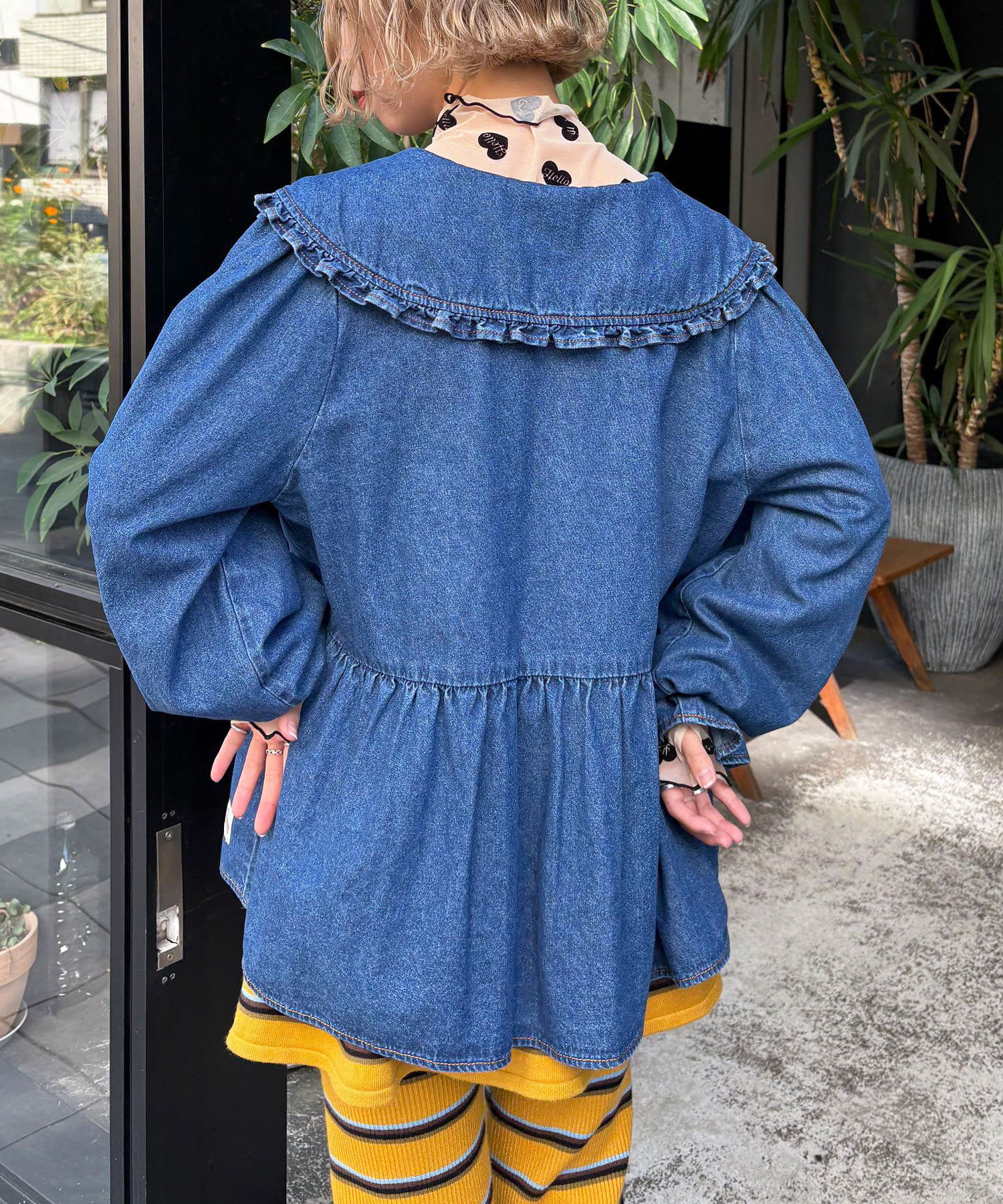 ●この製品はデニム素材を使用していますので、摩擦・水などにより色落ちし、他の衣類に移染する場合があります。白、または薄い色の洋服との重ね着はお避けください。