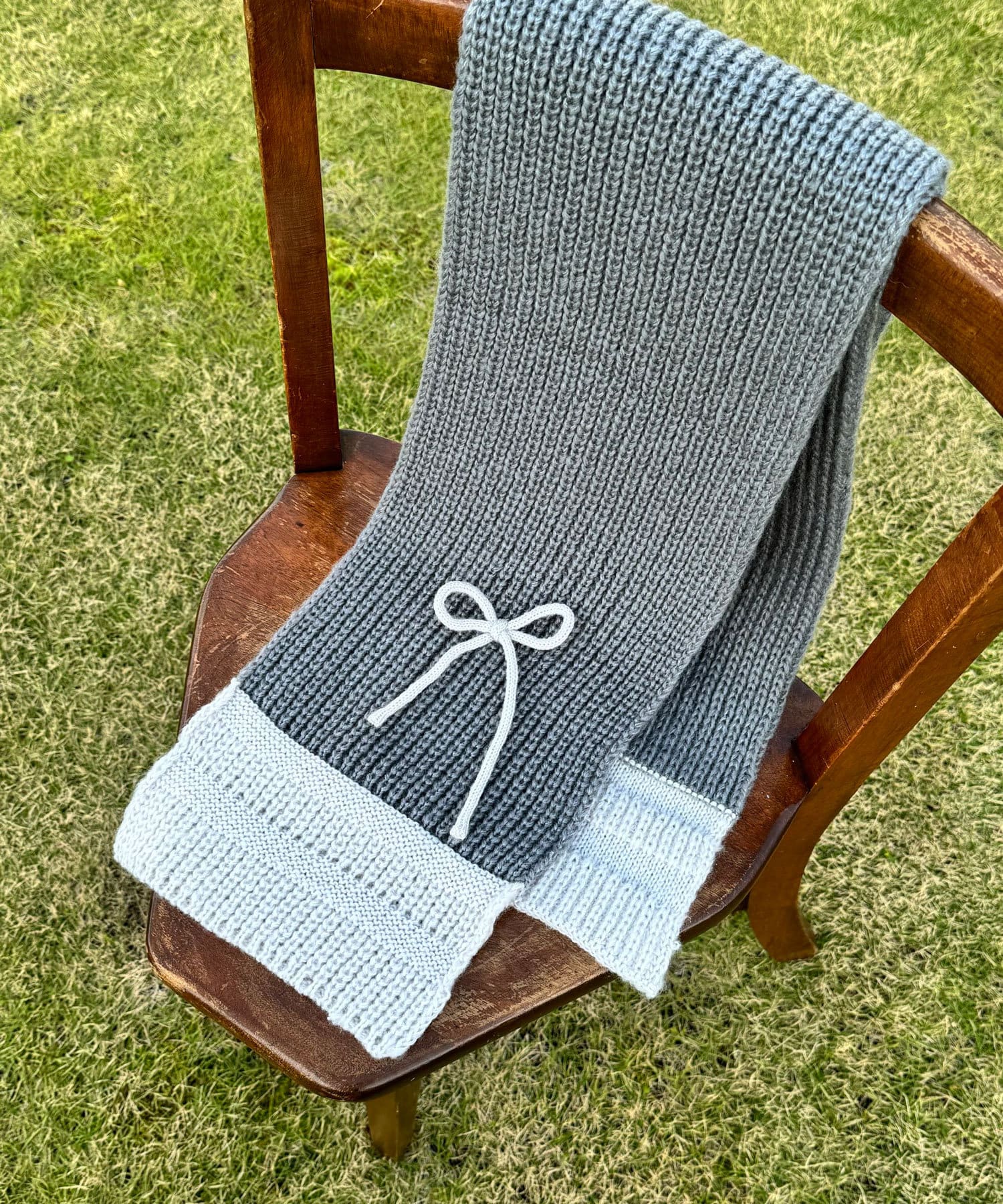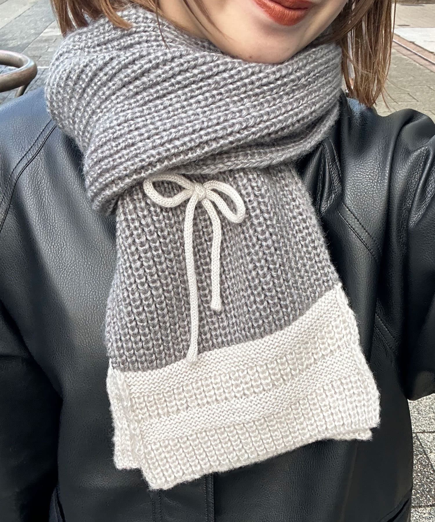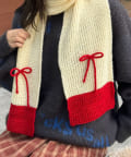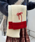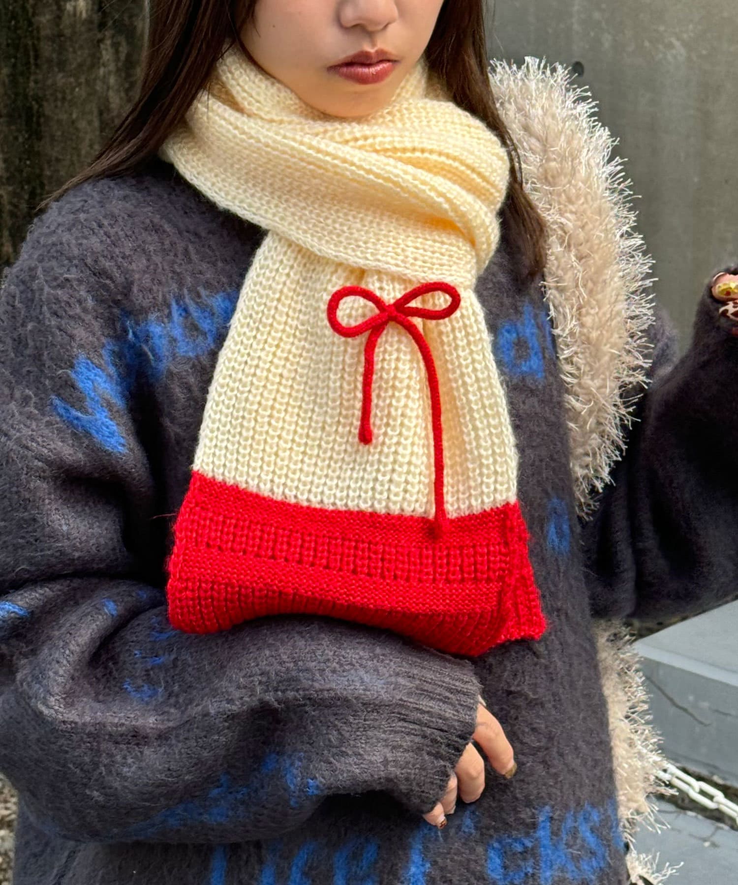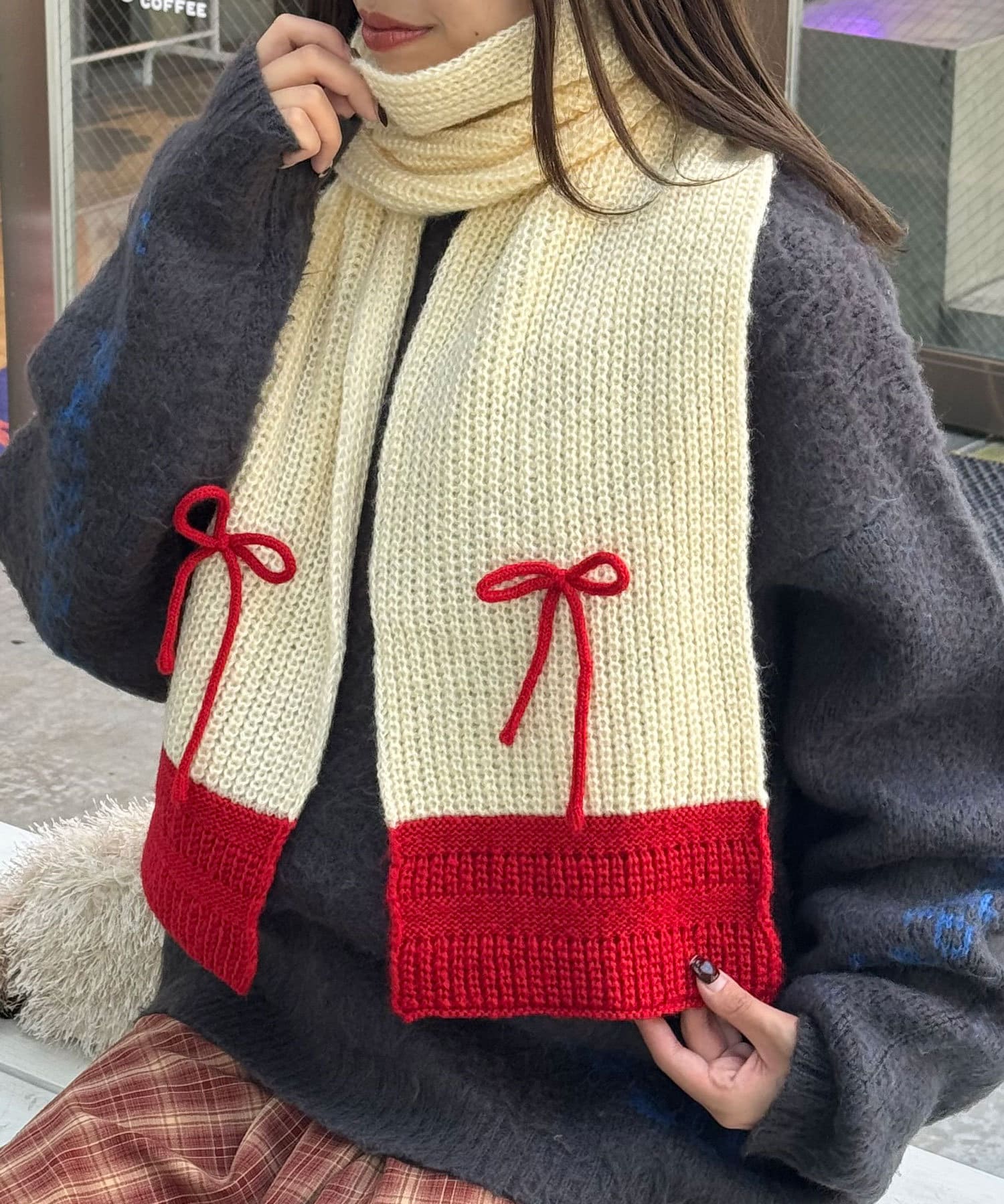 裾にフリンジとリボンを差し色として取り入れた、トレンドのバレエコアを感じさせるリボンニットマフラー。