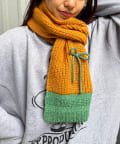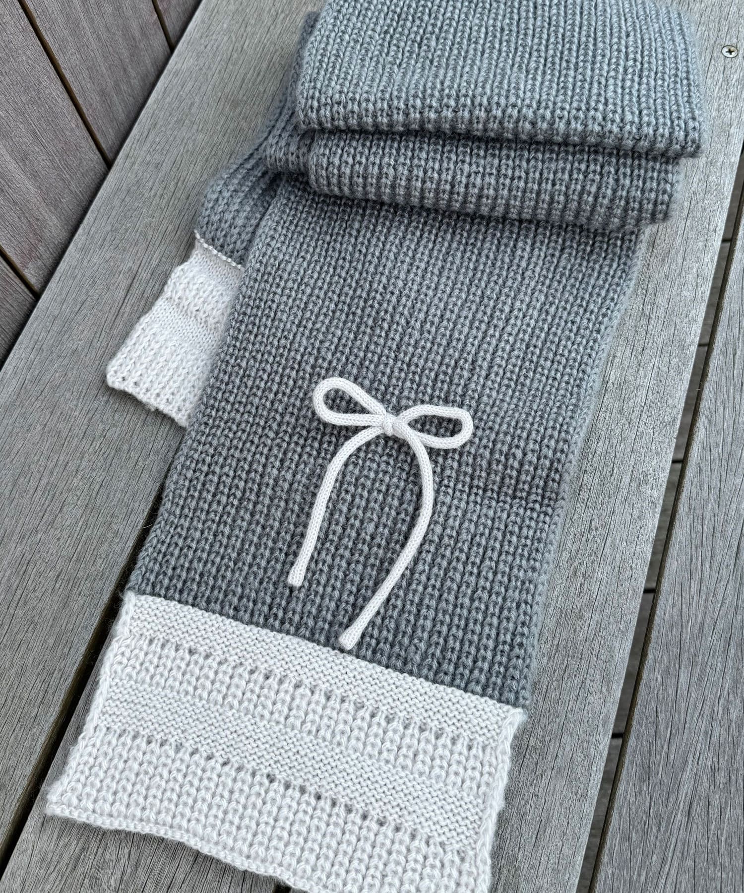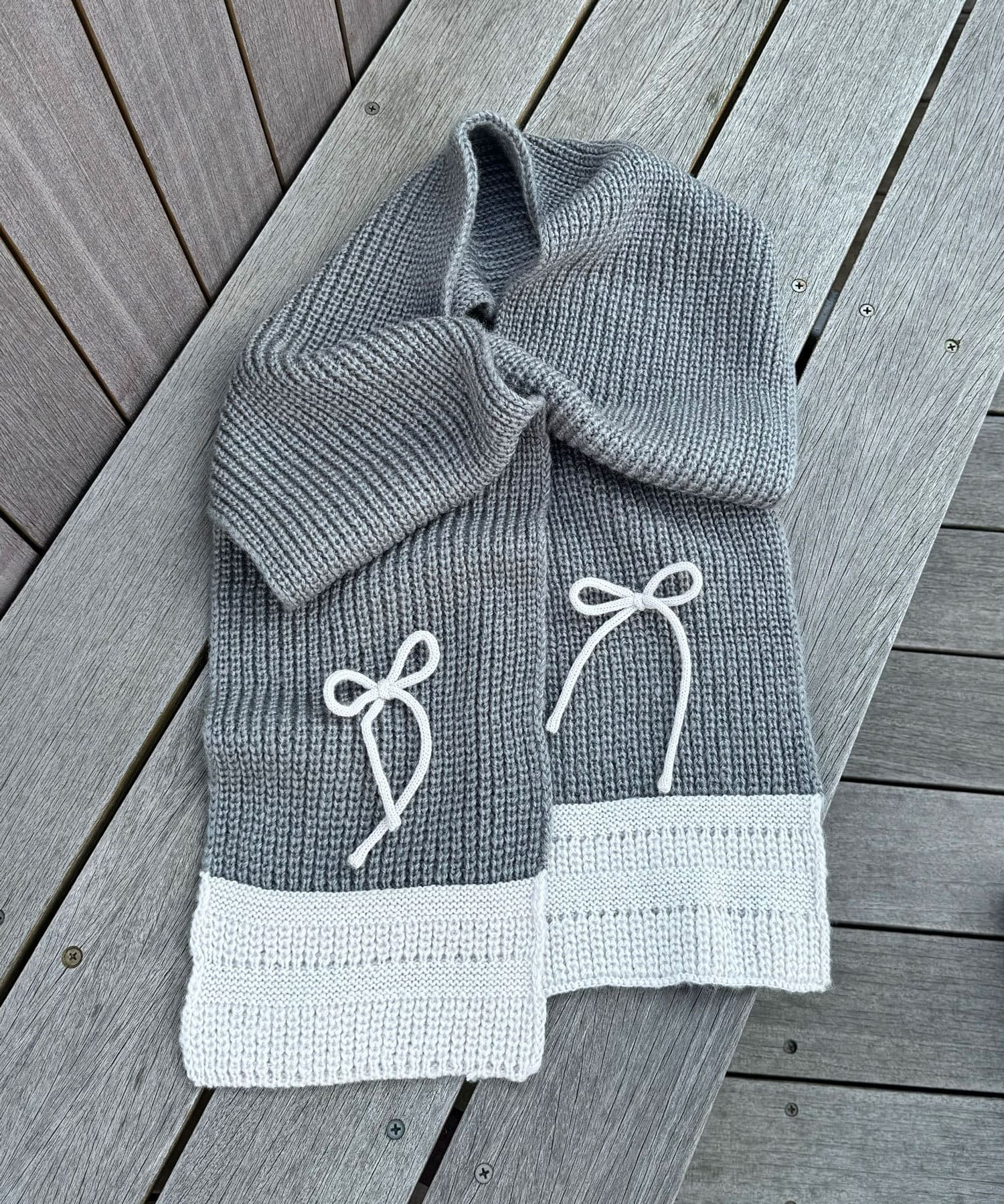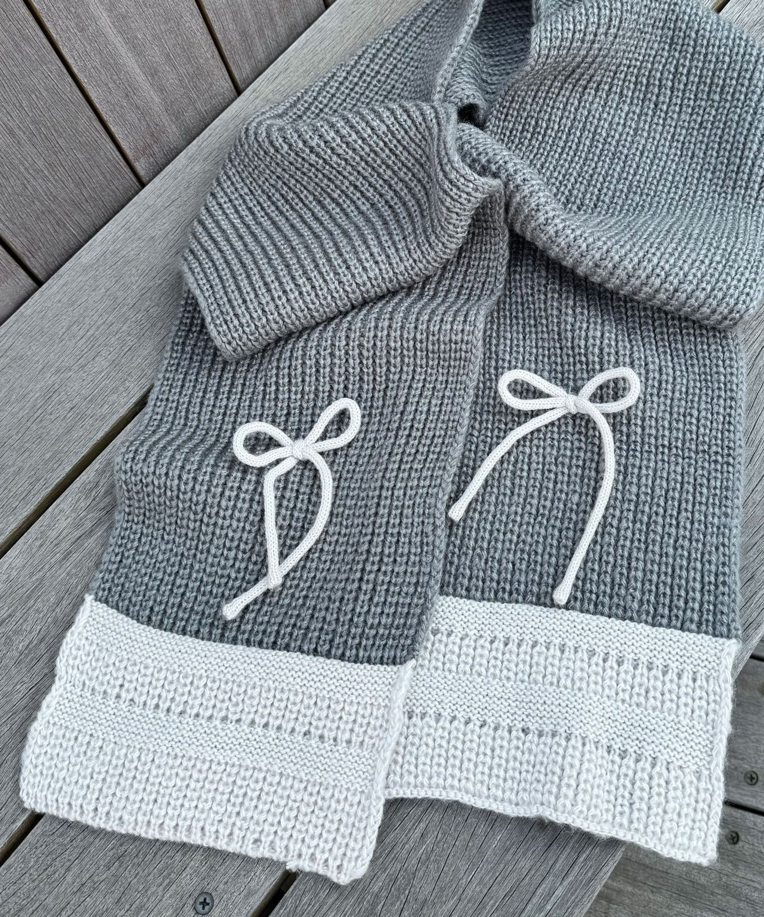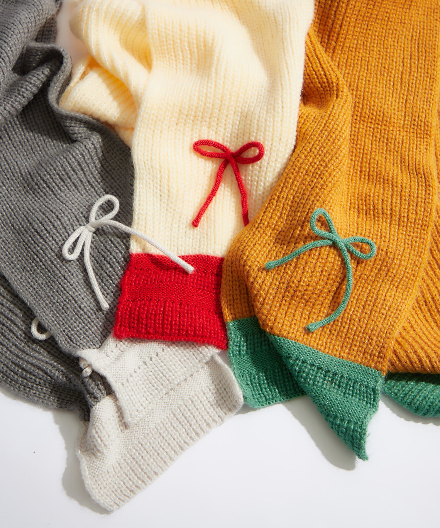 裾にフリンジとリボンを差し色として取り入れた、トレンドのバレエコアを感じさせるリボンニットマフラー。
