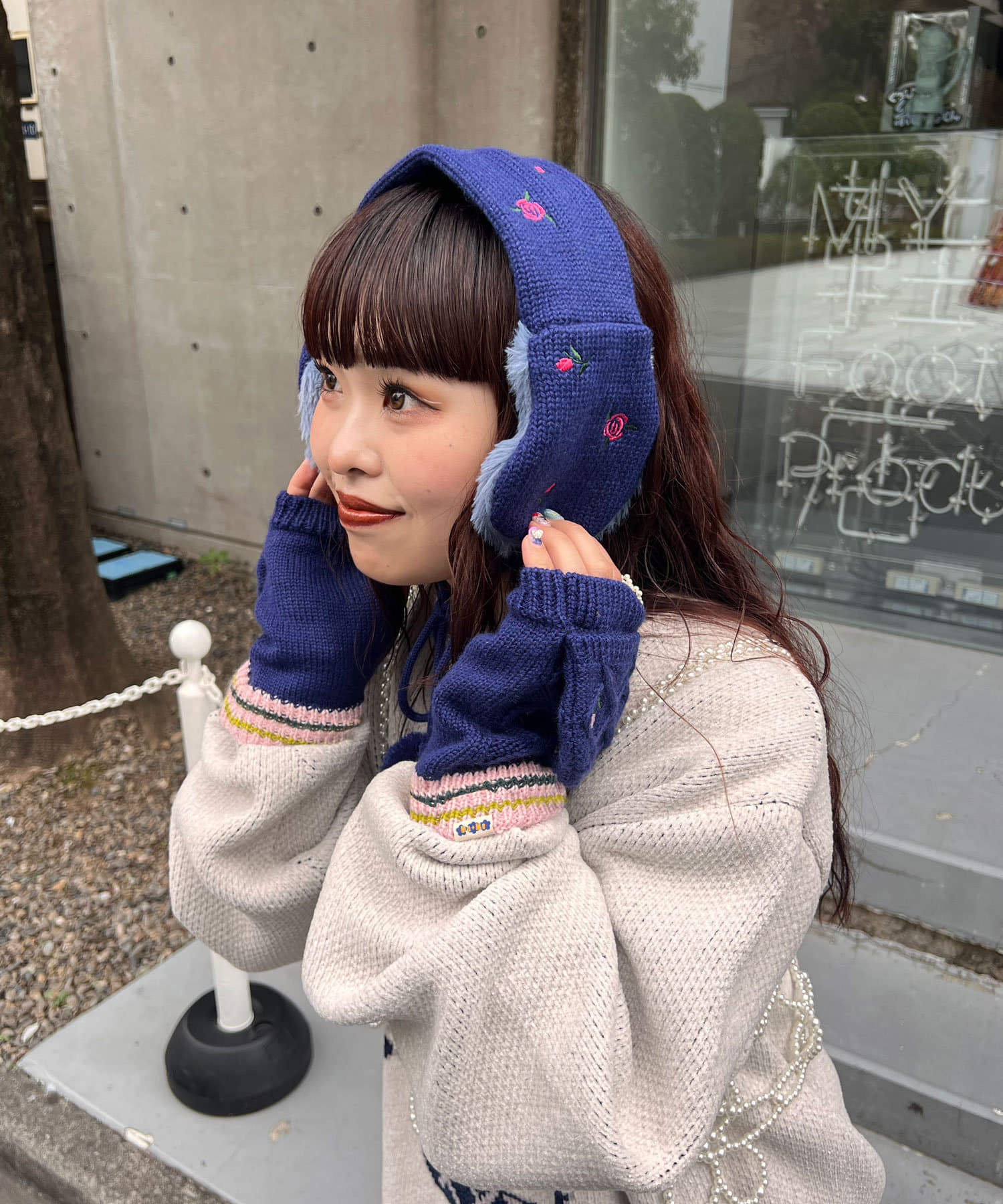 お花刺繍イヤーマフとお揃いの柄のミトン!