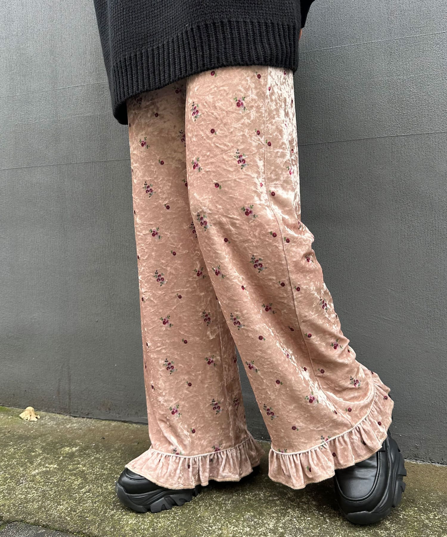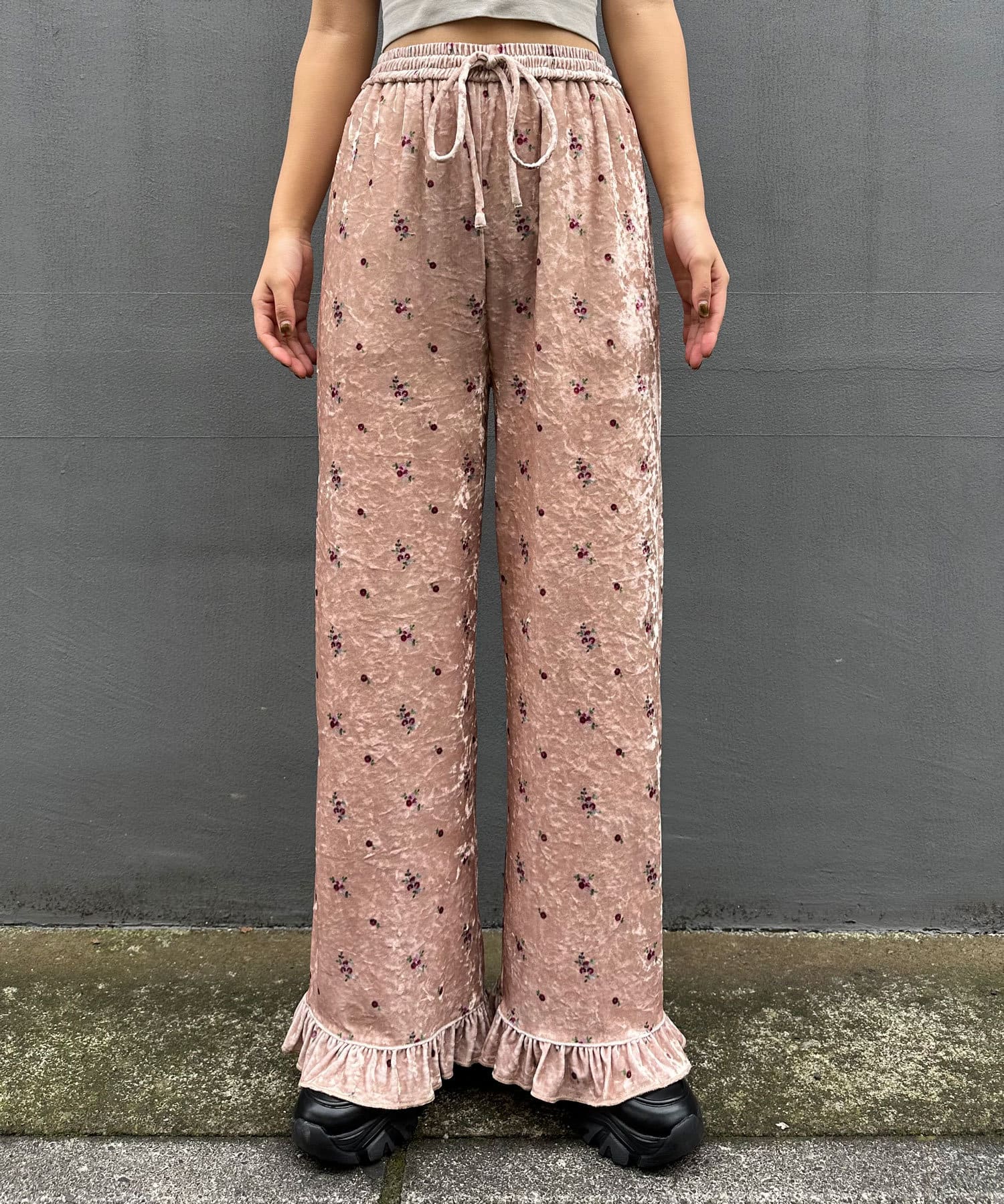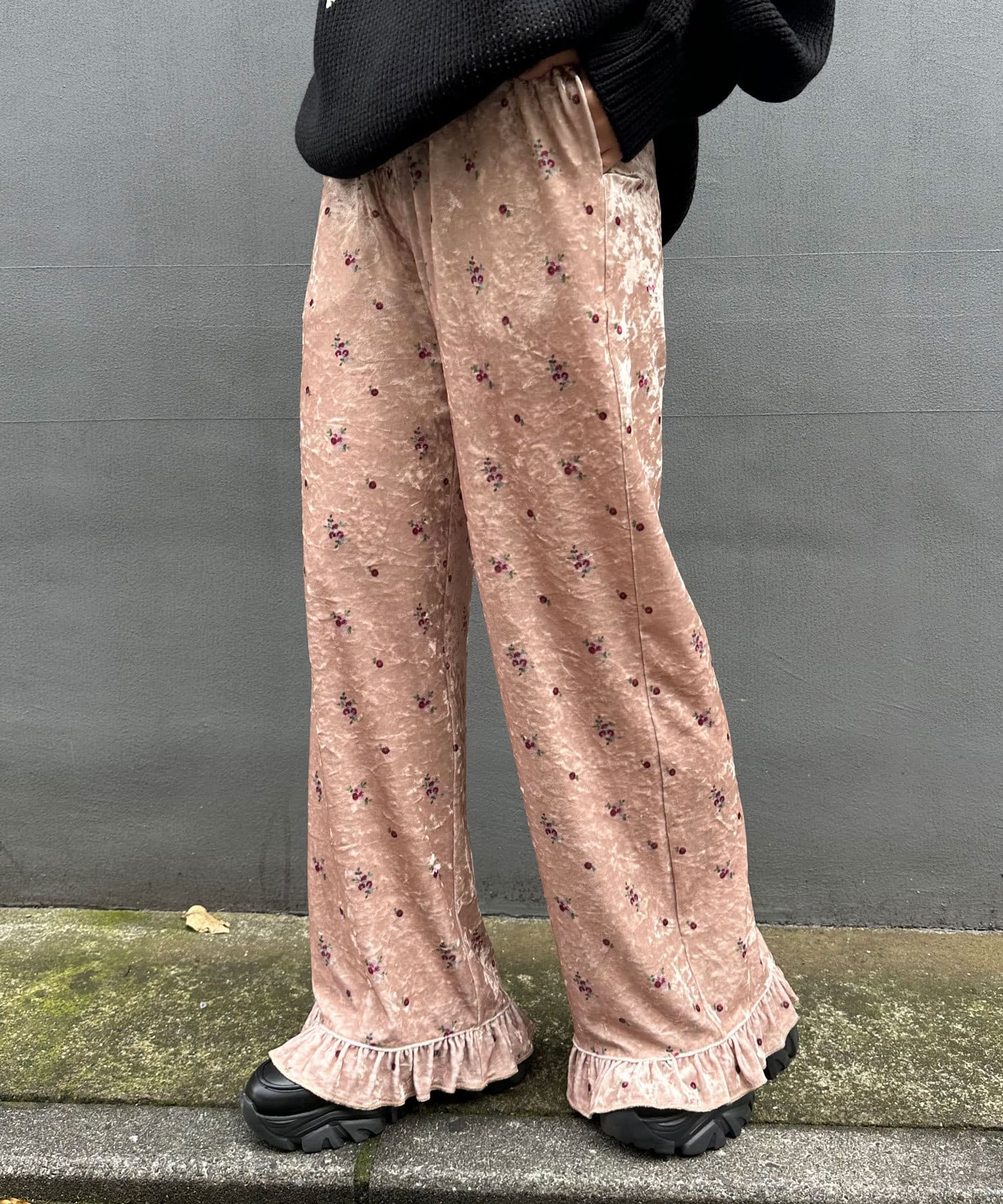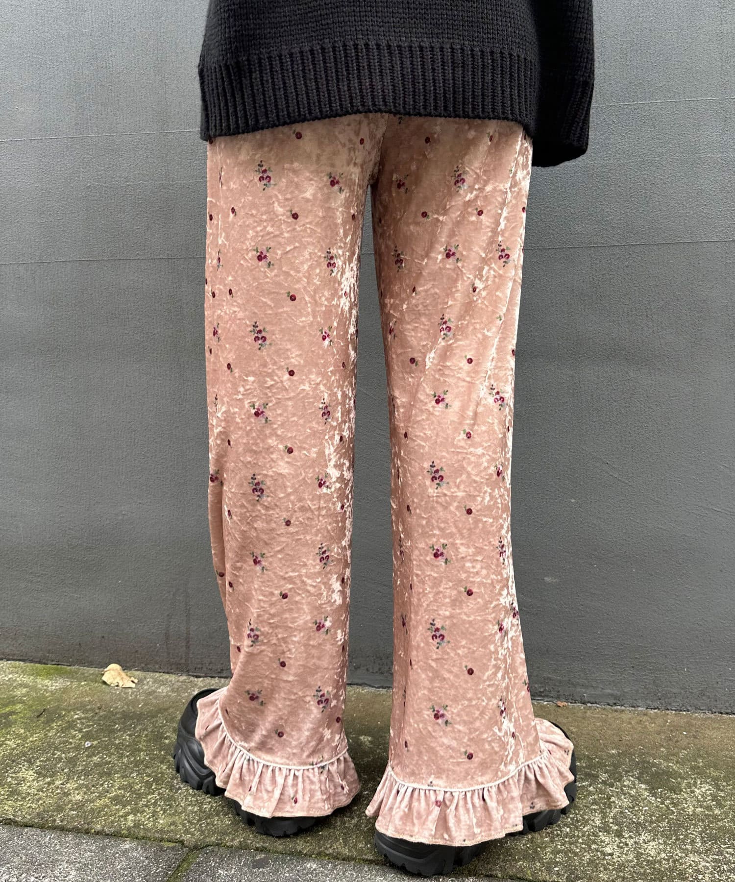 全体に広がる花柄がかわいい、ベロア素材のパンツ。