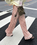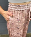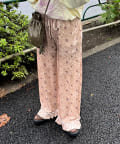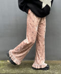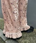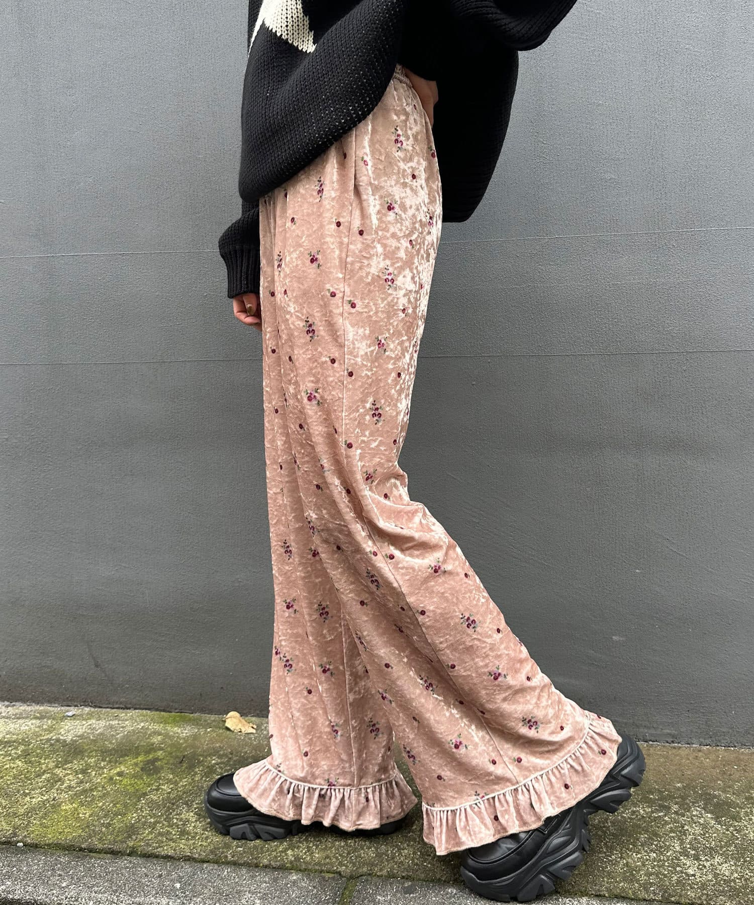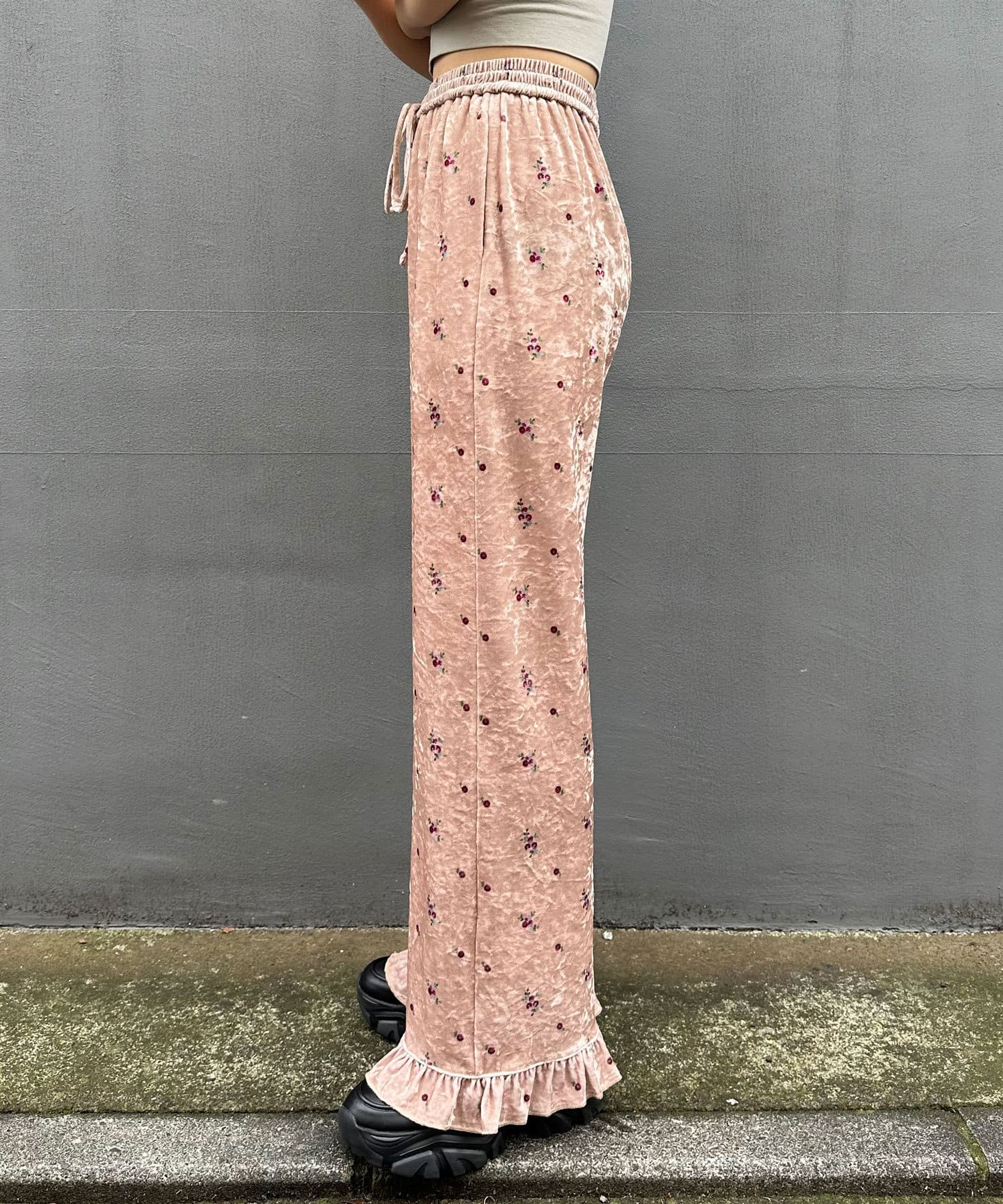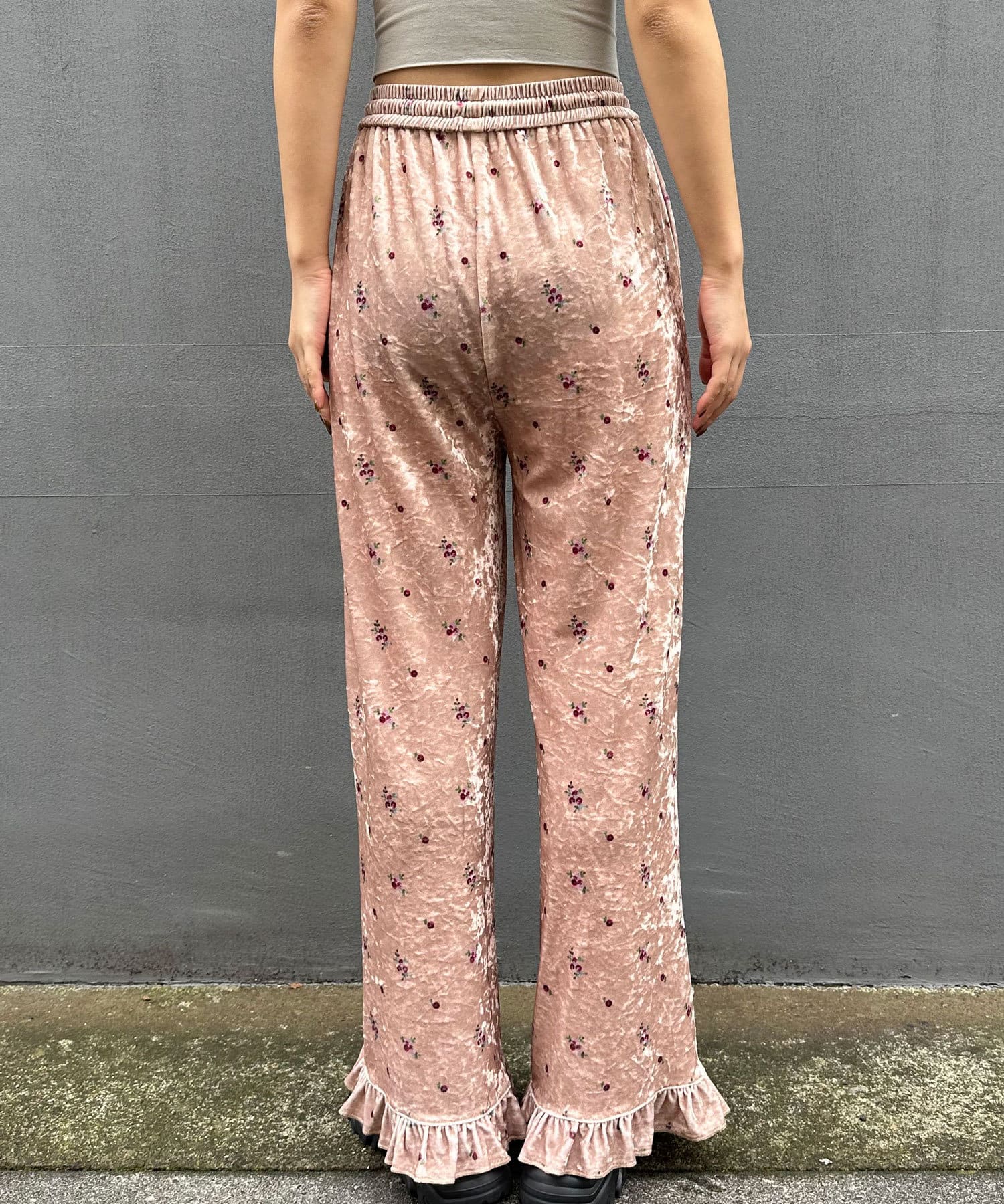 全体に広がる花柄がかわいい、ベロア素材のパンツ。