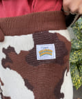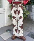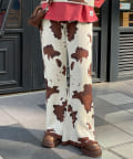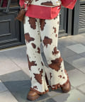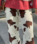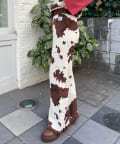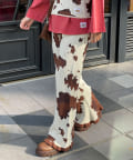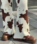大胆な牛柄デザインが目を引く、ニット素材のフレアパンツ。