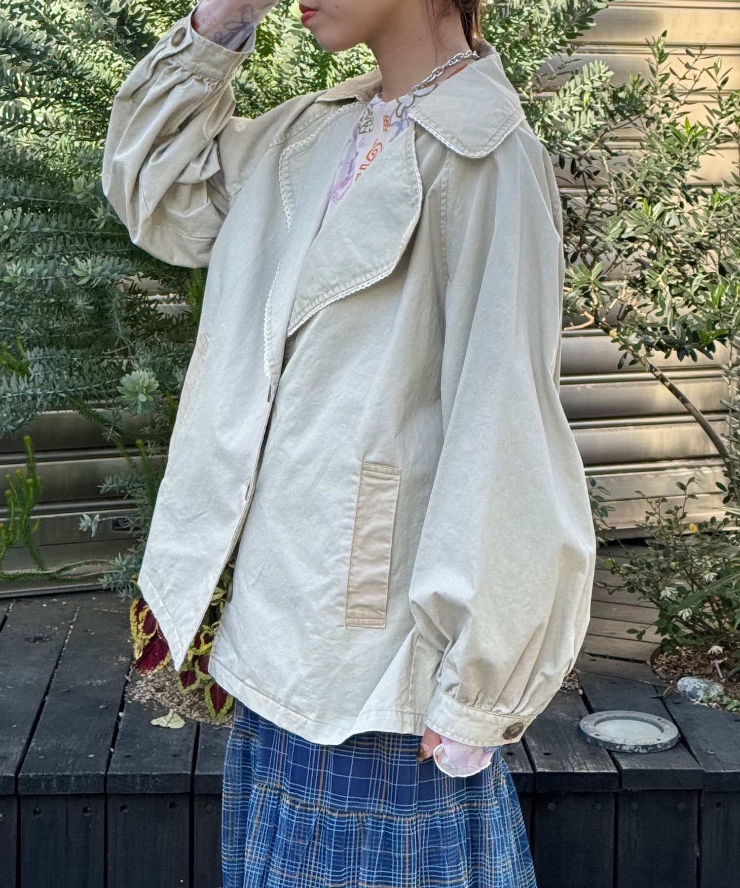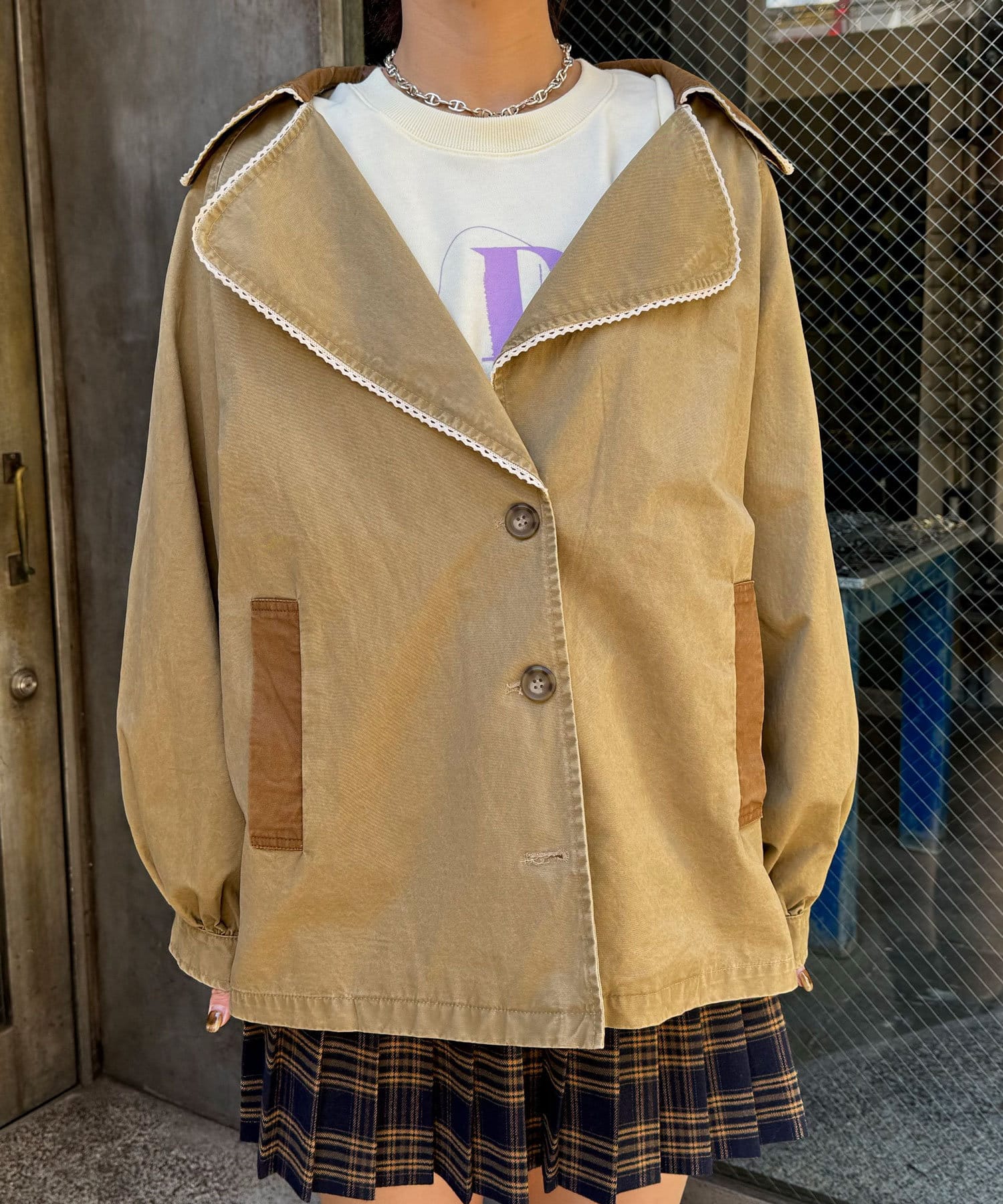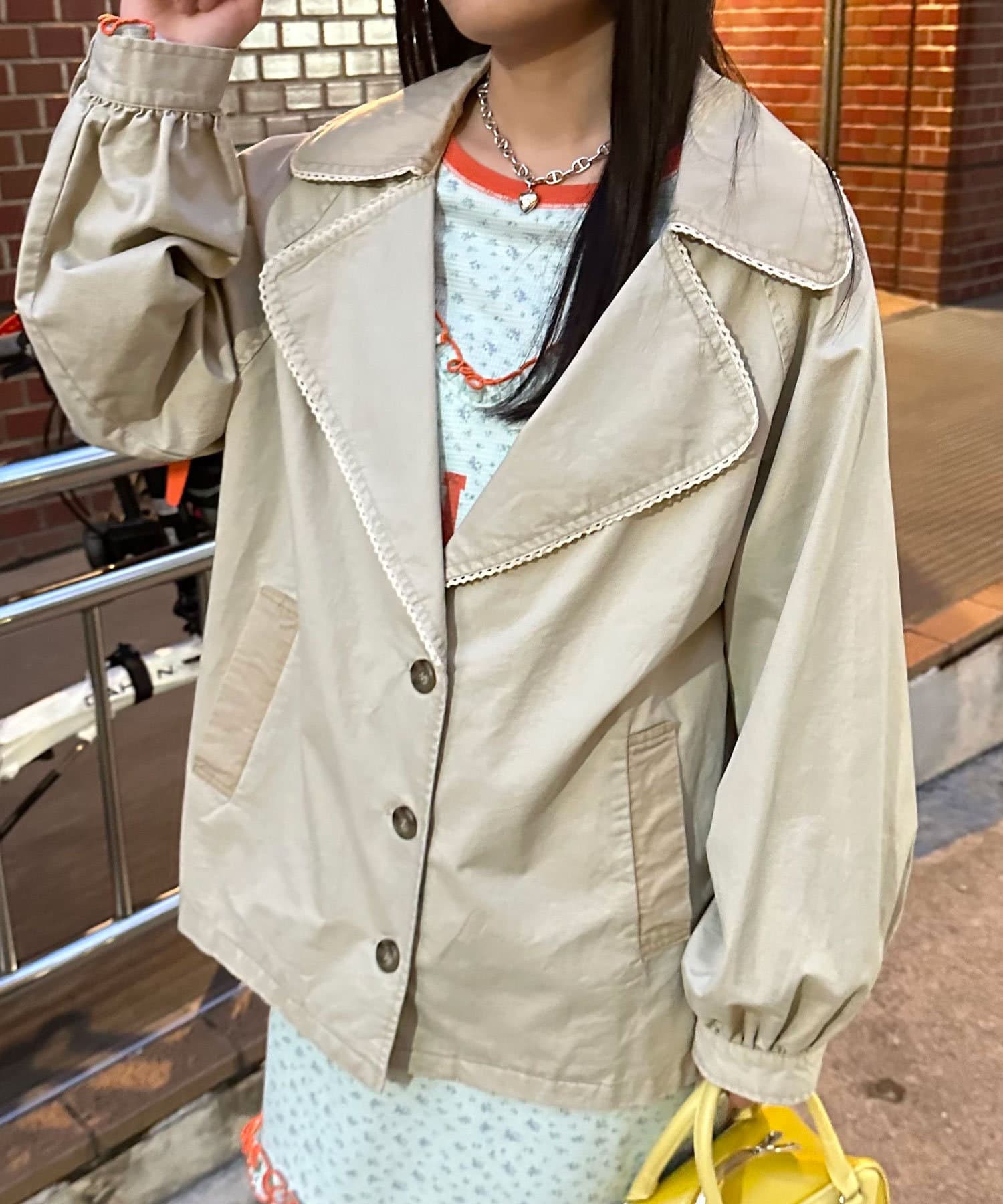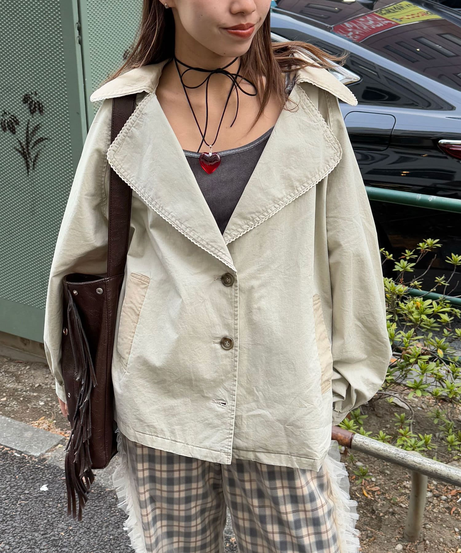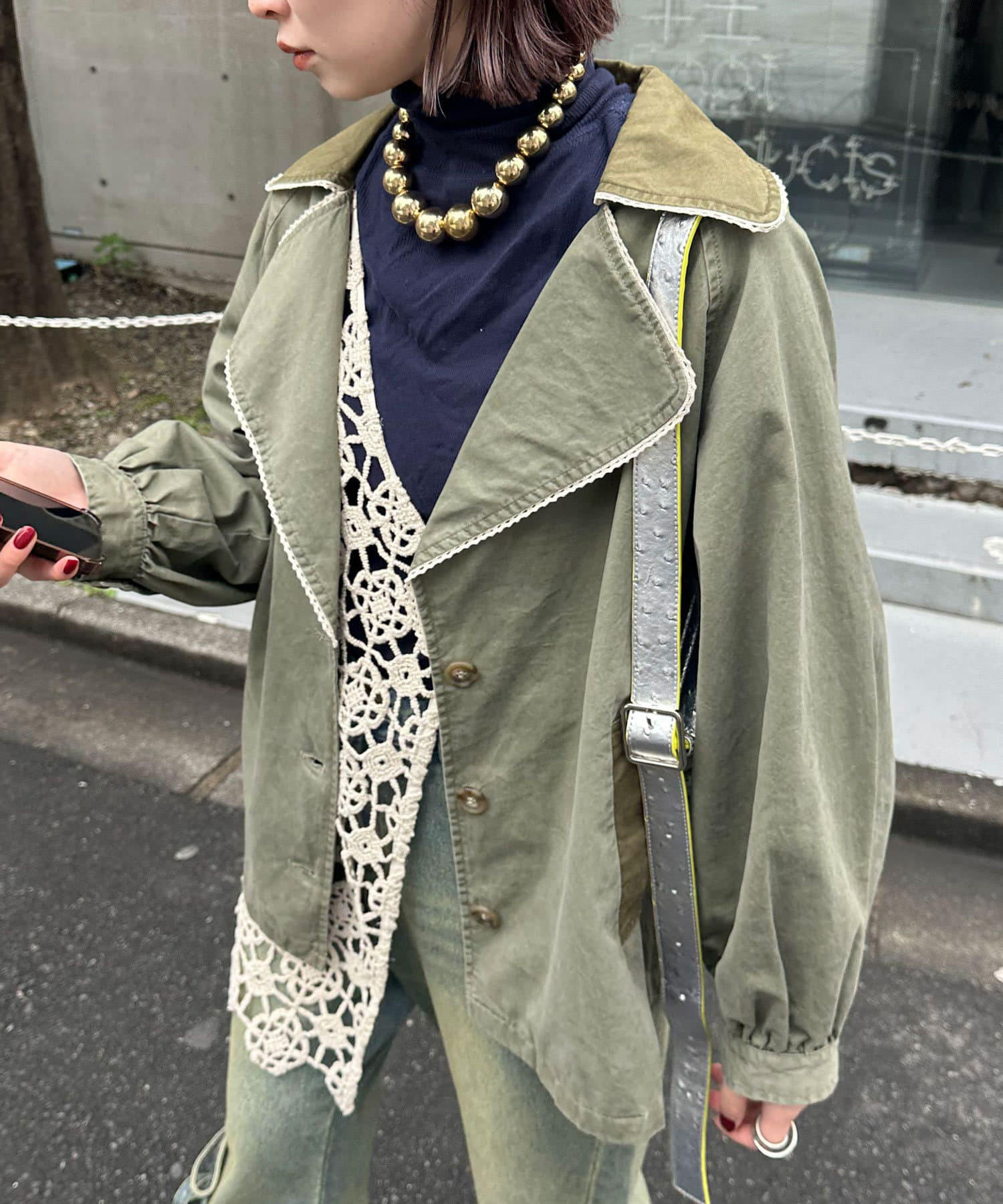 ビッグカラーと配色レースが効いた、古着ライクなトレンチジャケット。