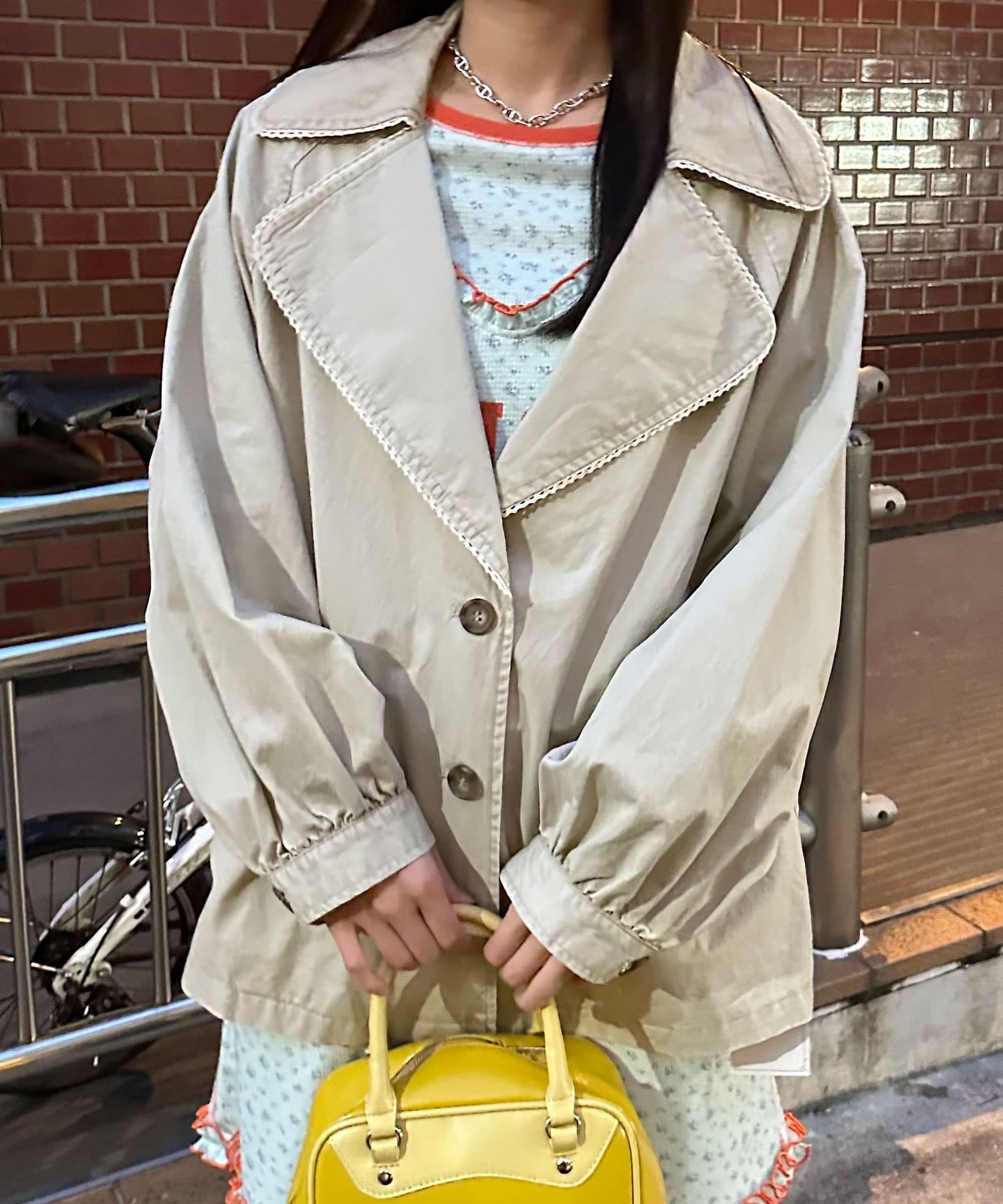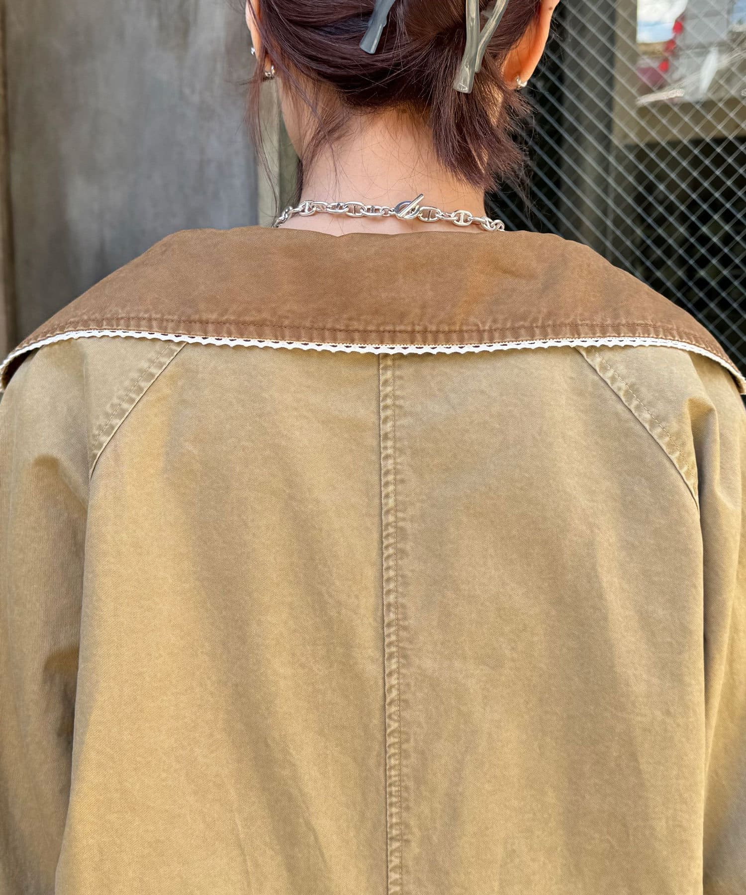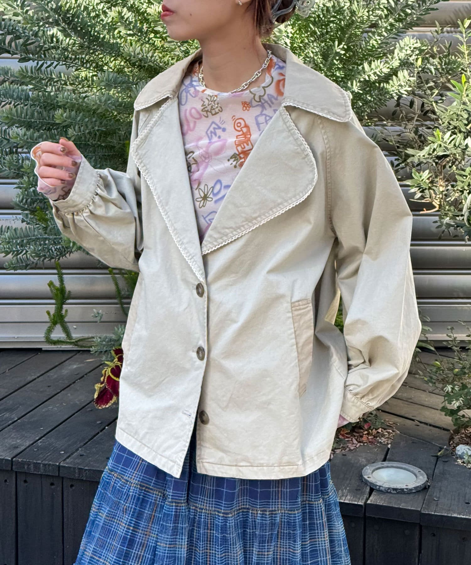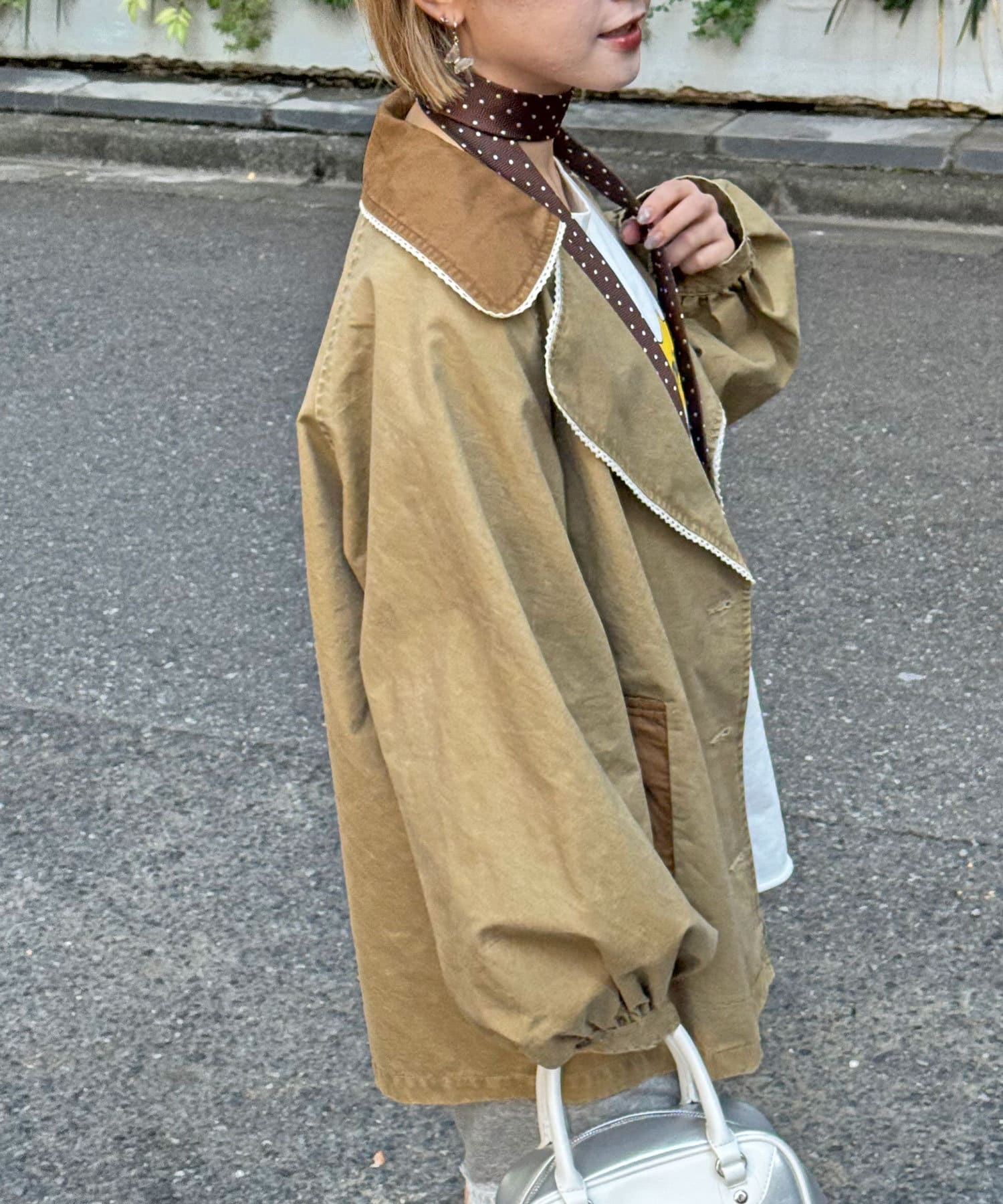 ビッグカラーと配色レースが効いた、古着ライクなトレンチジャケット。