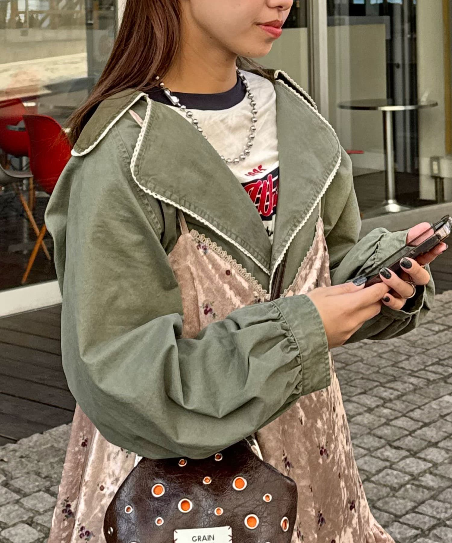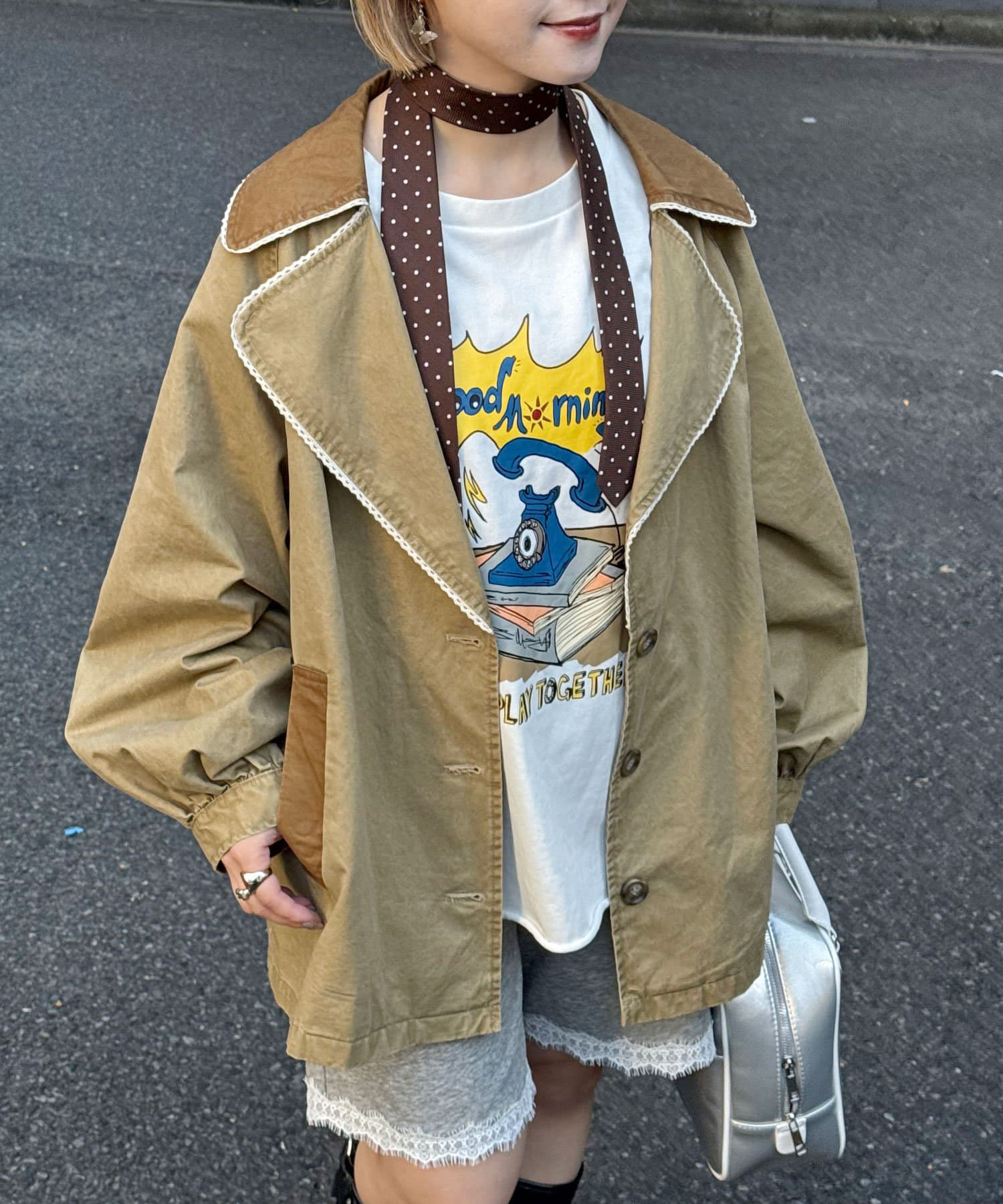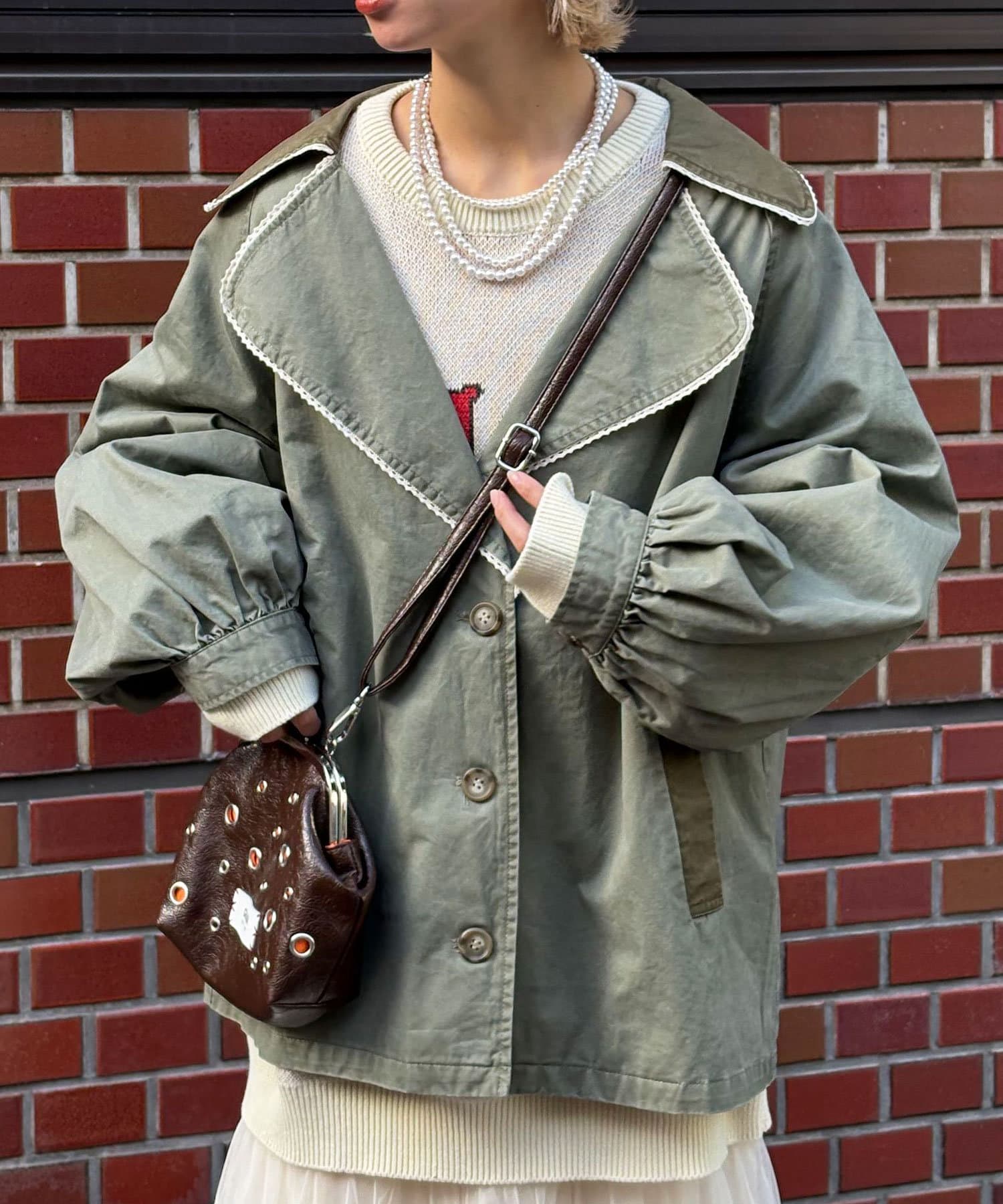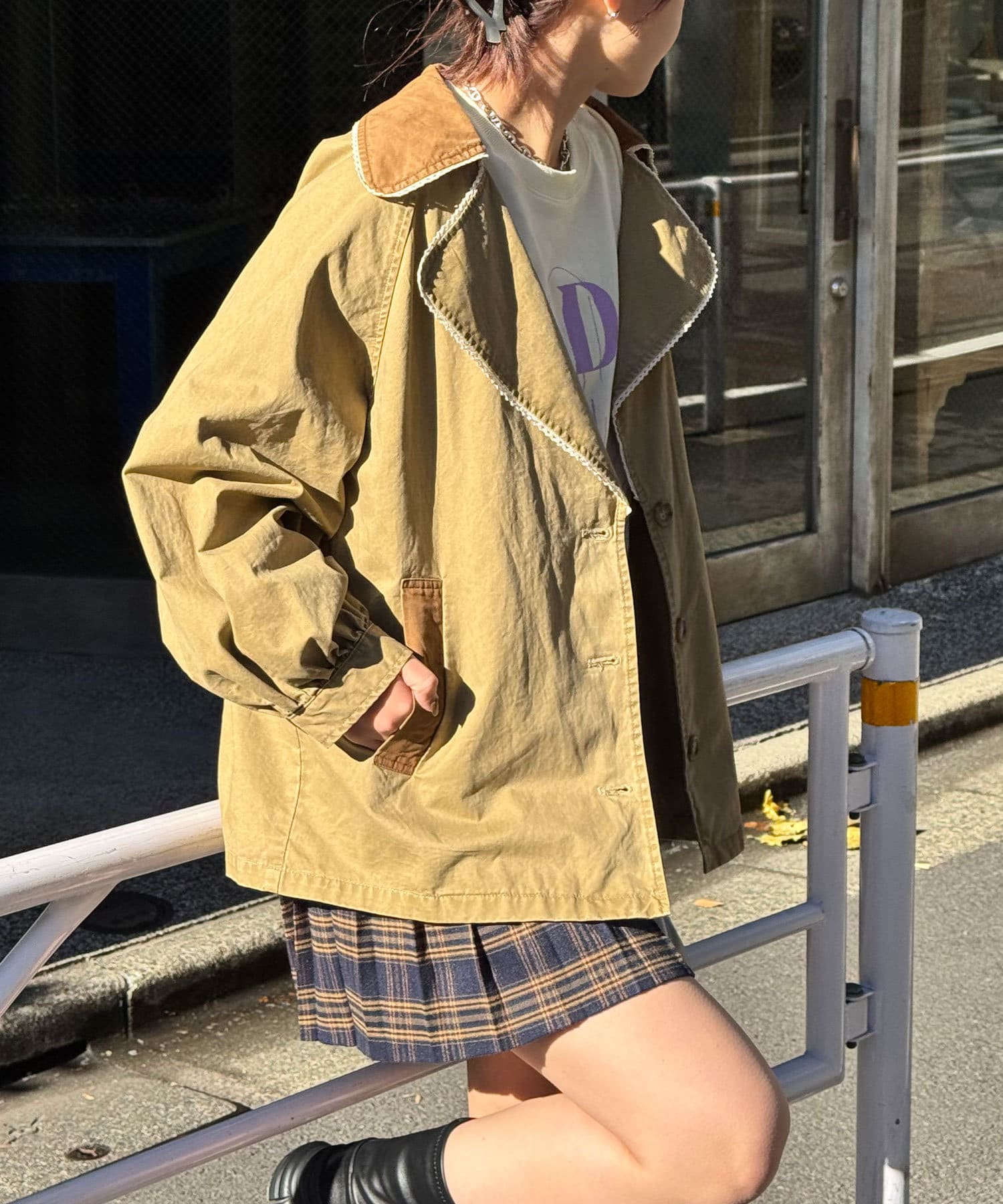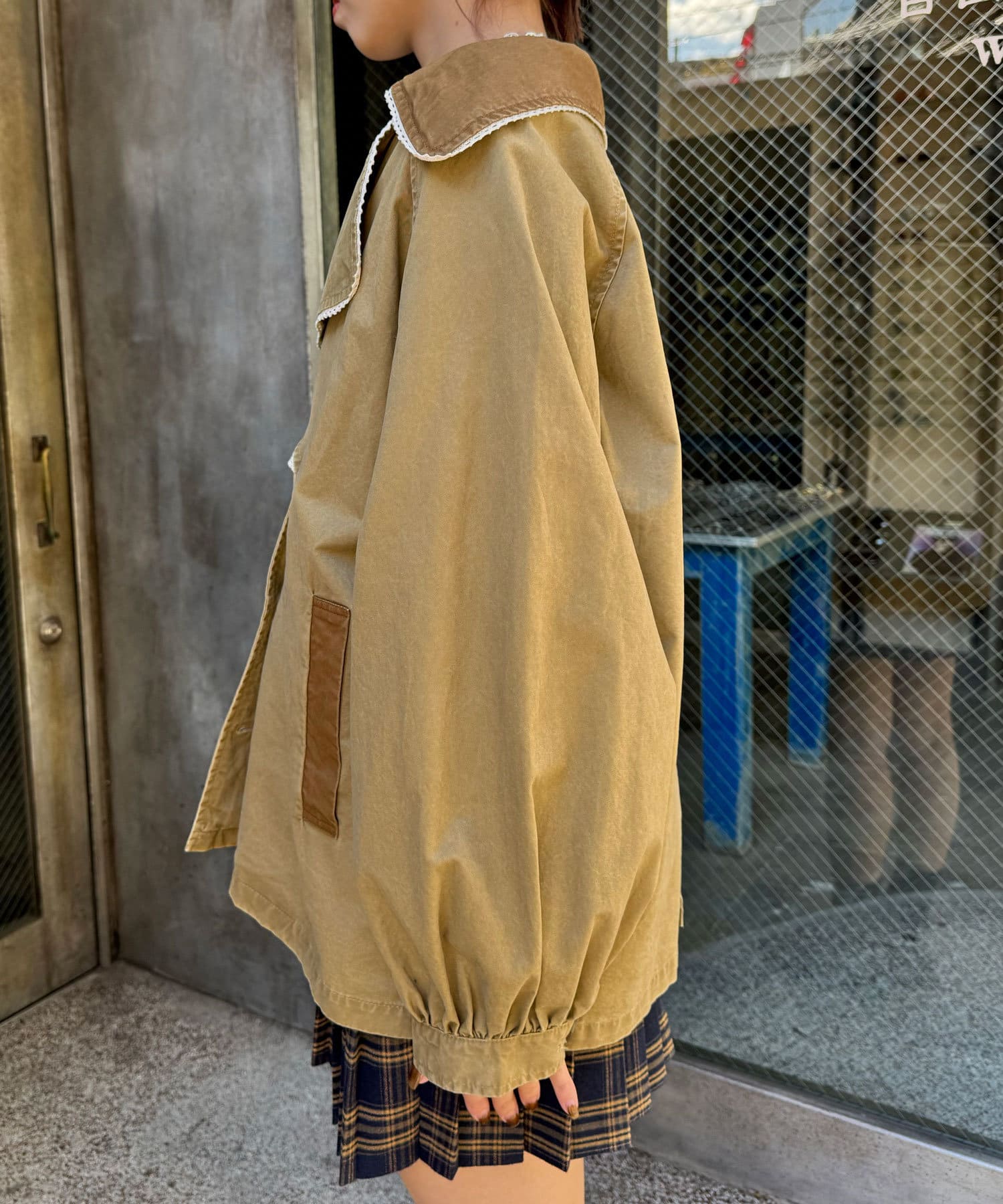 ビッグカラーと配色レースが効いた、古着ライクなトレンチジャケット。