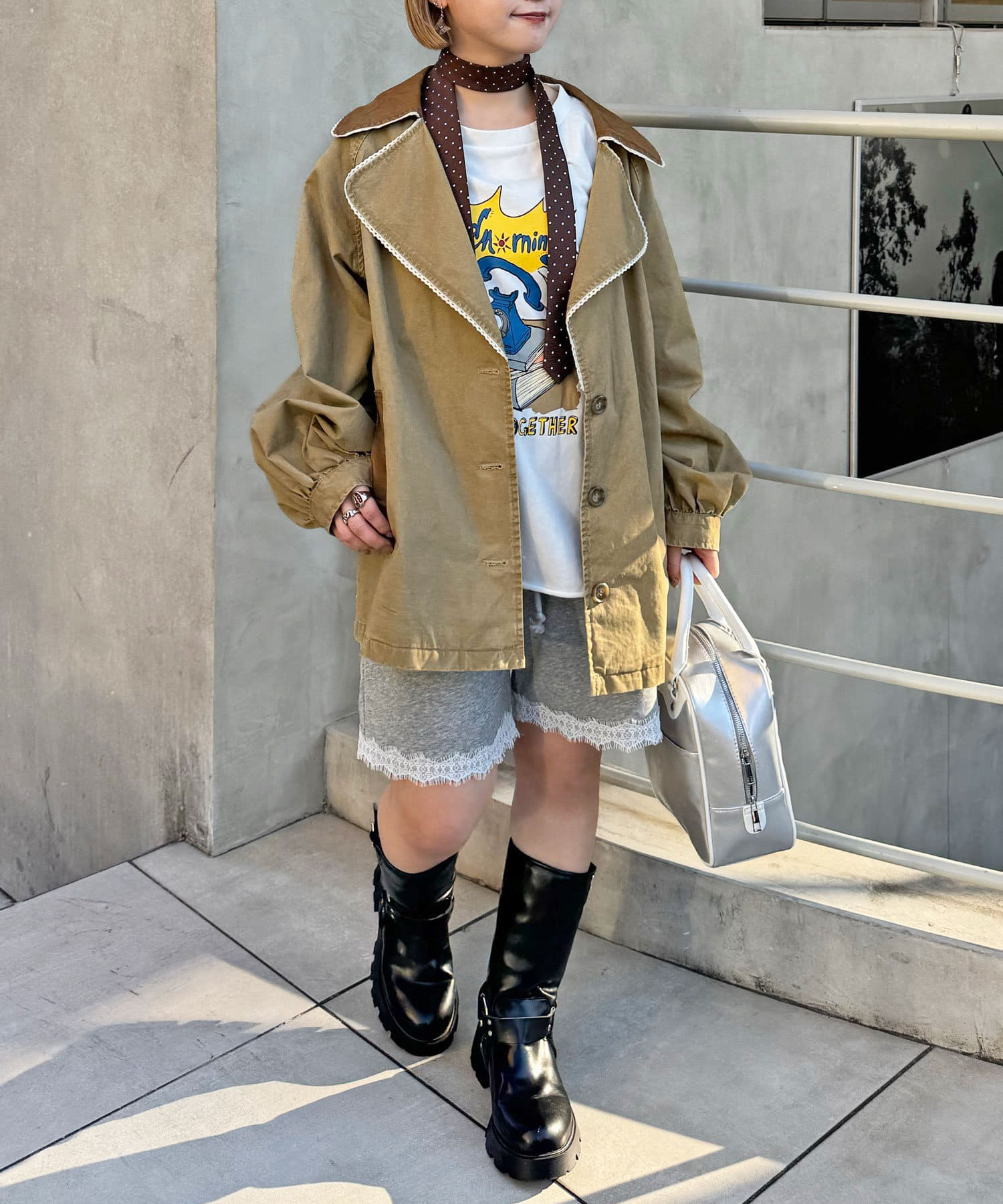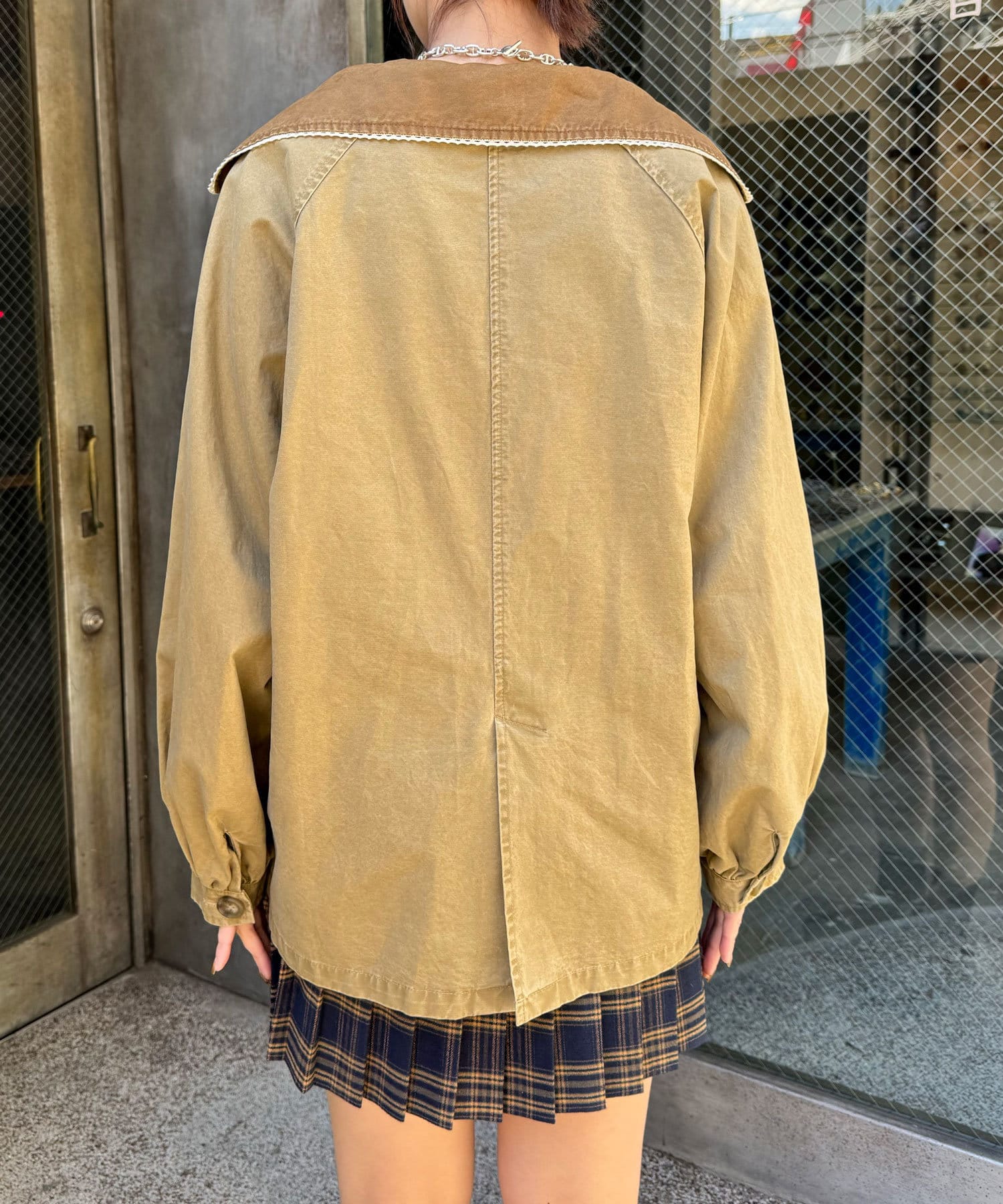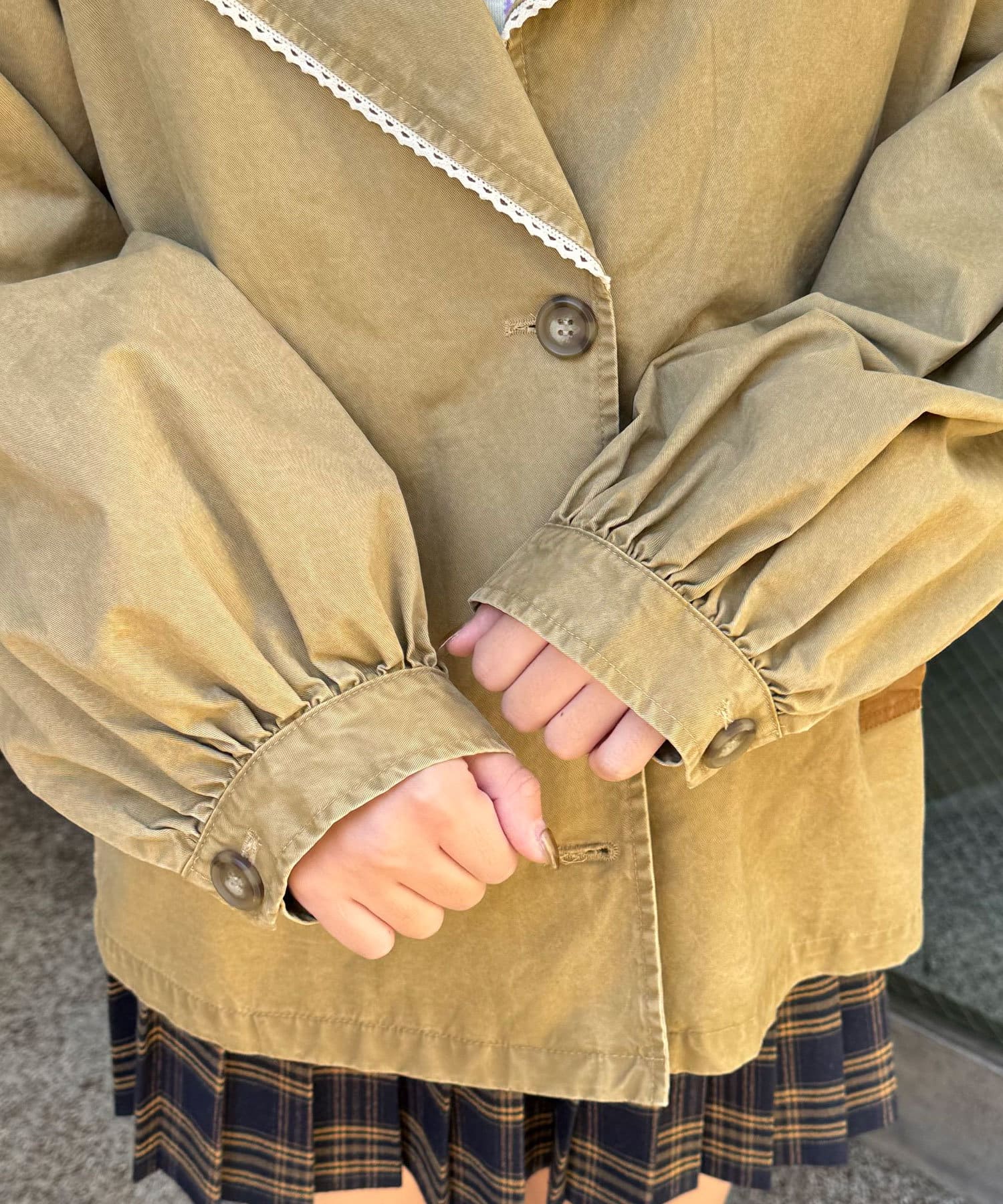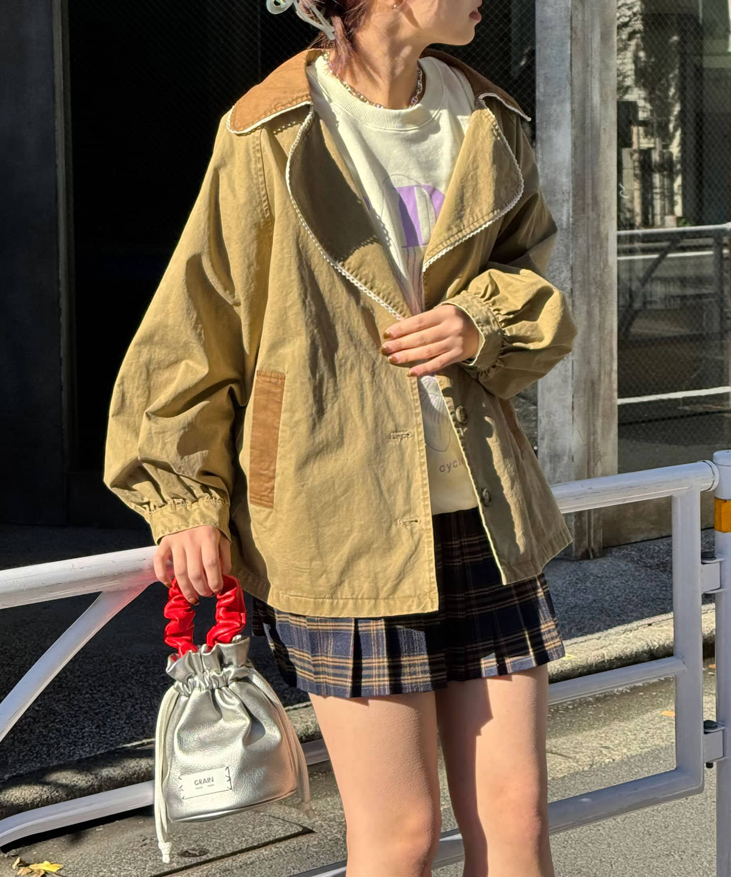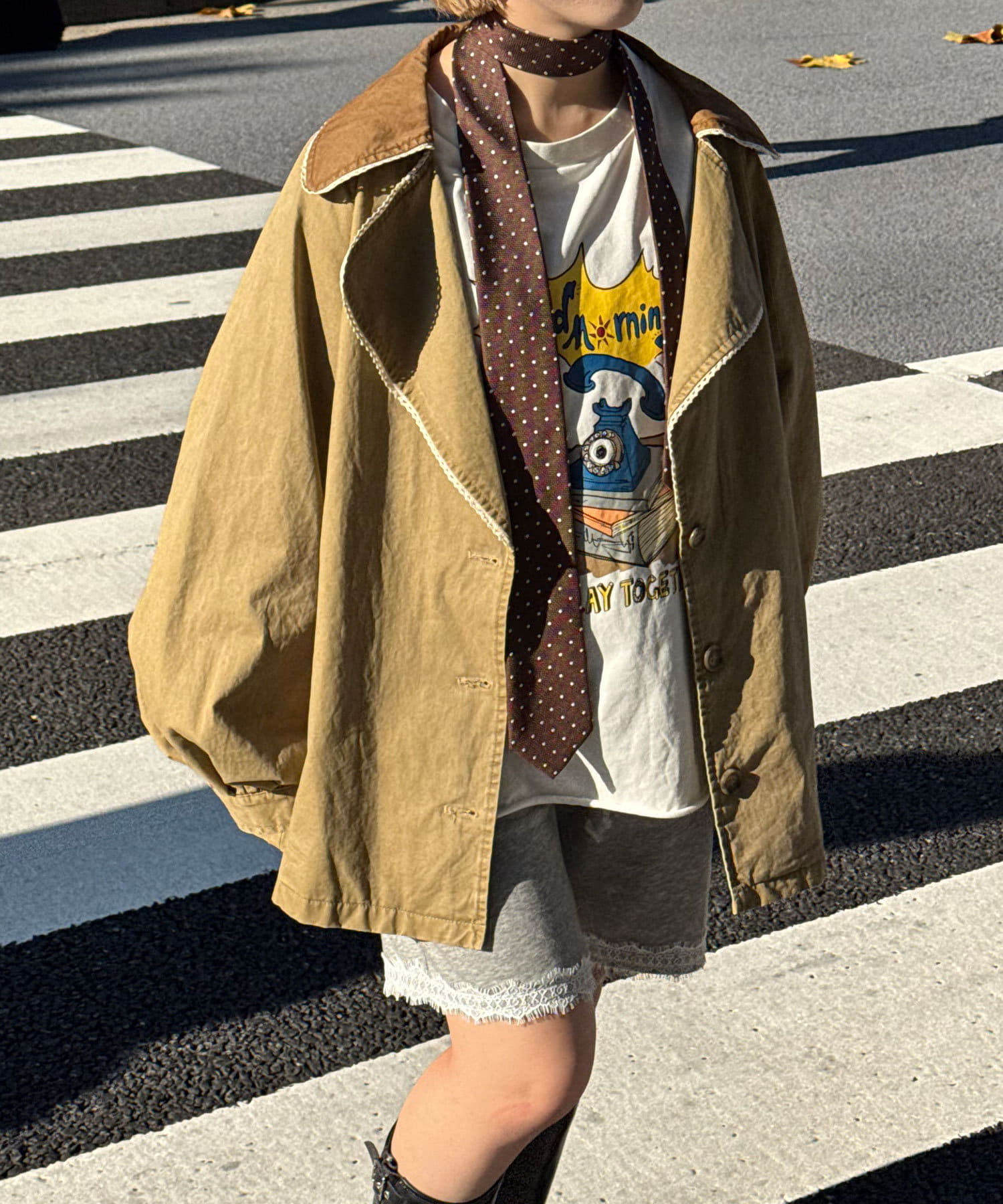 ビッグカラーと配色レースが効いた、古着ライクなトレンチジャケット。