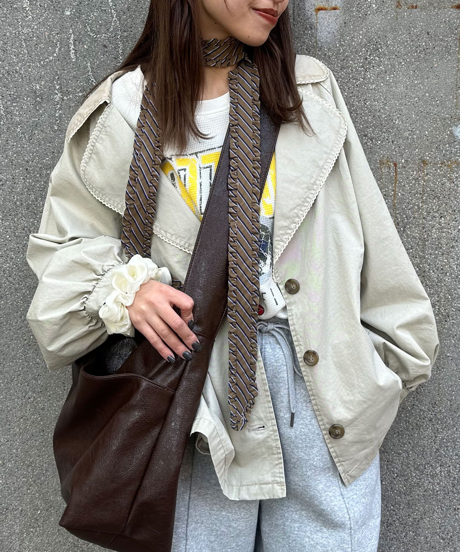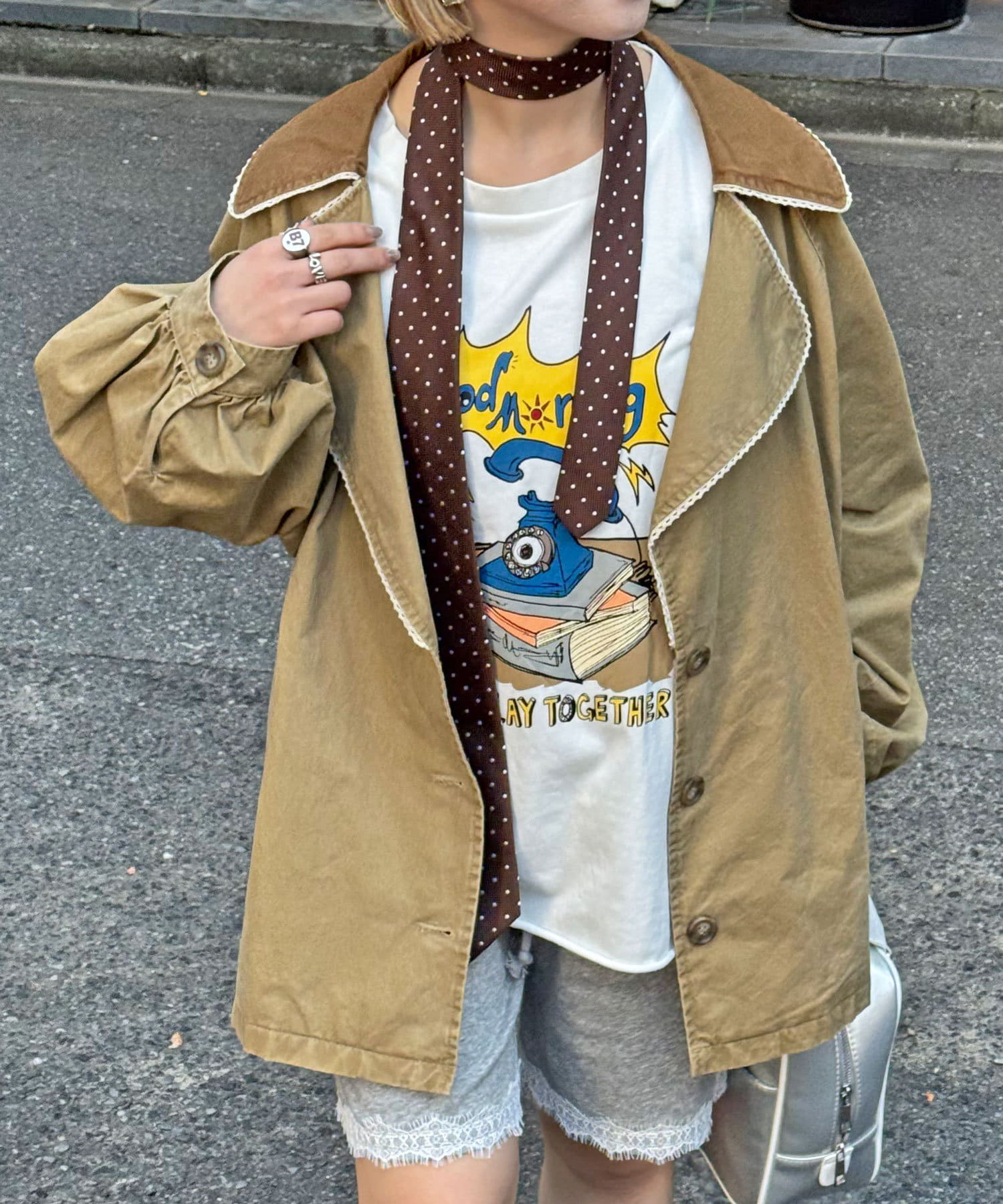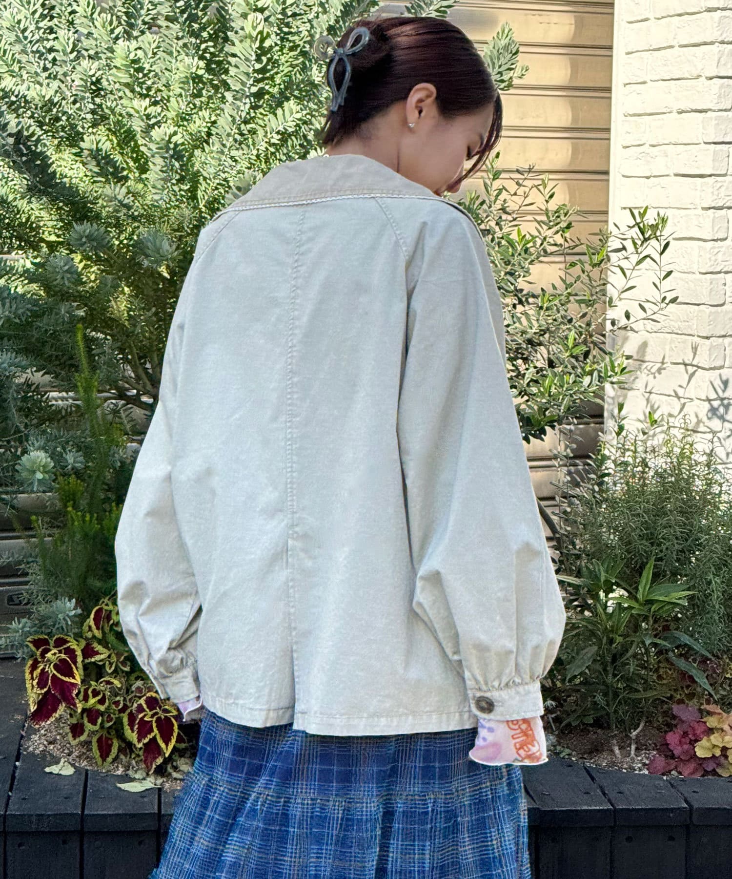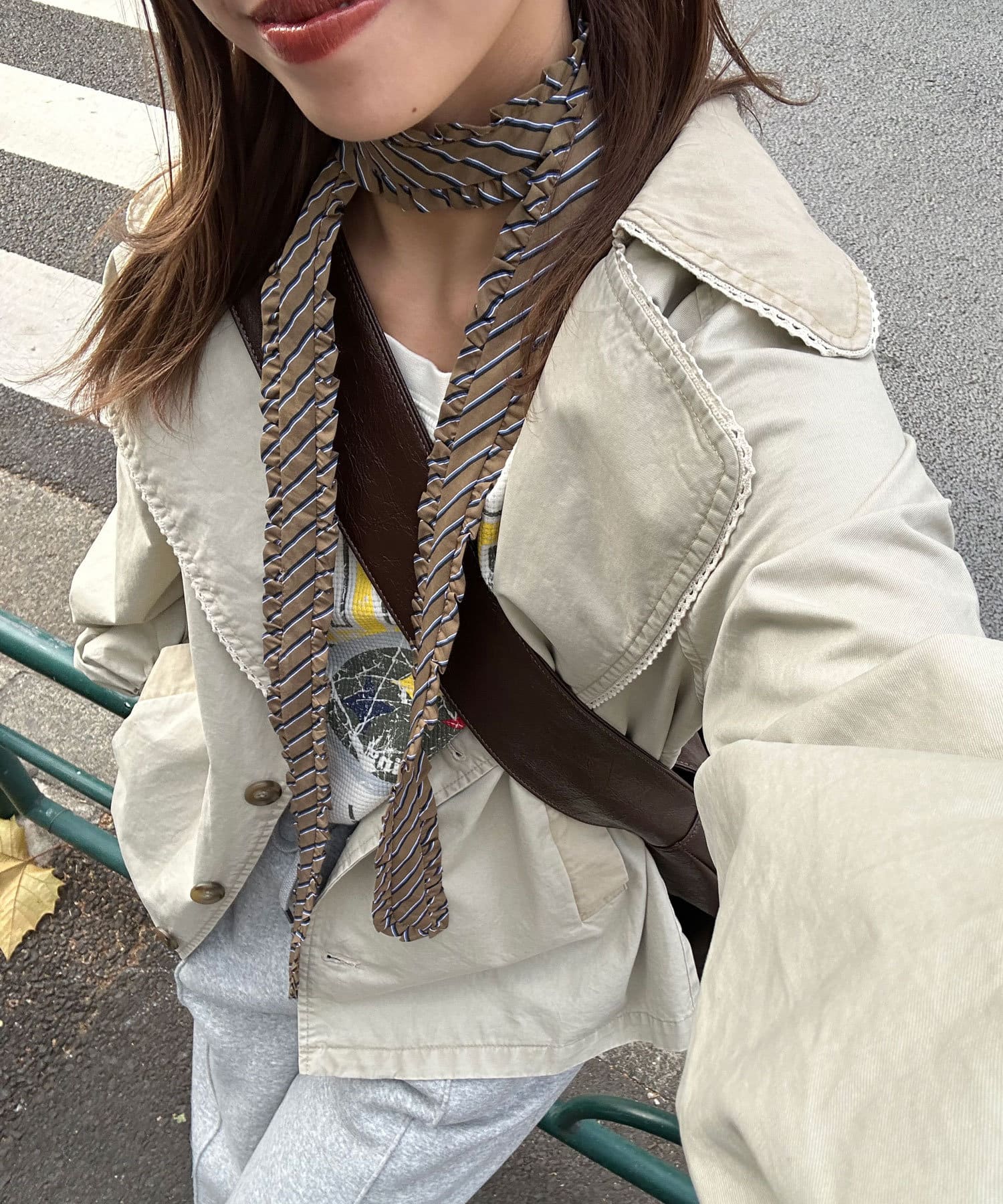 ビッグカラーと配色レースが効いた、古着ライクなトレンチジャケット。