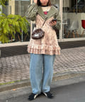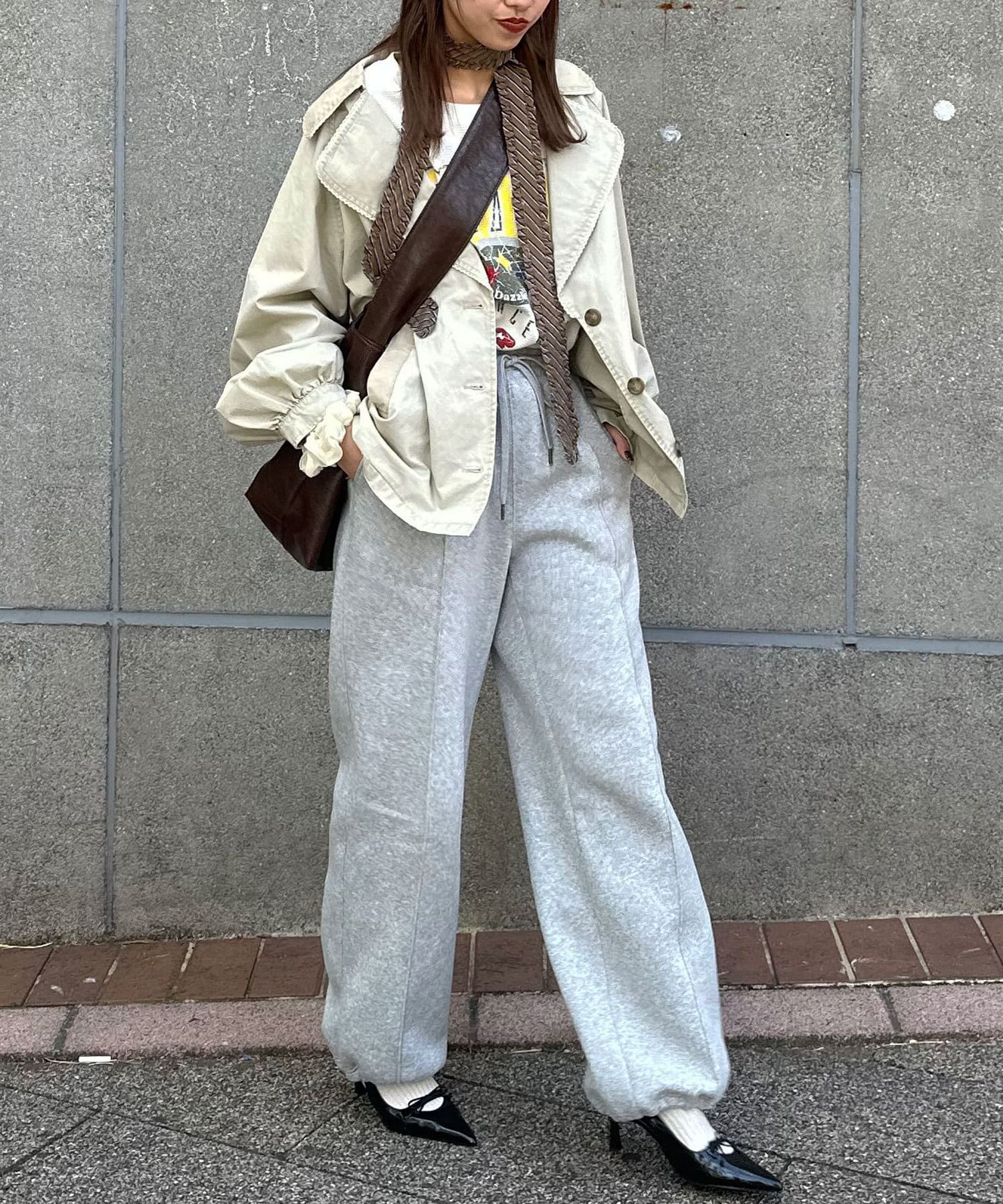 ボリュームスリーブが程よく甘さを加え、腰までの丈感が軽やかな印象を与えます。