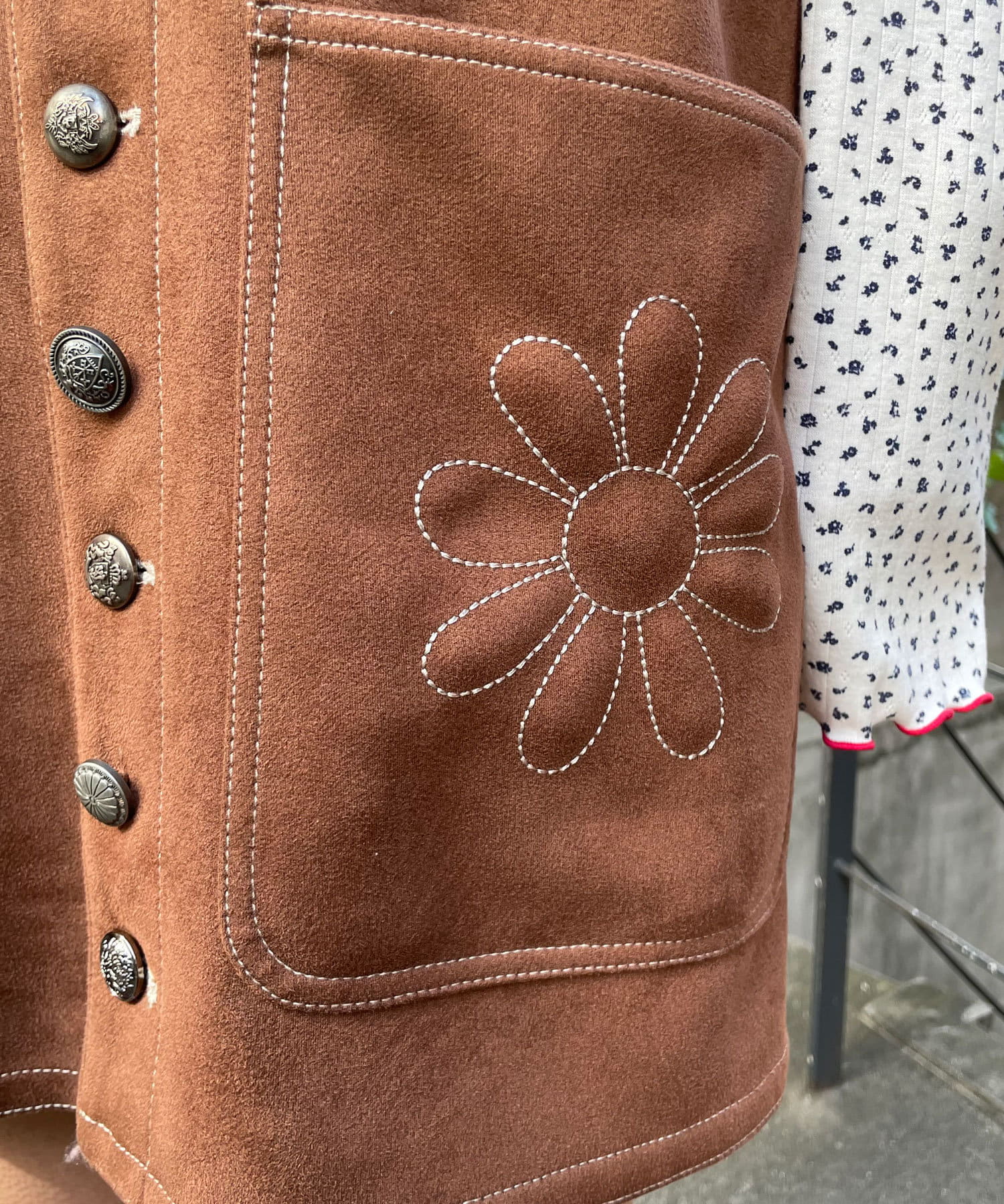 フロントポケットに施されたフラワー刺繍がシンプルなデザインのアクセントに。