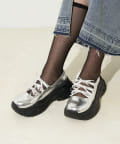 フェミニンな印象のバレエシューズとスポーティーなスニーカーソールが合わさった存在感たっぷりの一足。