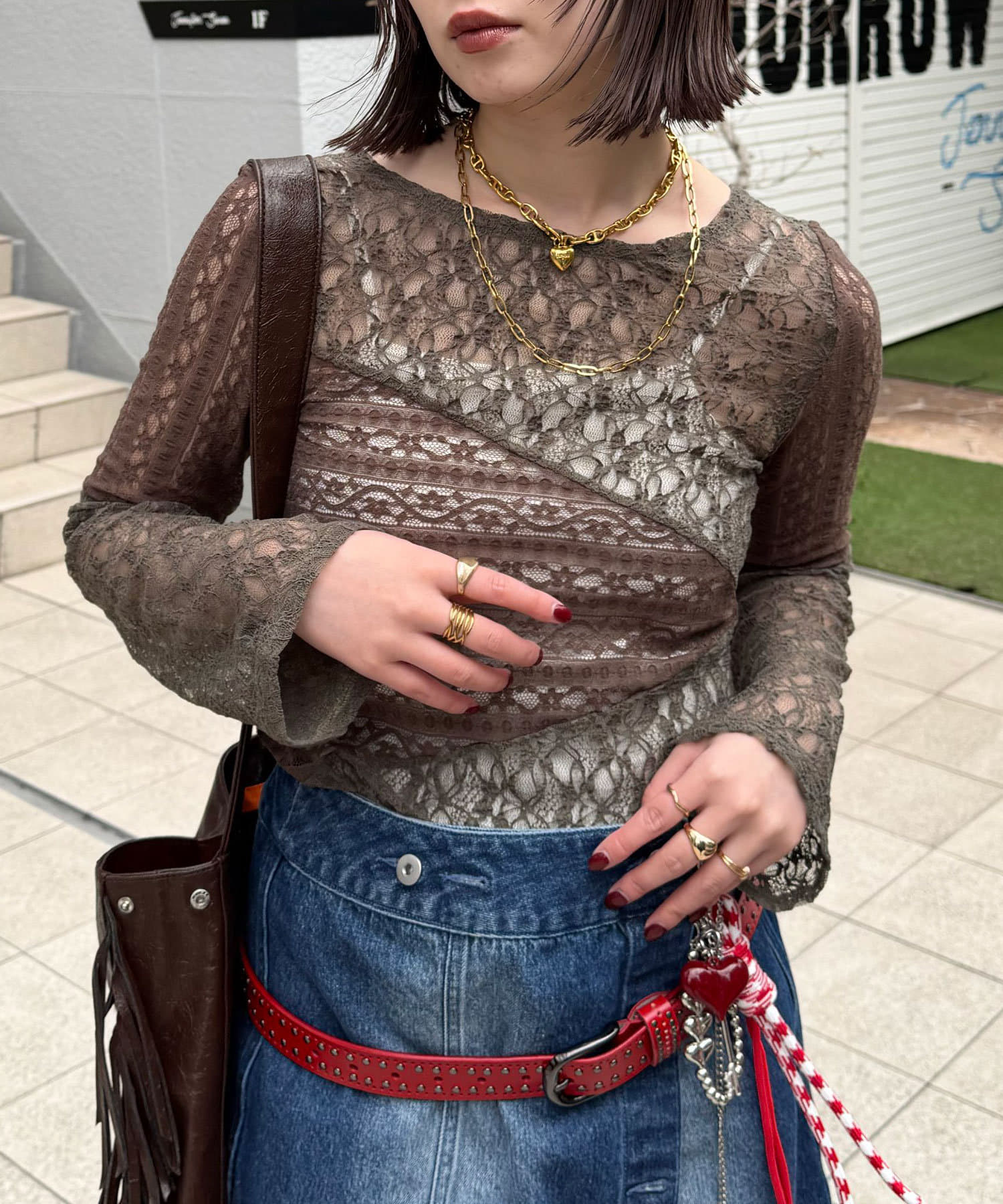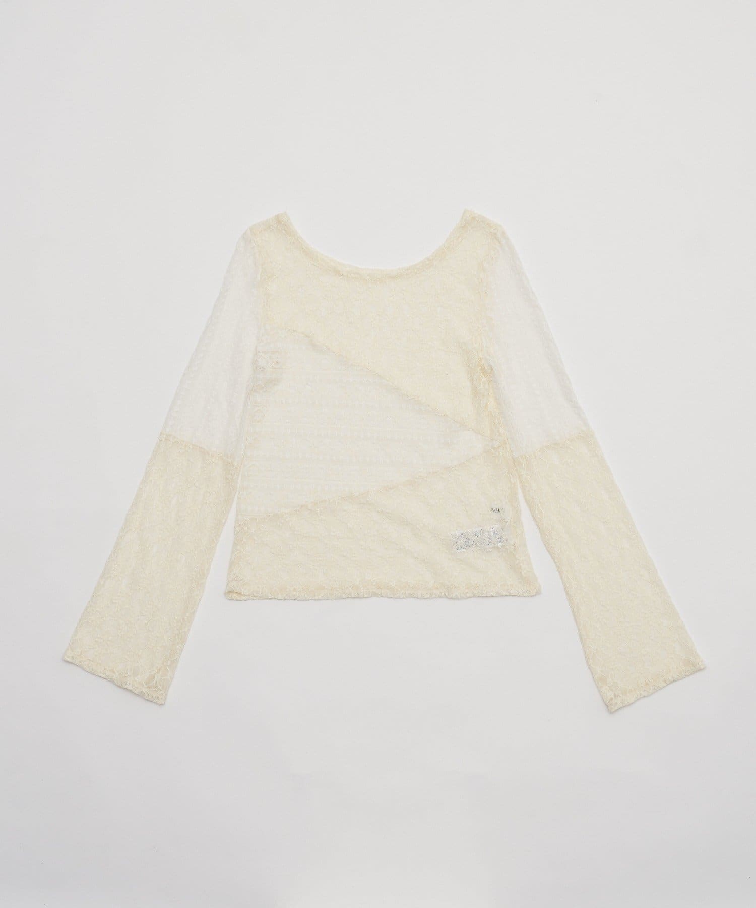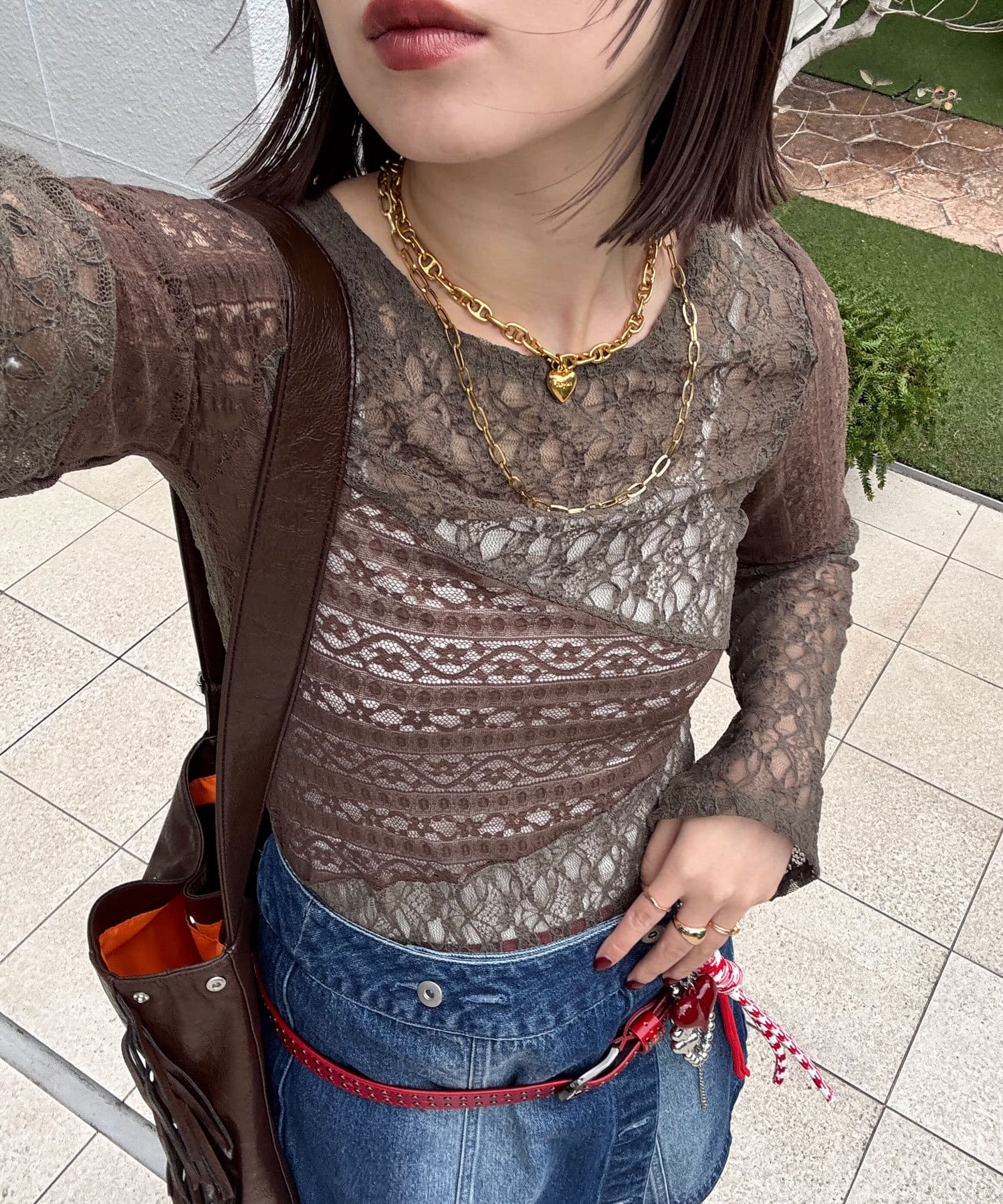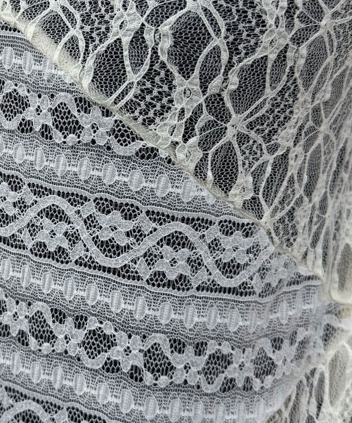 異なるレースを切り替えたデザインがアクセントになり、シンプルながらも存在感のある一枚です。