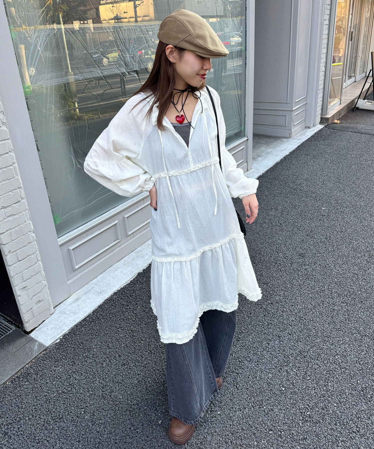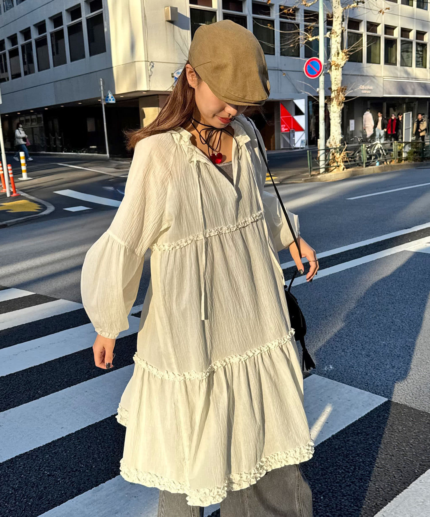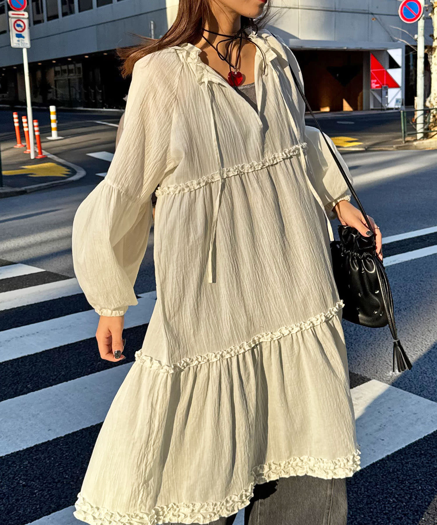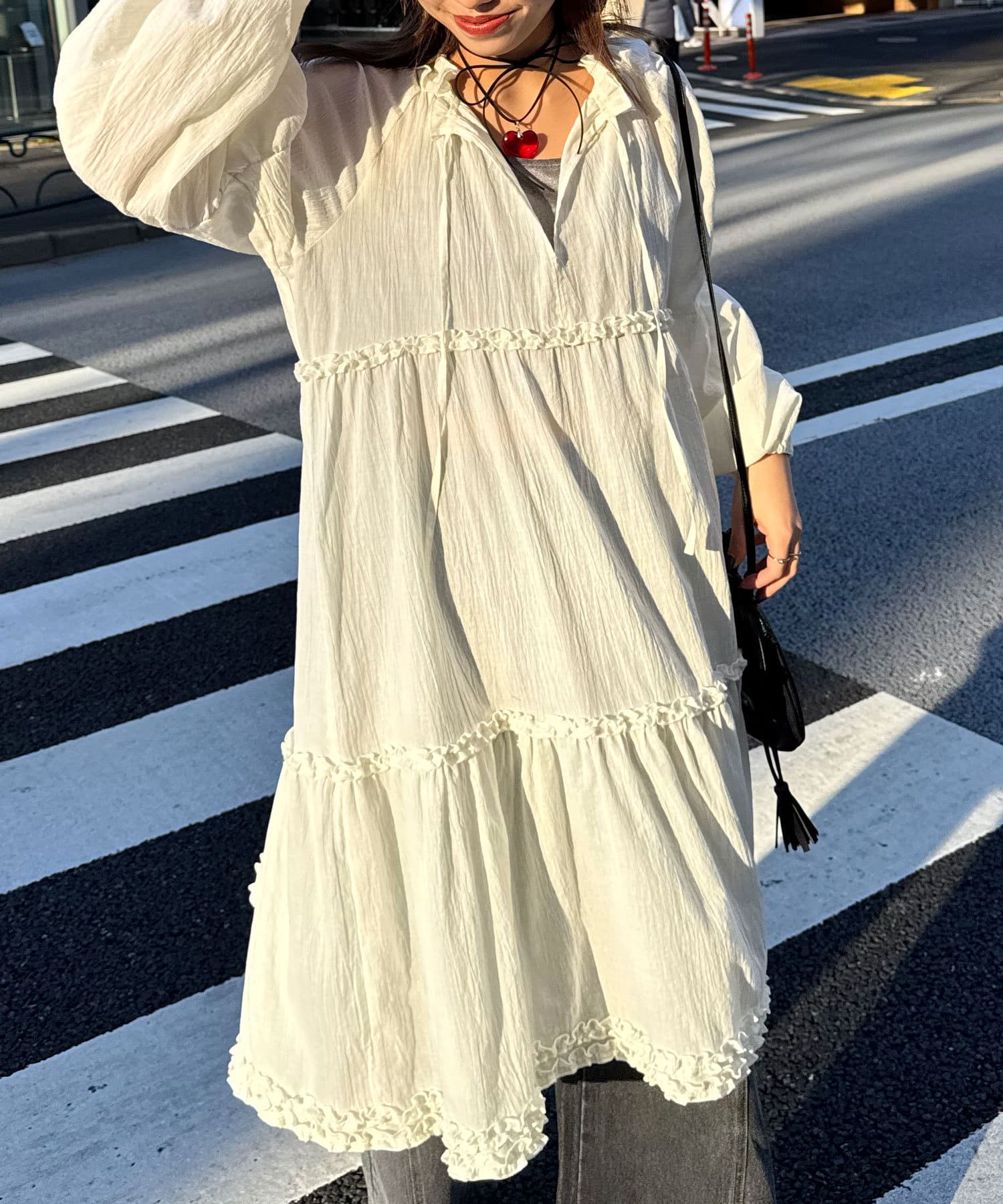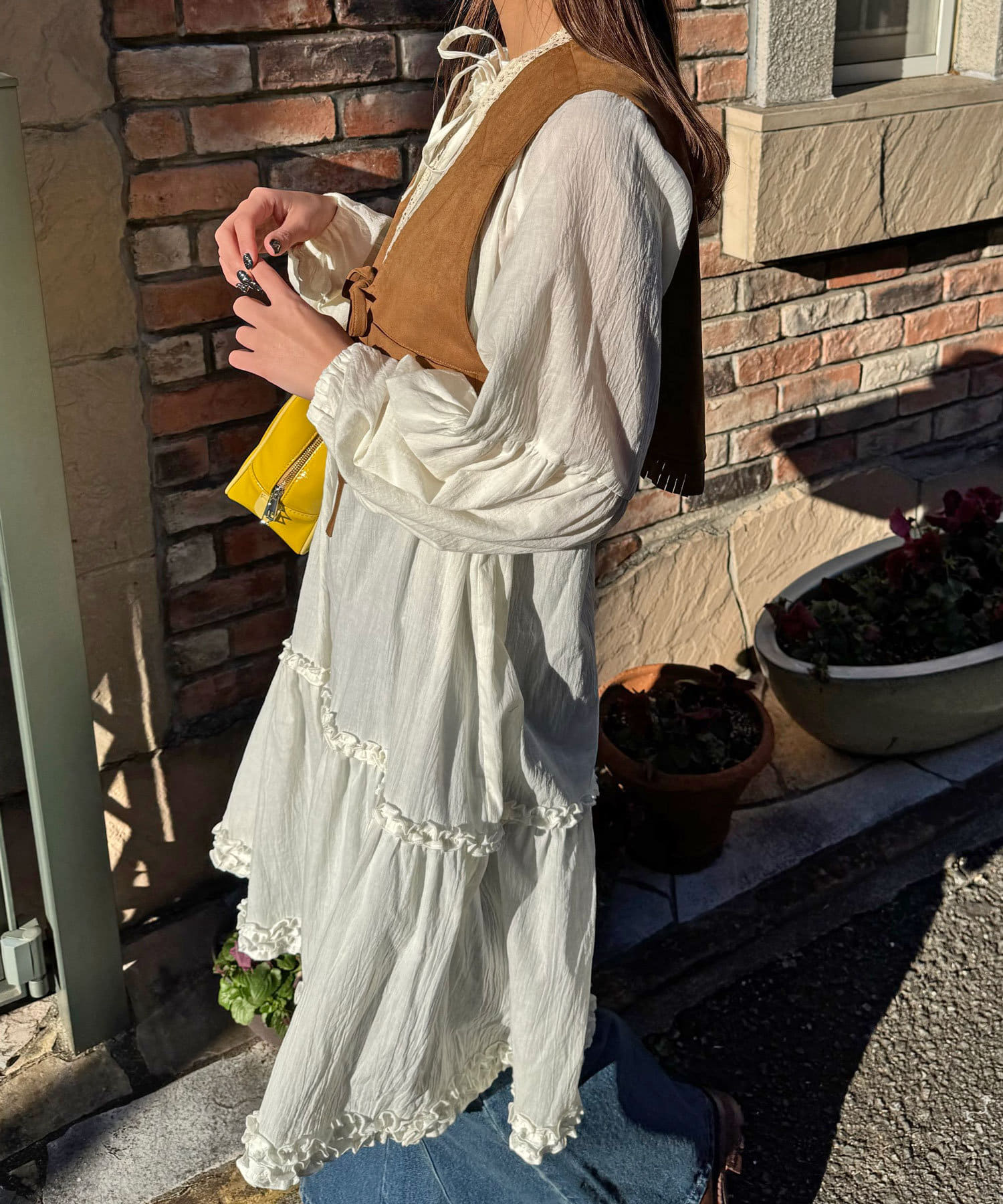 フリルが施されたネックラインや切り替え部分が、よりフェミニンな雰囲気を演出します。