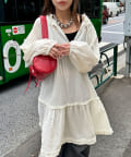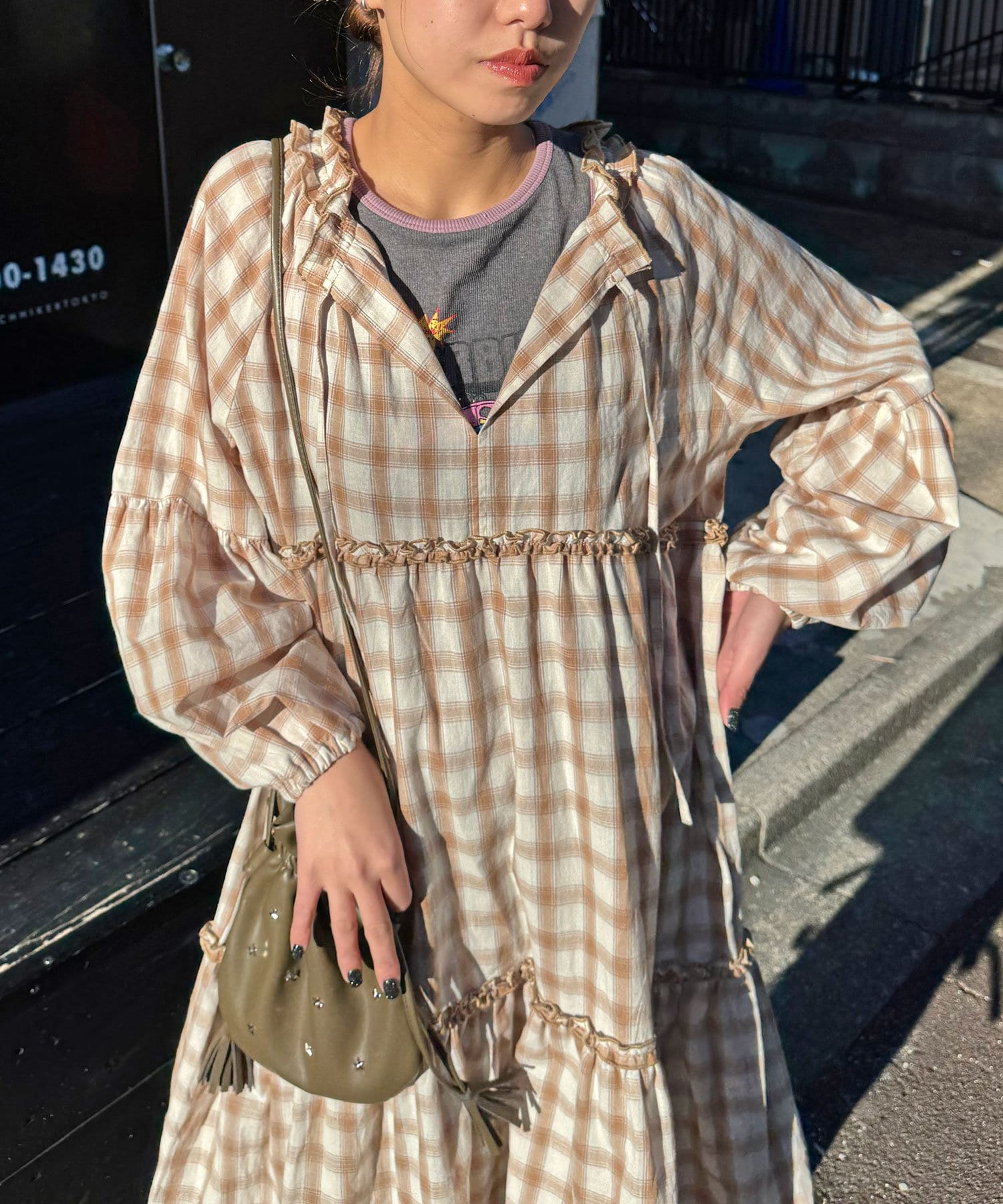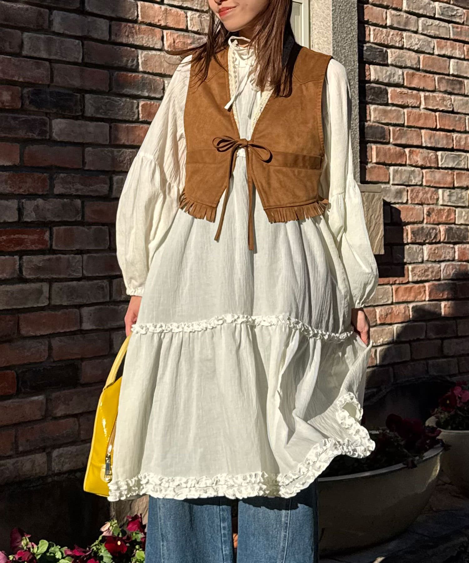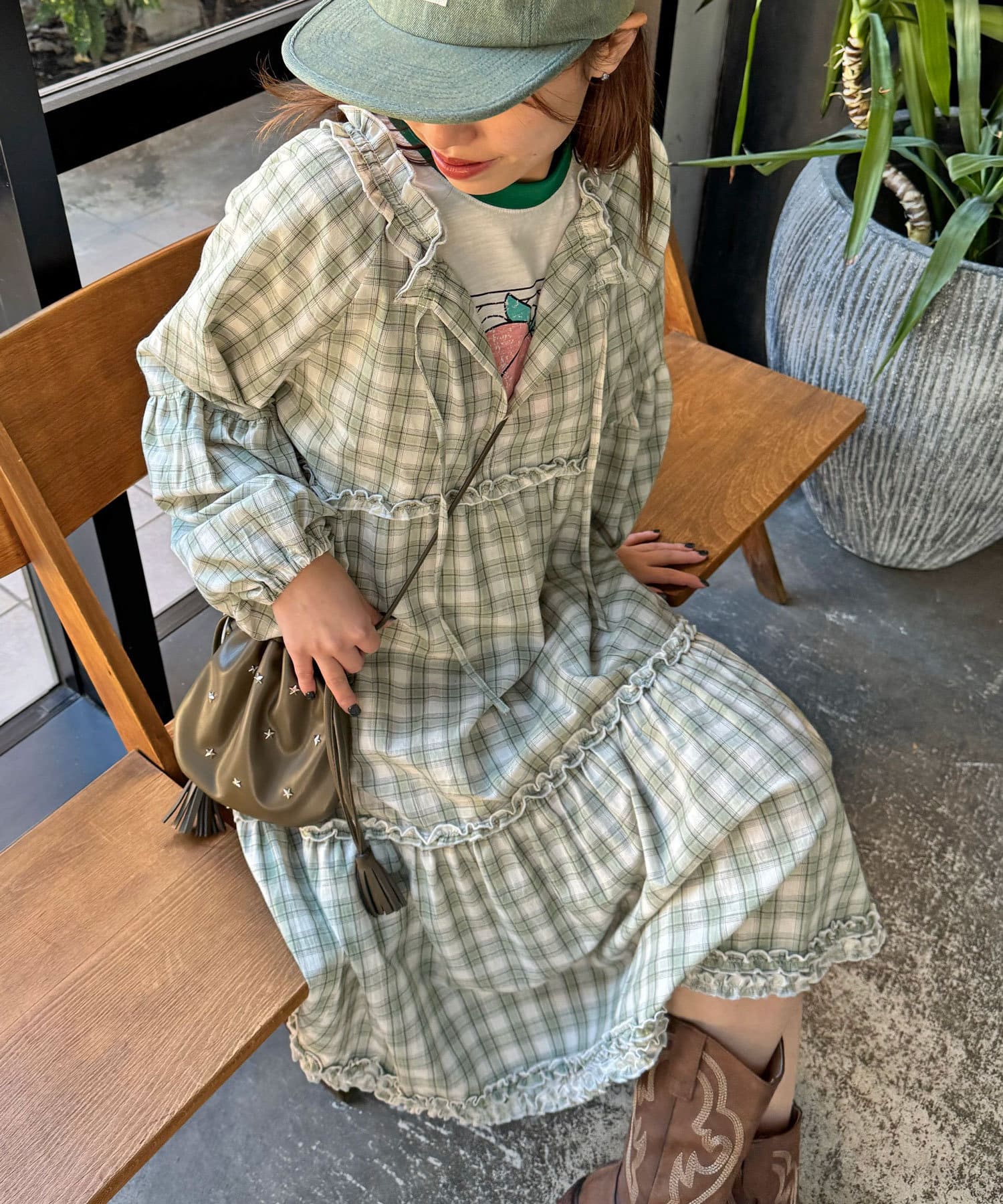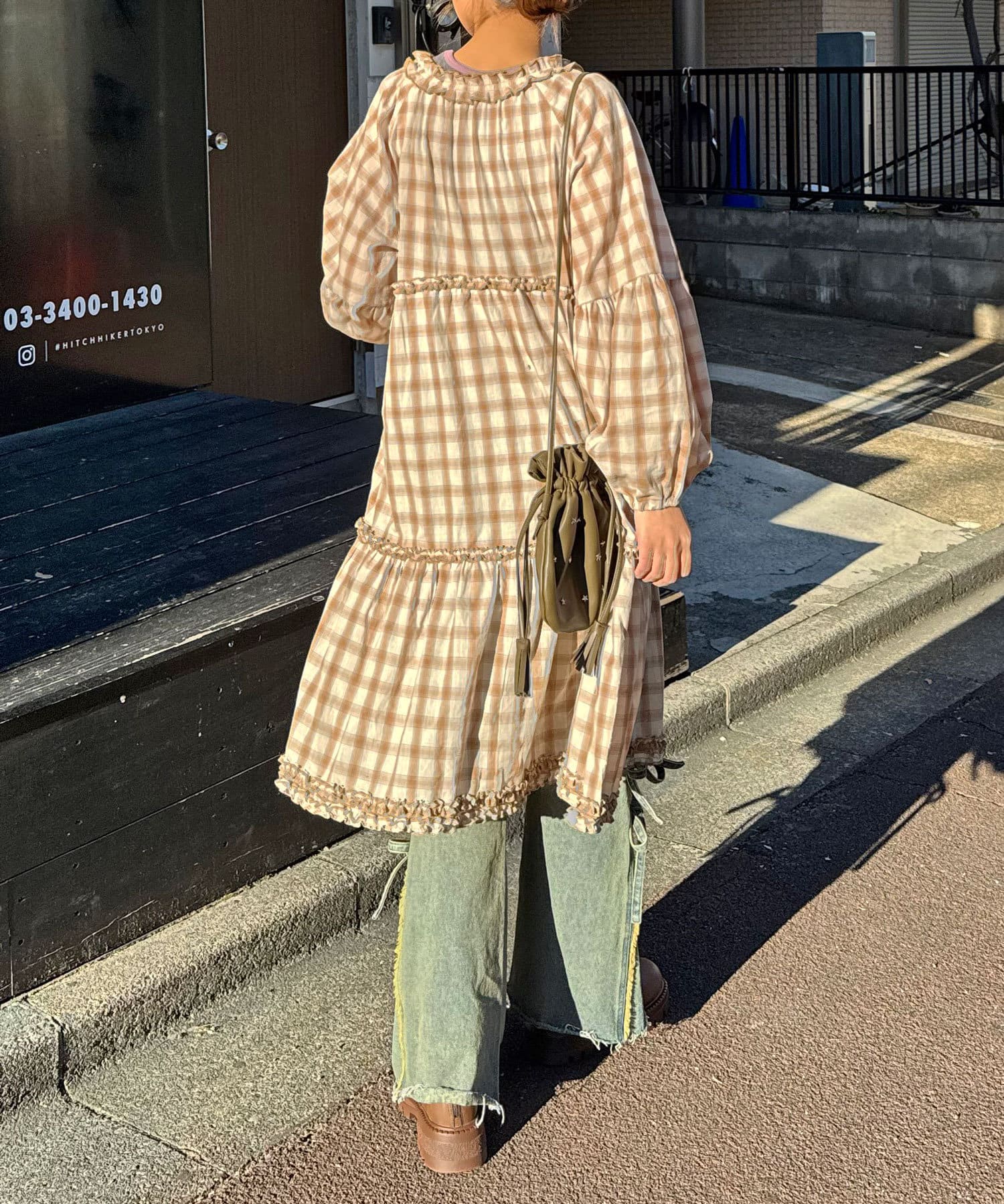 フリルが施されたネックラインや切り替え部分が、よりフェミニンな雰囲気を演出します。