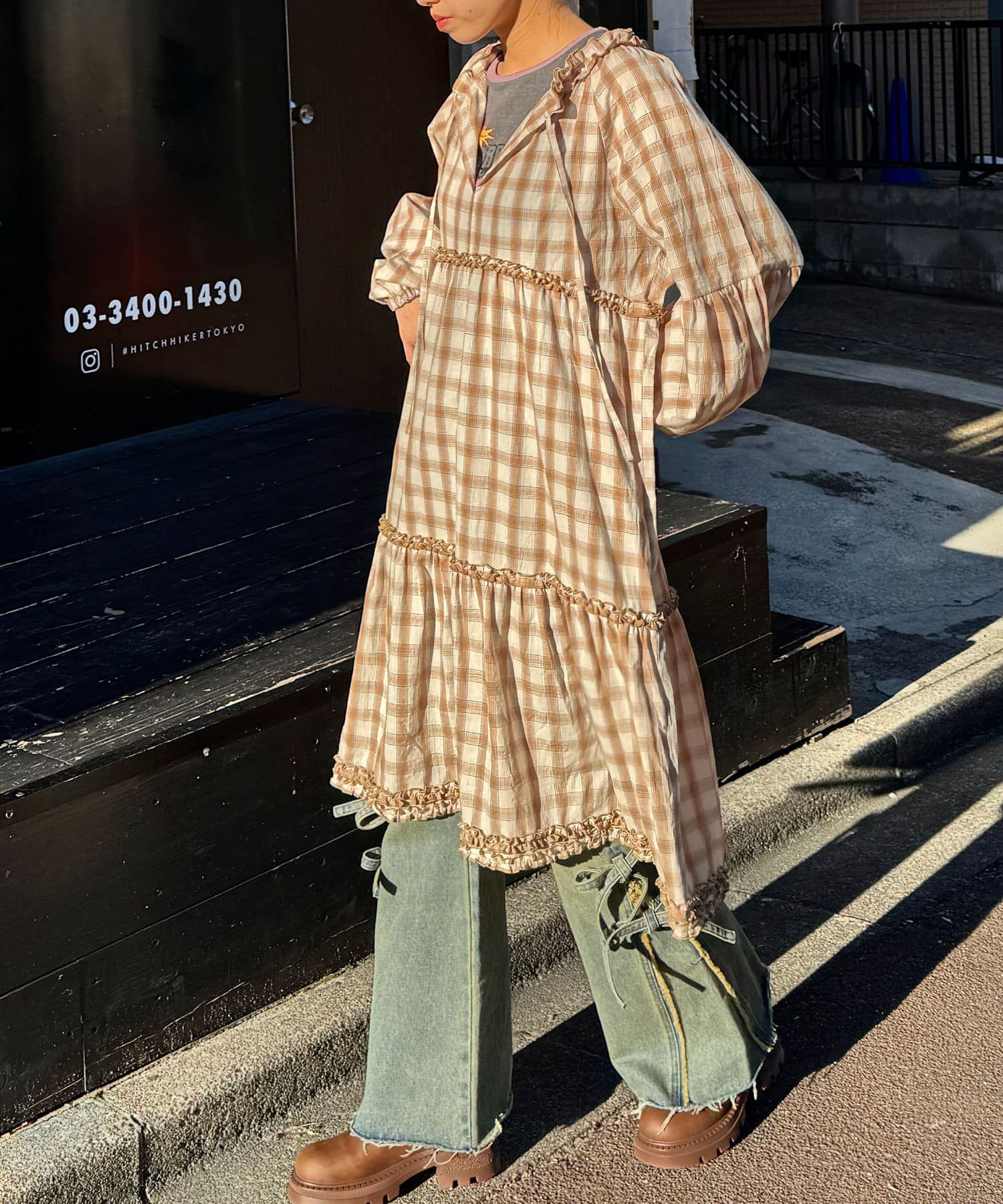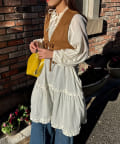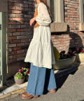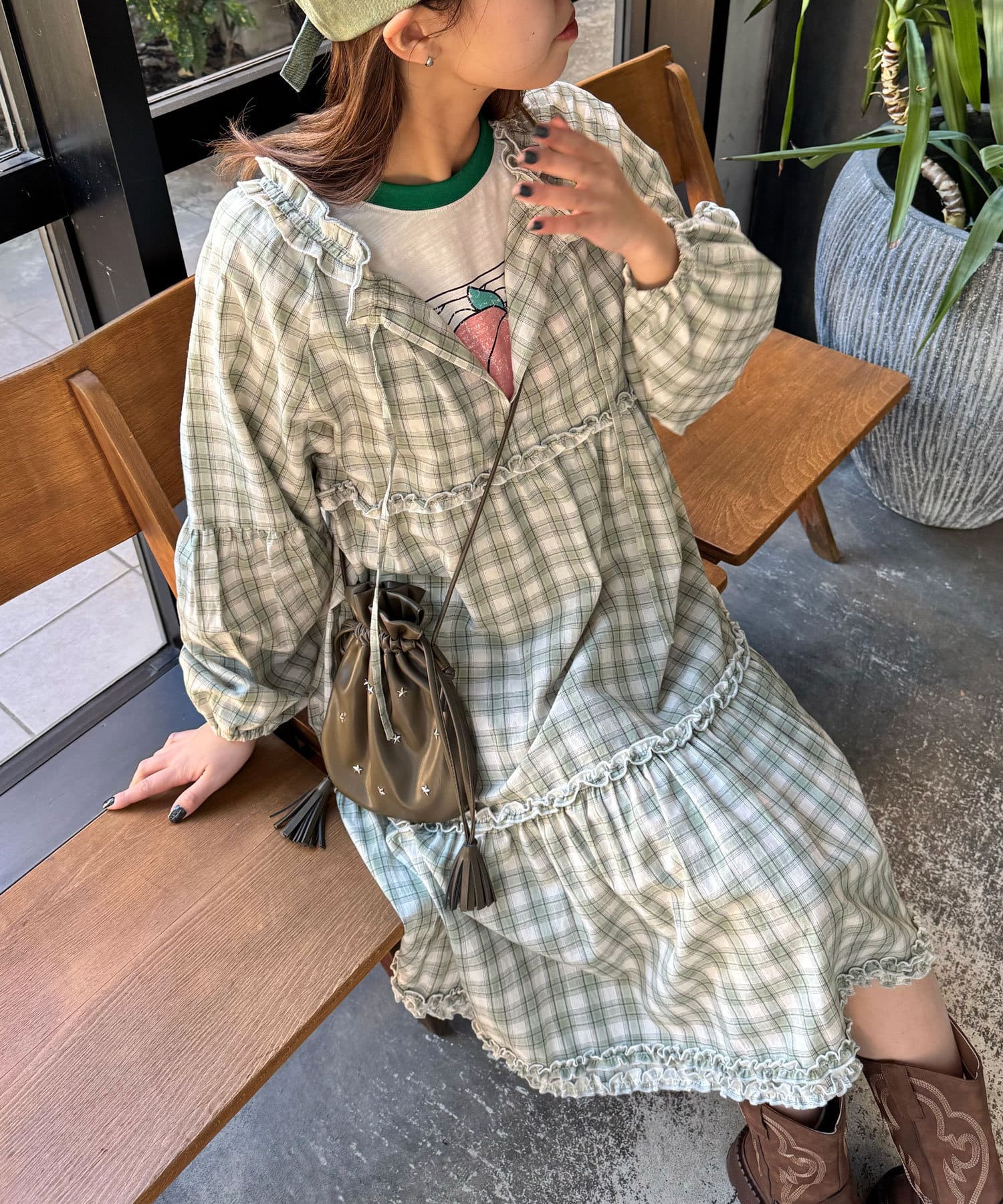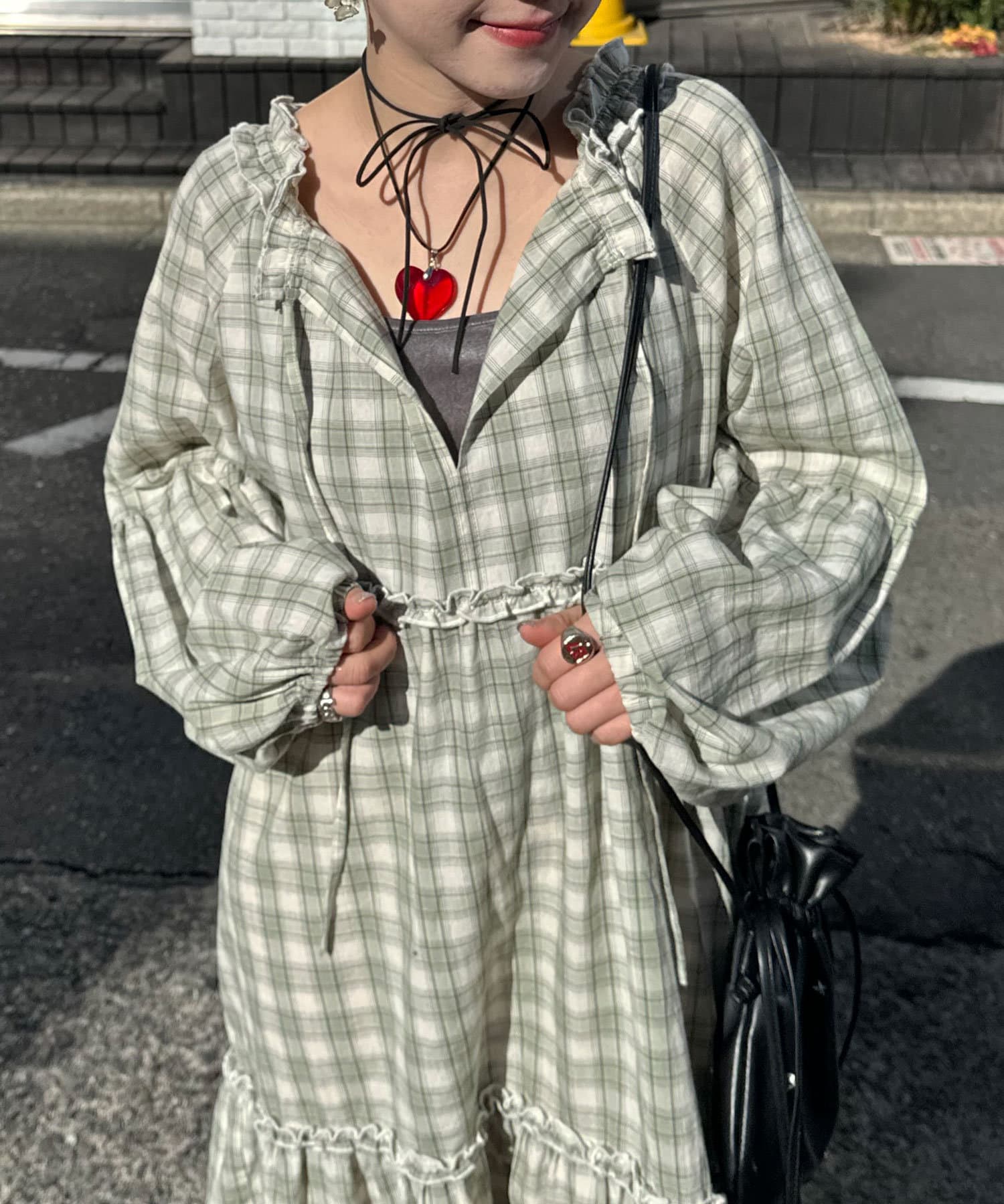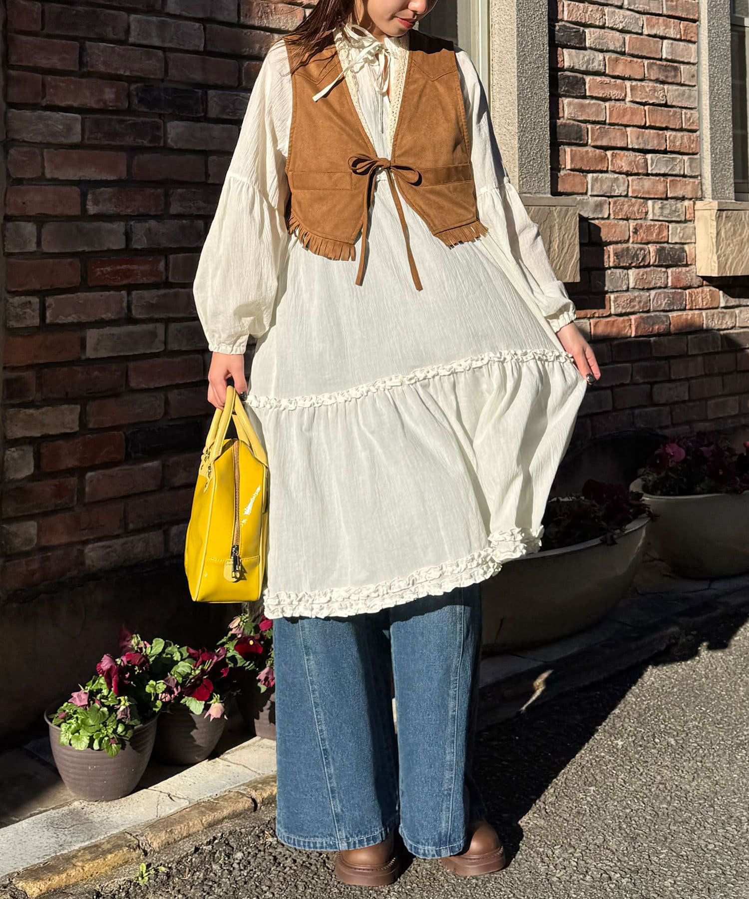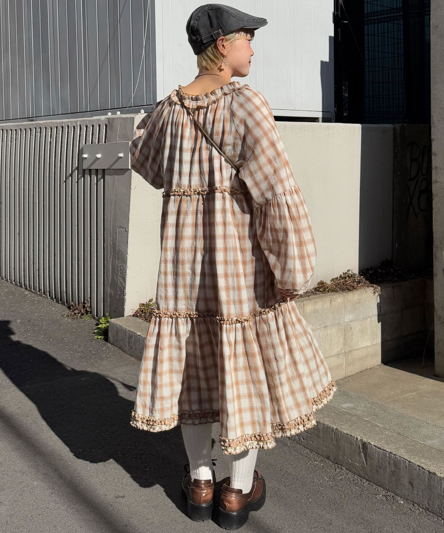 フリルが施されたネックラインや切り替え部分が、よりフェミニンな雰囲気を演出します。