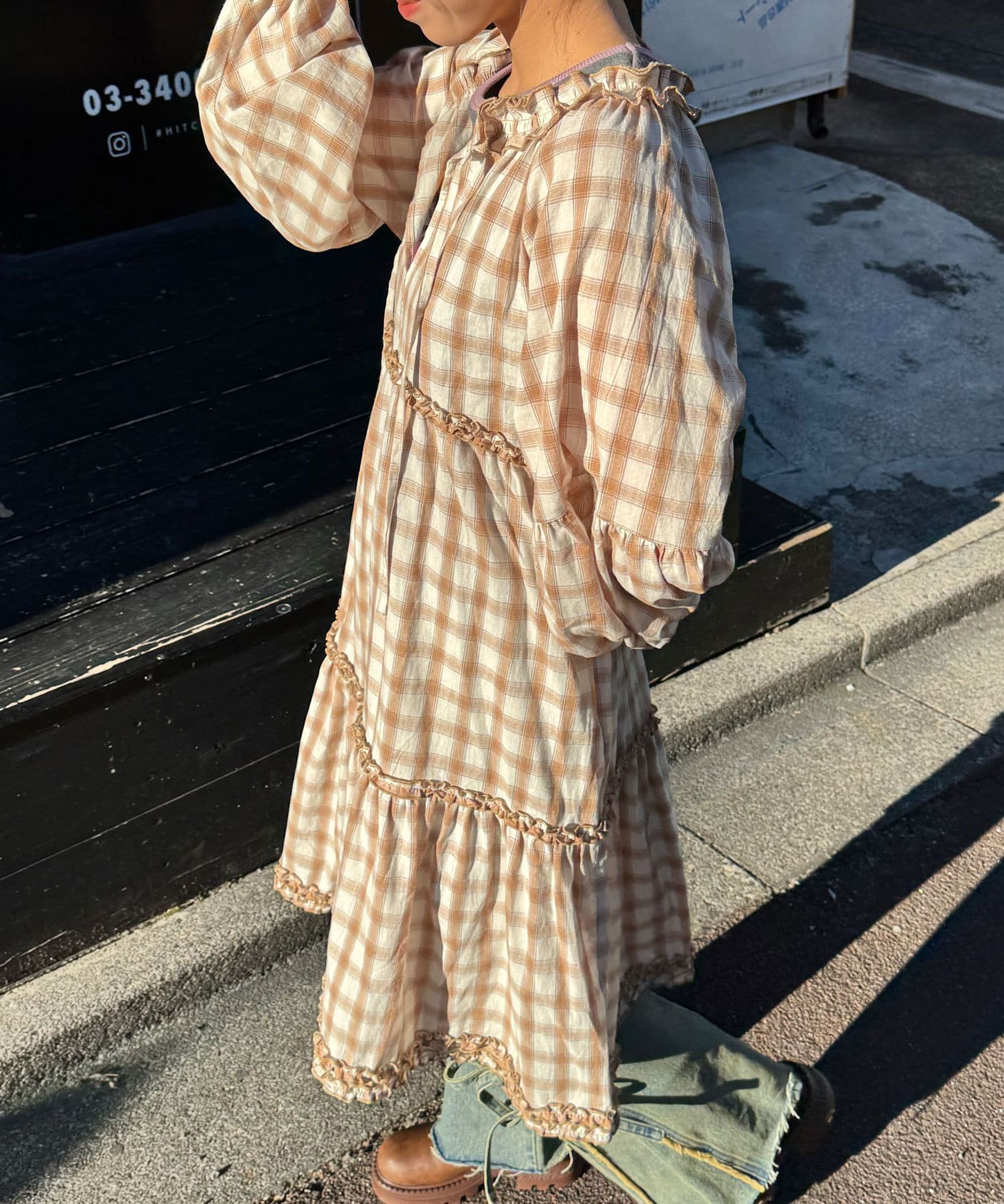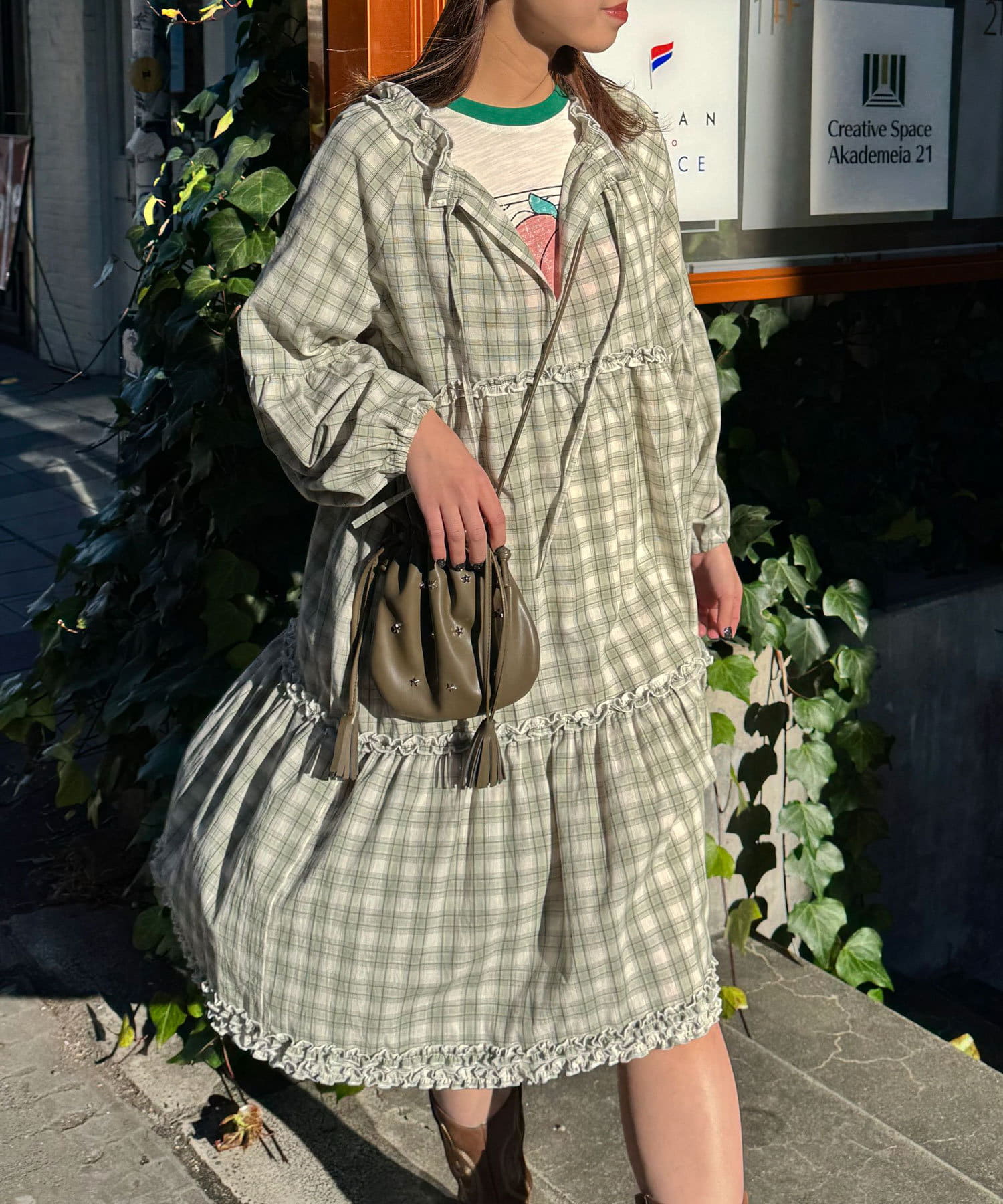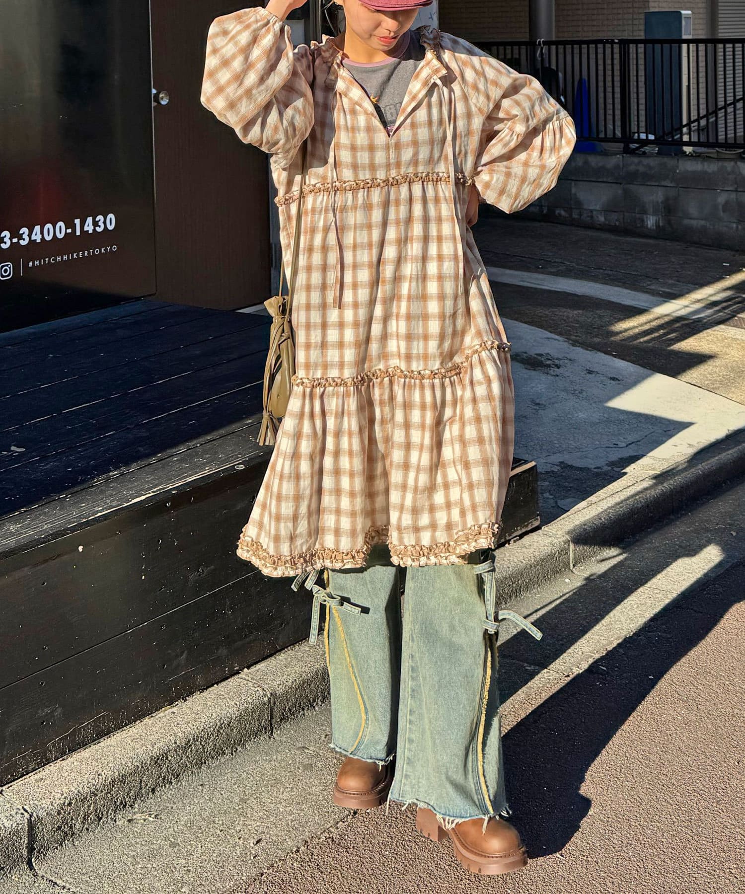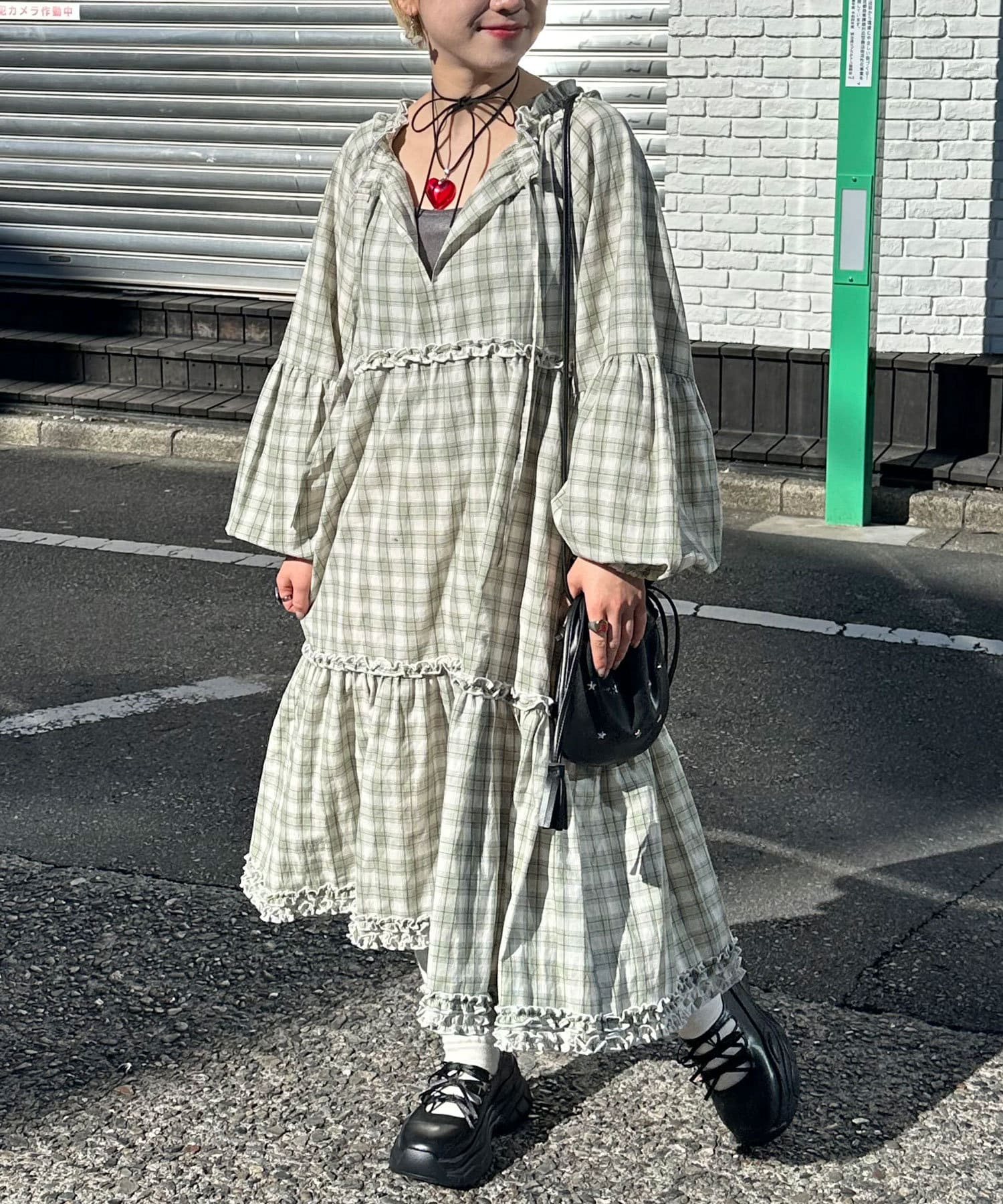 フリルが施されたネックラインや切り替え部分が、よりフェミニンな雰囲気を演出します。