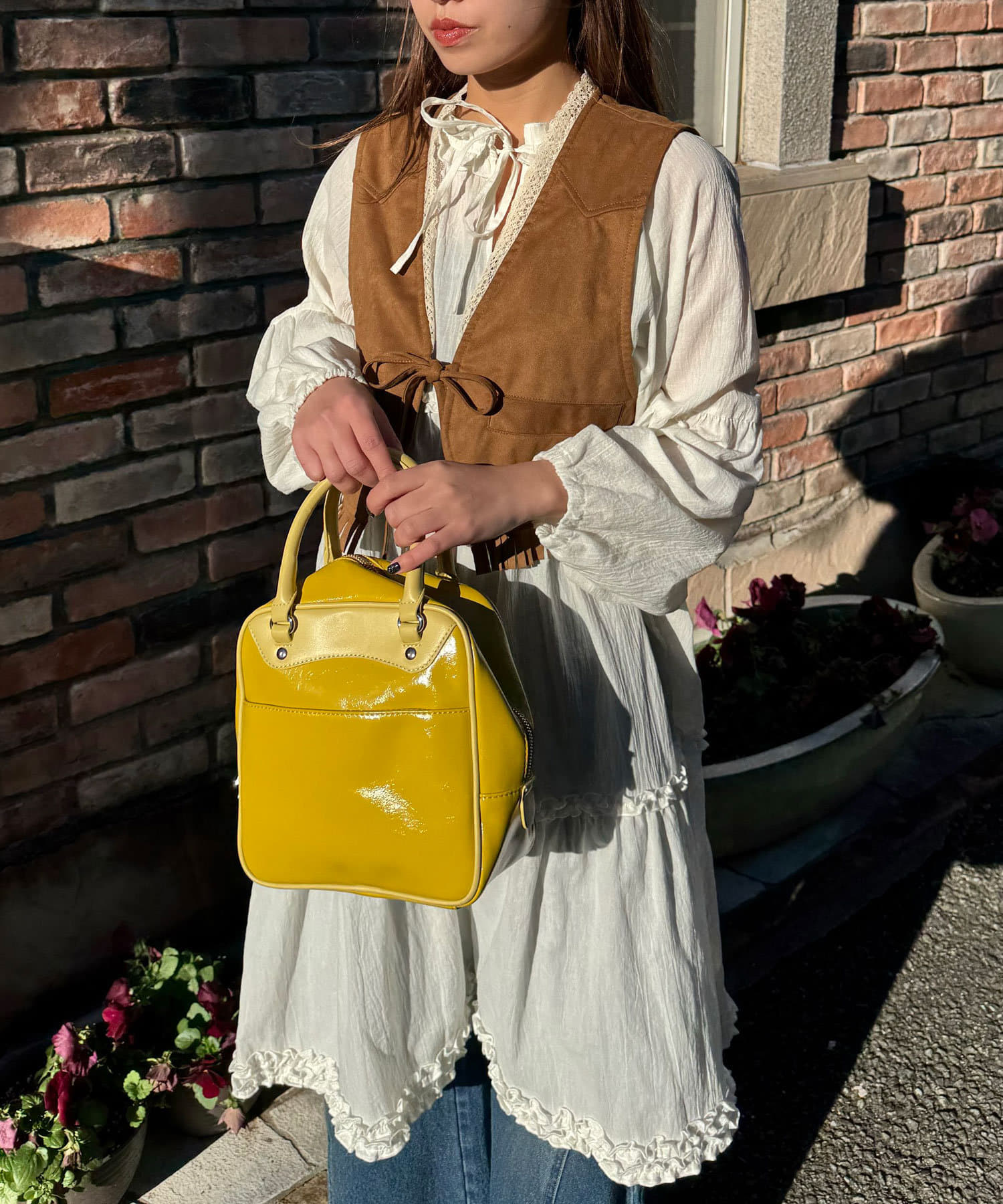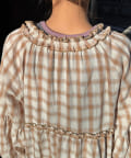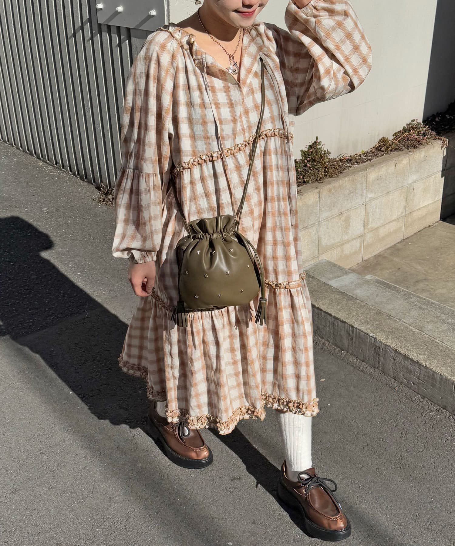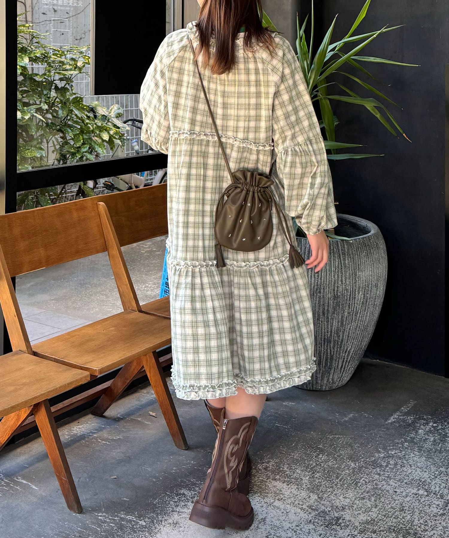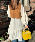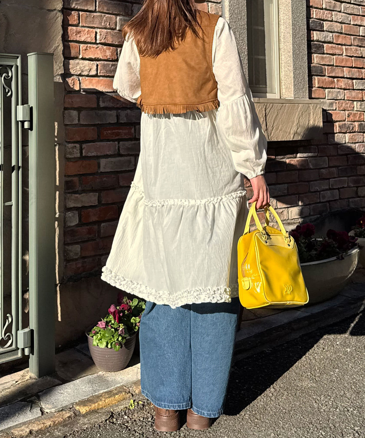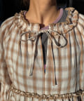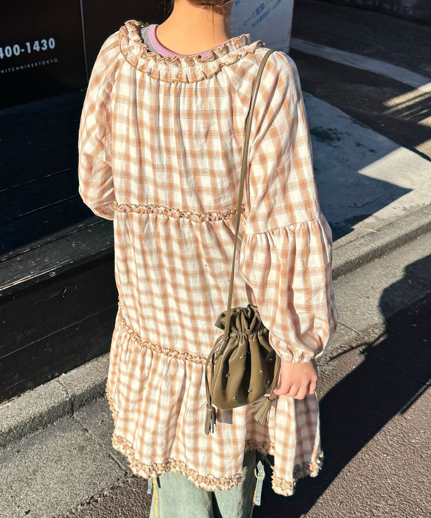 フリルが施されたネックラインや切り替え部分が、よりフェミニンな雰囲気を演出します。