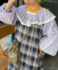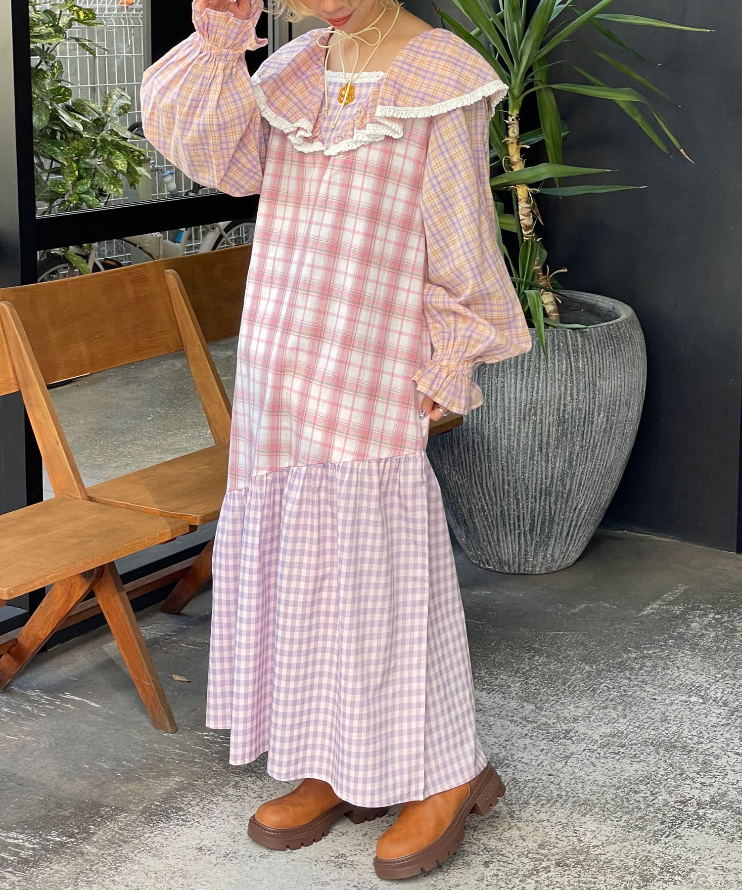 大きめのビッグカラー襟とふんわりボリューム袖がポイントのチェックロングワンピースが登場!