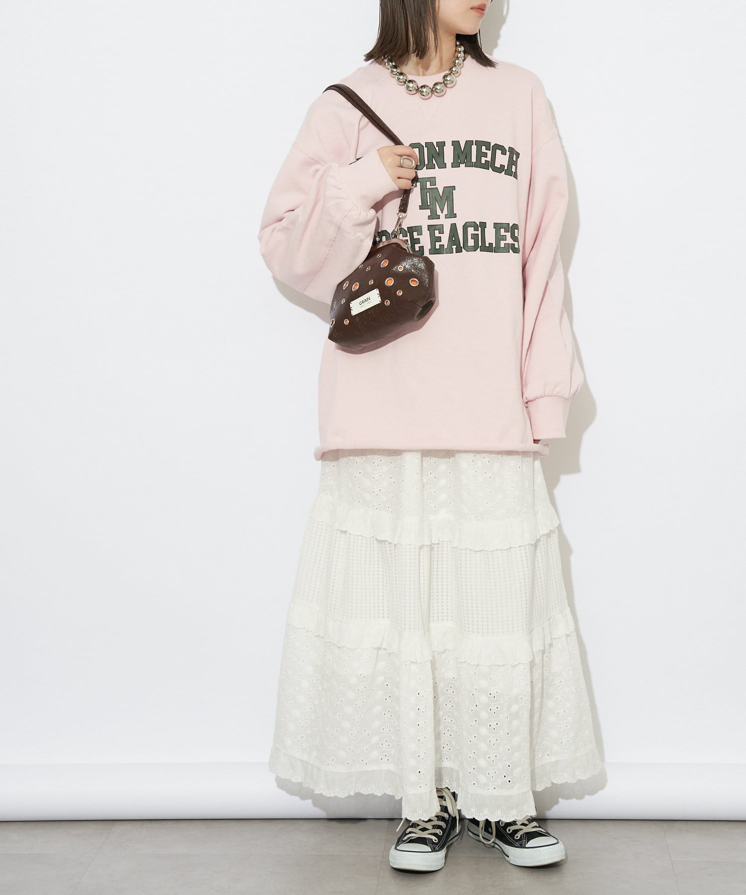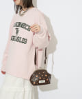 シンプルなTシャツとハイウエストデニム、スニーカーを合わせて、バッグのハトメとがま口で個性をプラス!
