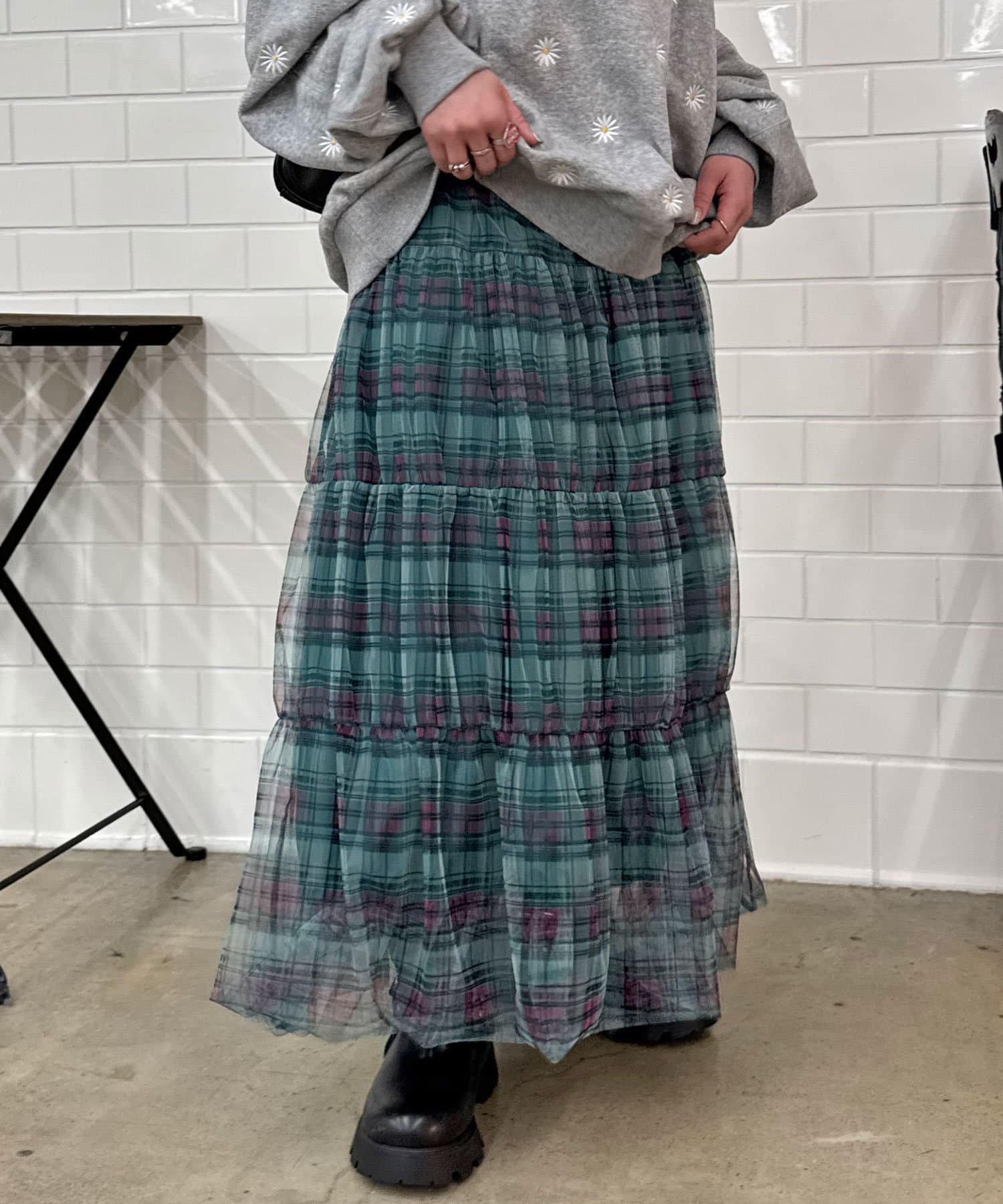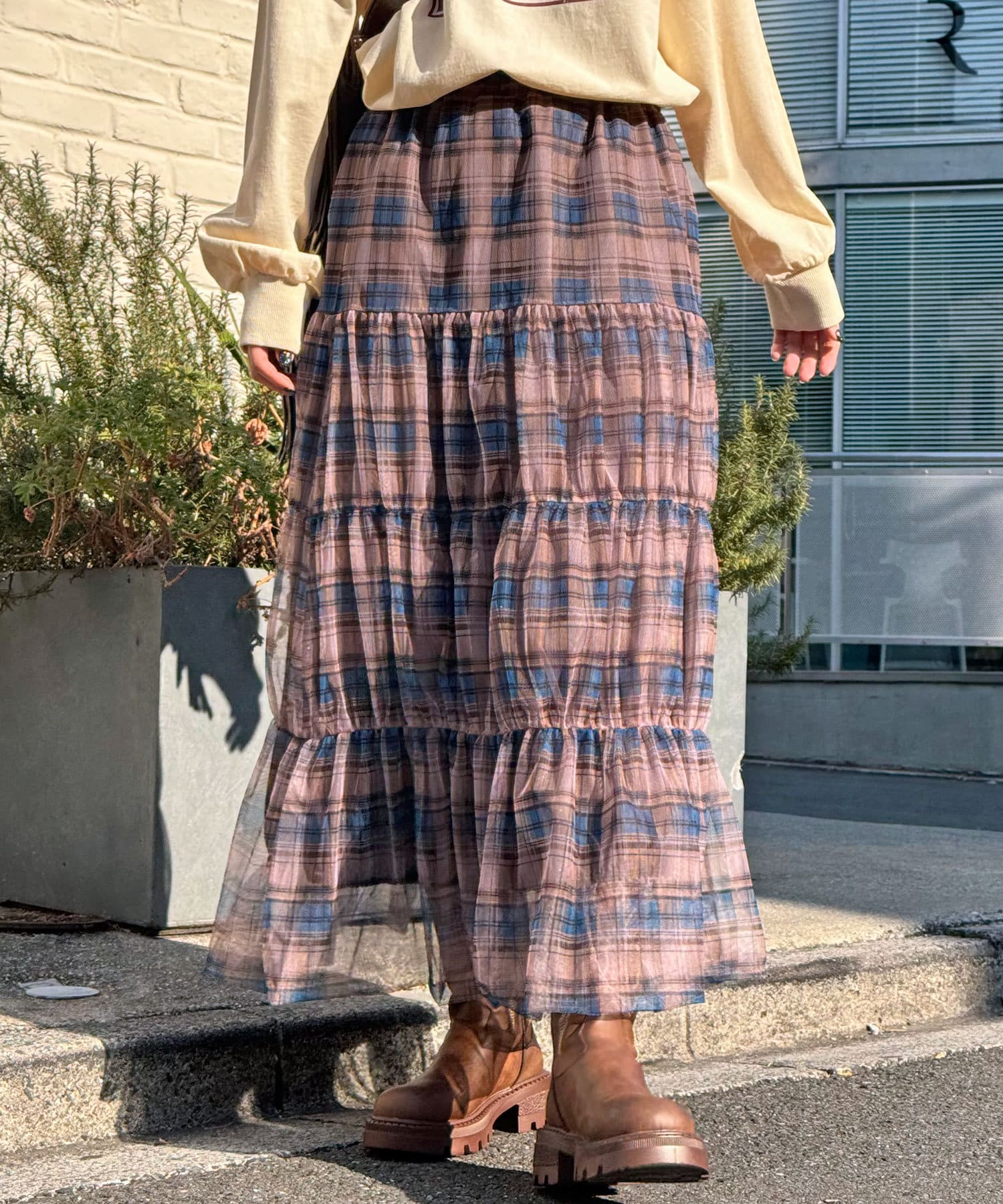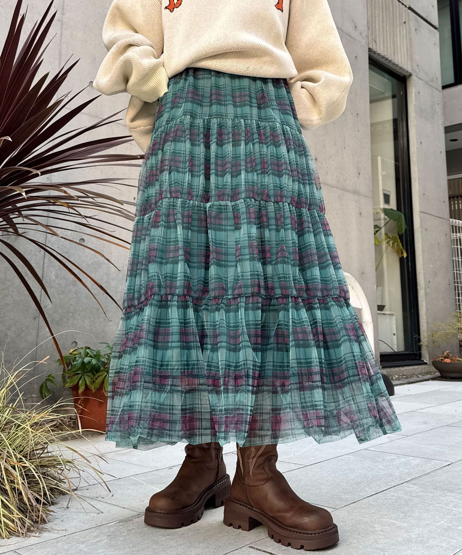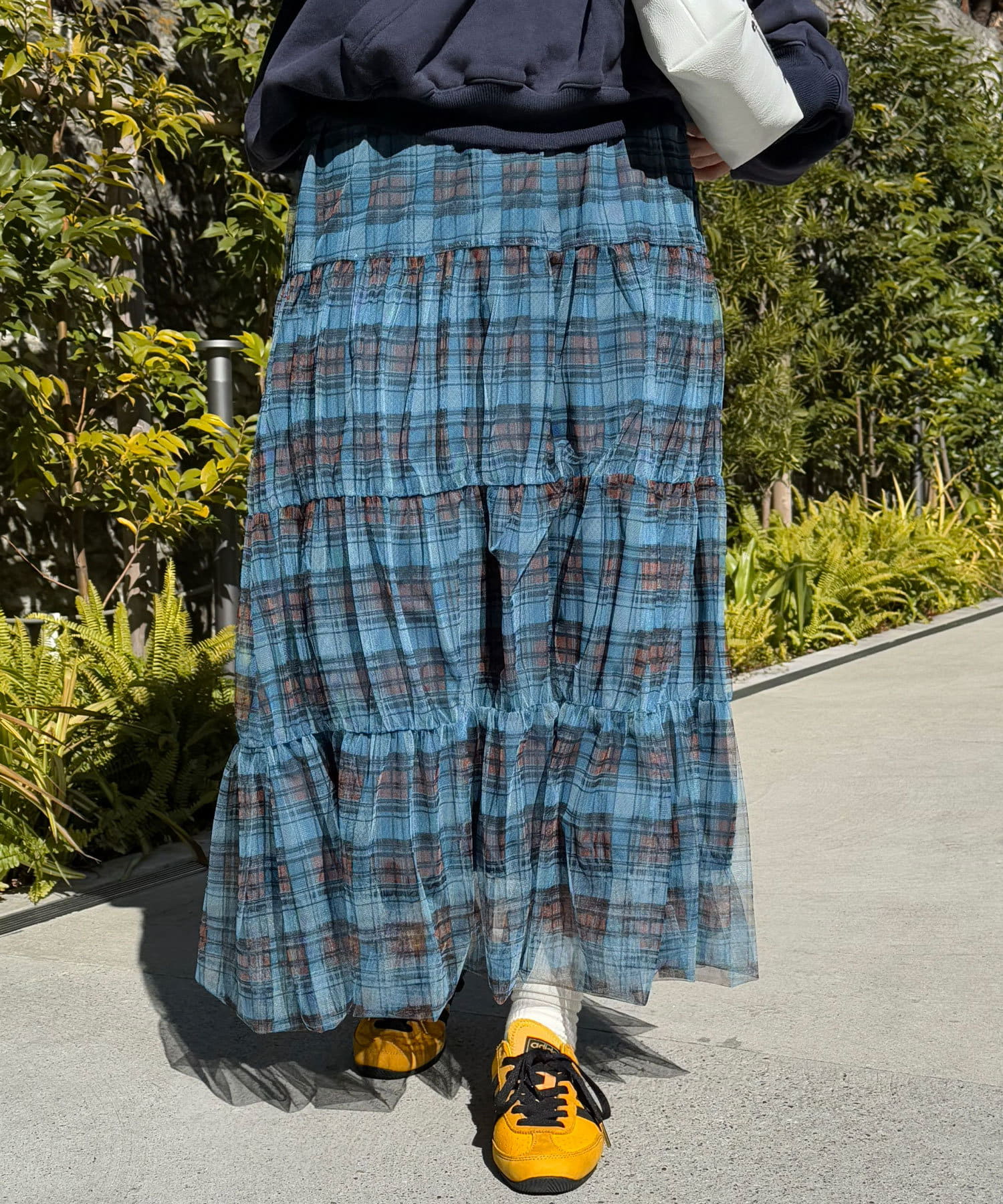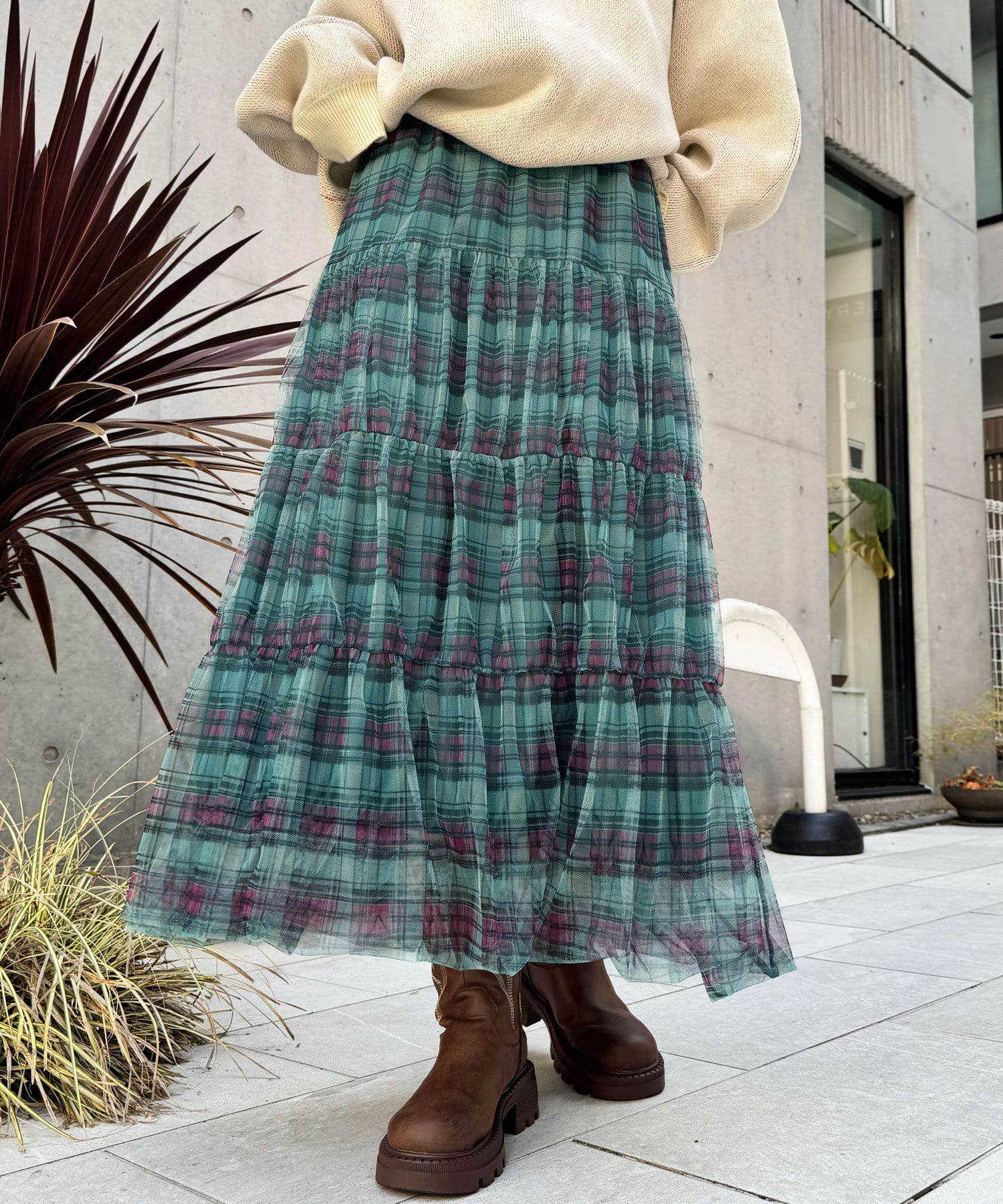 ふんわり広がるチュールティアードバルーンチェックスカート。