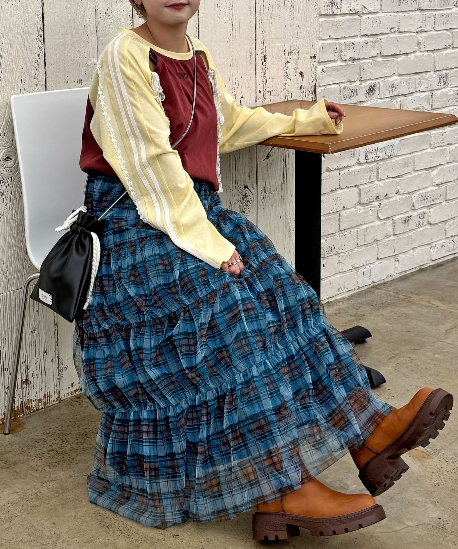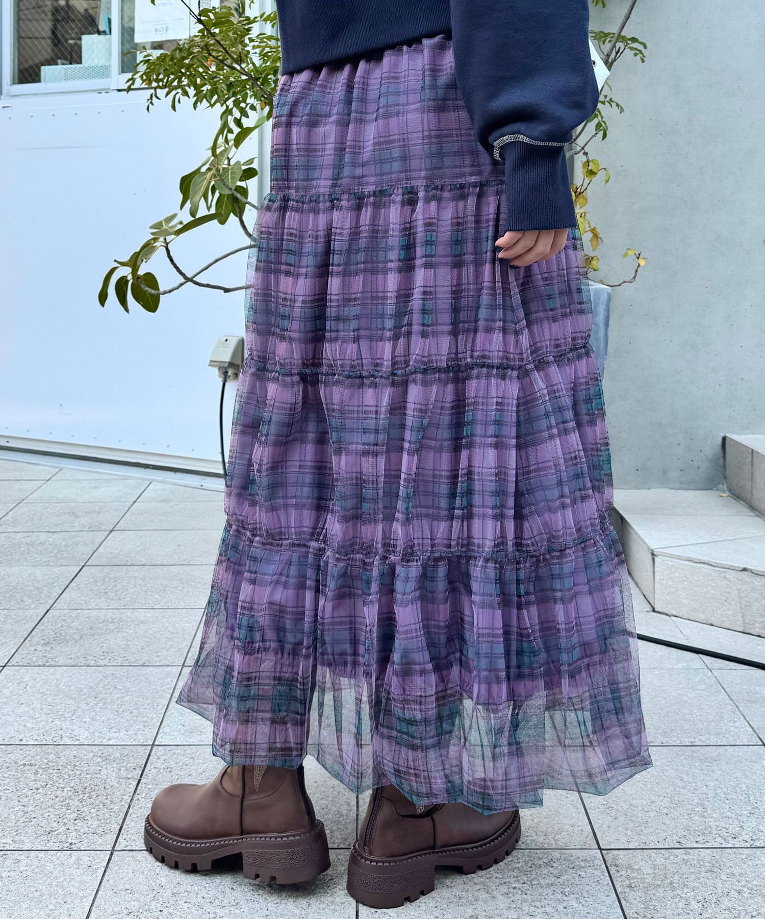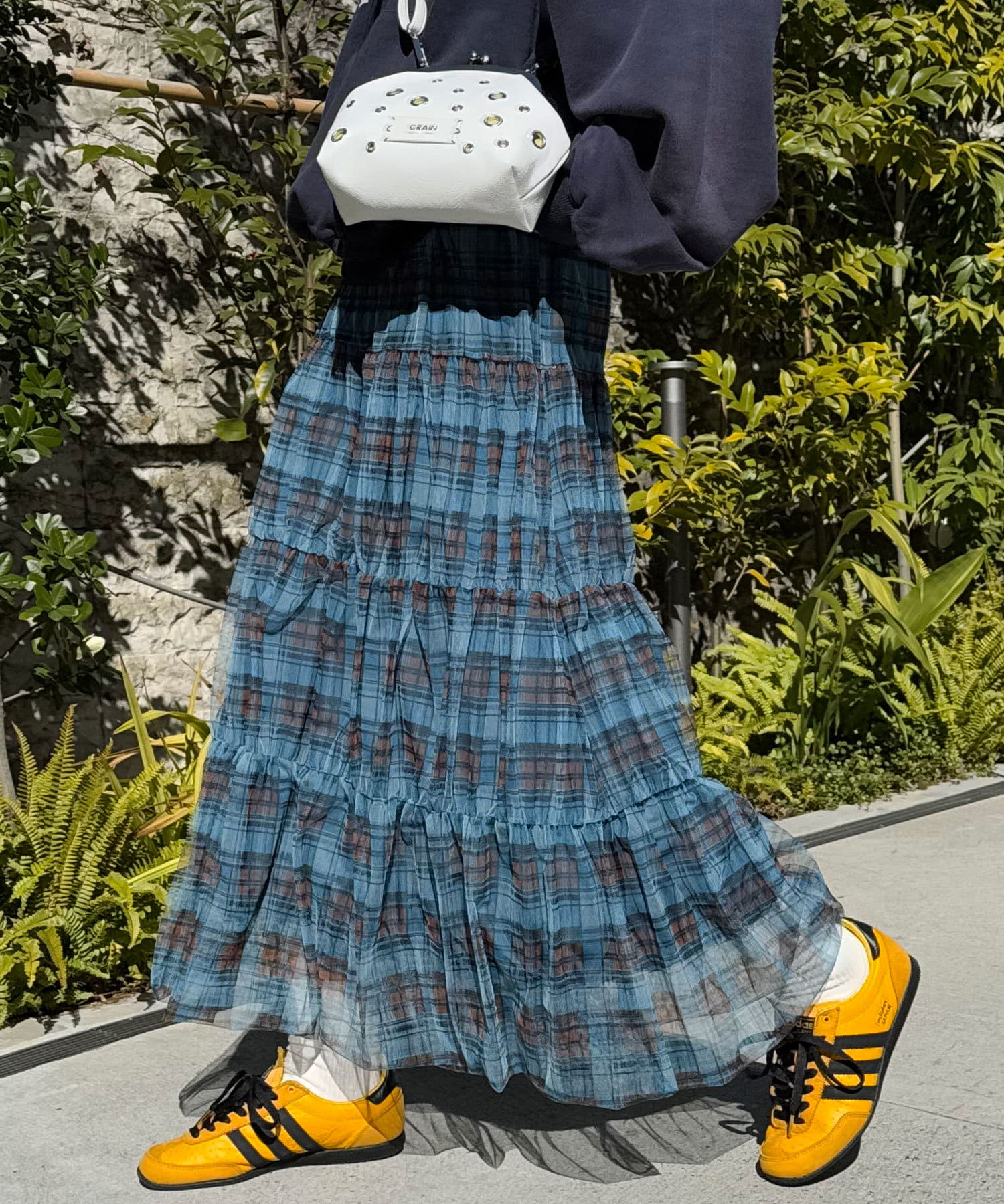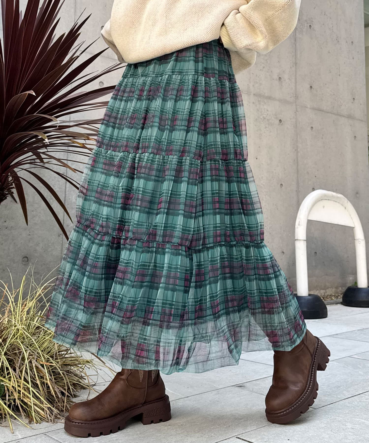 ふんわり広がるチュールティアードバルーンチェックスカート。
