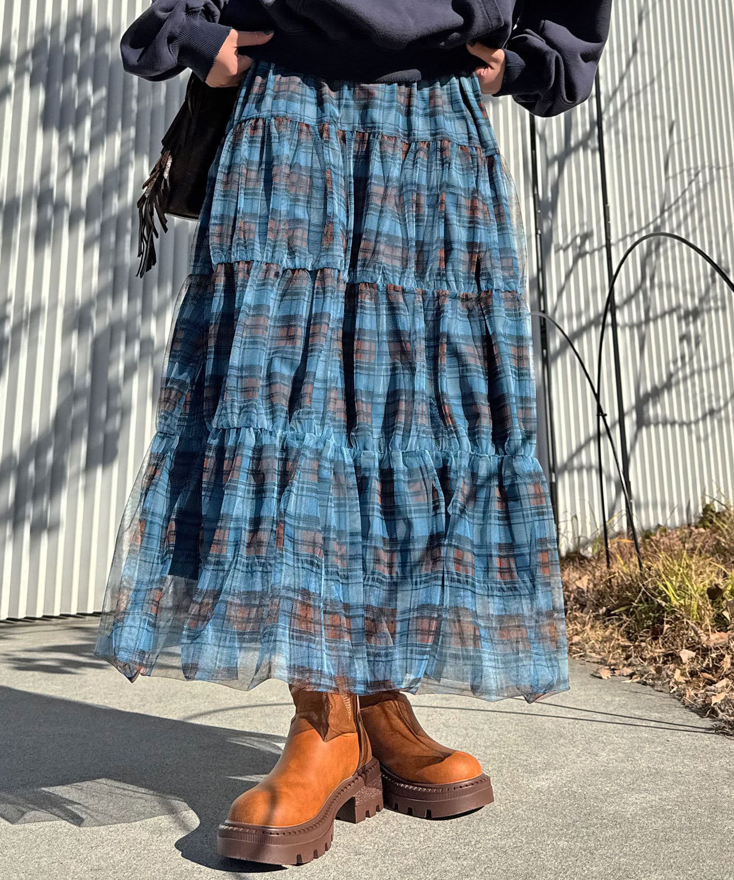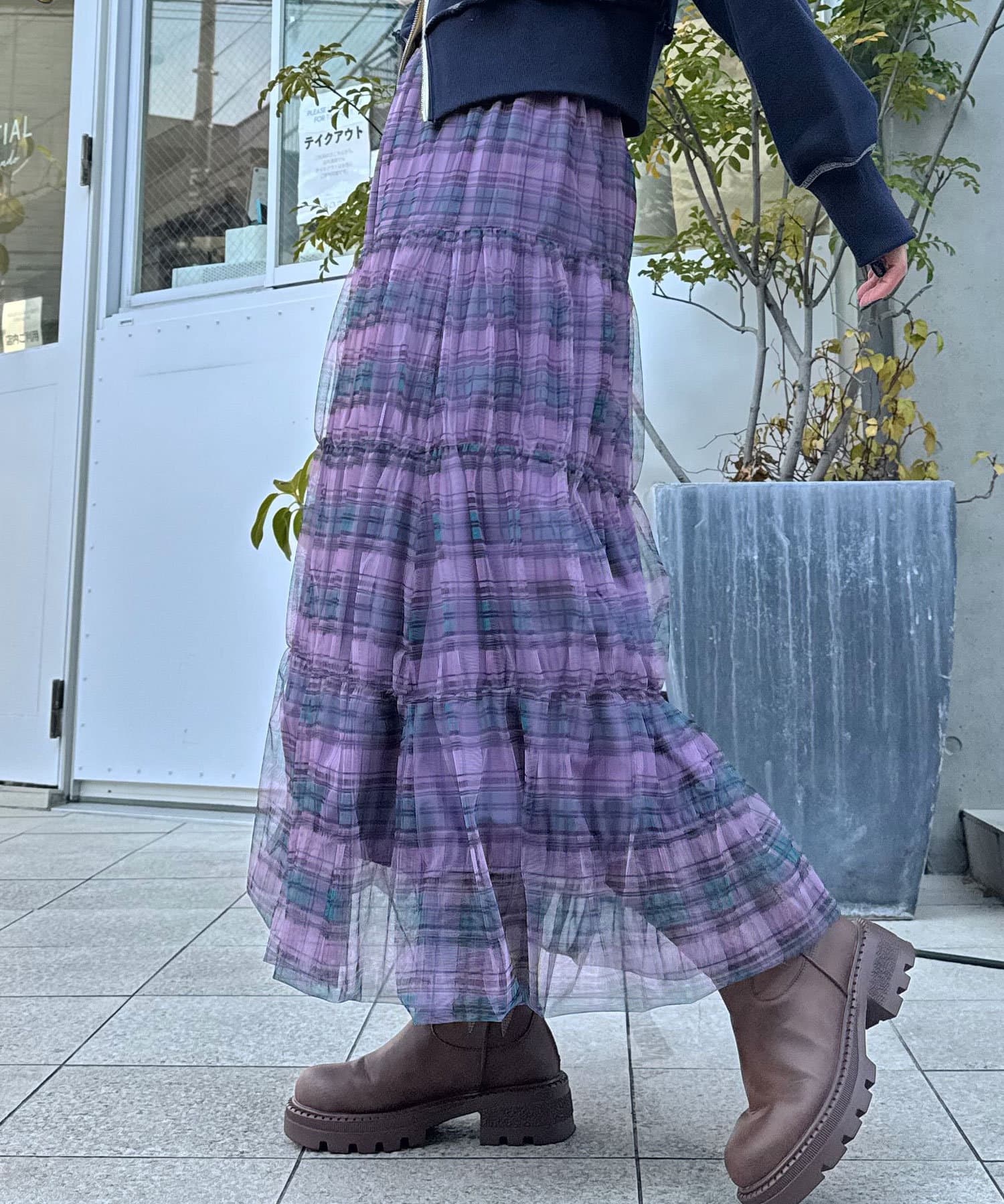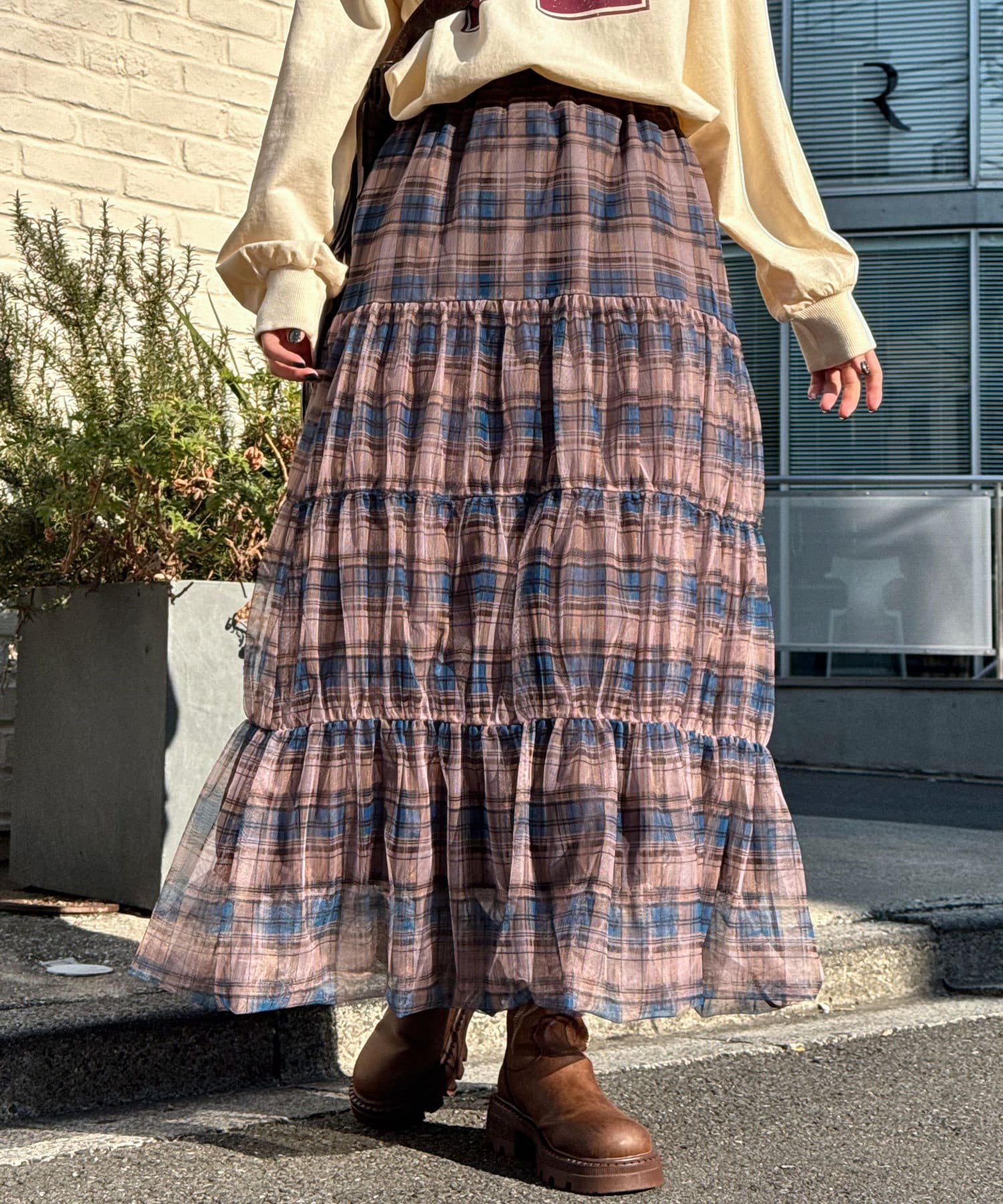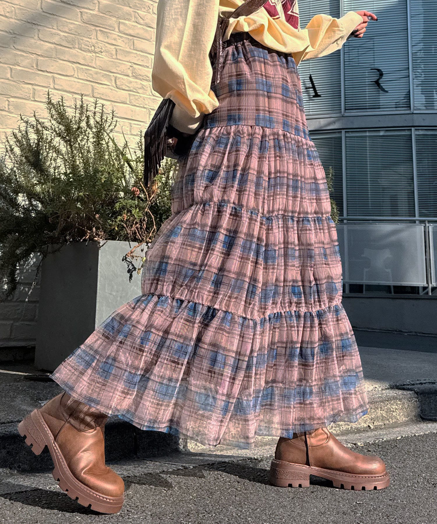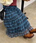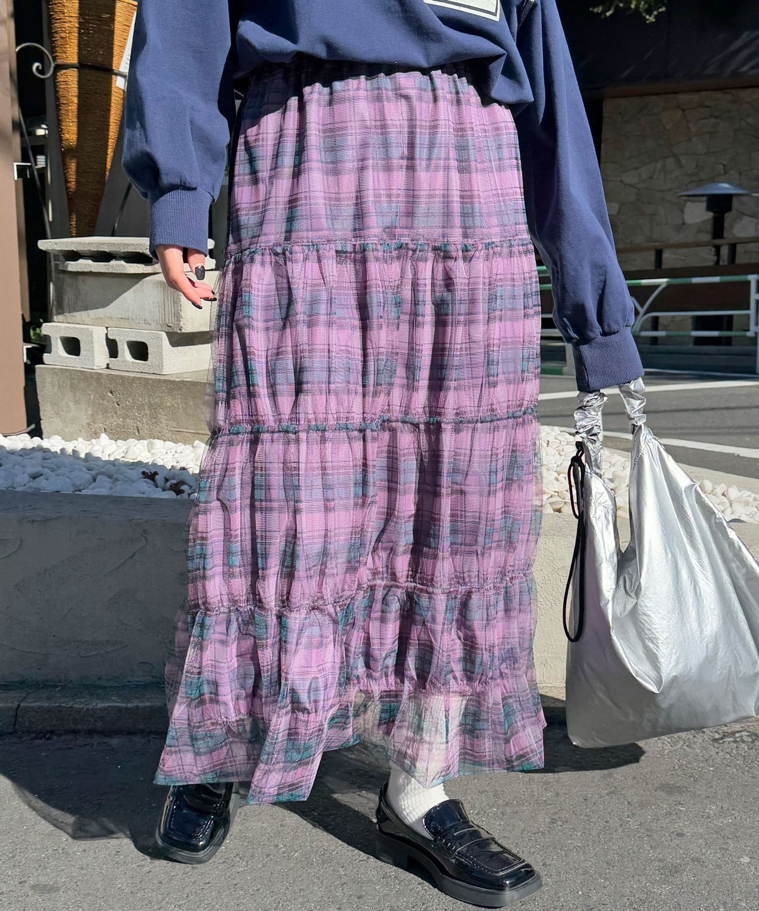 ふんわり広がるチュールティアードバルーンチェックスカート。