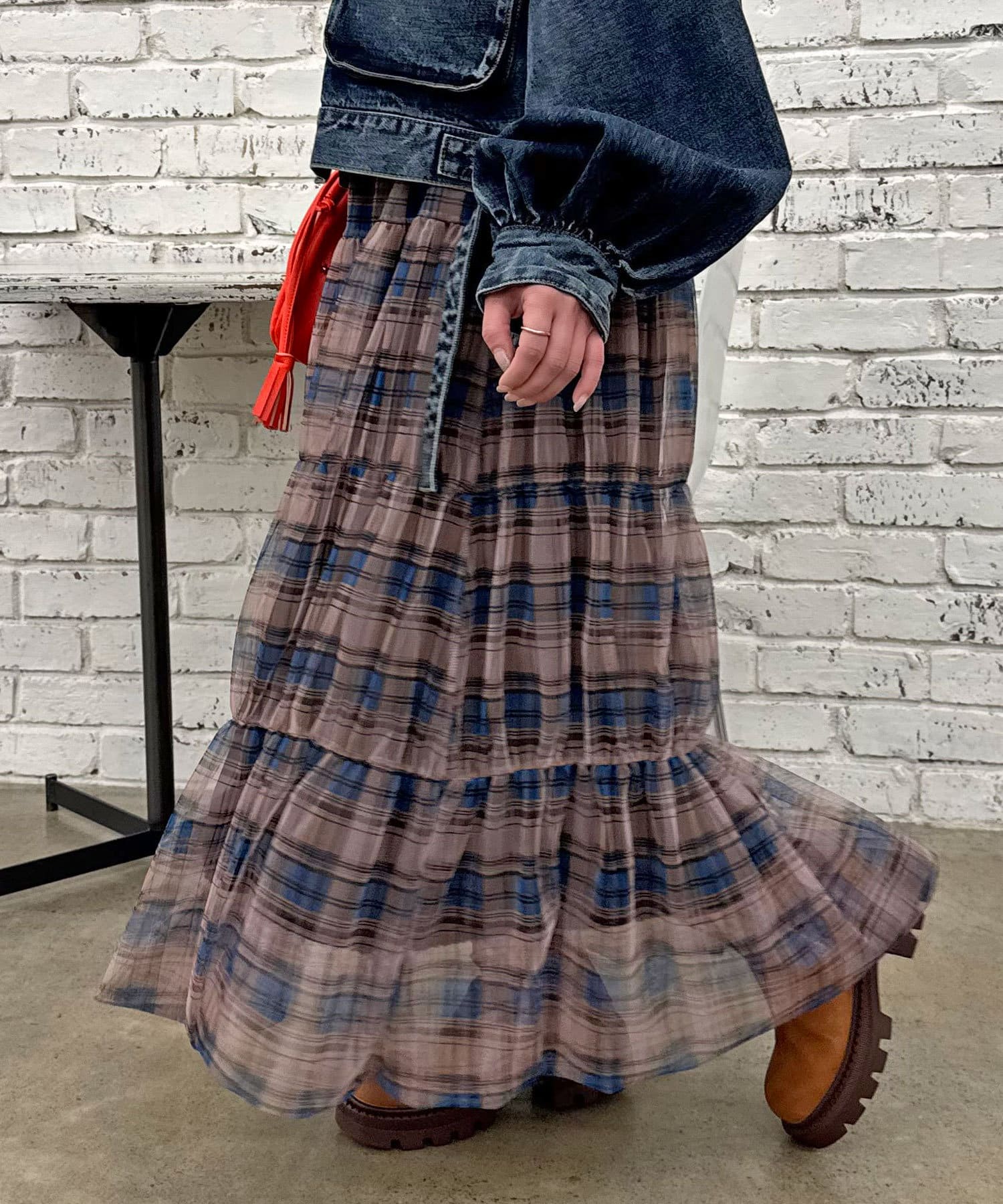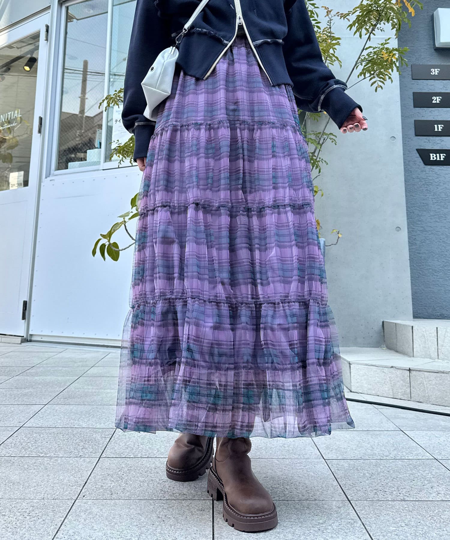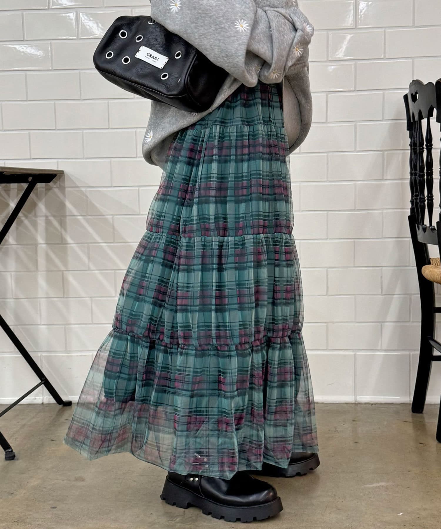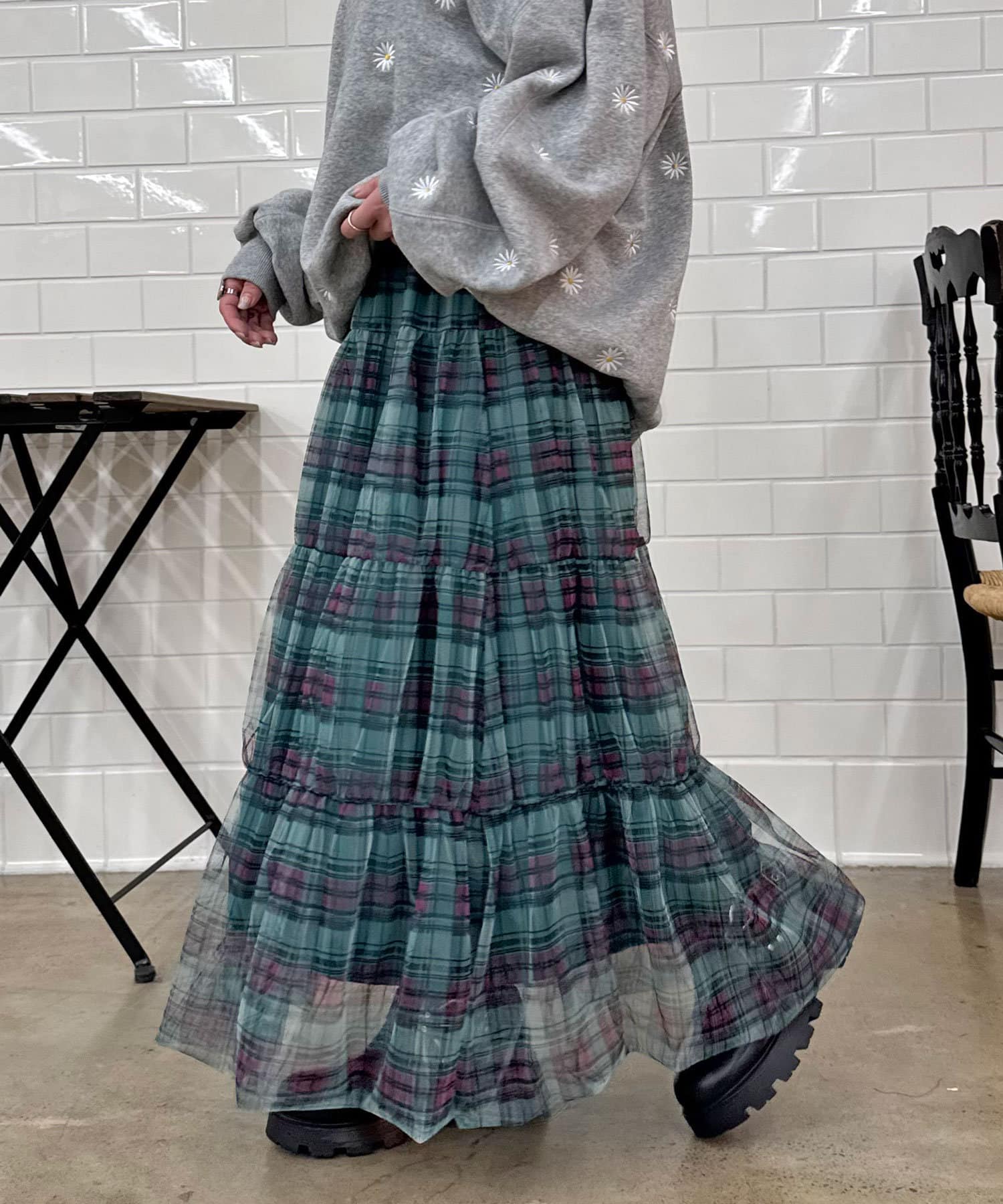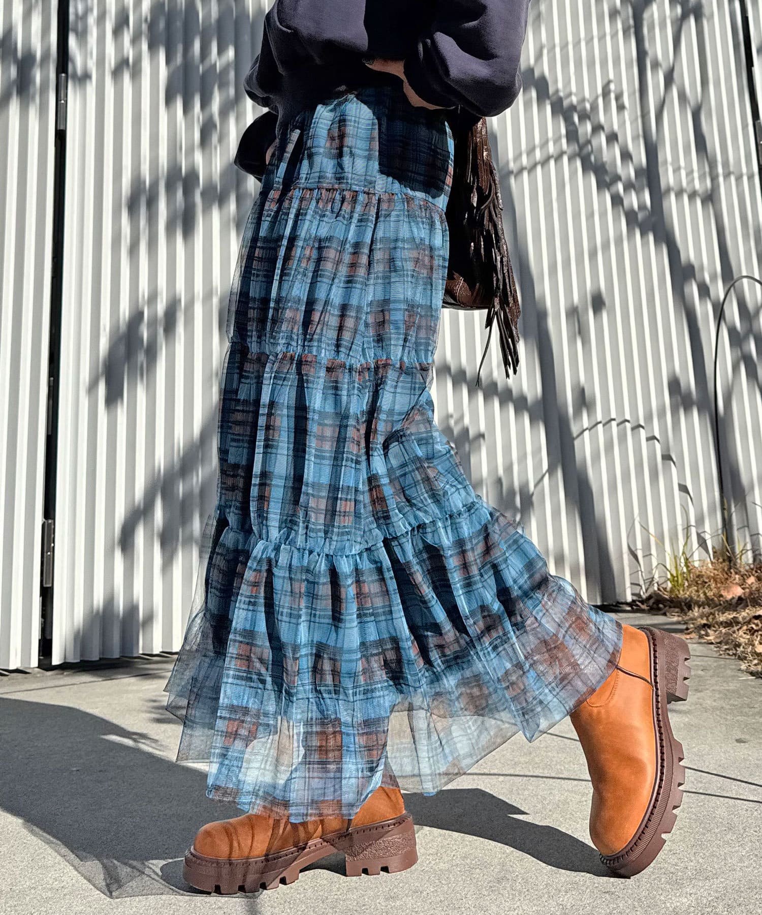 ふんわり広がるチュールティアードバルーンチェックスカート。