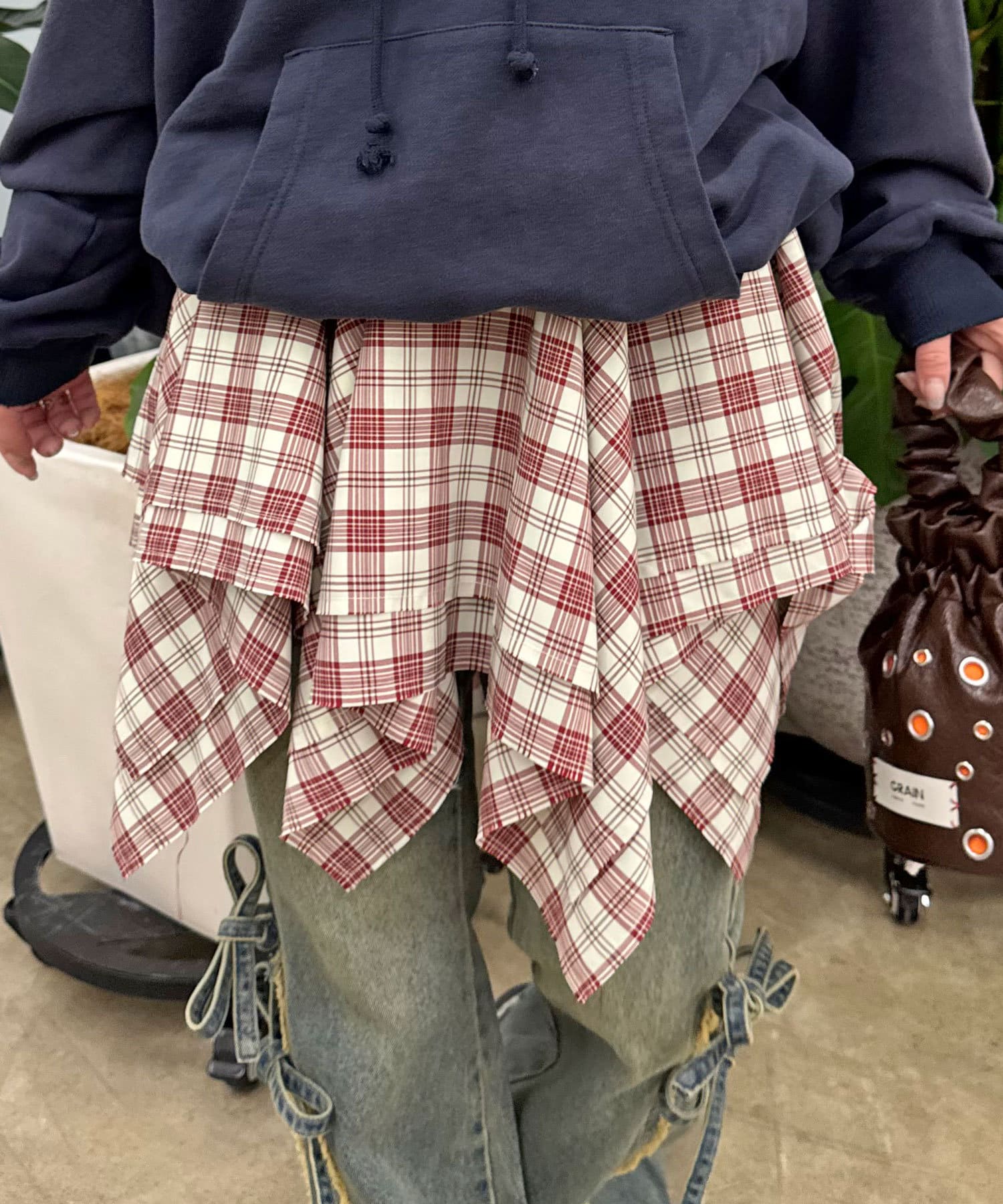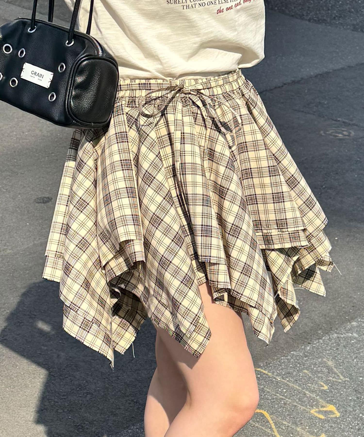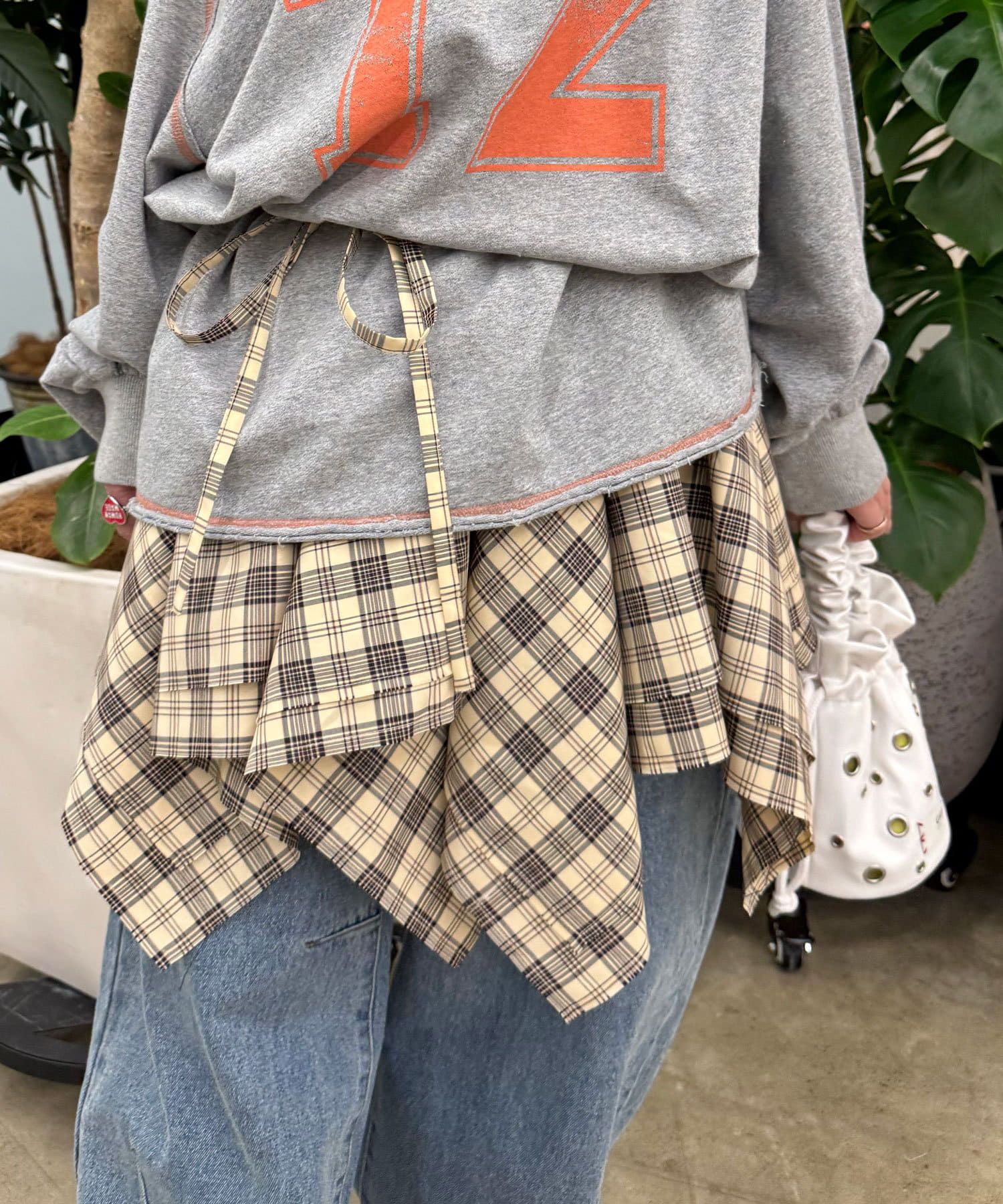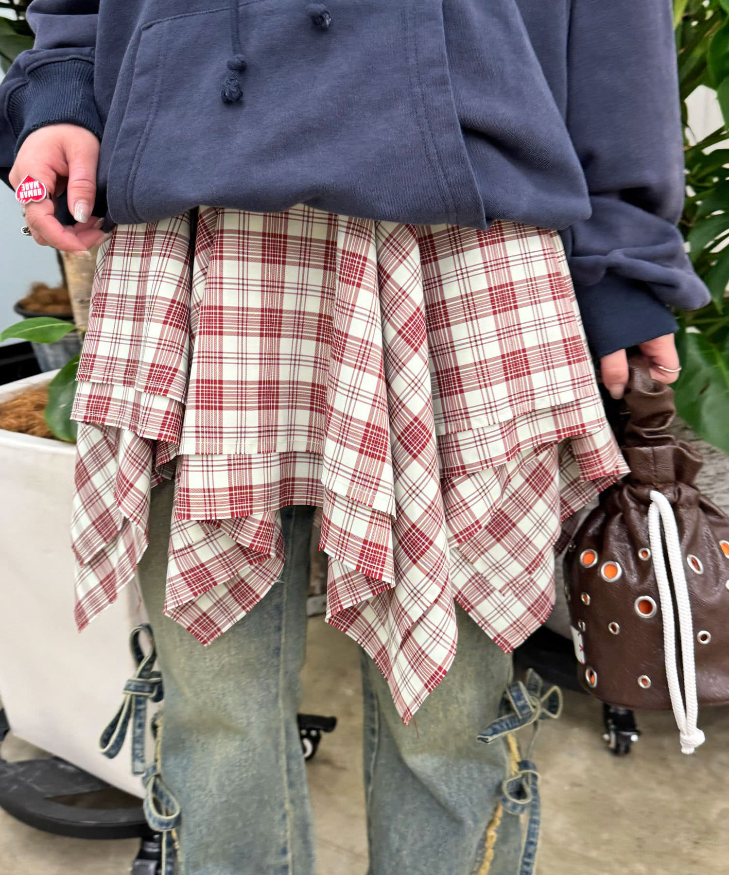 チェック柄と斜めにカットされたイレヘムデザインが、カジュアルだけどちょっと差をつけるスタイルに仕上げてくれます。