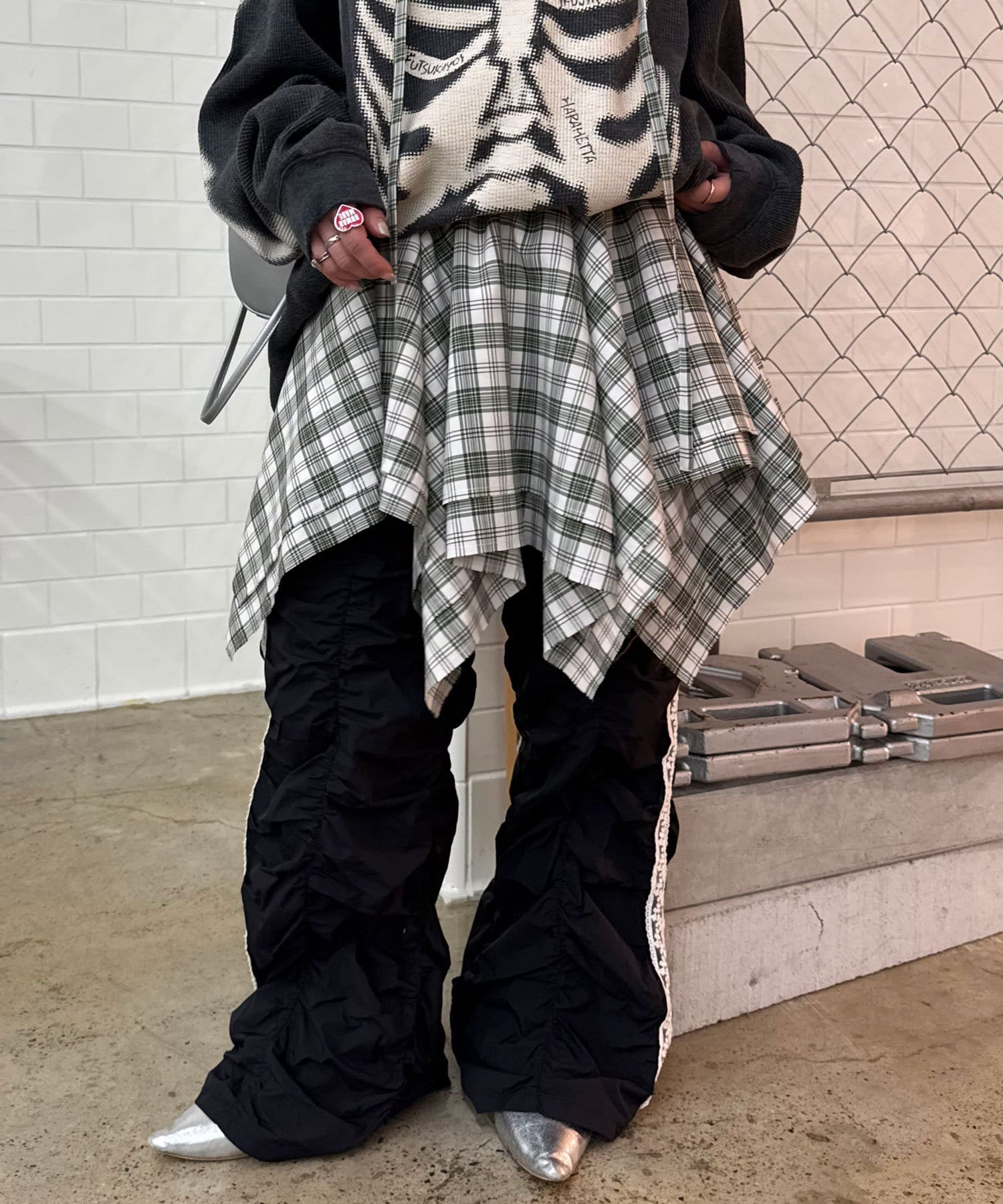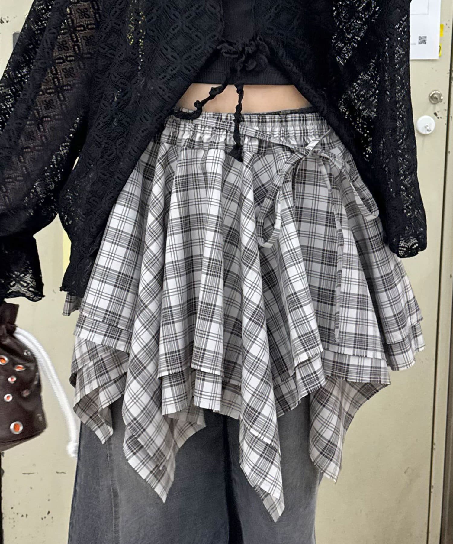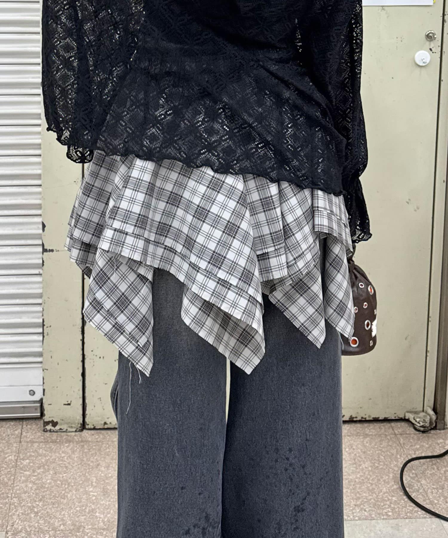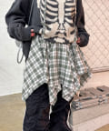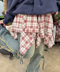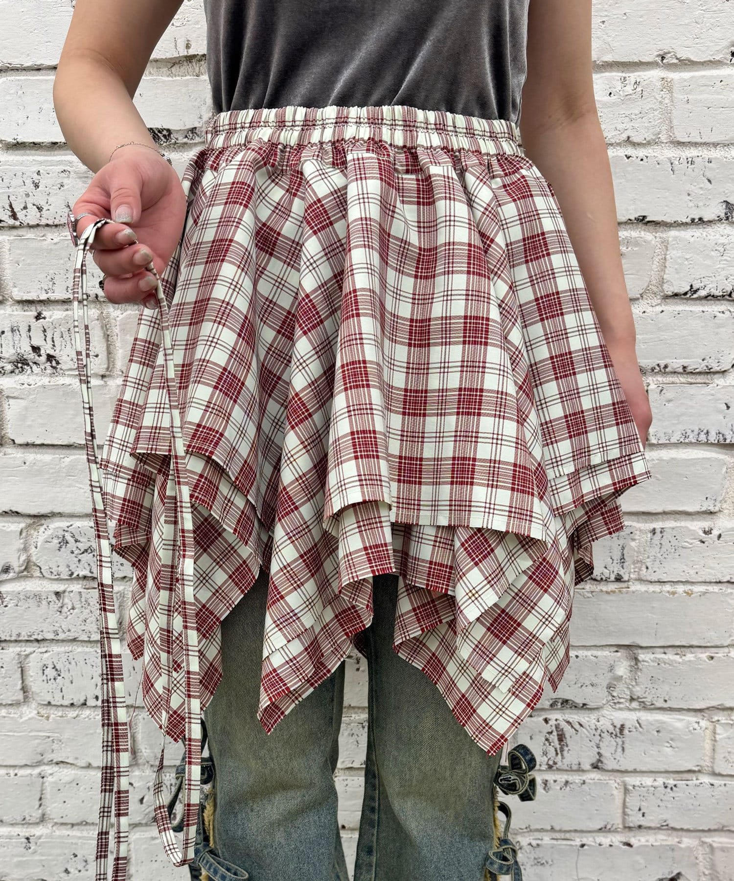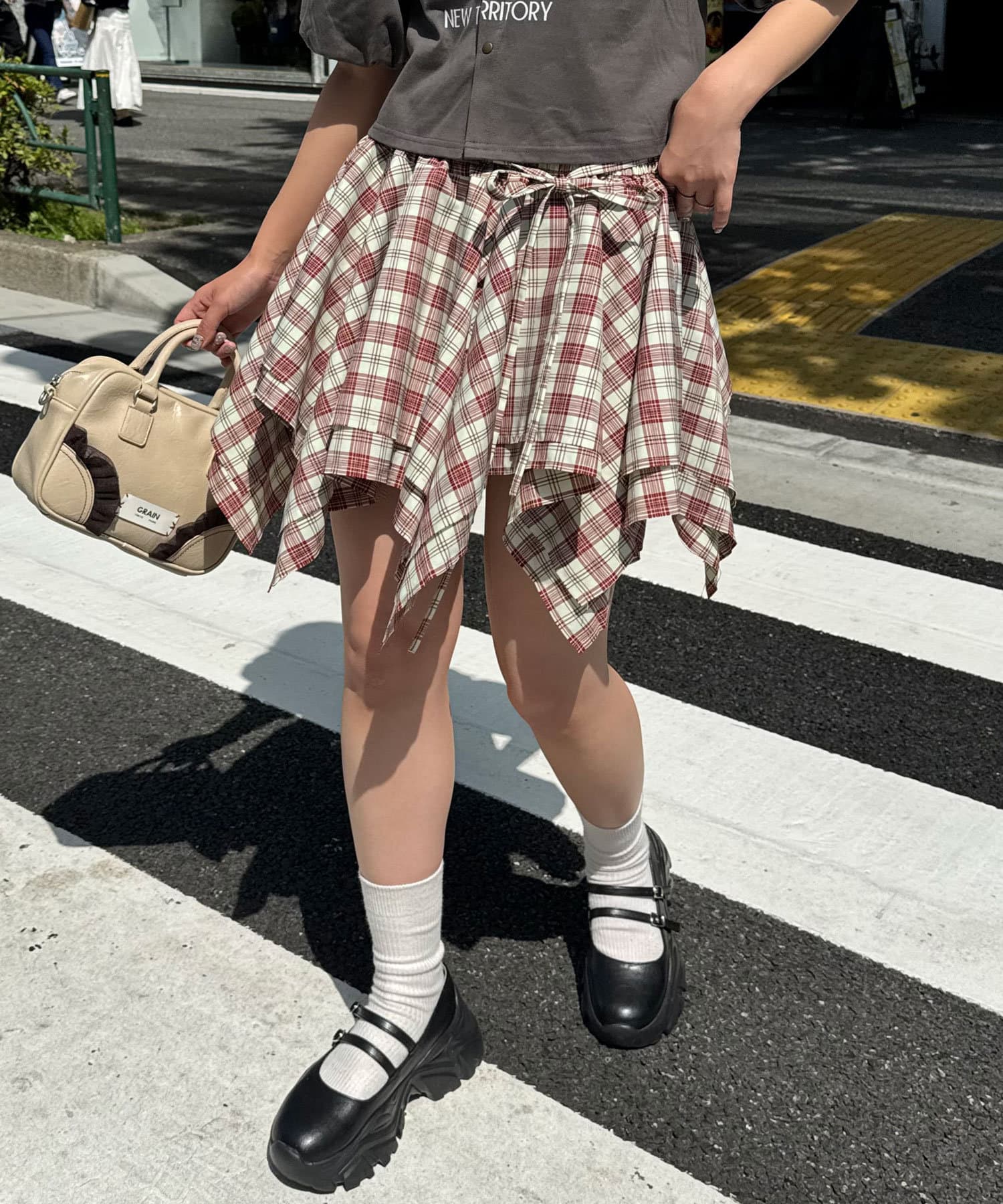 チェック柄と斜めにカットされたイレヘムデザインが、カジュアルだけどちょっと差をつけるスタイルに仕上げてくれます。