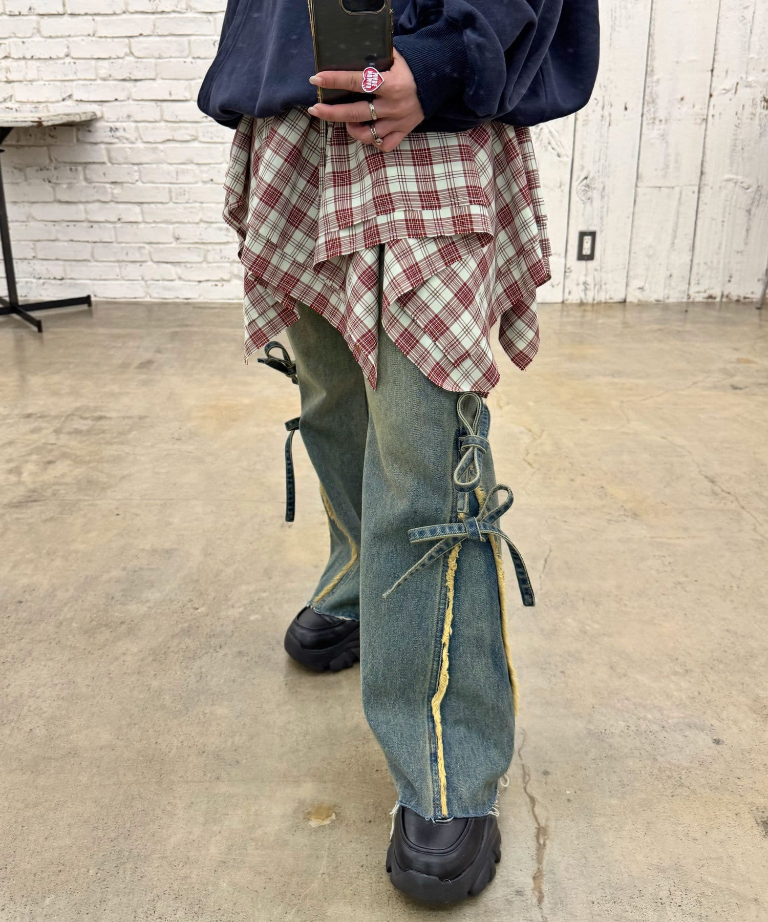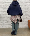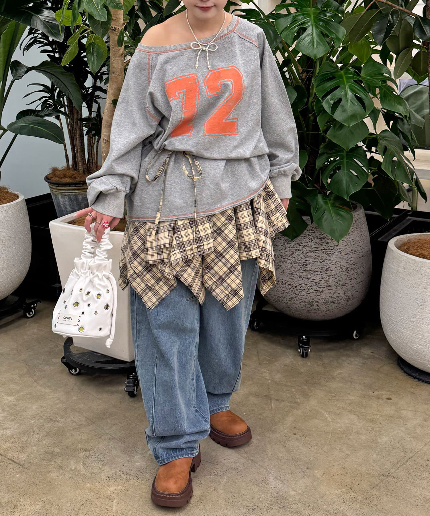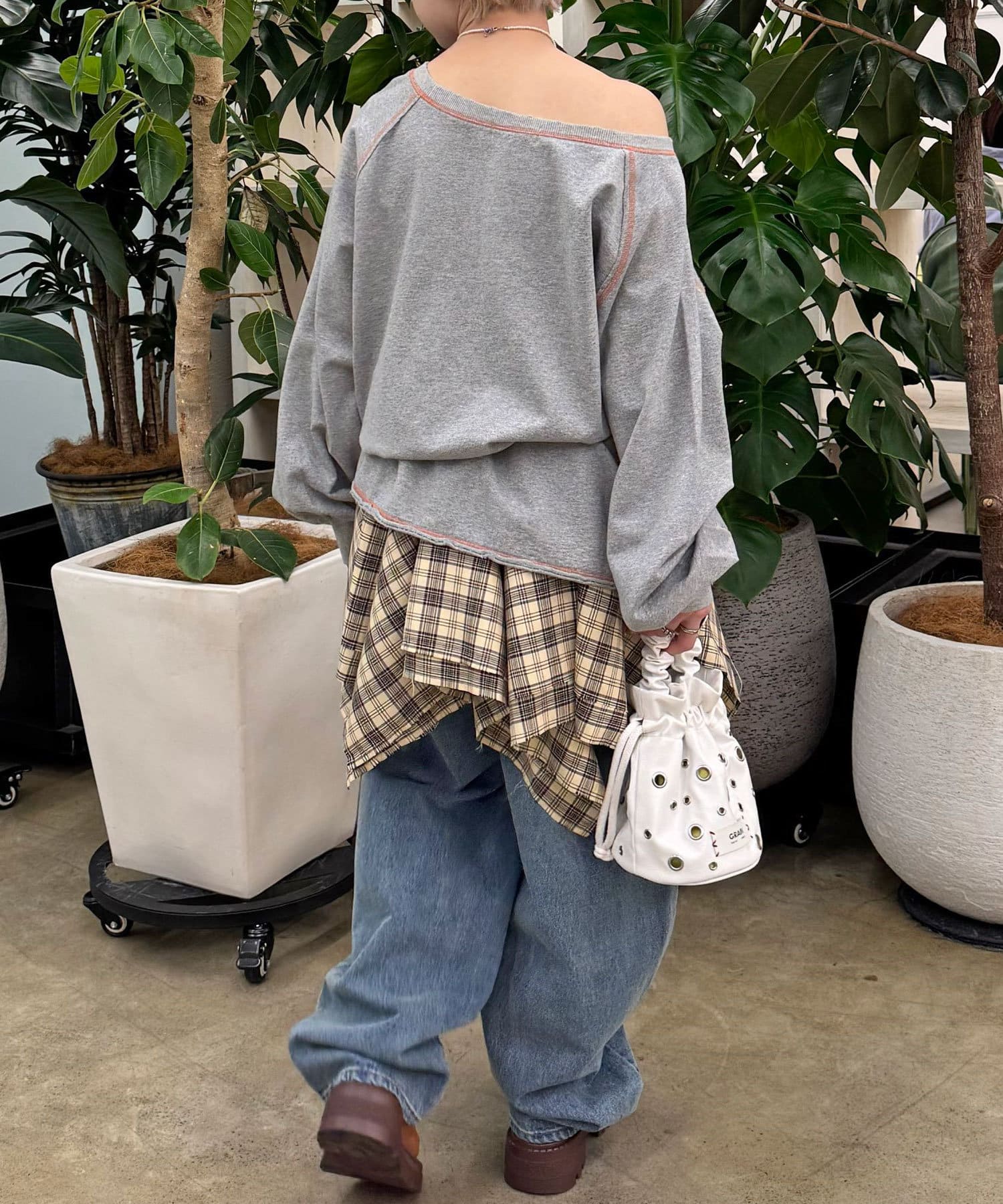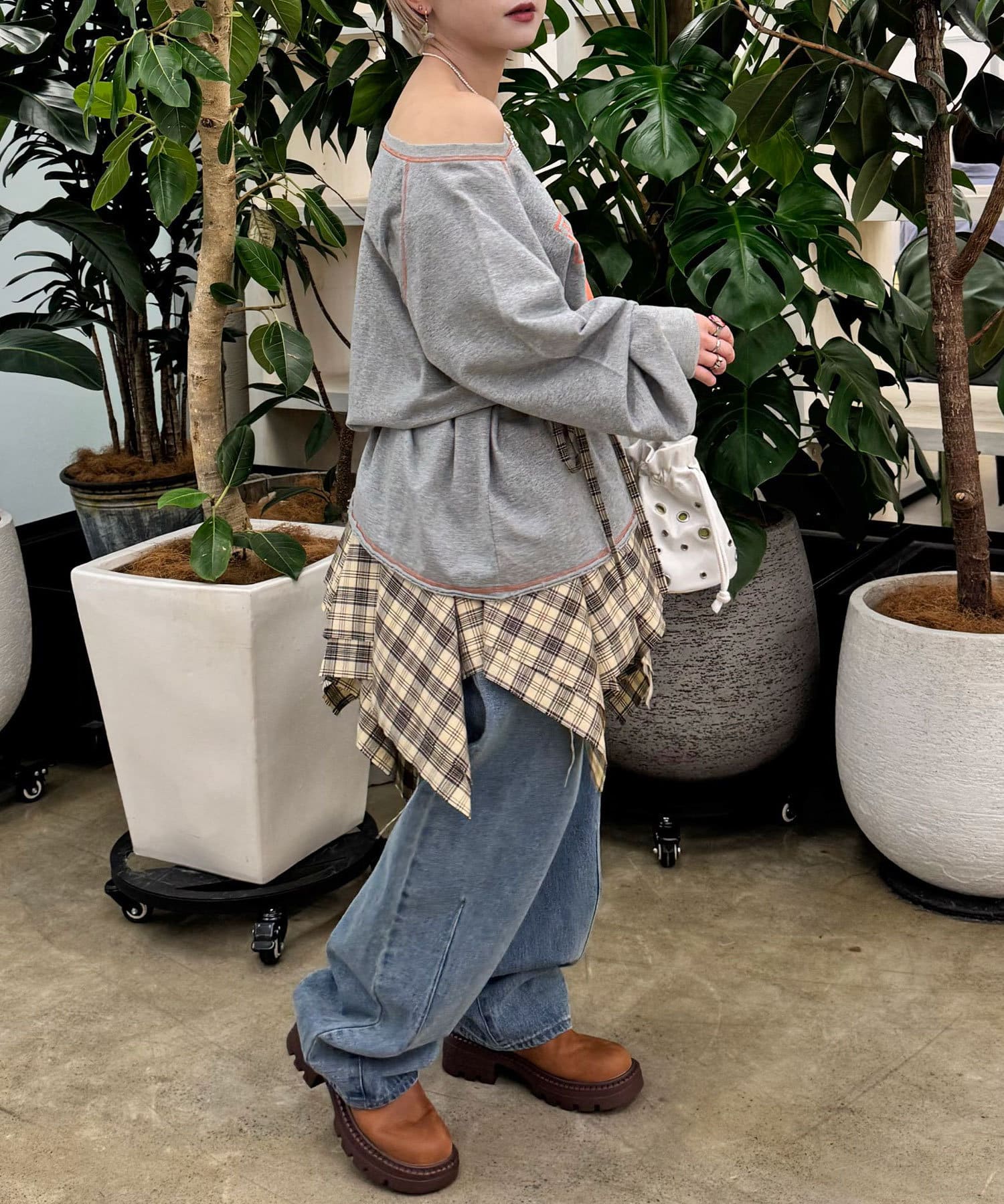 チェック柄と斜めにカットされたイレヘムデザインが、カジュアルだけどちょっと差をつけるスタイルに仕上げてくれます。