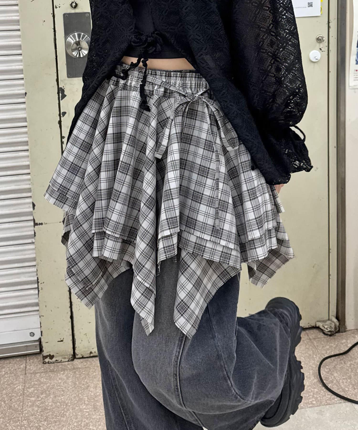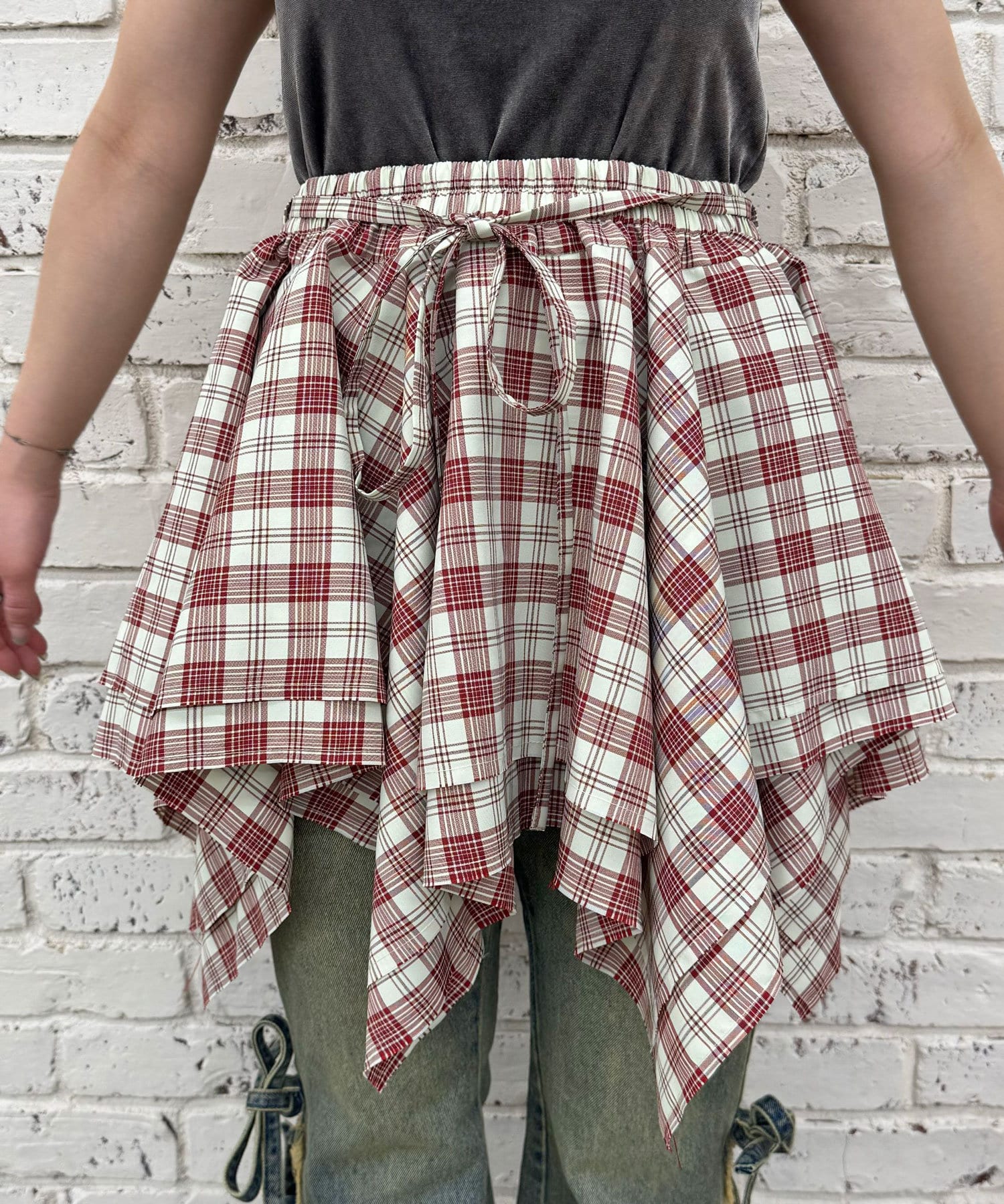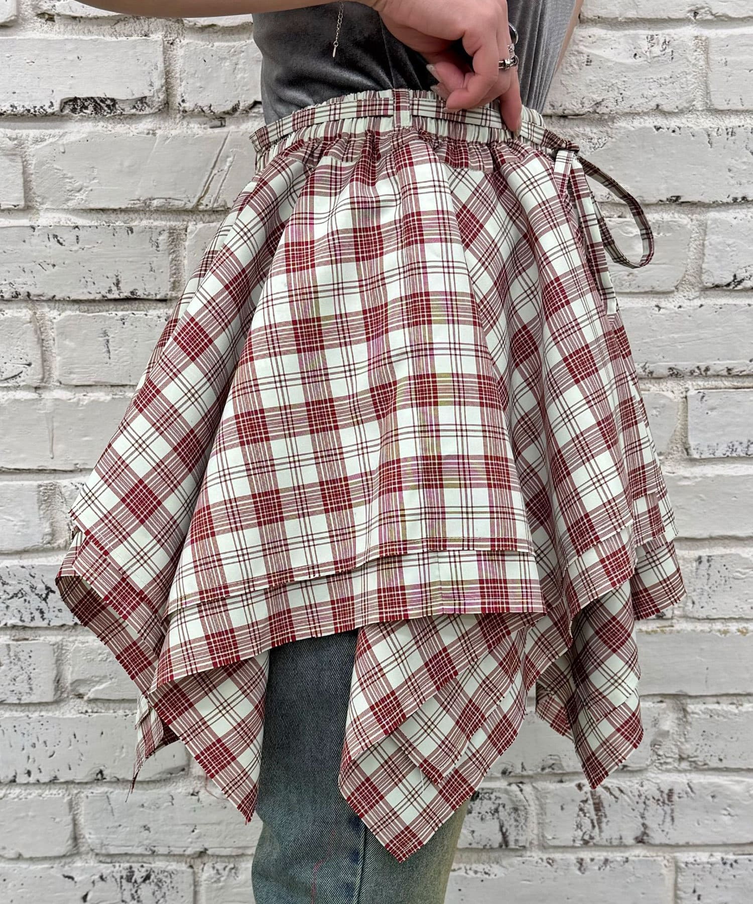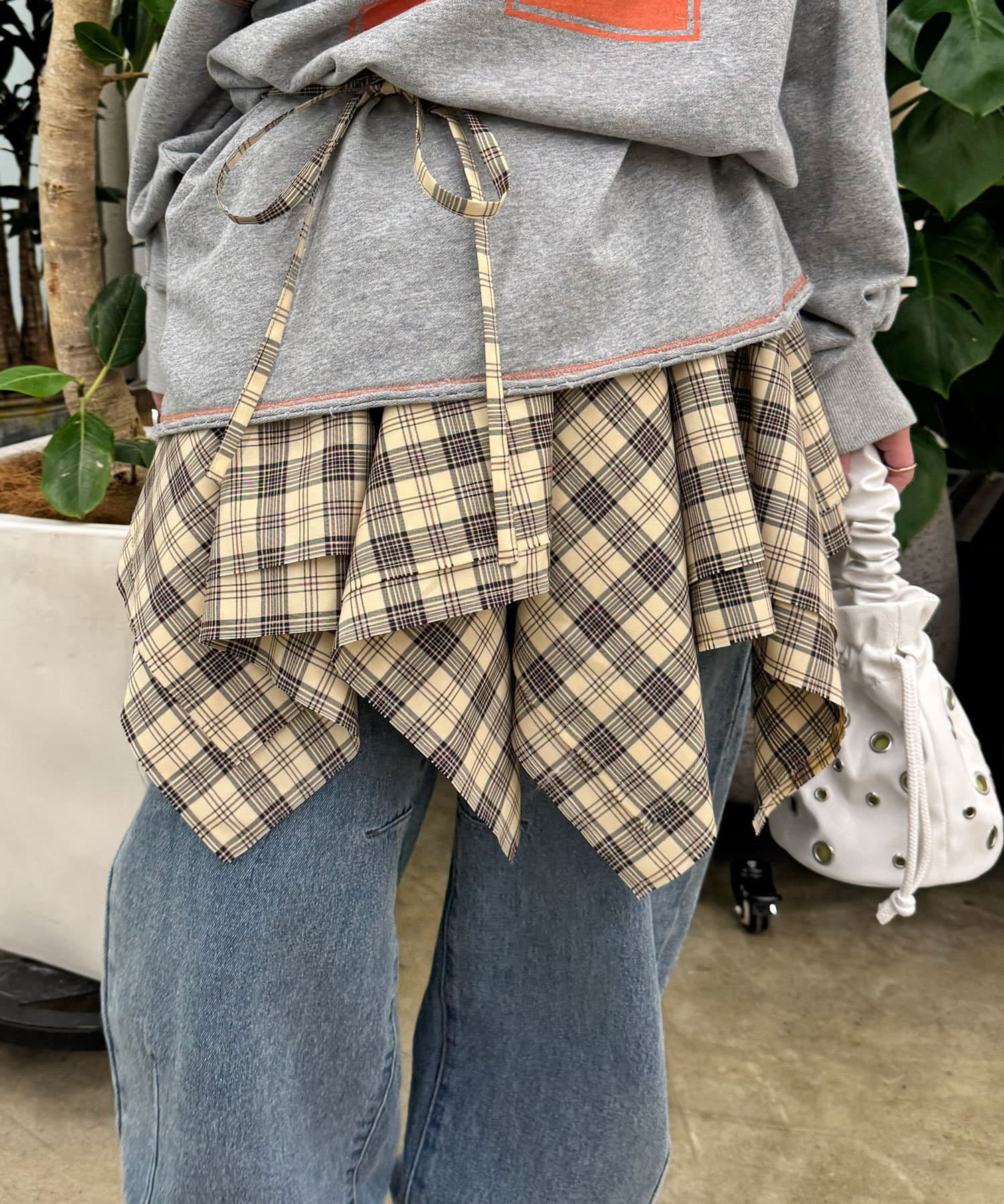 チェック柄と斜めにカットされたイレヘムデザインが、カジュアルだけどちょっと差をつけるスタイルに仕上げてくれます。