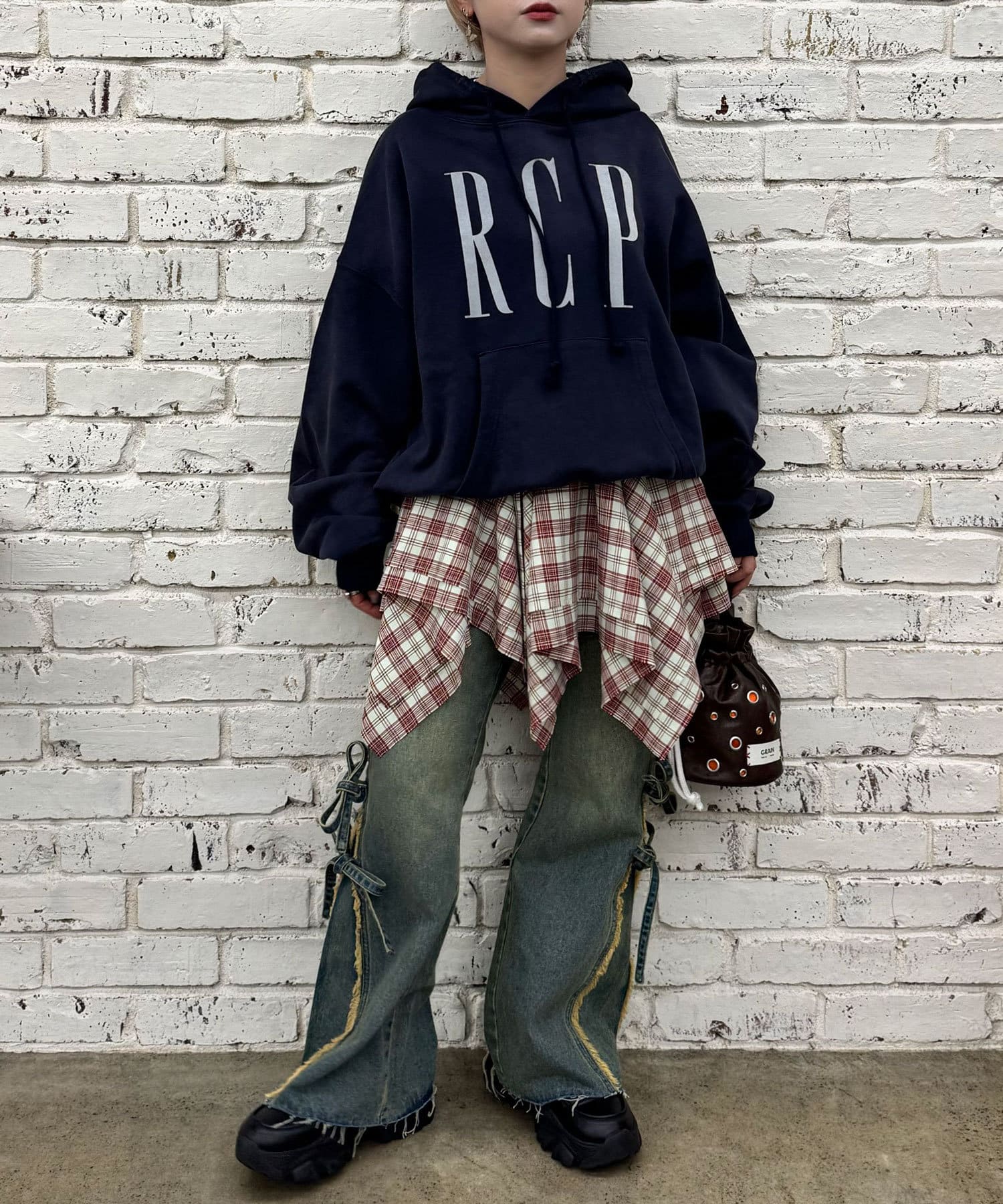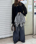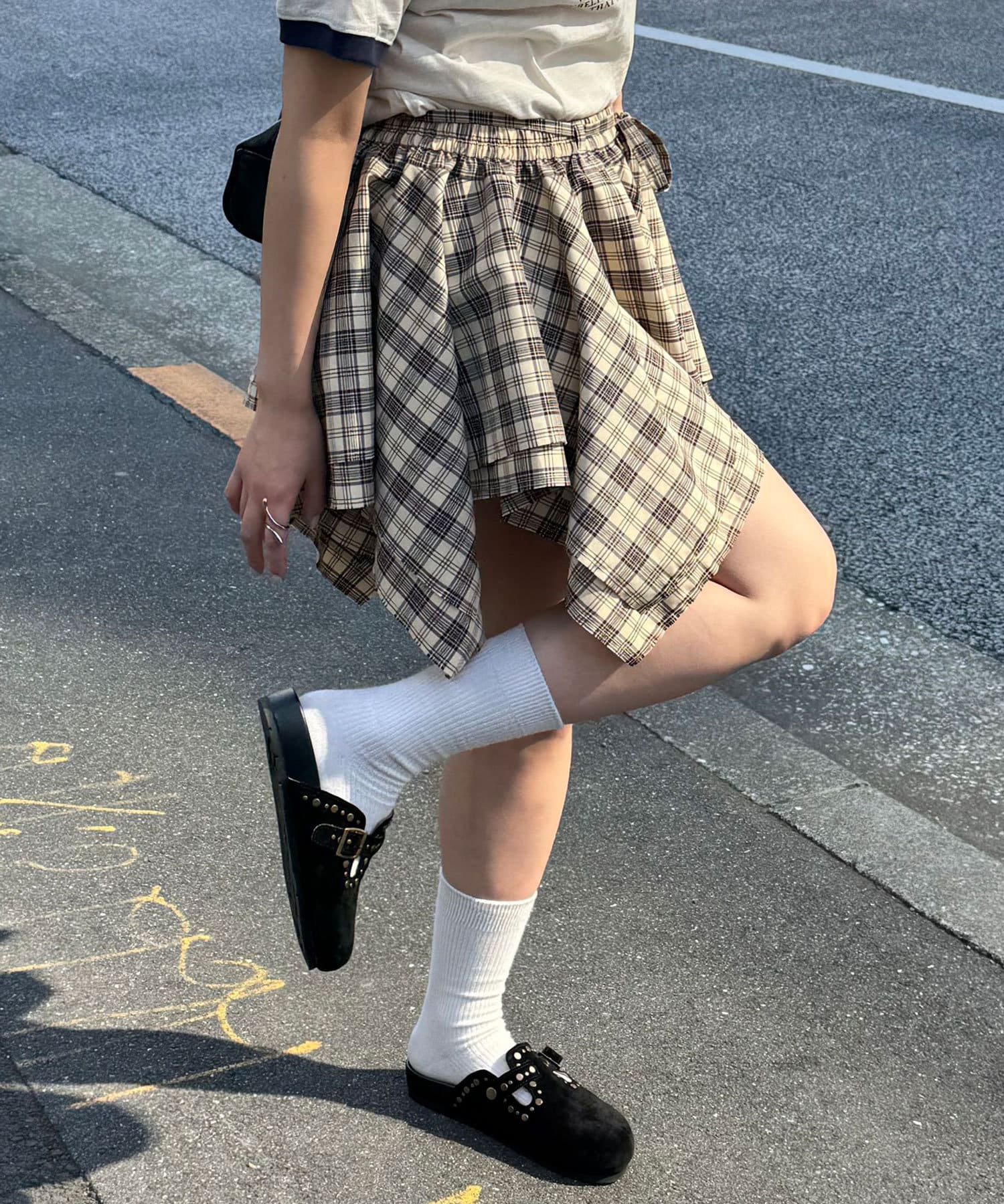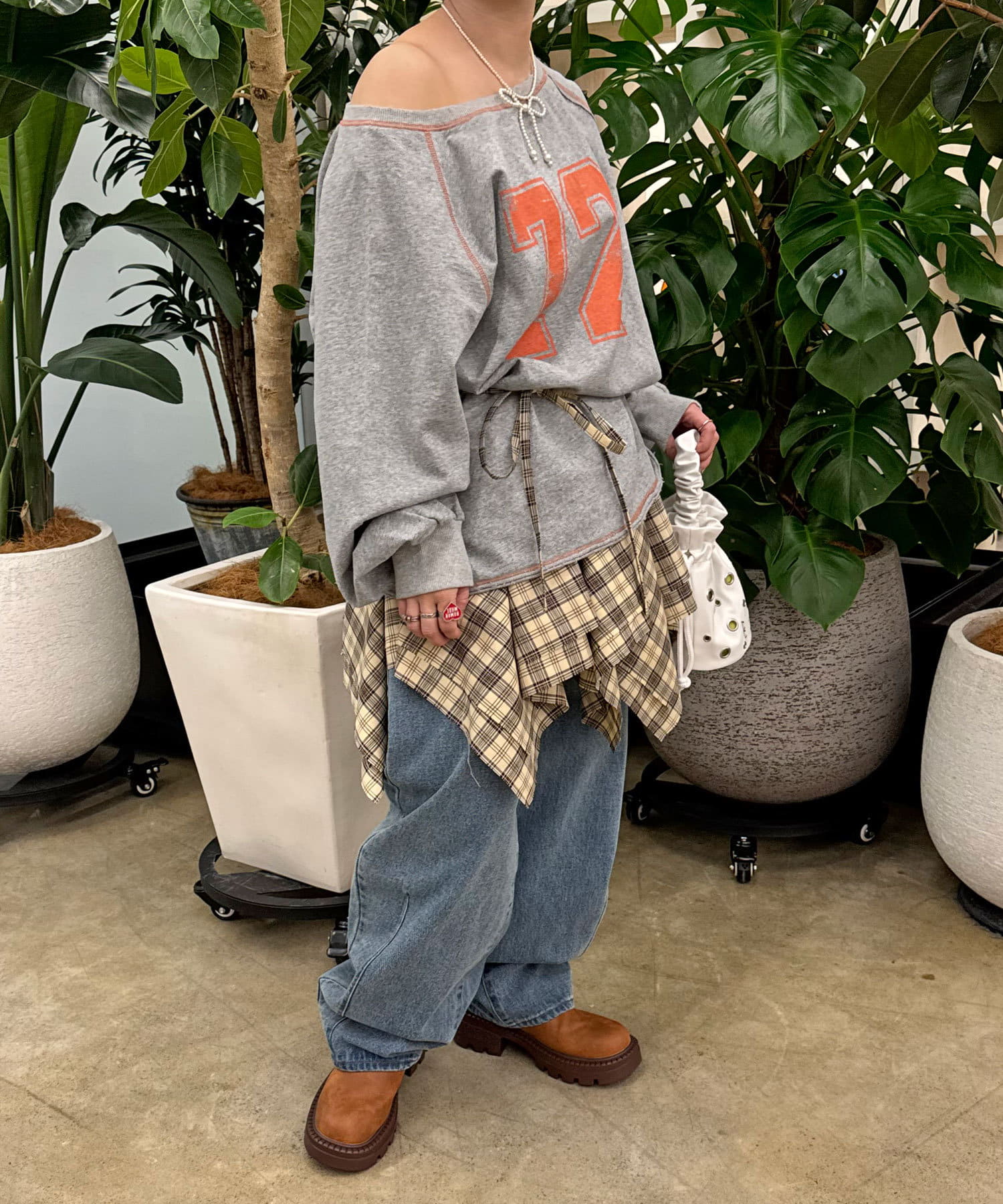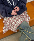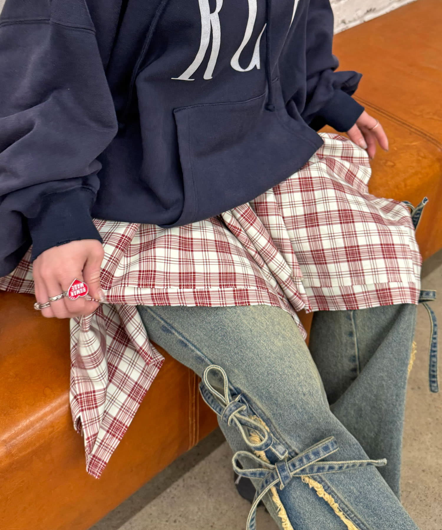 チェック柄と斜めにカットされたイレヘムデザインが、カジュアルだけどちょっと差をつけるスタイルに仕上げてくれます。