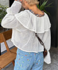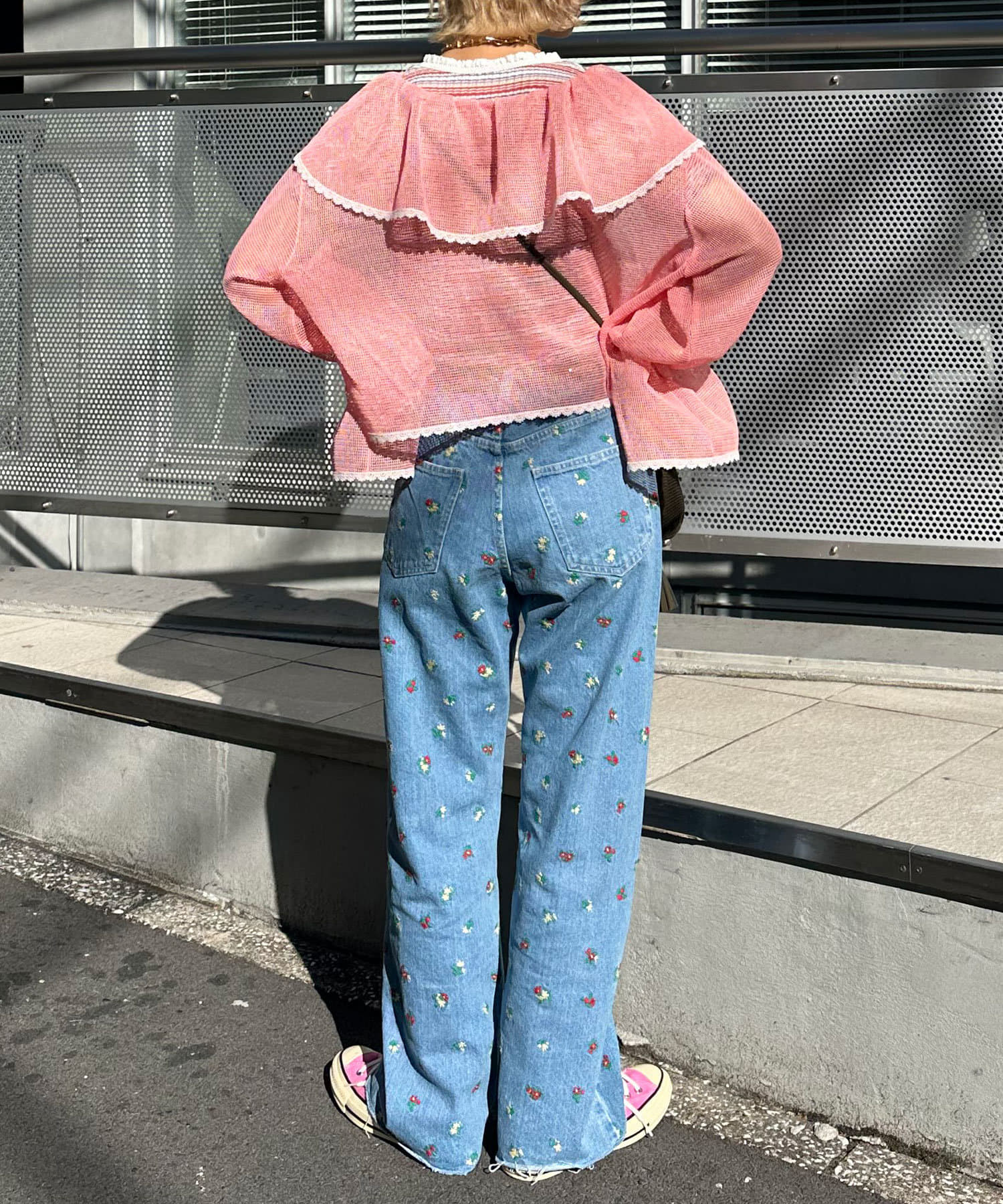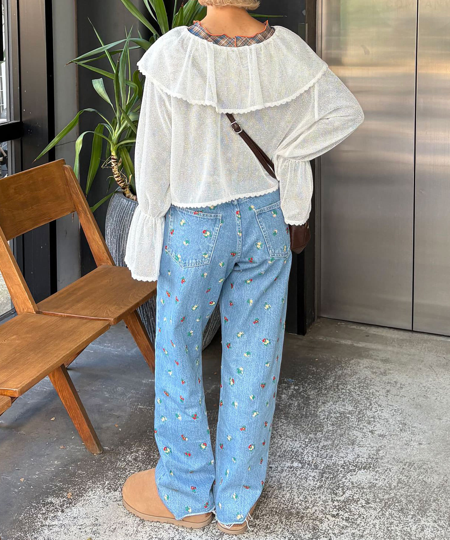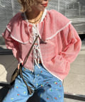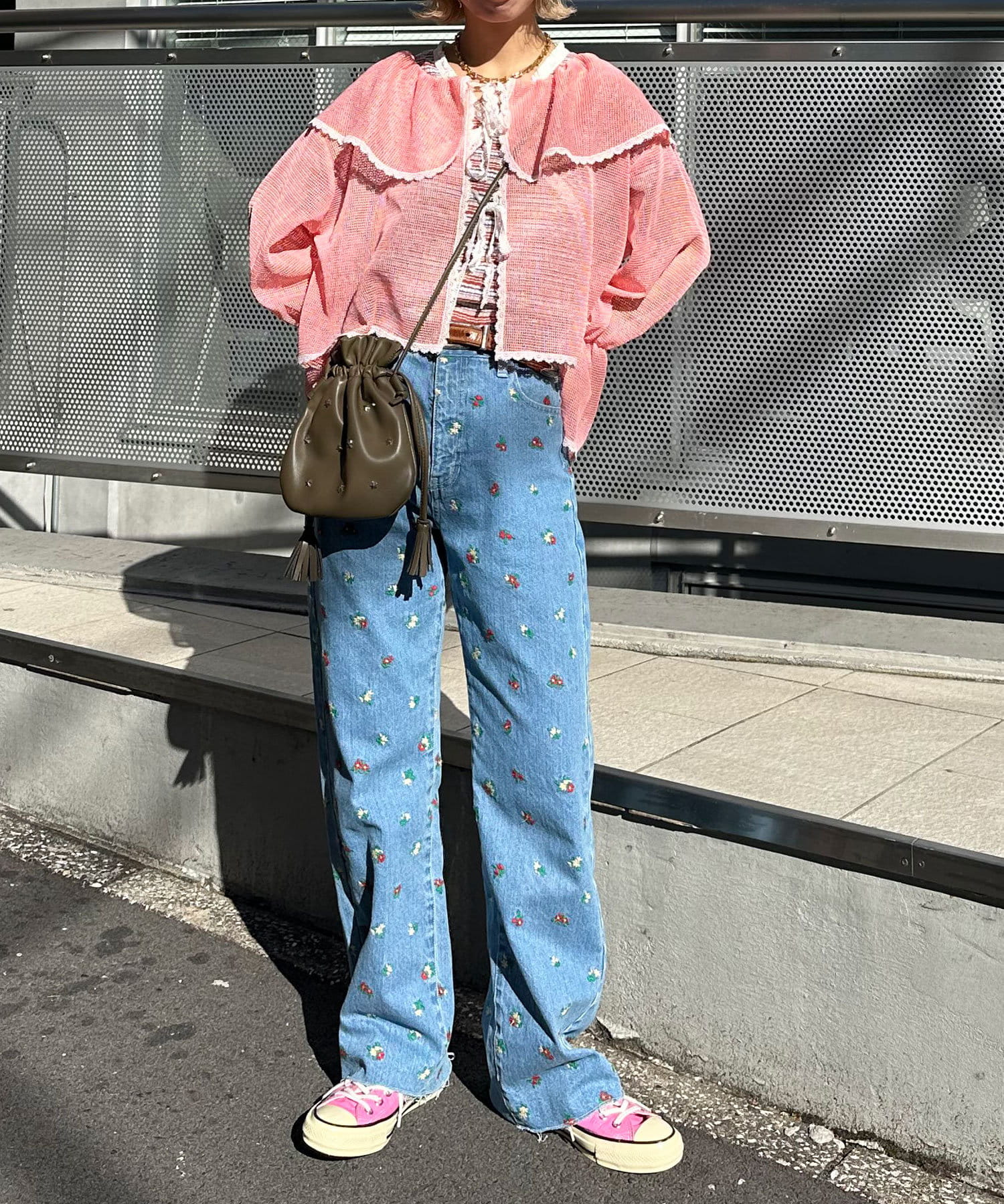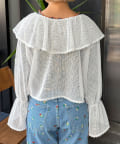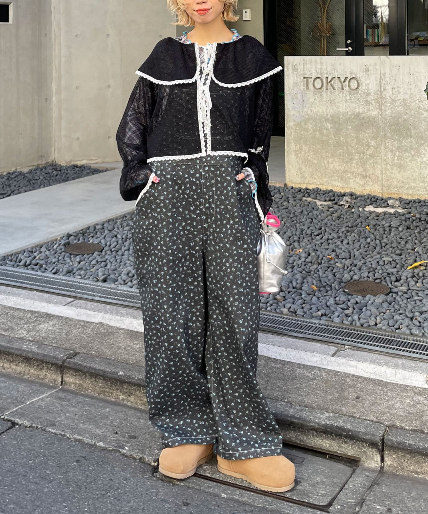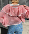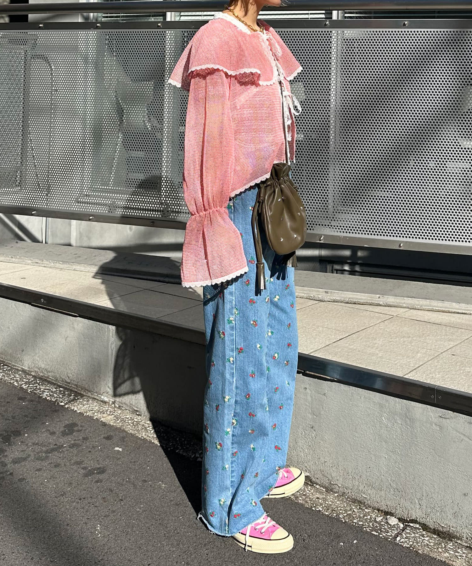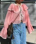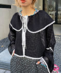 ふんわり広がる袖口やレースのディテールが、甘さと上品さを演出。
