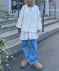 スカートを取り入れると、少しフェミニンなミックスコーデも楽しめます。