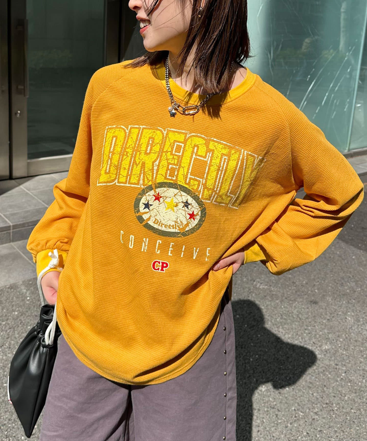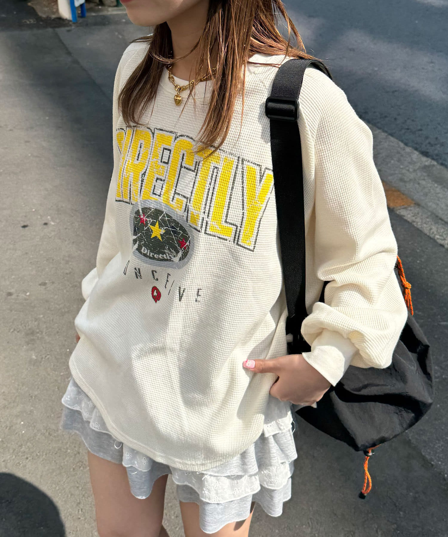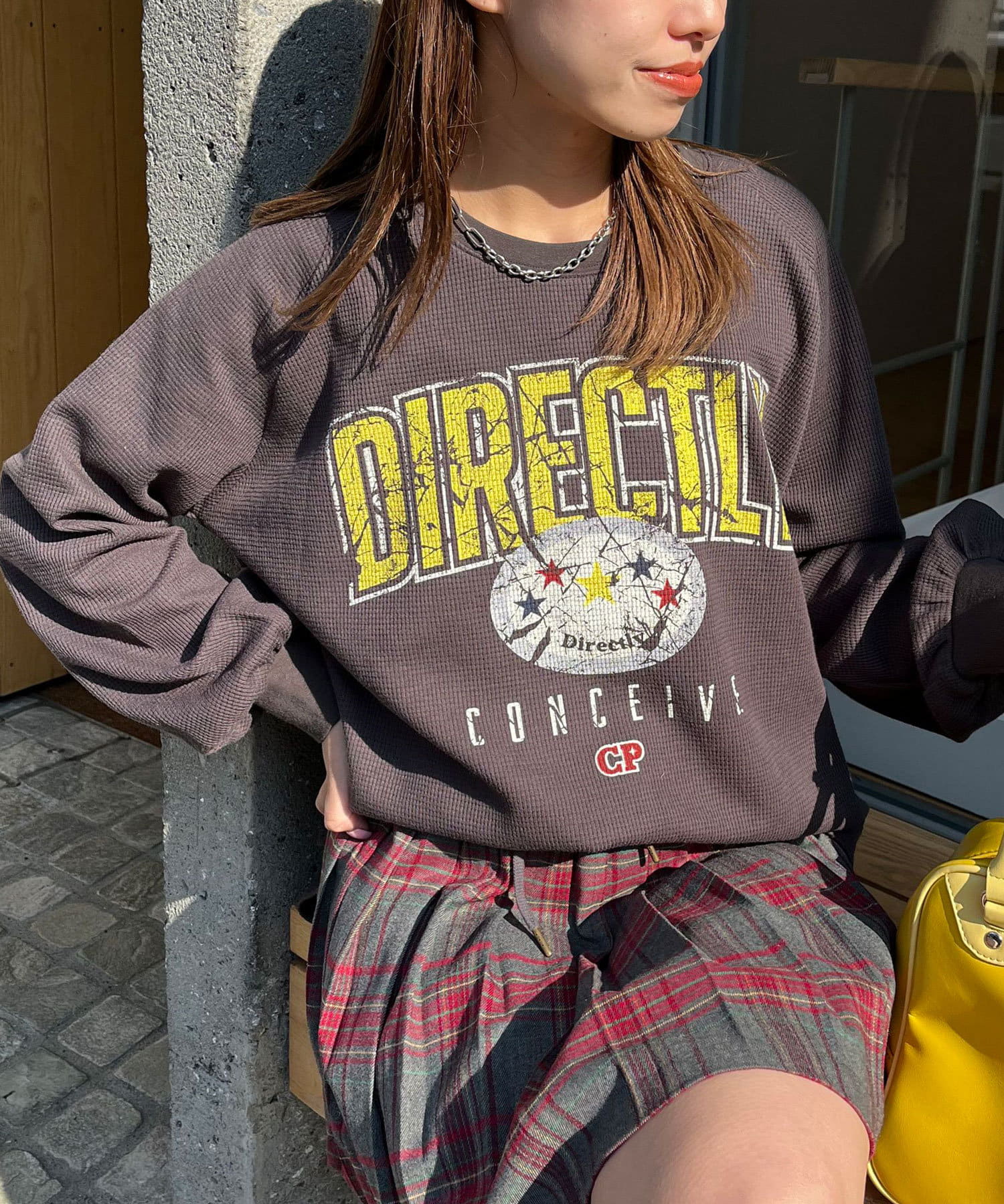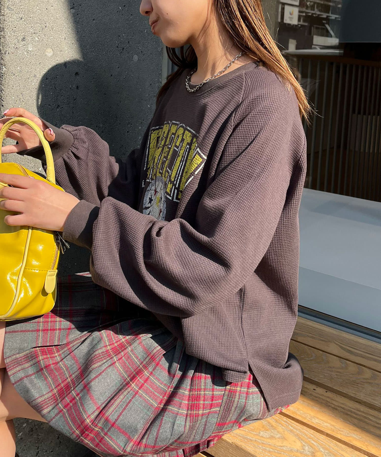 フロントの擦れプリントがレトロ可愛い!ワッフル素材のロンTが新登場!